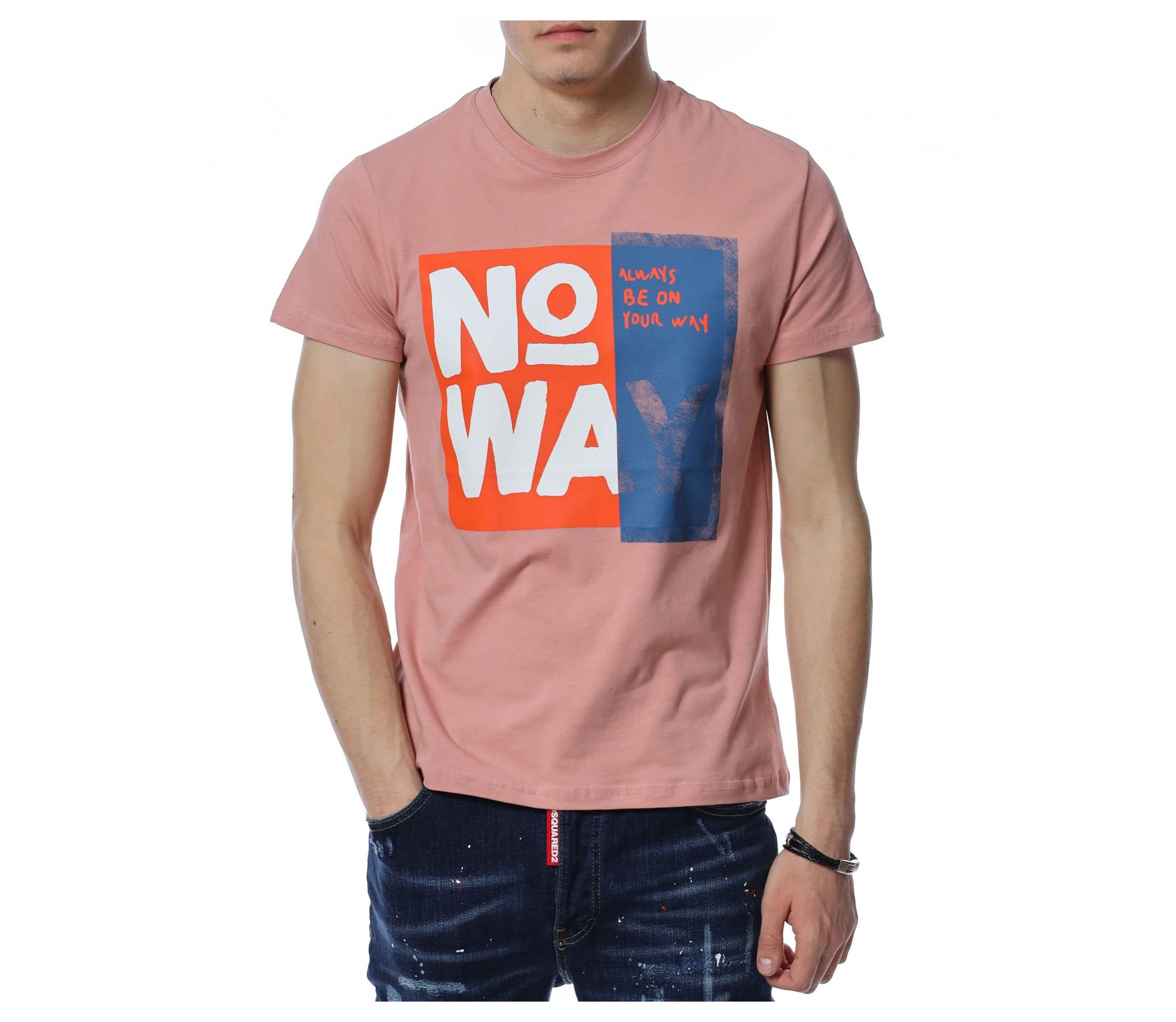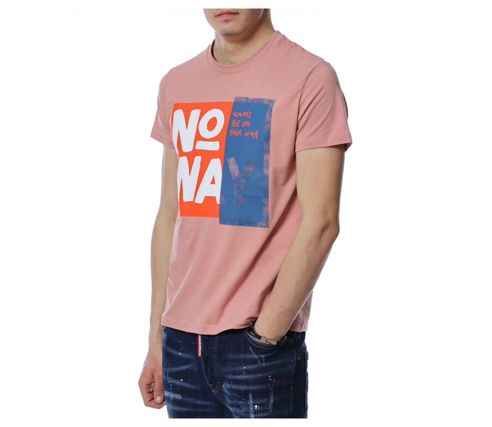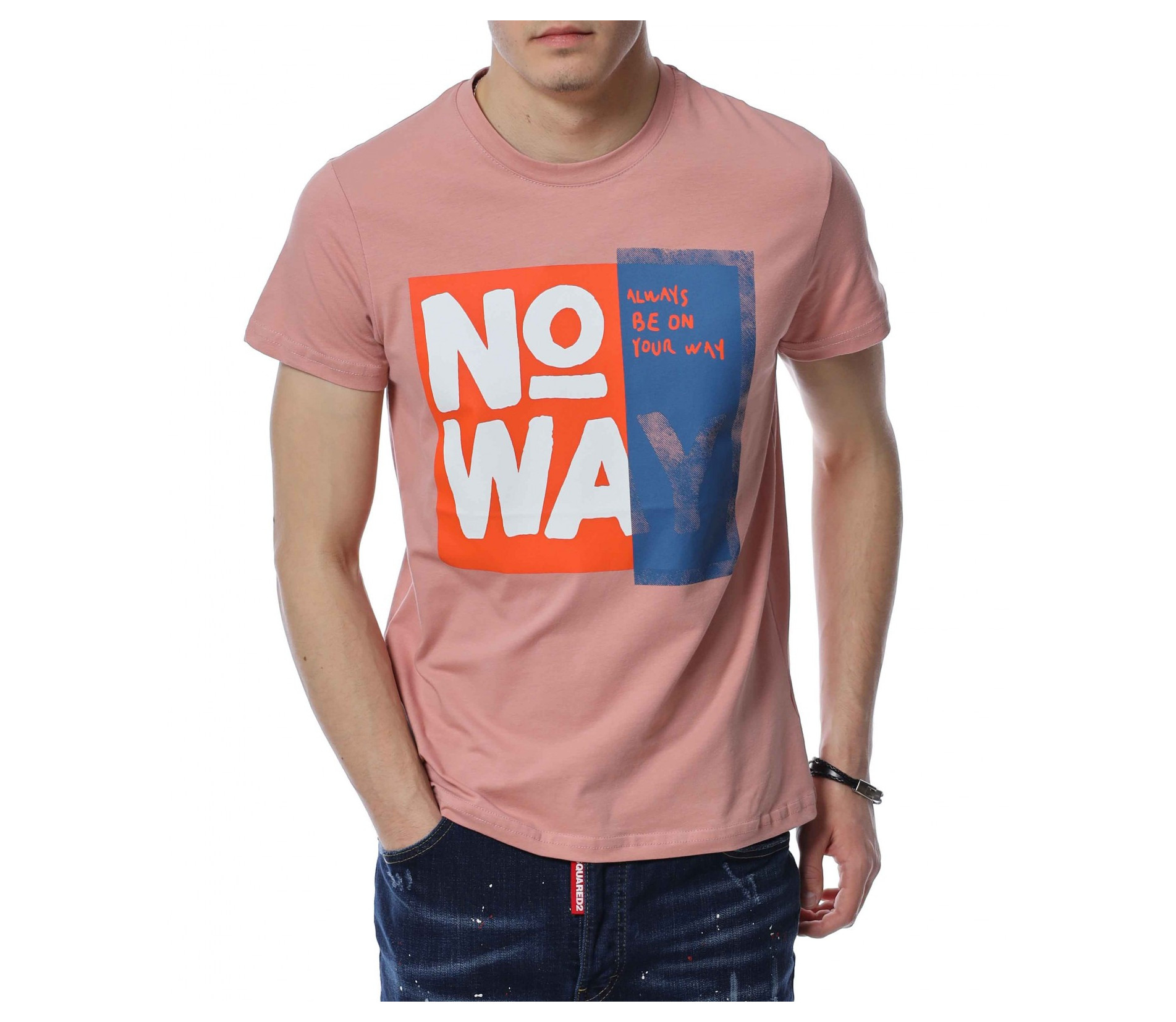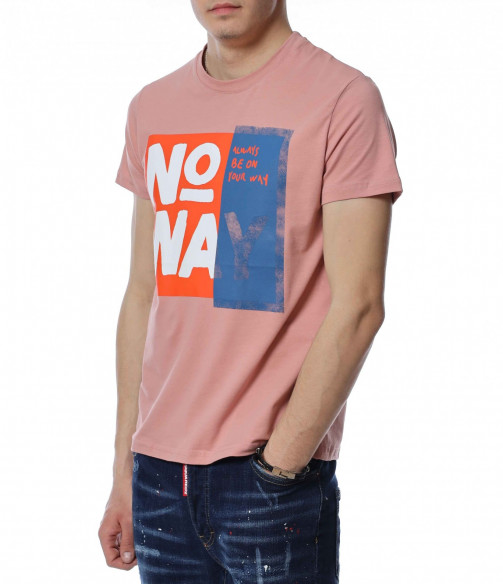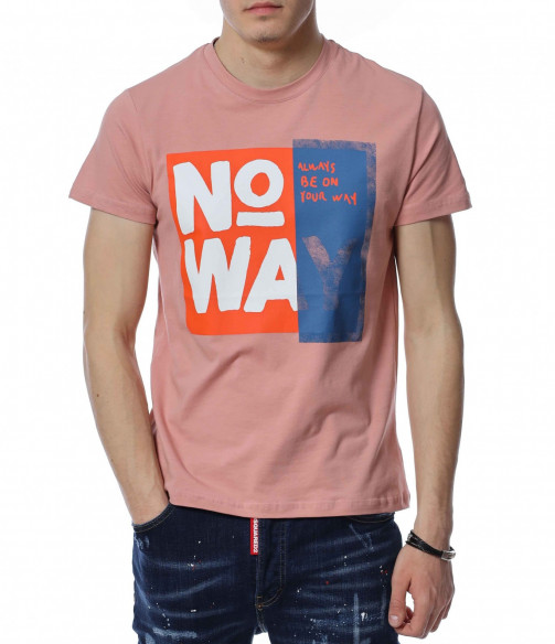 ОПИСАНИЕ НА ПРОДУКТА: Мъжка нестандартна тениска в розов цвят. Изключително атрактивен модел фланелка, която акцентира със своята апликация, разположена на преден план. Представлява голям бял надпис NO WAY, който привлича погледите. По този начин се създава един идеален акцент, който впечатлява с доза елегантност и нетипично излъчване. Кройката на блузата с къс ръкав е вталена и леко еластична, следваща мъжкия силует. Деколтето е с овална форма, а ръкавите са ексцентрично подправени с малък, зашит подгъв. Наслади се на една нова визия, в крак с последните модни тенденции. На крачка от летния сезон изгради своята вълнуваща визия с тишърт от ново поколение.