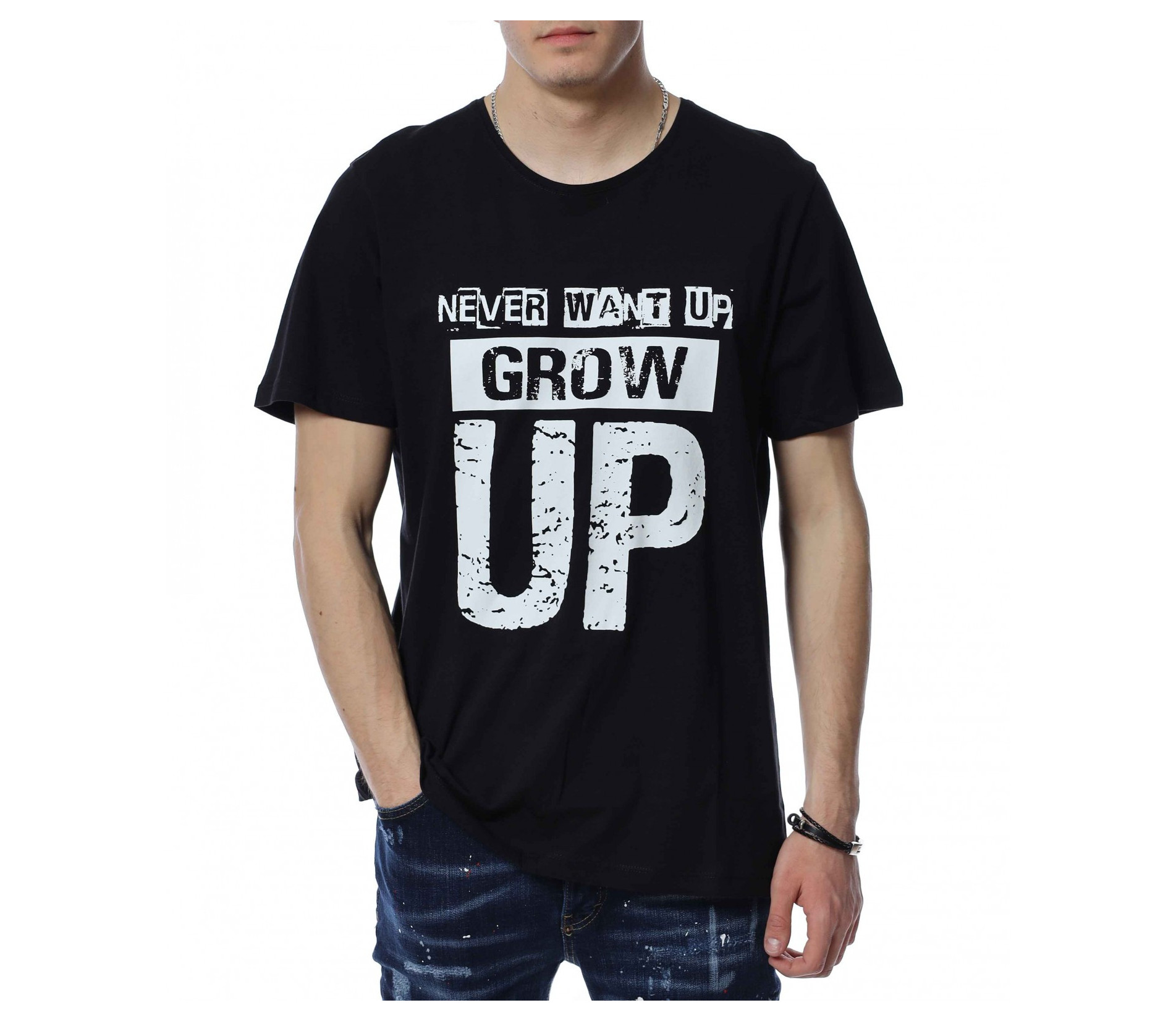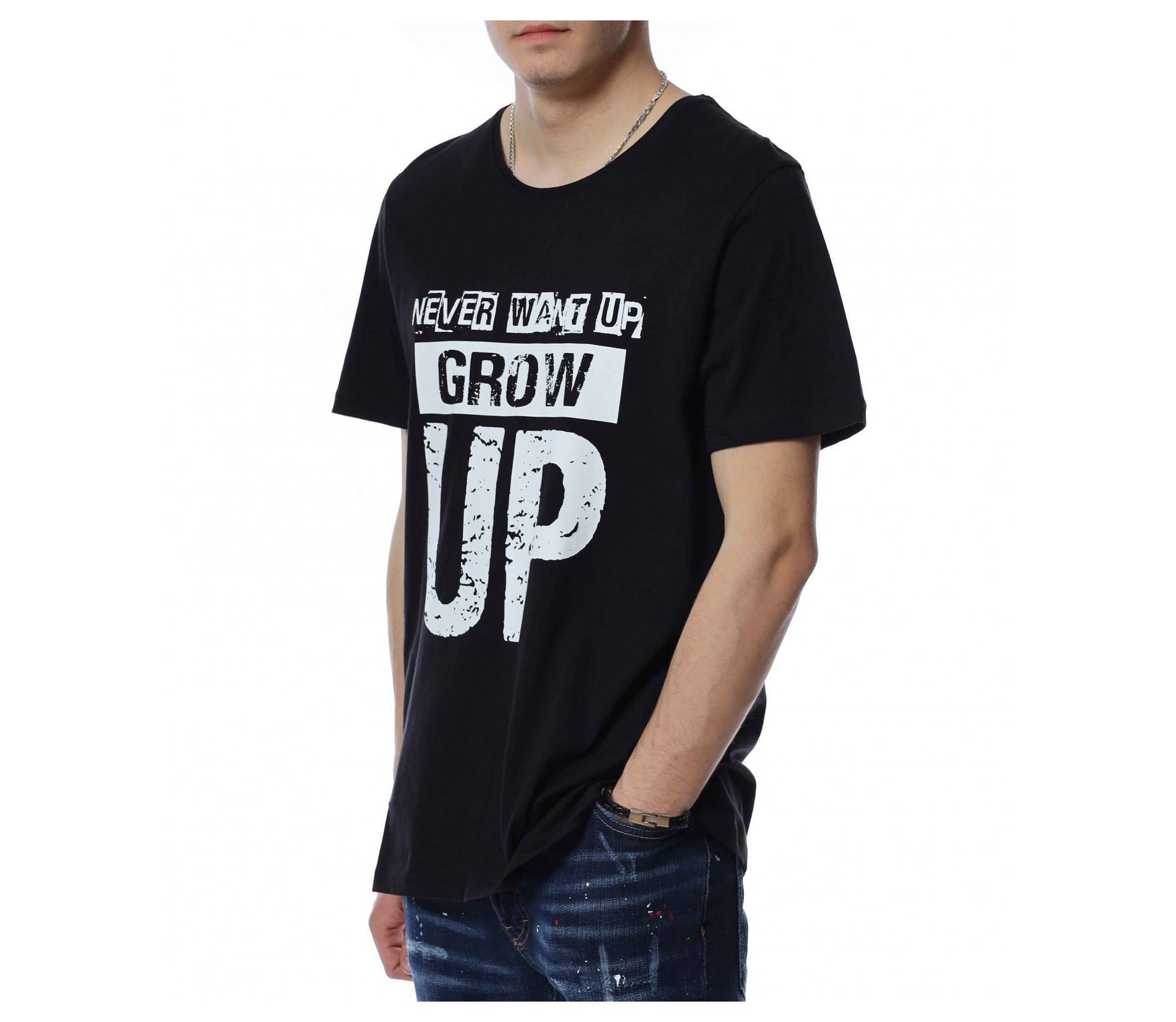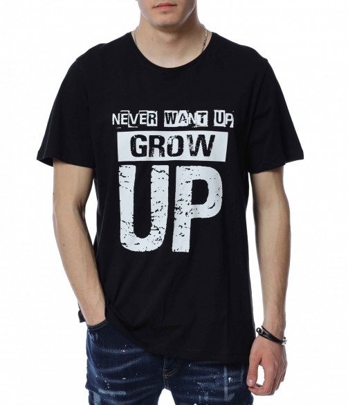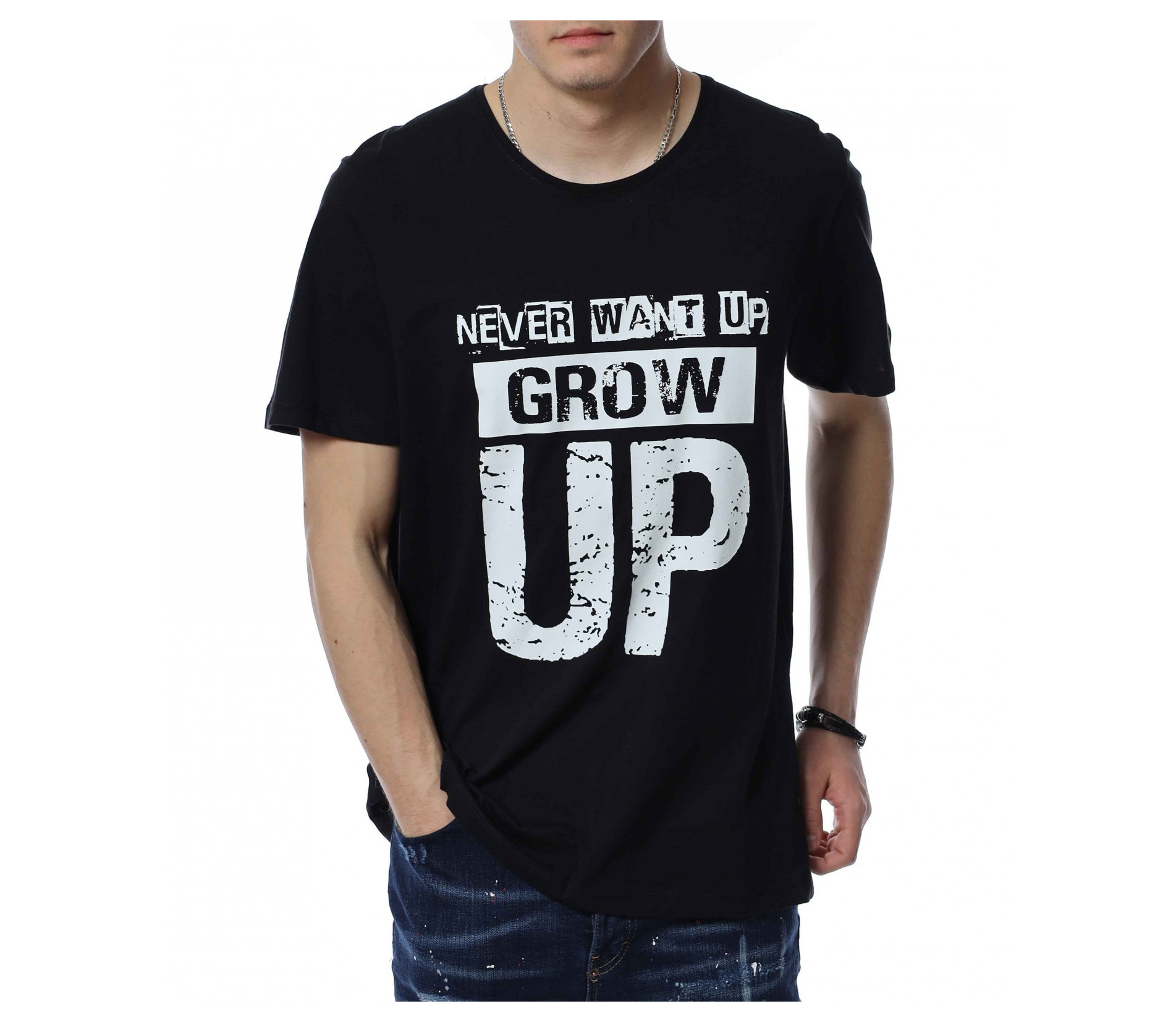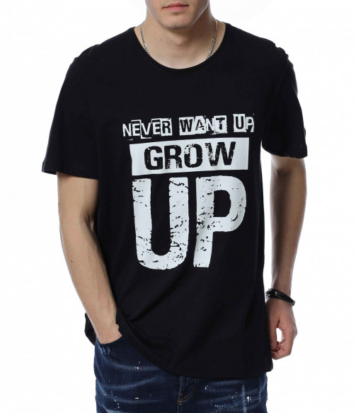 ОПИСАНИЕ НА ПРОДУКТА: Тук обръщане специално внимание на този модел, който вдъхва комфорт и лекота, дори преди да бъде облечен. За да се получи желаният контраст, впечатляващ всяко око, при гърдите е разположен масивен надпис Never want up grow up в отличаващ се бял цвят. Деколтето е изградено в овална форма. Тази свежа мъжка тениска в големи размери, може да включите в следващият си аутфит, в комбинация с карго панталон, дънки или къси панталони.