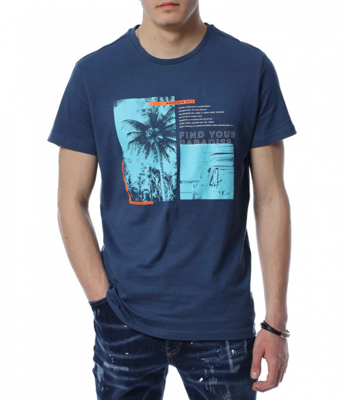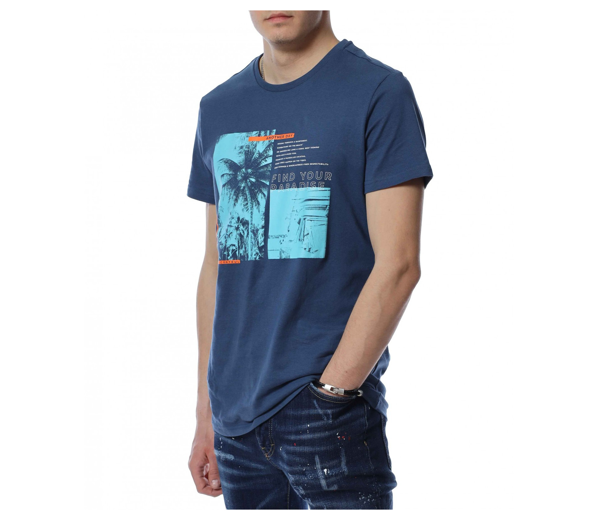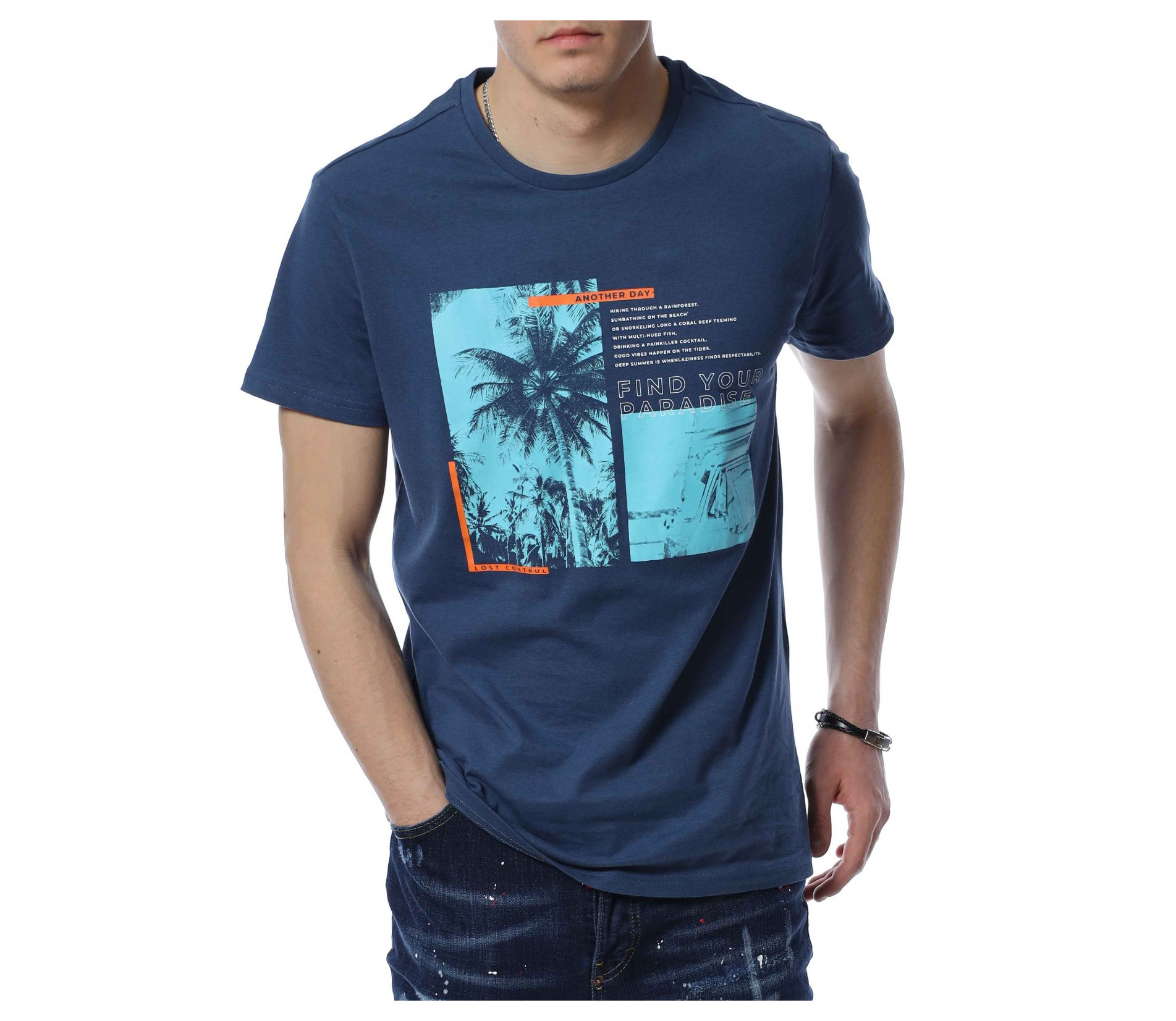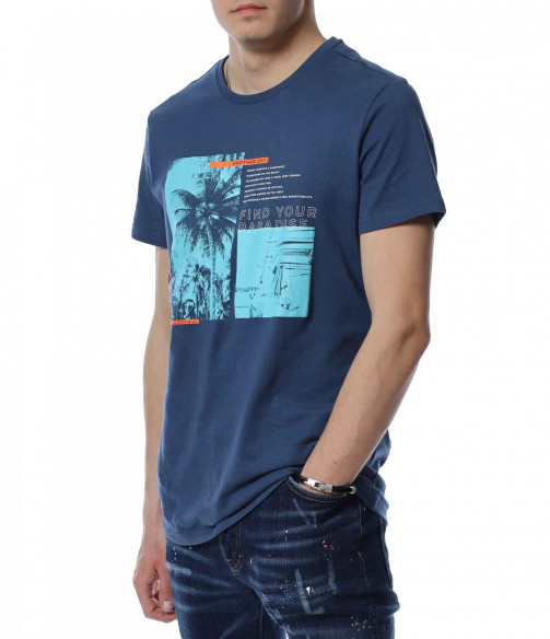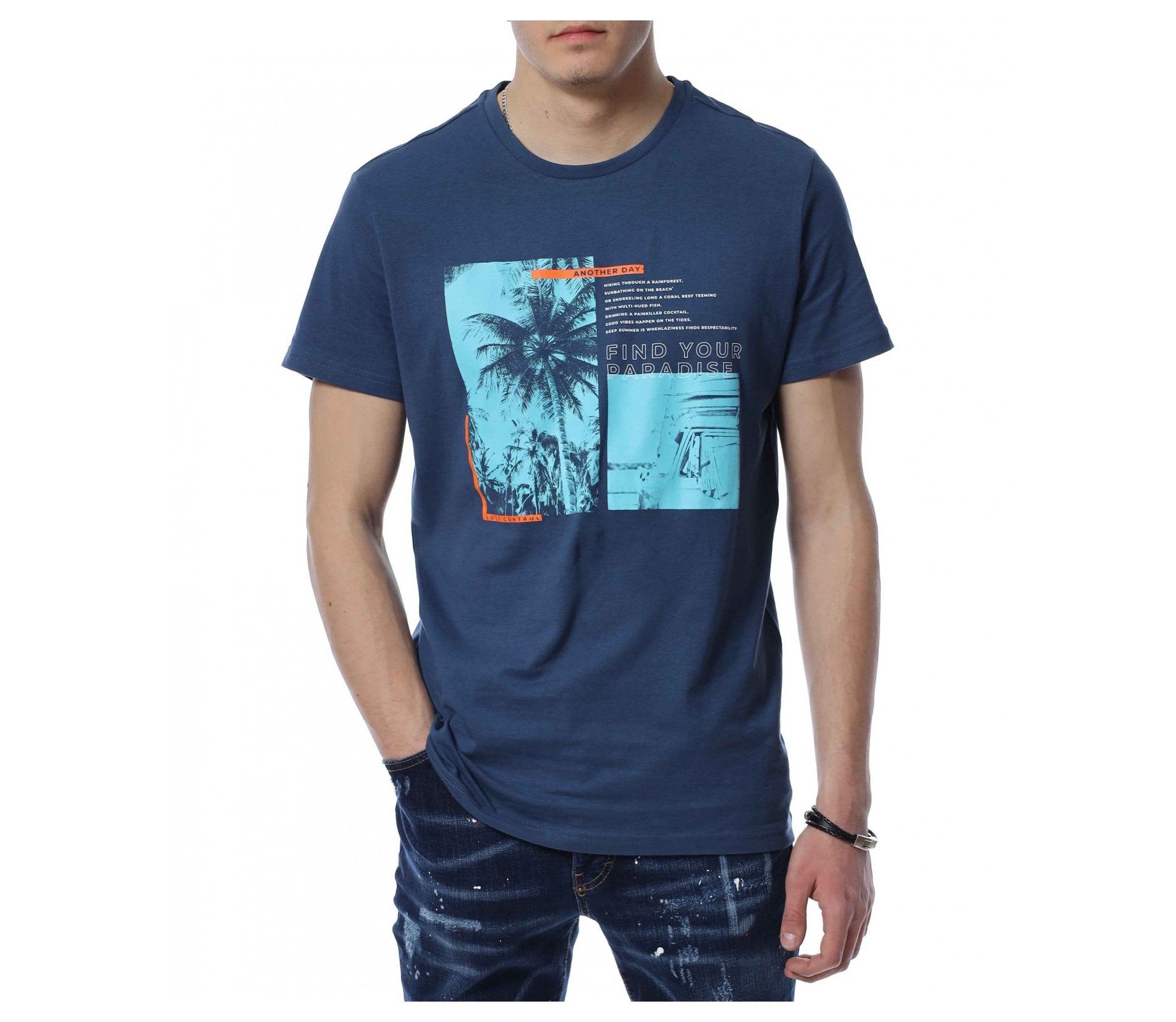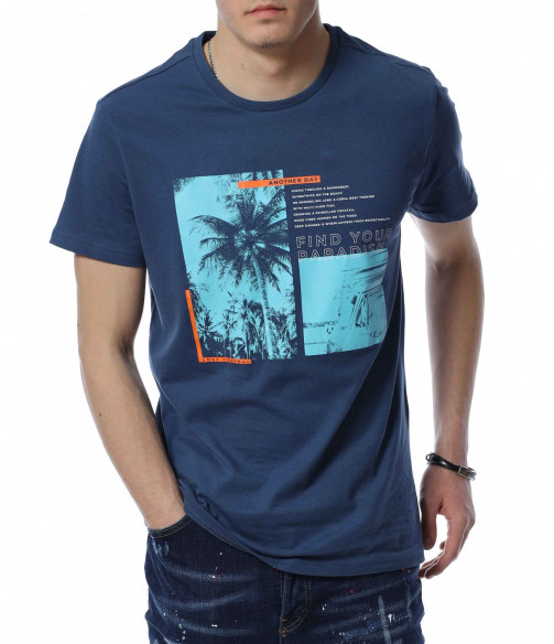 ОПИСАНИЕ НА ПРОДУКТА: Мъжка  тениска с къс ръкав с интересна илюстрация. Цвета е част от изчистената, тъмносиня гама, която перфектно се вписва при избора на мъжете, предпочитащи класическите и утвърдени модели тениски. Цялата предна част е обхваната от голяма щампа в ненатрапчива цветова комбинация, обхващаща светлосините нюанси и представляваща палми и кола, напомнящи ни за почивка и безгрижие. Надпис Find your paradise e разположен в областта на гърдите, символично даващ заглавие на атрактивния принт. По-ситен надпис в свеж цвят е разположен над него, внасящ нотка цветно излъчване. Кройката при тази блуза с къс ръкав е леко вталена, а удобството е гарантирано от висококачествен памучен плат. Наслади се на безупречна визия и съчетай с дълги или къси дънки и модерно яке.