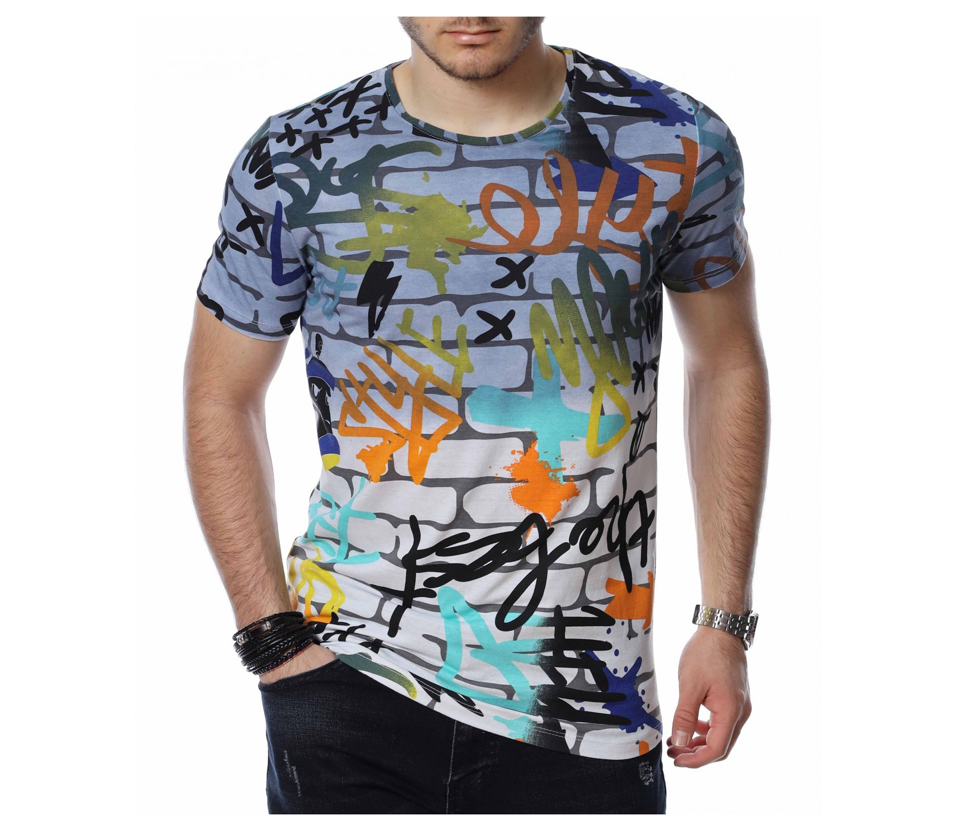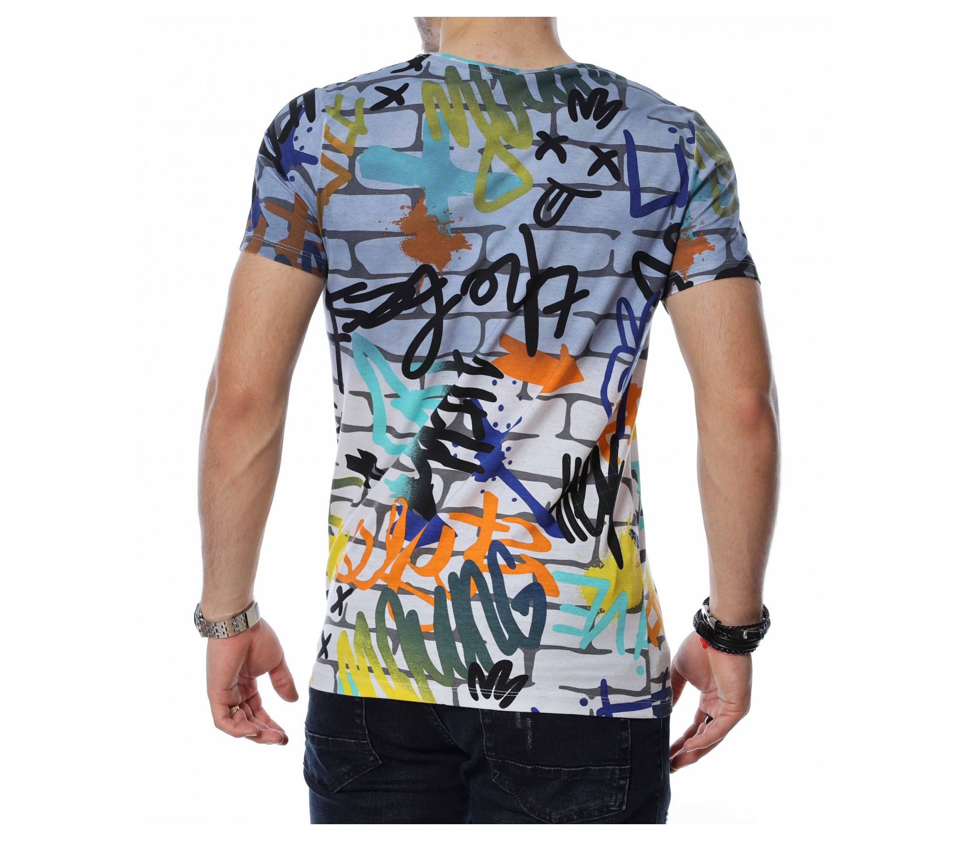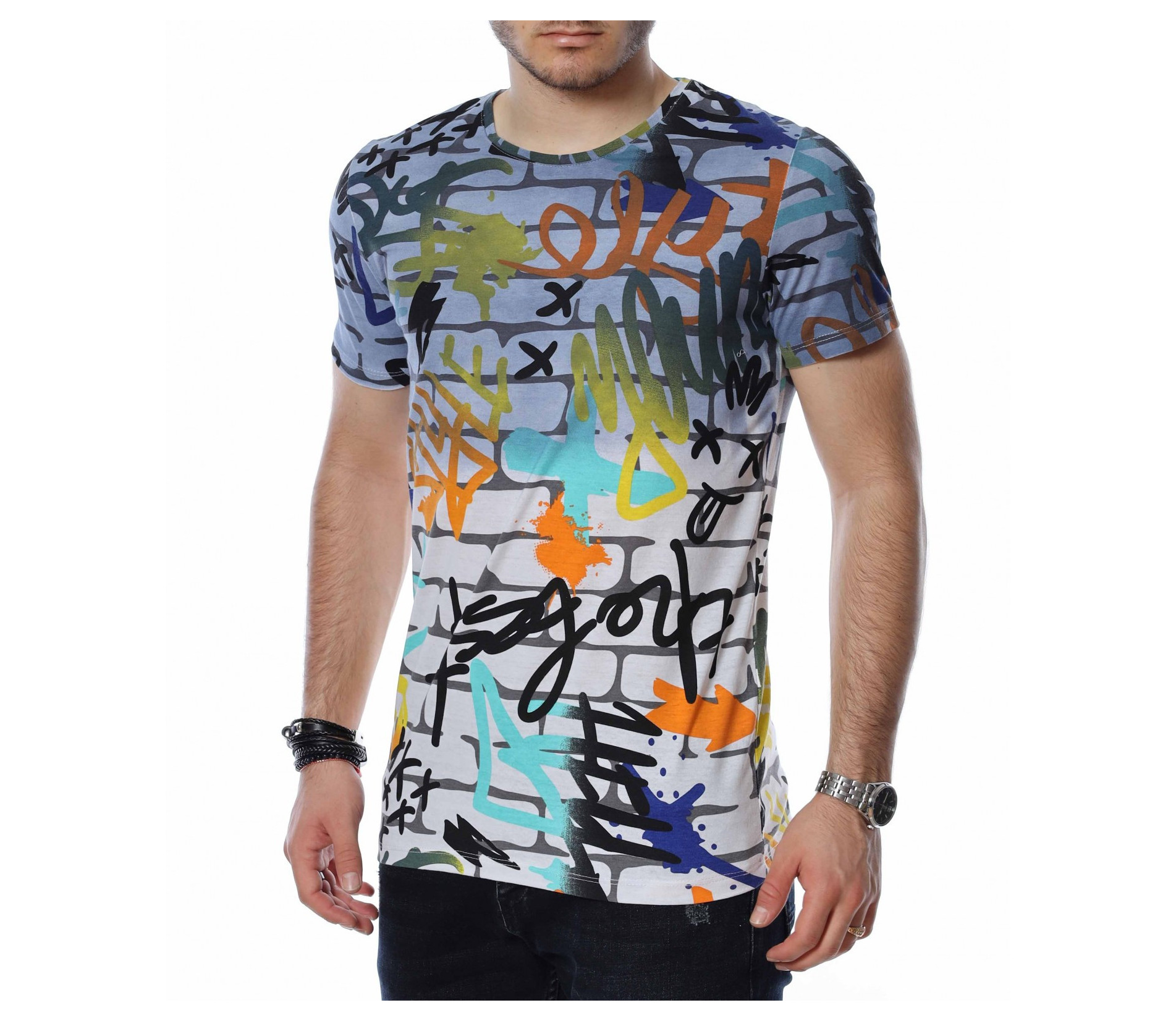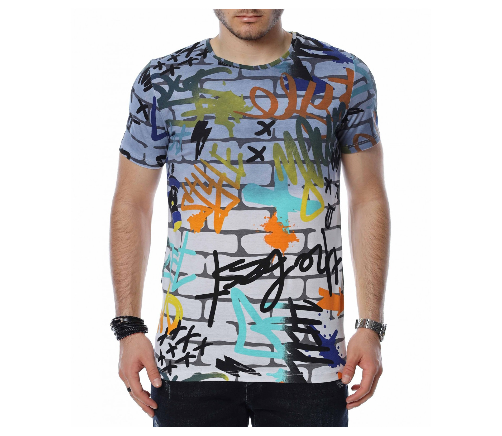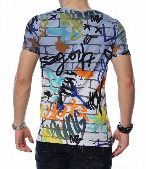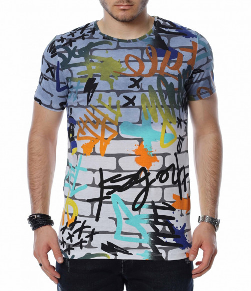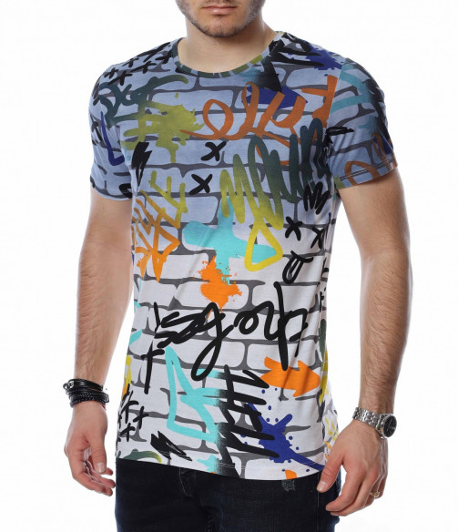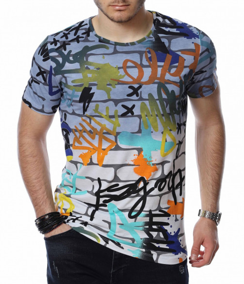 ОПИСАНИЕ НА ПРОДУКТА: Мъжките блузи с къс ръкав са един от любимите елементи в гардероба за топлите дни от година на почти всеки мъж. Изграждащи еднакво добре спортен и елегантен имидж, тези тениски се превръщат в най-любимият елемент от пролетно-летния аутфит. Тук Ви представяме един модел, изработен в основа наподобяваща тухлена стена и ярки графити върху нея, която предпоставя различни и ефектни сетове, само с подмяната на обувките или панталона. Деколтето е с овална форма, а кройката леко вталена, обещаваща много удобство и комфорт. Заинтригувани от модерния облик на тениската Ви приканваме да я добавите към гардероба си за 2022г.