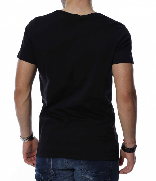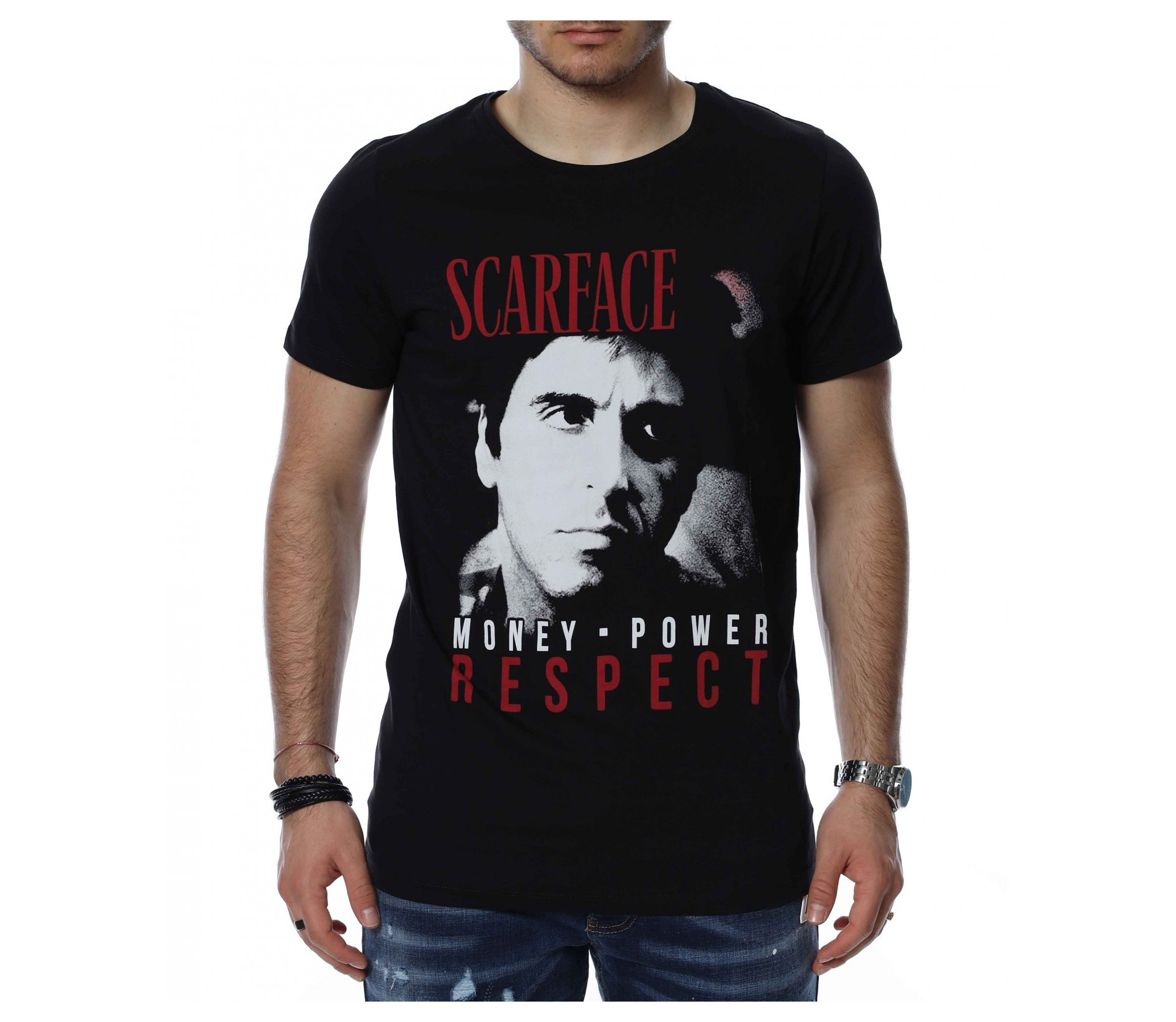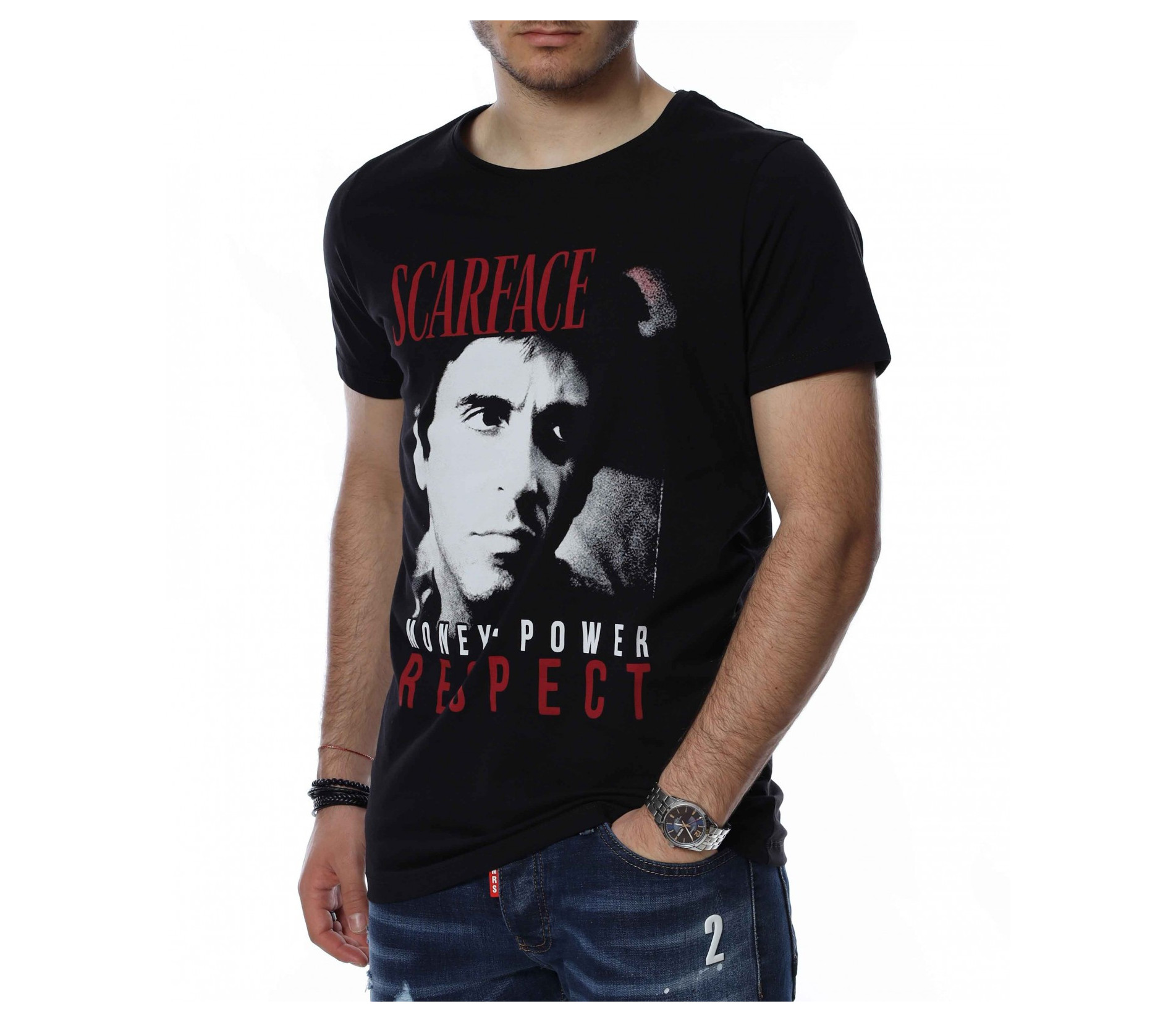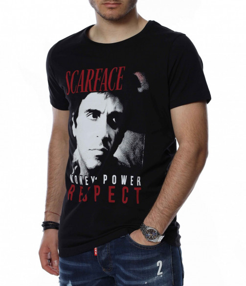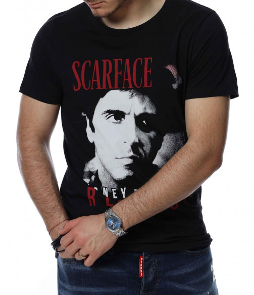 ОПИСАНИЕ НА ПРОДУКТА: Подчертай оригиналния си стил с мъжка тениска, повлияна от световното кино. Дизайна на мъжкия модел тишърт е изграден с помощта на черния, вечно актуален и класически нюанс, който е любим на голяма част от мъжкото съсловие, поради лесното съчетаване във всеки сезон. Разчупения детайл е голямата щампа в предната част на тениската, която изобразява любимия на всички актьор. Над нея е поставен и надписа Scarface ярък червен цвят, внасящ стилен контраст. Деколтето е с овална форма, следващо линията на врата, а кройката се отличава с вталеност и лека еластичност. Памучната материя от своя страна гарантира за качество в изработката и удобство през цялото ежедневие. Не губи време, а смело съчетай този стилен модел тениска с подходящ модел дънки и обувки за един изцяло завършен облик.