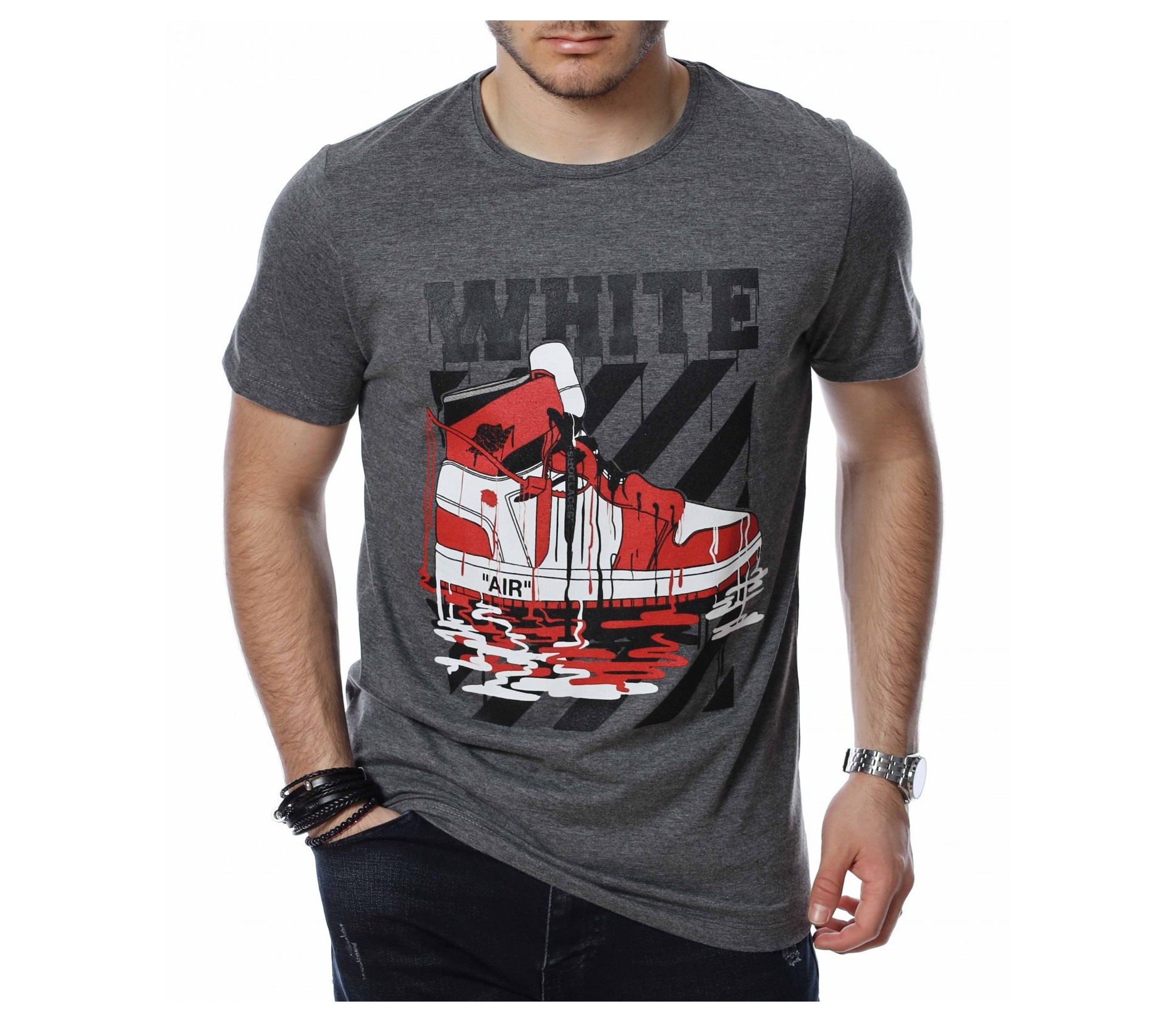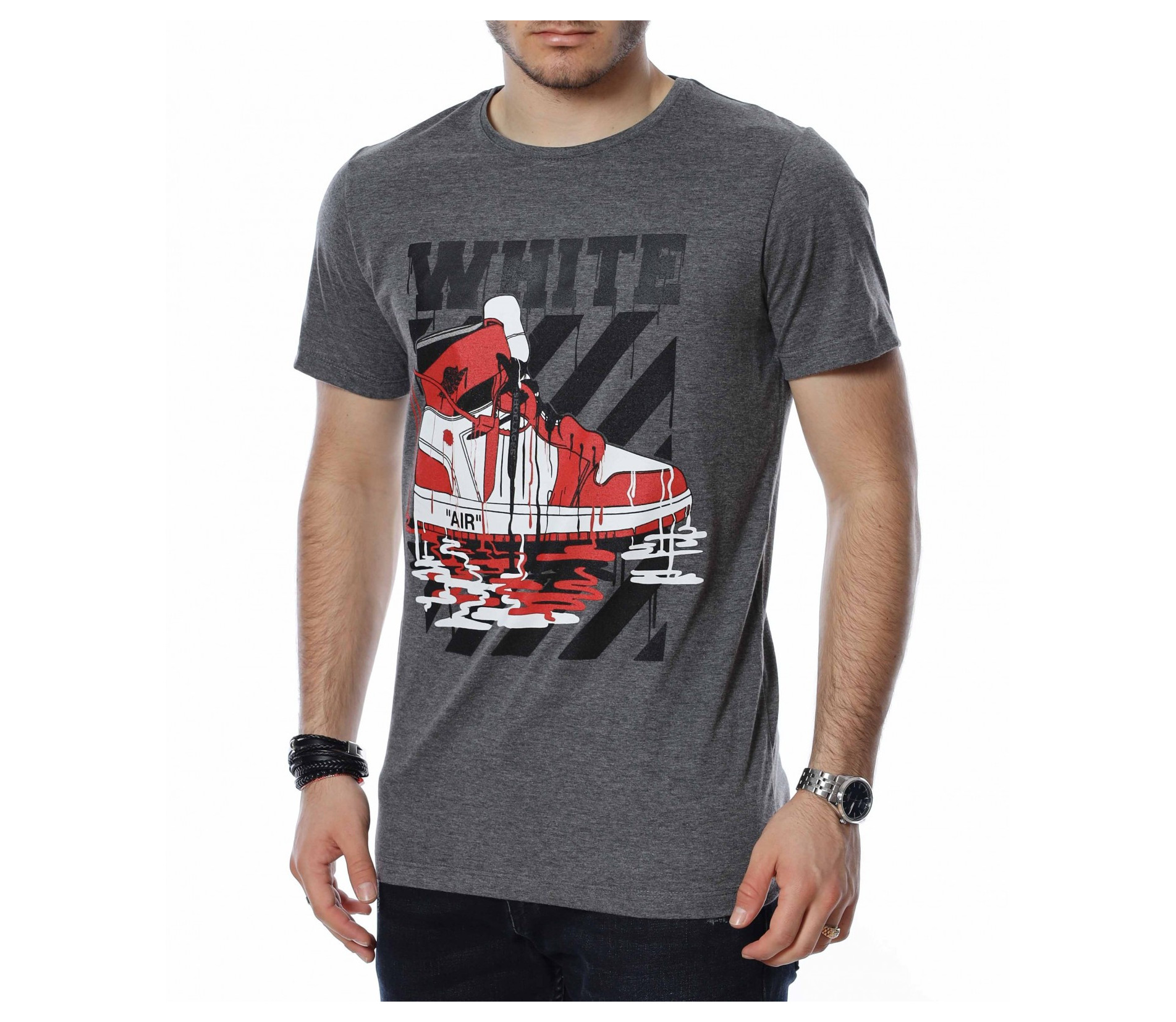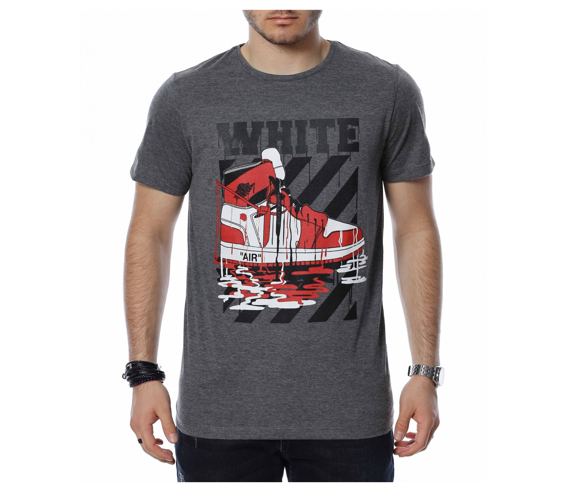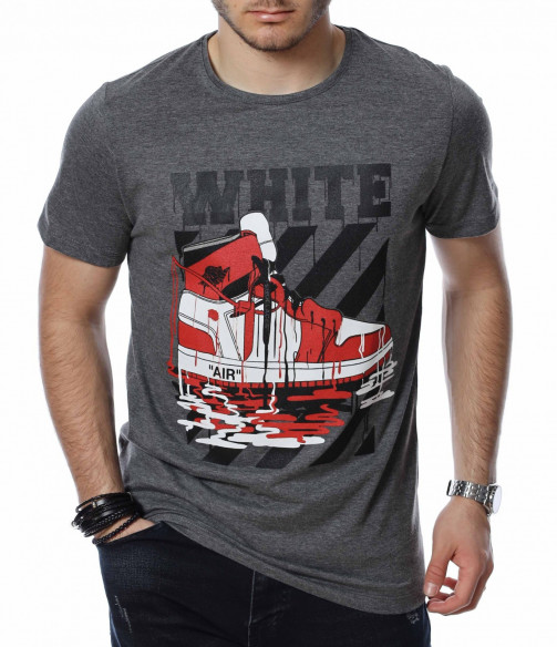 ОПИСАНИЕ НА ПРОДУКТА: Ефектен модел тениска в две цветови разновидности. Бъди свеж и различен с този интересен принт на класическите “AIR” маратонки. Над основната апликация е поставен голям надпис WHITE и основният ефект е постигнат от това, че цялата картина е полята от бяла и червена боя. Гърбът е абсолютно изчистен, деколтето е с овална форма, а кройката леко вталена, обещаваща много удобство и комфорт. Заинтригувани от модерния облик на тениската Ви приканваме да я добавите към гардероба си за 2022г. и да я съчетавате с любимите си дънки и обувки.