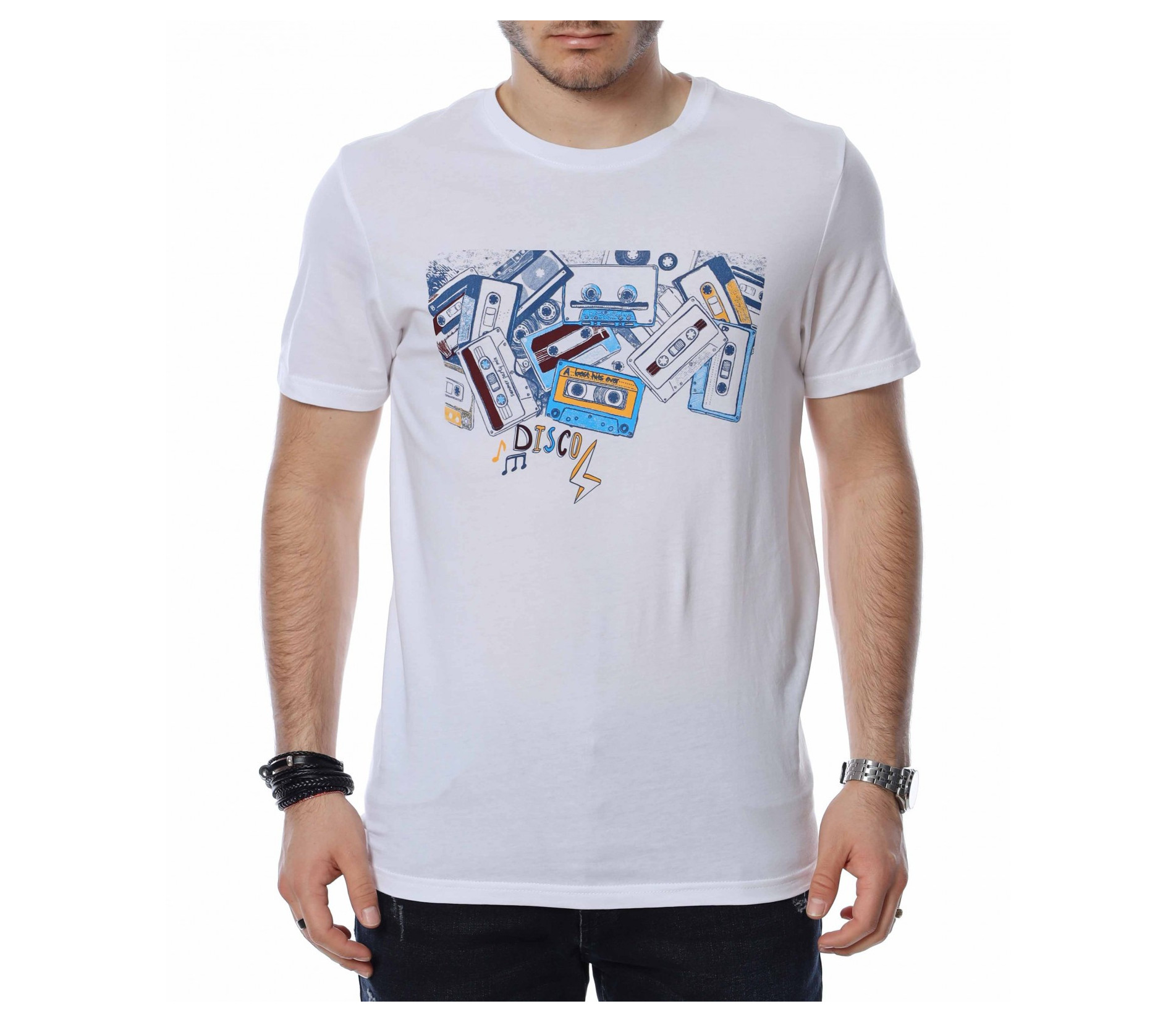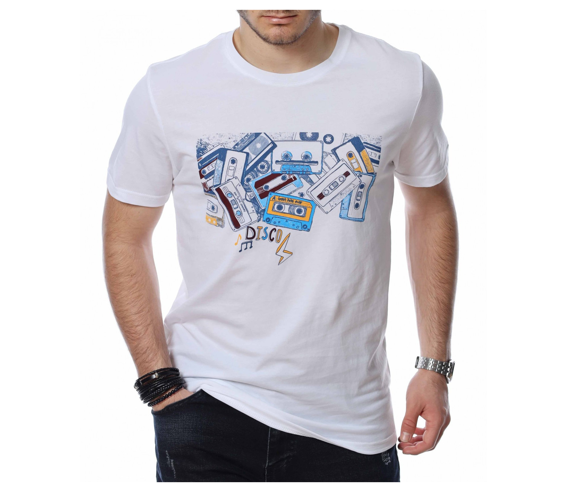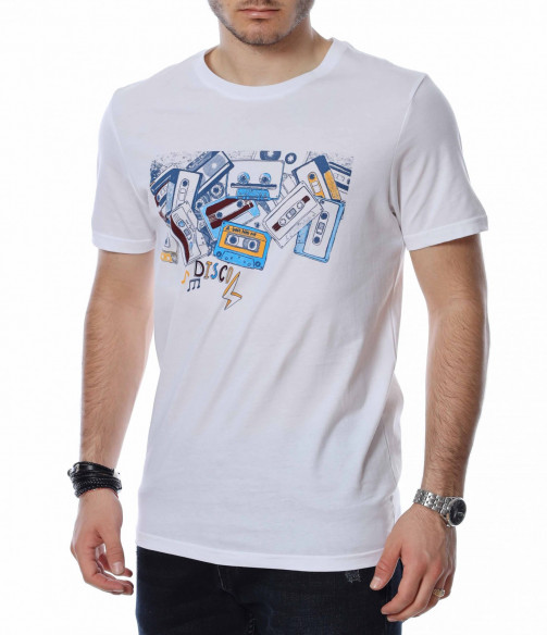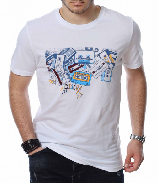 ОПИСАНИЕ НА ПРОДУКТА: Представяме на вашето внимание пролетно-лятна, мъжка тениска в няколко цвята, която неминуемо ще се превърне във вашия любим артикул този сезон. Интересна е препратката към 90-те със супер атрактивна щампа на аудио касети и надпис DISCO, които ни връщат във времето на щурите прически и хубавата музика. Задната страна на блузата е в съвсем изчистен нюанс, а материята е качествен памук за максимално удобство. Лесно съчетай по твой вкус и изгради облика си по модерен и много впечатляващ начин.