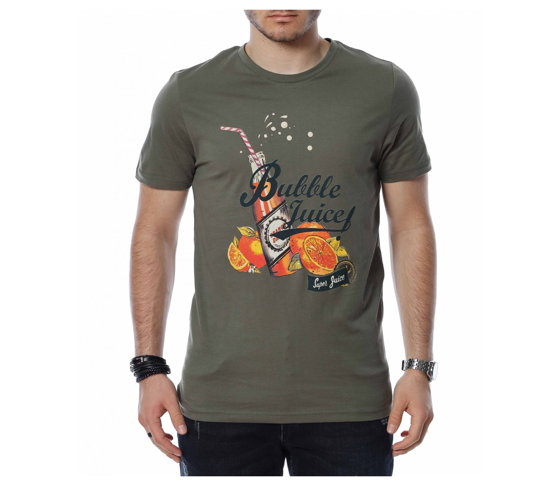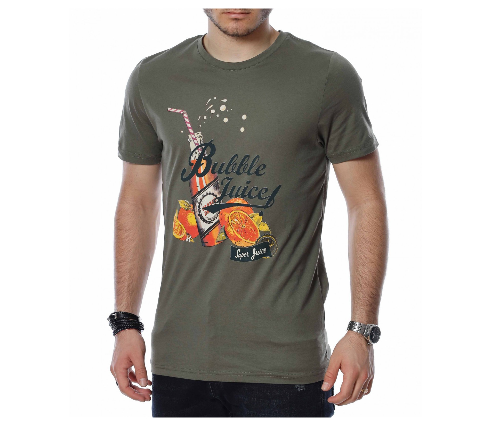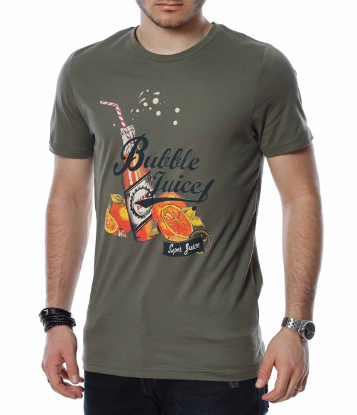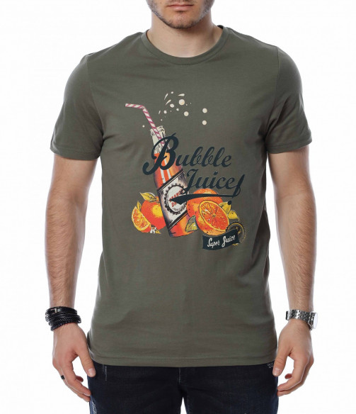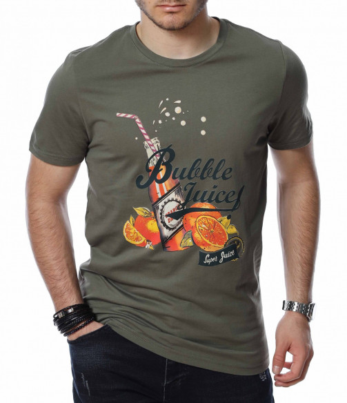 ОПИСАНИЕ НА ПРОДУКТА: Дойде и време за подновяване на пролетния гардероб, с нови и свежи попълнения. За да грабнете първи най-новите модели Ви предлагаме да започнете от сега. Представяме Ви един супер ефектен модел мъжка тениска, изработена от висок клас памук, който придава комфорт на тялото, изключително важен през топлия сезон. В основата си тениската е декорирана от едра апликация, включваща надпис BUBBLE JUICE, под който е разположен и главния акцент, в лицето на апликирана бутилка сок и плодове. Заедно с прибраното овално деколте и богатия избор от цвеотве, а именно зелен, бял и син, получавате перфектния тишърт, който да включите в съчетание с любимите дънки или панталон.