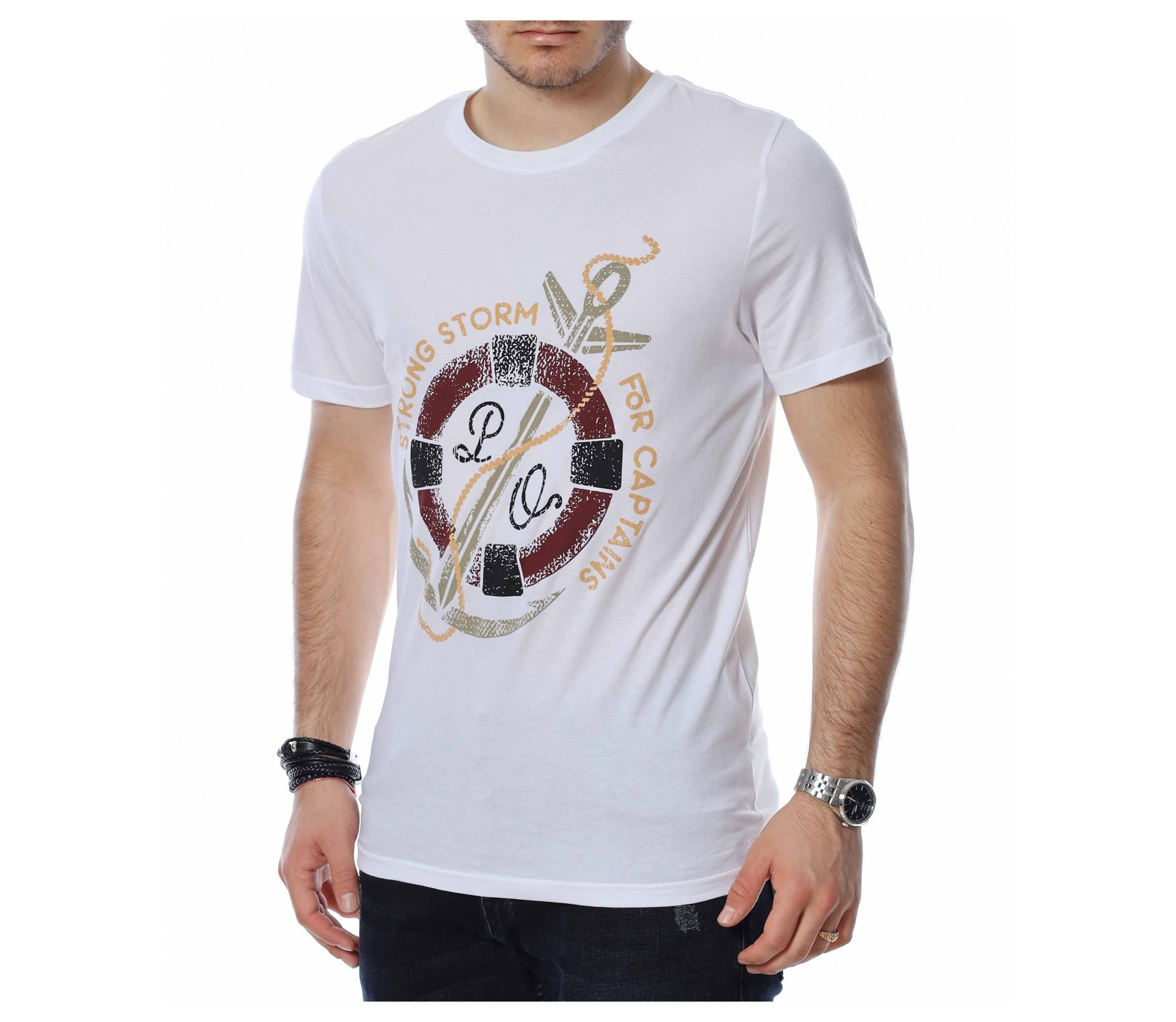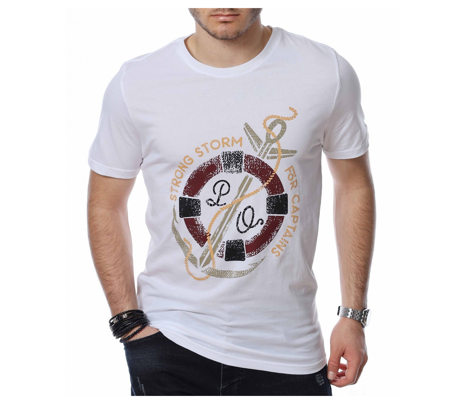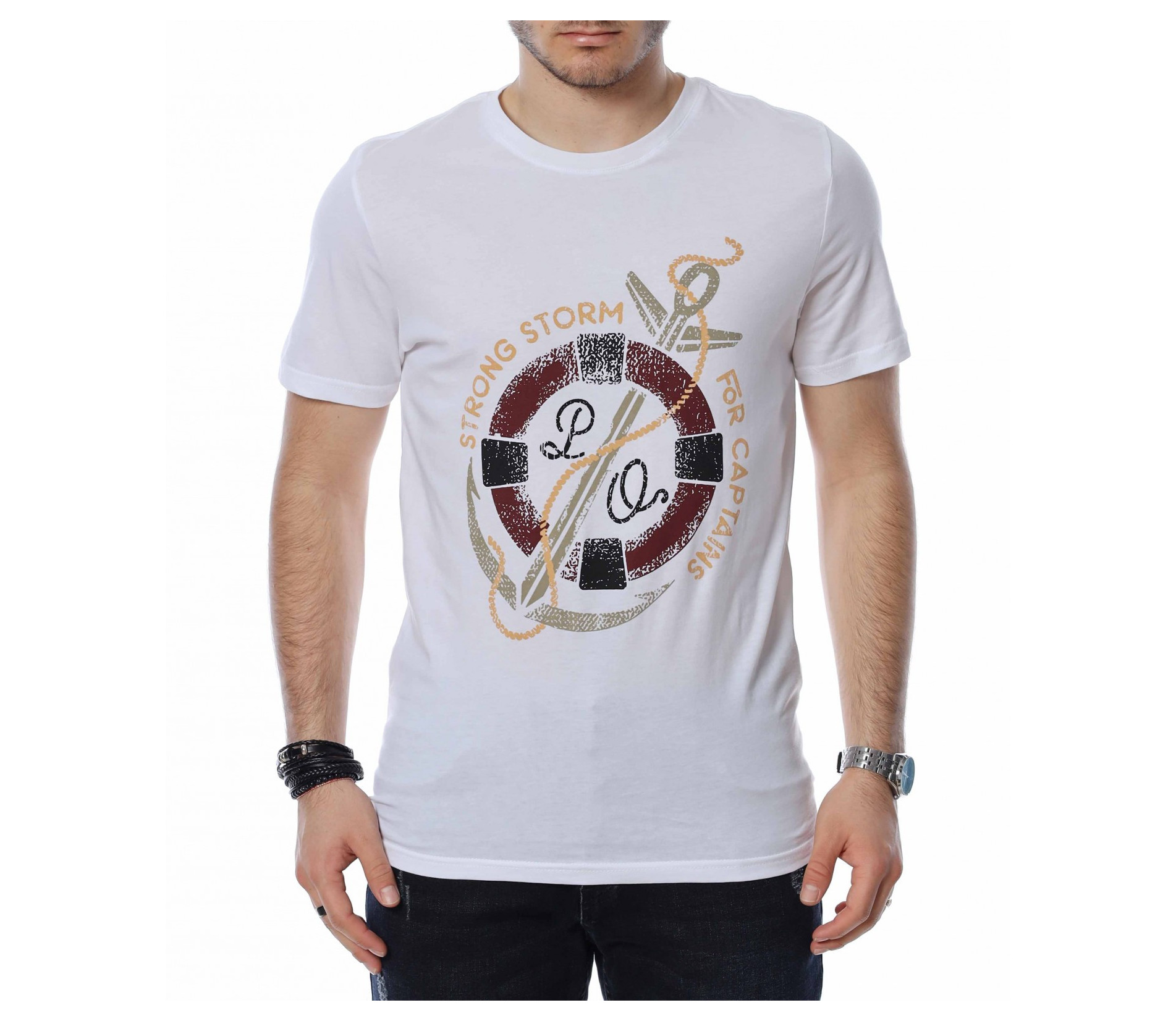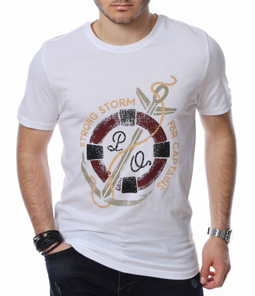ОПИСАНИЕ НА ПРОДУКТА: За всички ценители на класическите модели тениски предлагаме тази модерна фланелка в  няколко цвята. Тук еднотипната основа е семпло и много умерено разчупена от апликация в кръгла форма, която е съчетание между морски елементи и няколко надписа, които в съчетание изграждат истински атрактивен дизайн. Кройката на тази тишъртка е вталена, но въпреки това,гарантира свобода при движение и неминуем комфорт дори през най-горещите летни дни. Деколтето е с овална форма, която я прави подходяща за всеки мъжки силует. Довери се на изпитаното и лесно създай своя собствен стайлинг, като качеството и модерното излъчване ще те придружават във всяка една ситуация.