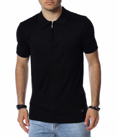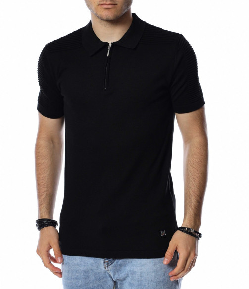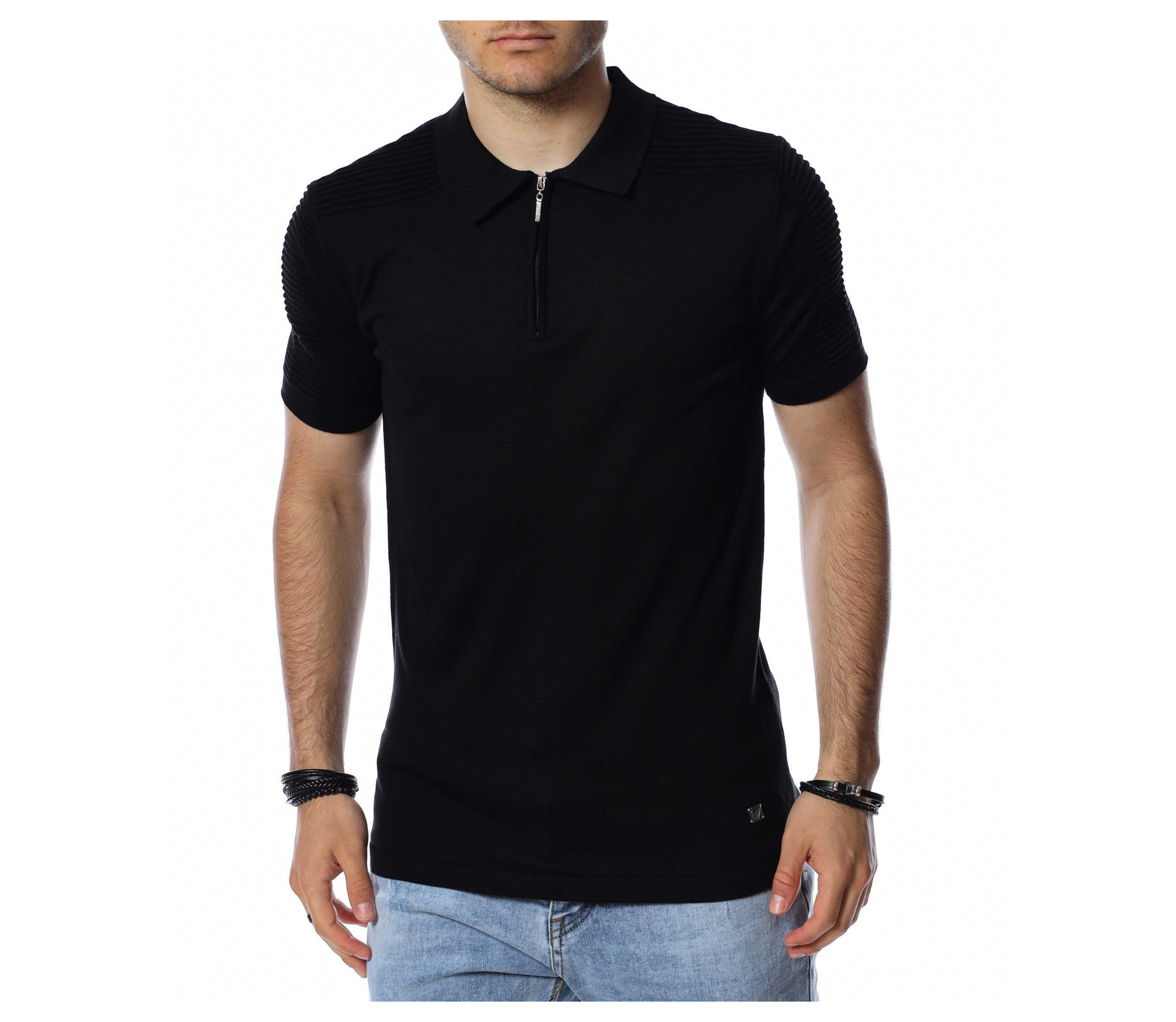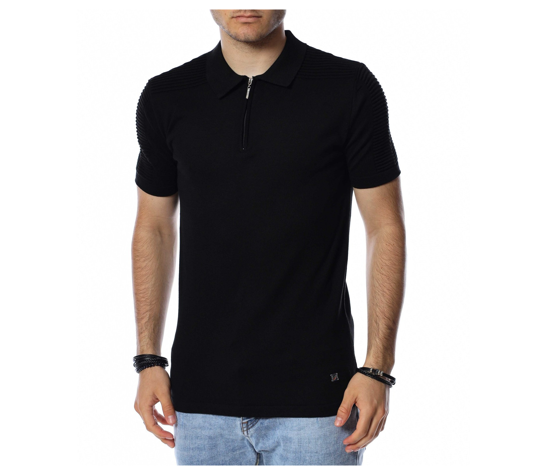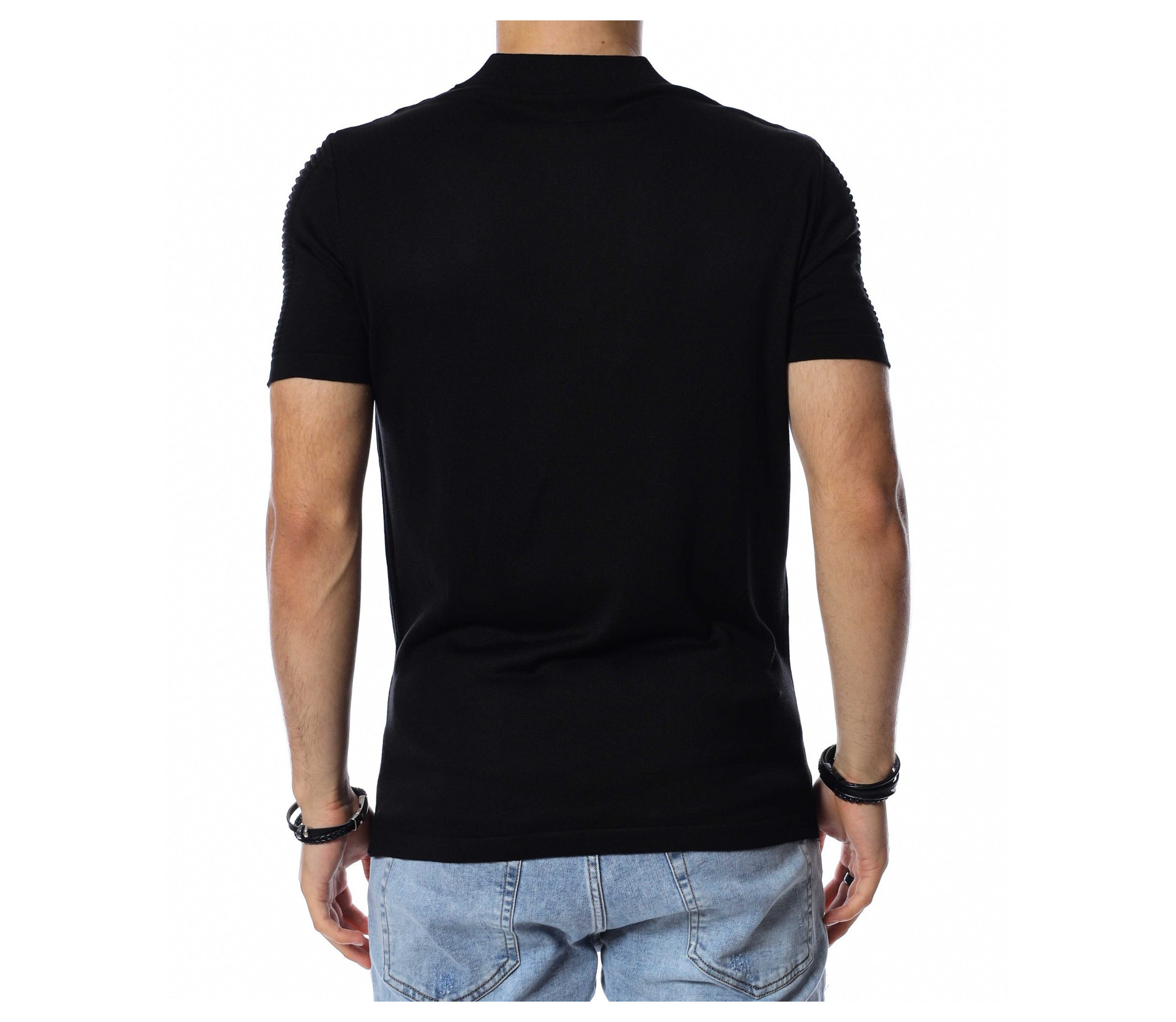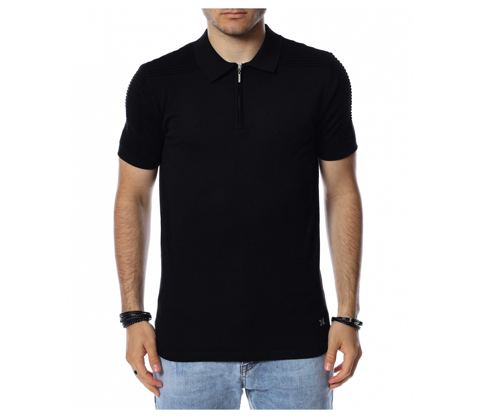 ОПИСАНИЕ НА ПРОДУКТА: Мъжка блуза с къс ръкав от фино плетиво, интересно декорирана със спортна яка. Цвета на тениската е черен, което Ви позволява да създавате безброй комбинации, с богат асортимент от дънки и панталони. Спортно-елегантния дизайн на фланелката е подсилен заради вталената кройка, която приляга по тялото Ви, като умело подсигурява и желания комфорт. В областта на яката има поставен цип, с които се слага и завършващия елемент на дизайна й. Бъдете креативни при комбинацията на този модел и го съчетайте с по-нестандартен цвят панталон или дънки, спортно-елегантни обувки и стилен аксесоар.
