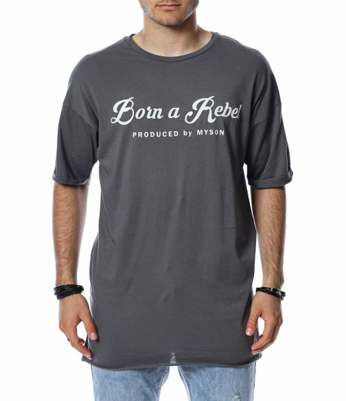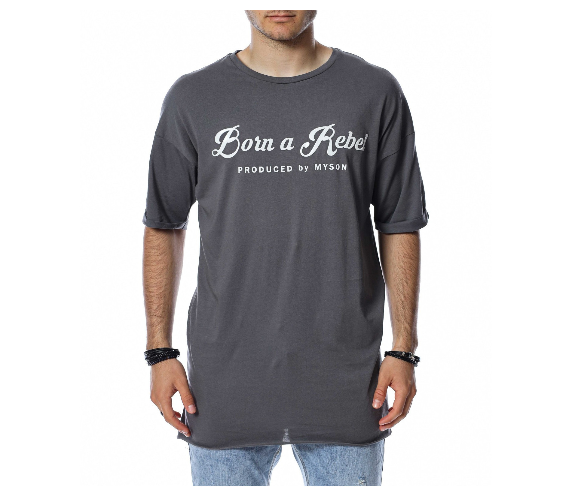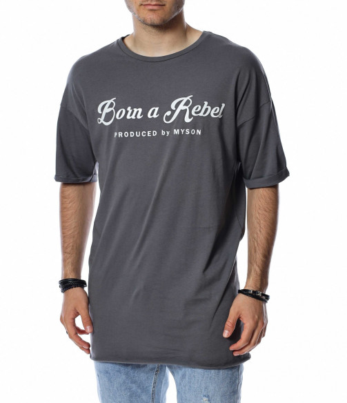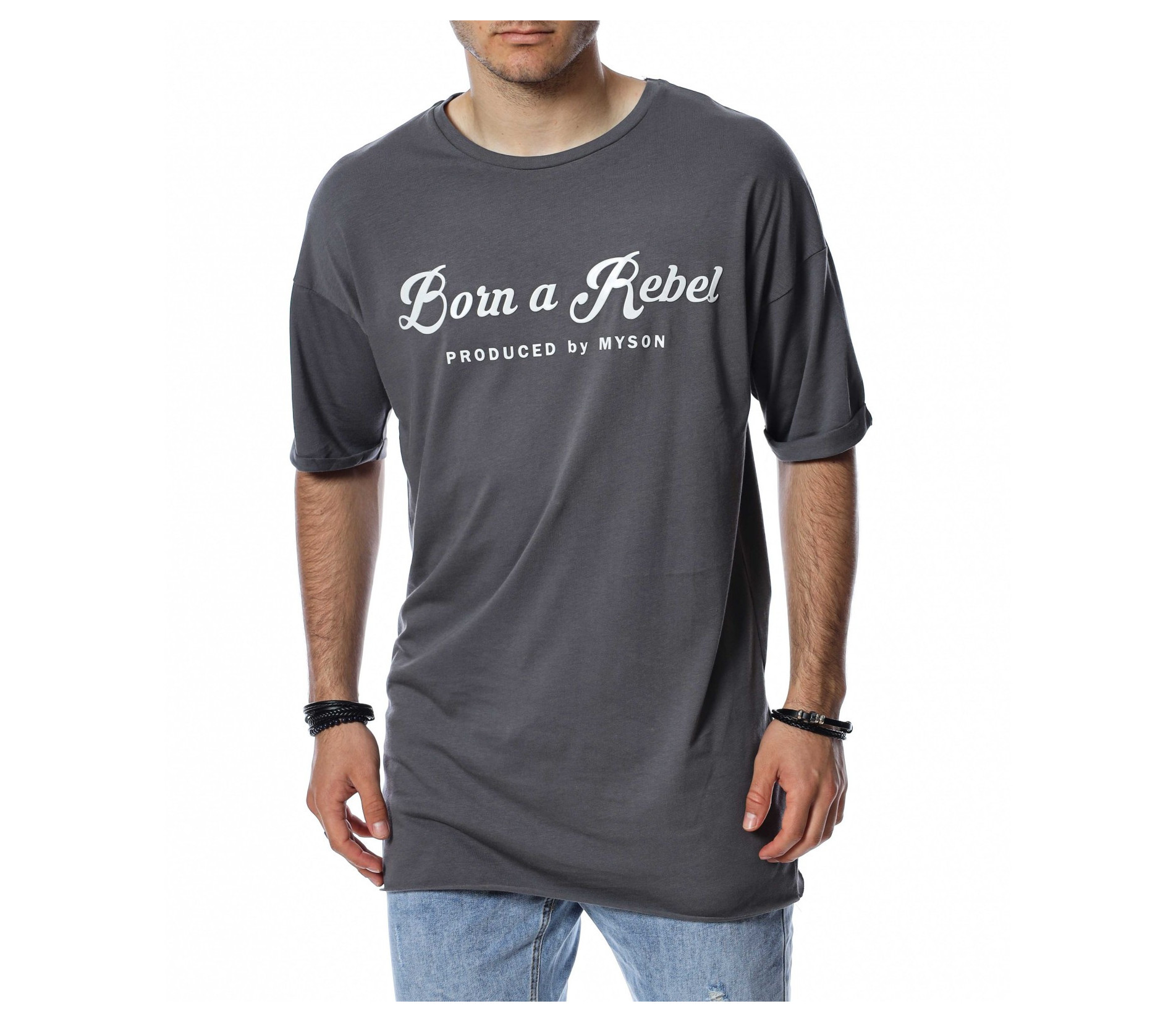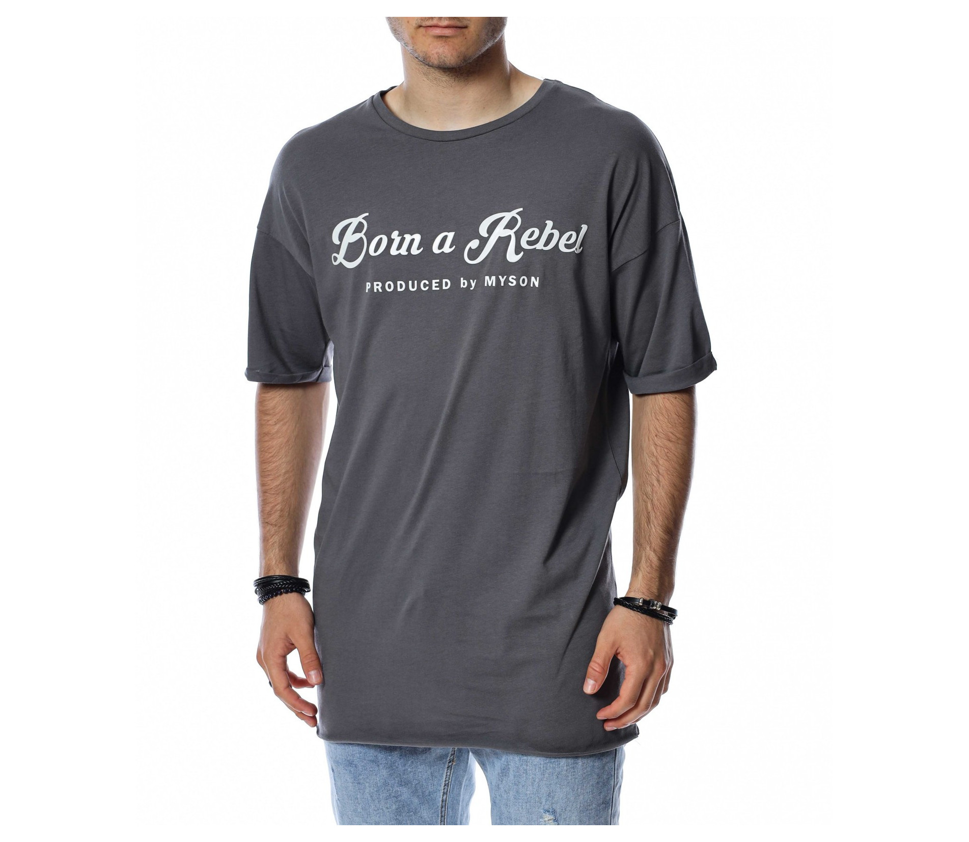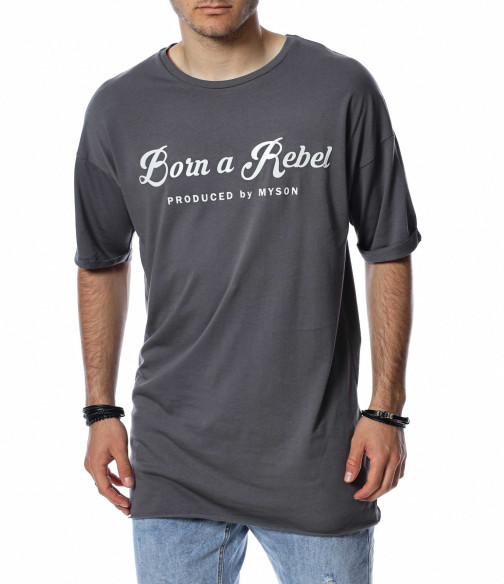 ОПИСАНИЕ НА ПРОДУКТА: Мъжка  тениска с къс ръкав с интересен надпис. Цвета е част от изчистената, тъмна гама, която перфектно се вписва при избора на мъжете, предпочитащи класическите и утвърдени модели фланелки. В областта на гърдите е поставен голям надпис в бял цвят гласящ Born a rebel. Кройката при тази блуза с къс ръкав е издължена и много актуална за този сезон, а удобството е гарантирано от висококачествен памучен плат. Наслади се на безупречна визия и съчетай с дълги или къси дънки и модерна грейка.