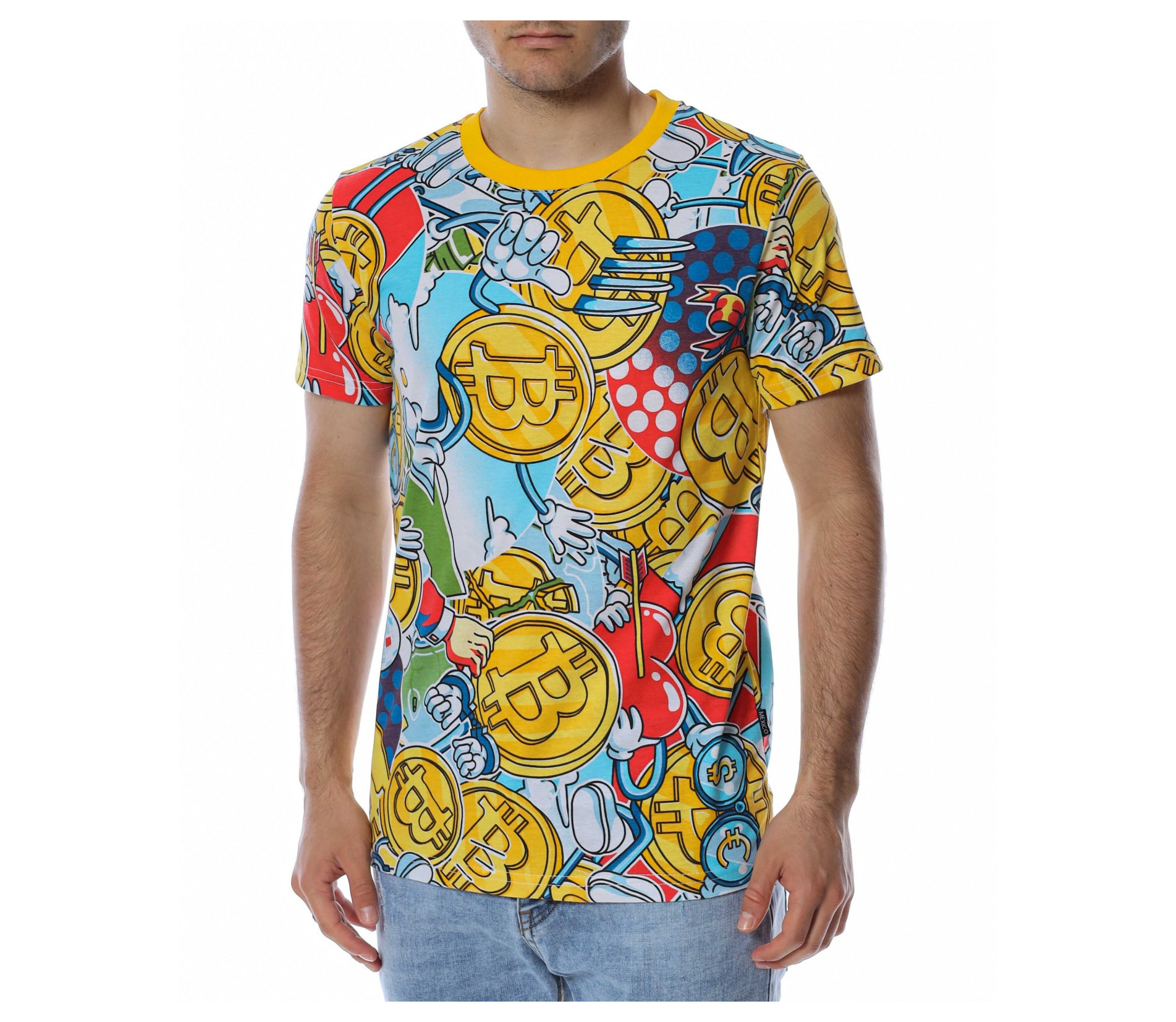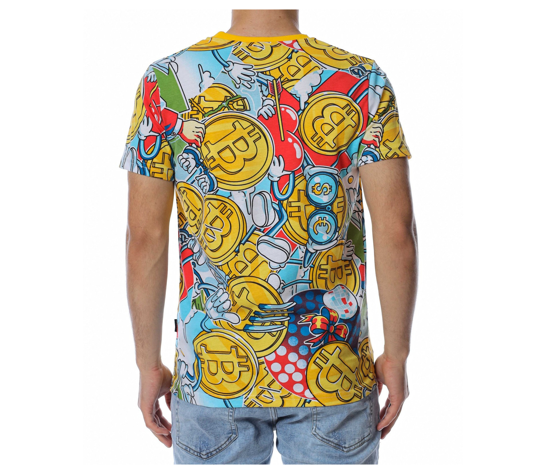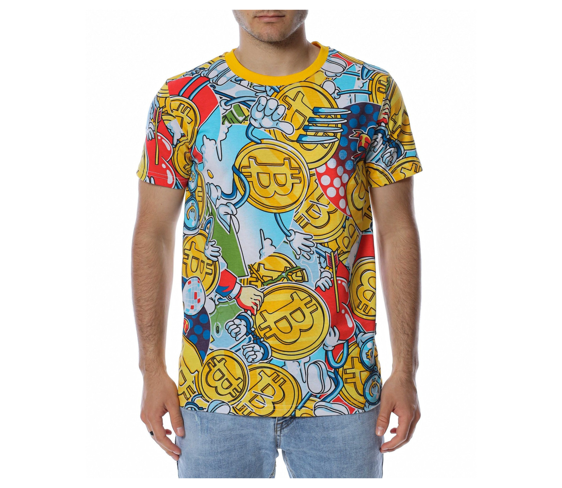 ОПИСАНИЕ НА ПРОДУКТА: Допълни своя уникален външен вид с щура мъжка тениска. Моделът е изработен от щампован памук, които лесно можеш да съчетаеш както с ¾ дънки и панталони, така и с такива в стандартна дължина. Цялата блуза е изпъстрена с биткойни и други валути. Всичко това оформя в детайли цялостния облик на фланелката, подчертаващи нейния атрактивен и много ефектен вид. Деколтето е с овална форма, а ръкавите са със стандартна дължина. Материята е памучна, с лека вталеност и е гаранция за максимален комфорт през целия ден. Зареди се с емоция и настроение за едно щуро и горещо лято в модерен облик и комфортен аутфит.