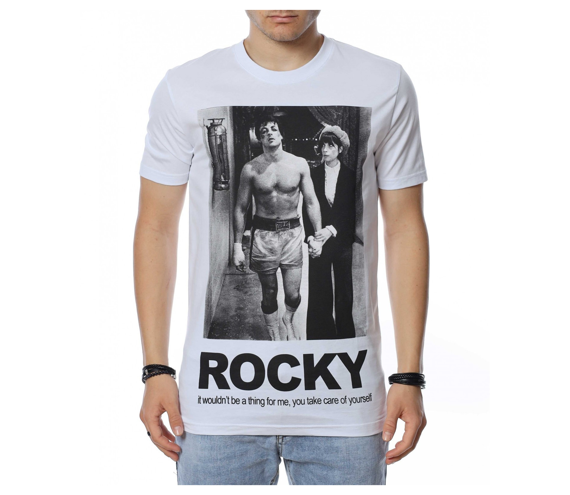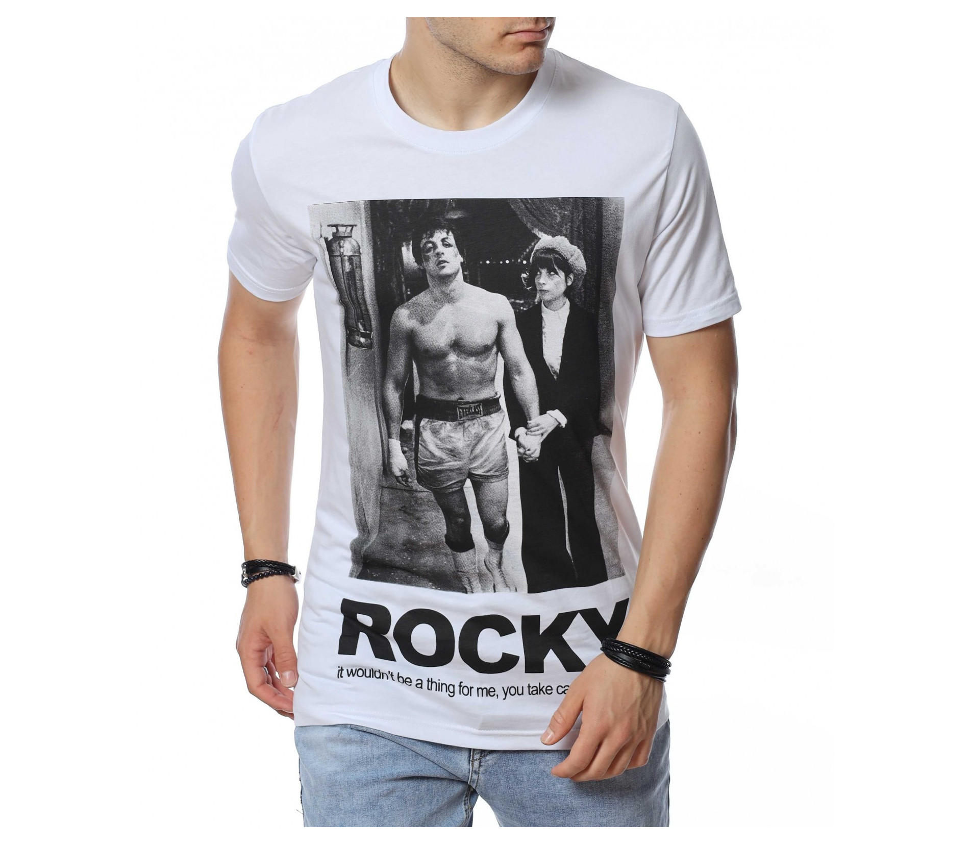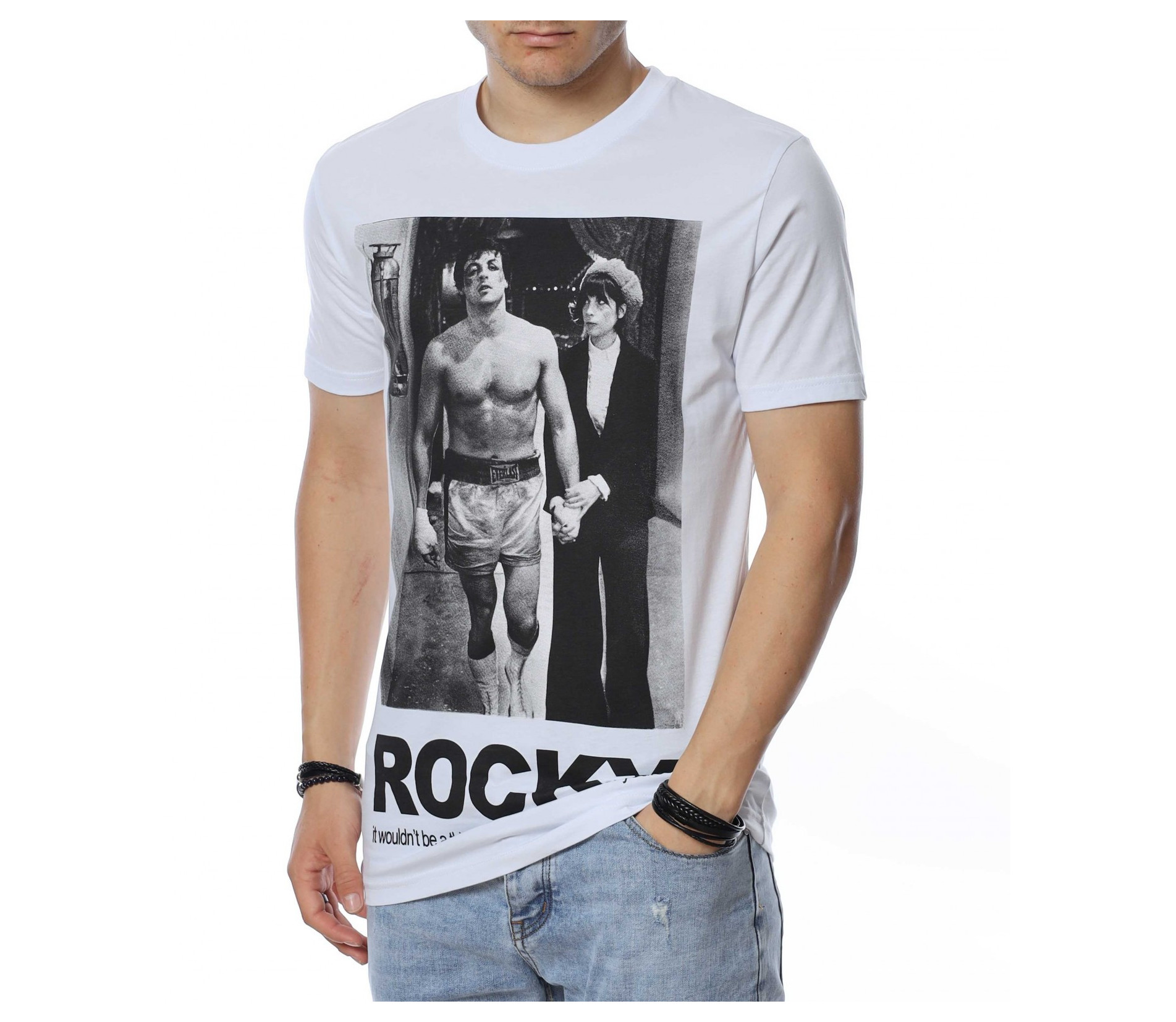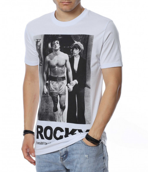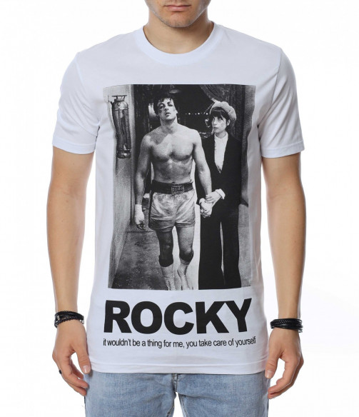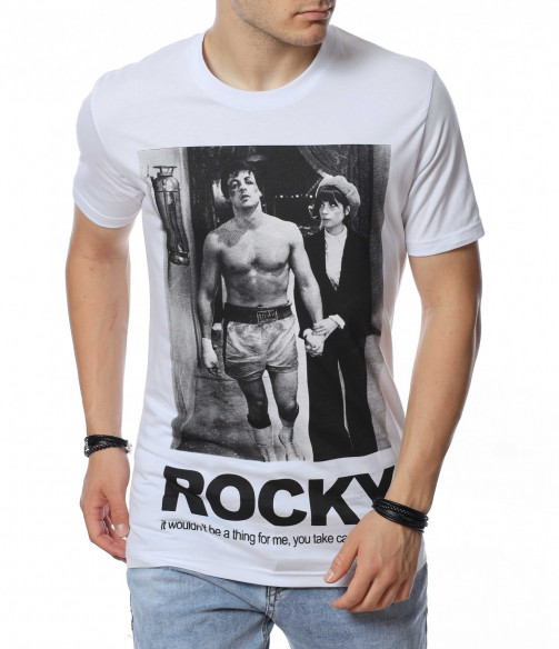 ОПИСАНИЕ НА ПРОДУКТА: Представяме на вашето внимание мъжка тениска в спортна форма, която е напълно подходяща за ежедневието и за една удобна всекидневна употреба. Цветовете са червен, черен и бял, като перфектно се вписват във всеки мъжки имидж. Изработена от изцяло памучна материя, тениската е гаранция за удобство и комфорт при носене. Върху лицевата страна на фланелката е поставена голяма щампа със сцена от филма Роки и голям надпис под нея. Деколтето е в любимата на всички семпла овална линия, внасяща атрактивен и същевременно стилен външен вид. Бъди позитивен във всяко отношение и се довери на класическото излъчване с този модерен и впечатляващ модел тениска с къс ръкав.