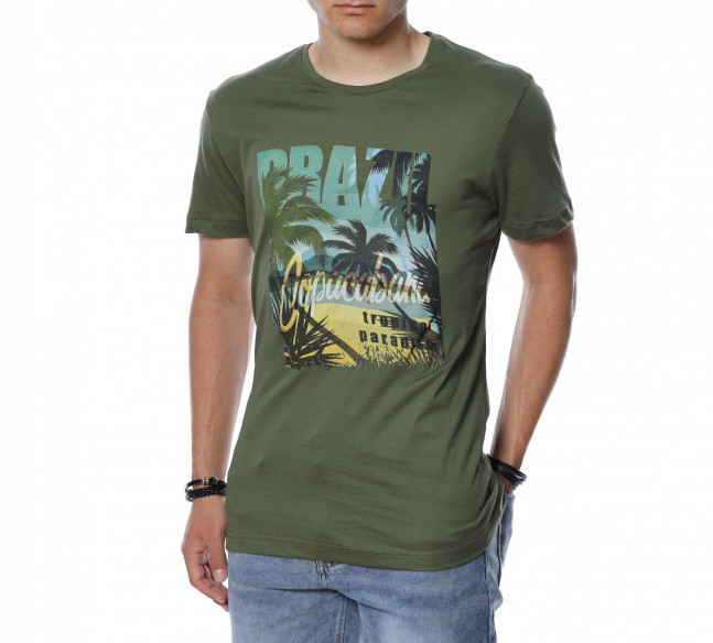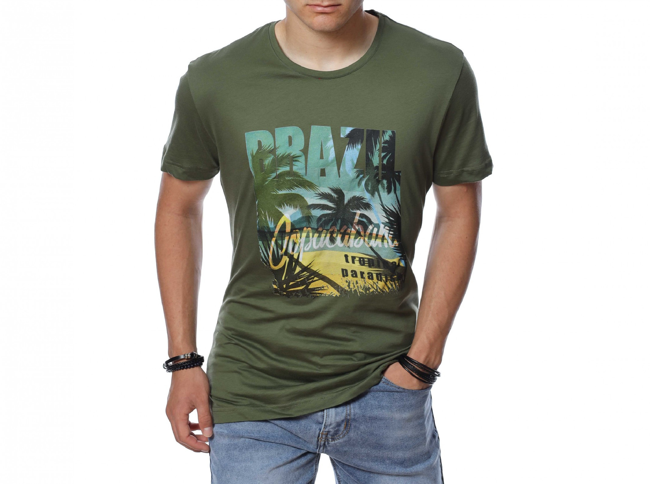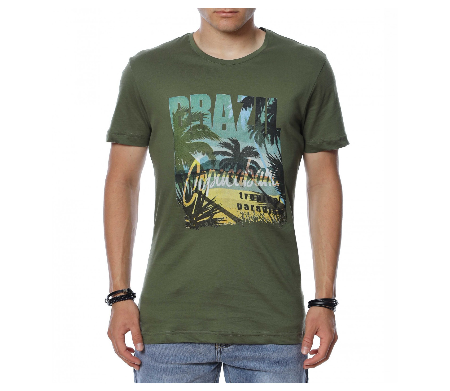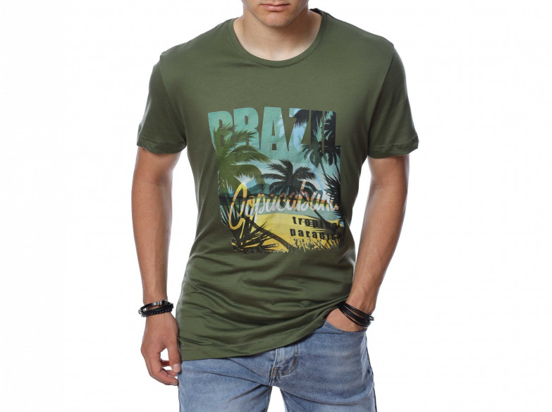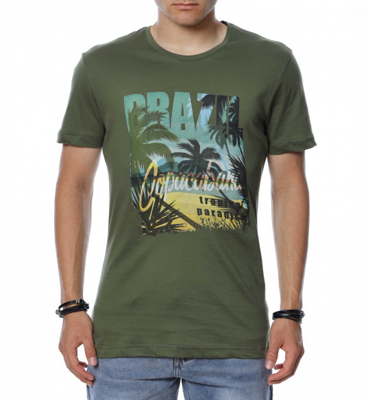 ОПИСАНИЕ НА ПРОДУКТА: Тази тениска с къс ръкав е перфектна за ежедневието, като актуалния зелен цвят е любими на много мъже. Класическия цветови нюанси смело са акцентирани от щампа с плажна гледка и надпоси Brazil и Copacabana в областта на гърдите, чиито ярък, контрастиращ елемент придава раздвиженост и подчертава изцяло принта на иначе традиционния вид на тишърта. Кройката е леко свободна, а изцяло памучната материя гарантира за непринуденото удобство през цялото ежедневие. Деколтето от своя страна е овално, изграждащо спортния вид на тениската. Създай своята индивидуална комбинация с чифт къси дънки и кецове за удобно изживяване през целия ден.