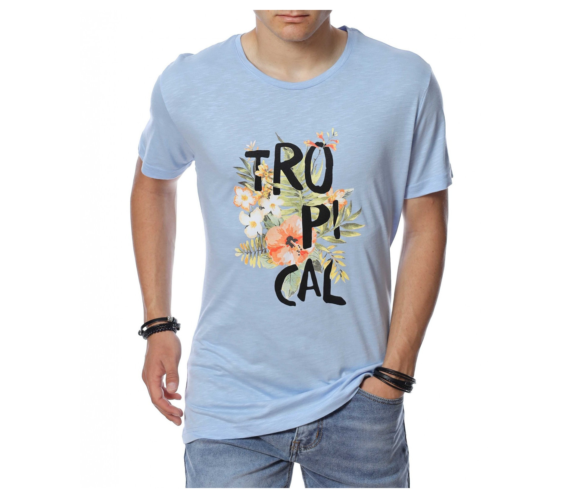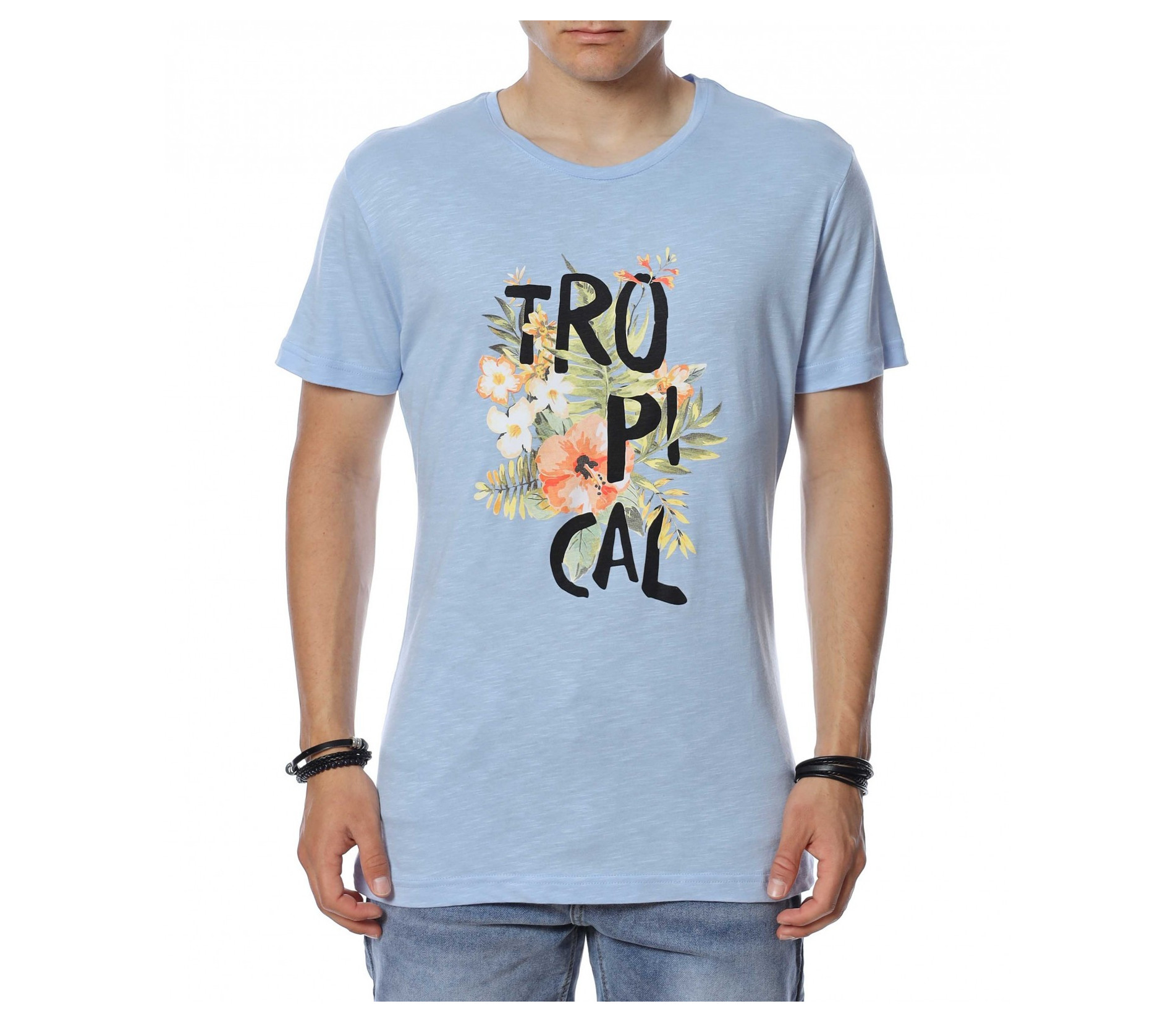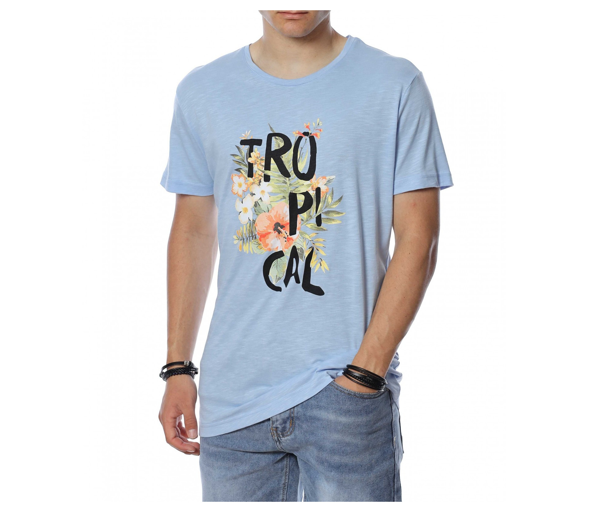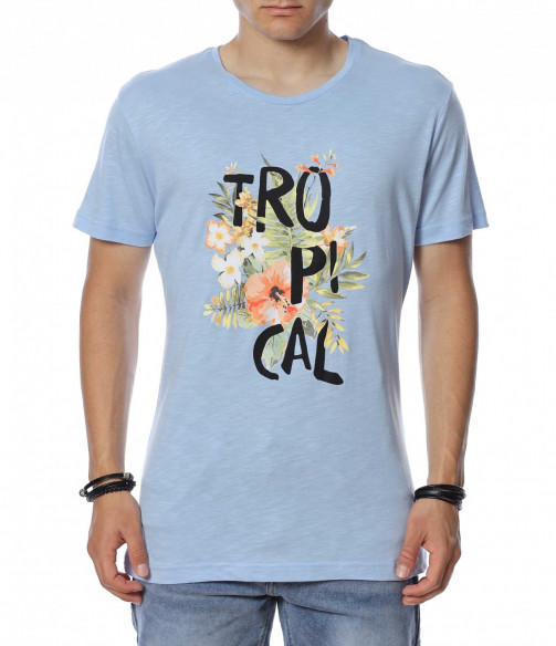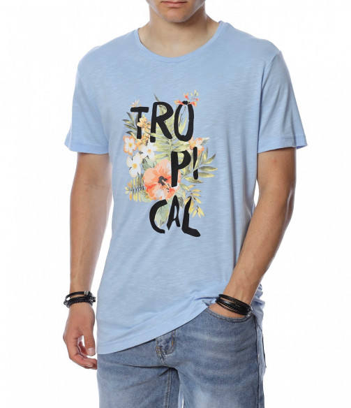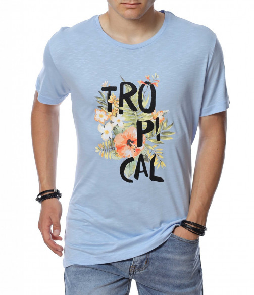 ОПИСАНИЕ НА ПРОДУКТА: Мъжка стилна тениска с интересен принт. В предната част е поставена ефектна щампа, която представлява цветя и разчупен надпис Tropical. Акцента пада върху апликацията, защото гърбът е напълно изчистен. Моделът е с вталена кройка, овално деколте и стандарта дължина. В съчетание със спортен панталон или дънки, стилни кецове и аксесоар по Ваш вкус, завършвате идеална куул визия подходяща за всеки случай. Тениската е изработена от 100% висококачествен памук.