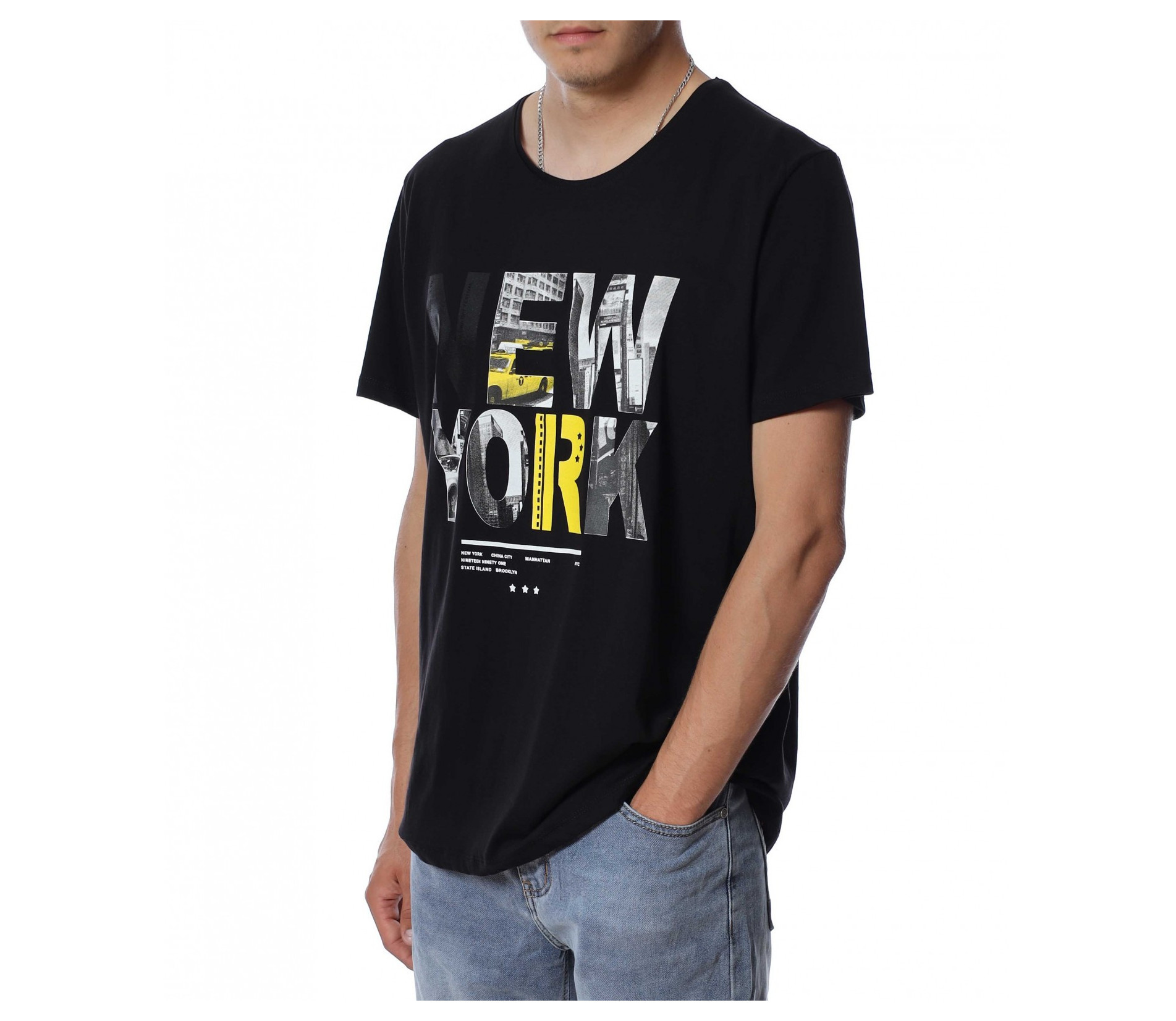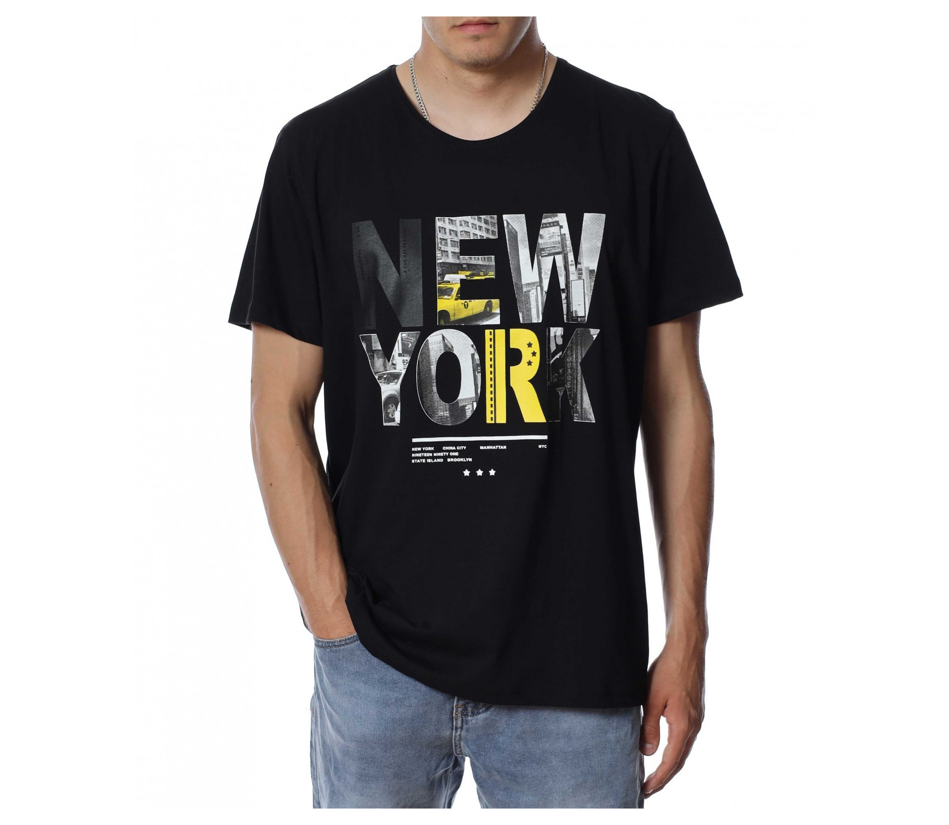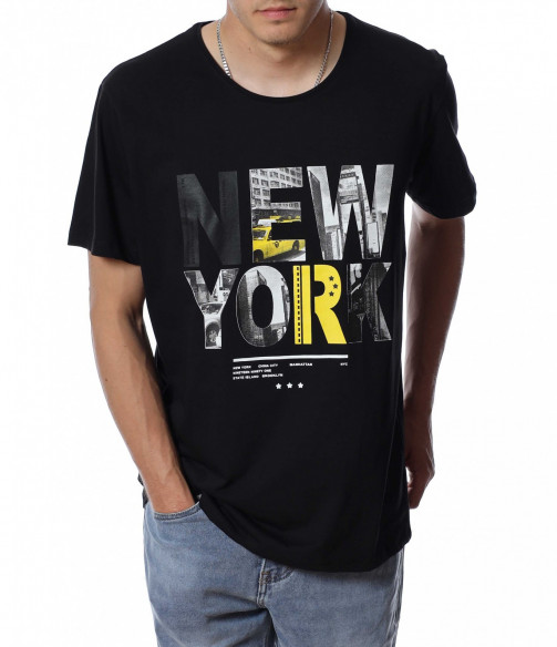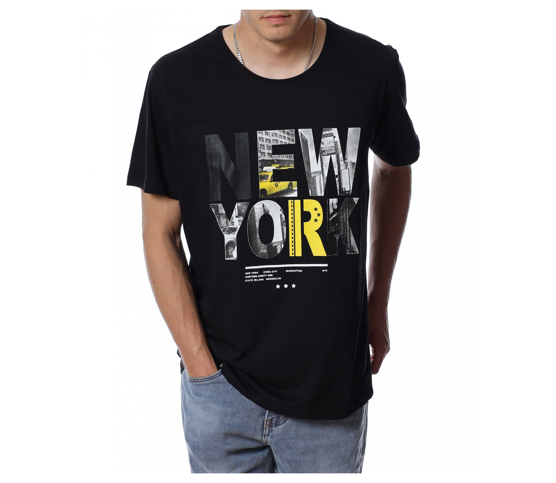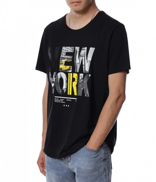 ОПИСАНИЕ НА ПРОДУКТА: Предлагаме ви атрактивно стилно попълнение към вашия гардероб. Тази тениска впечатлява със своя стилен външен вид, който е комбинация от класическите черен цвят и голям надпис NEW YORK. Гърба на тишърта е лишен от всякакви декоративни елементи, като целта е вниманието да се съсредоточи върху предната част. Тениската е изработена от памучна материя, гарантираща удобство и комфорт и се предлага в по-големи размери. Деколтето е в любимата на всички овална форма. Стани център на вниманието с ефектна тениска от ново поколение.