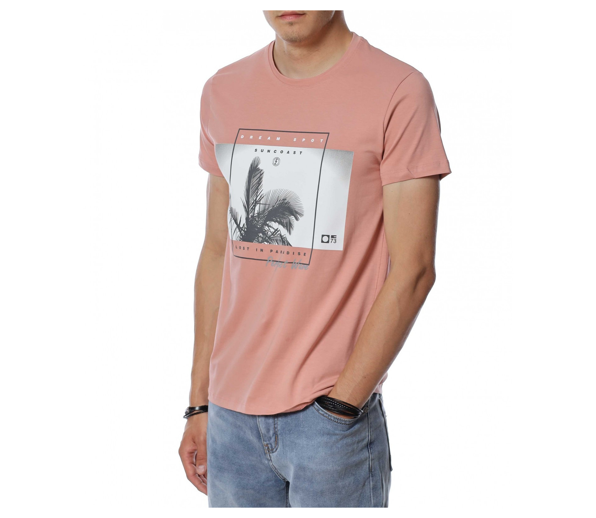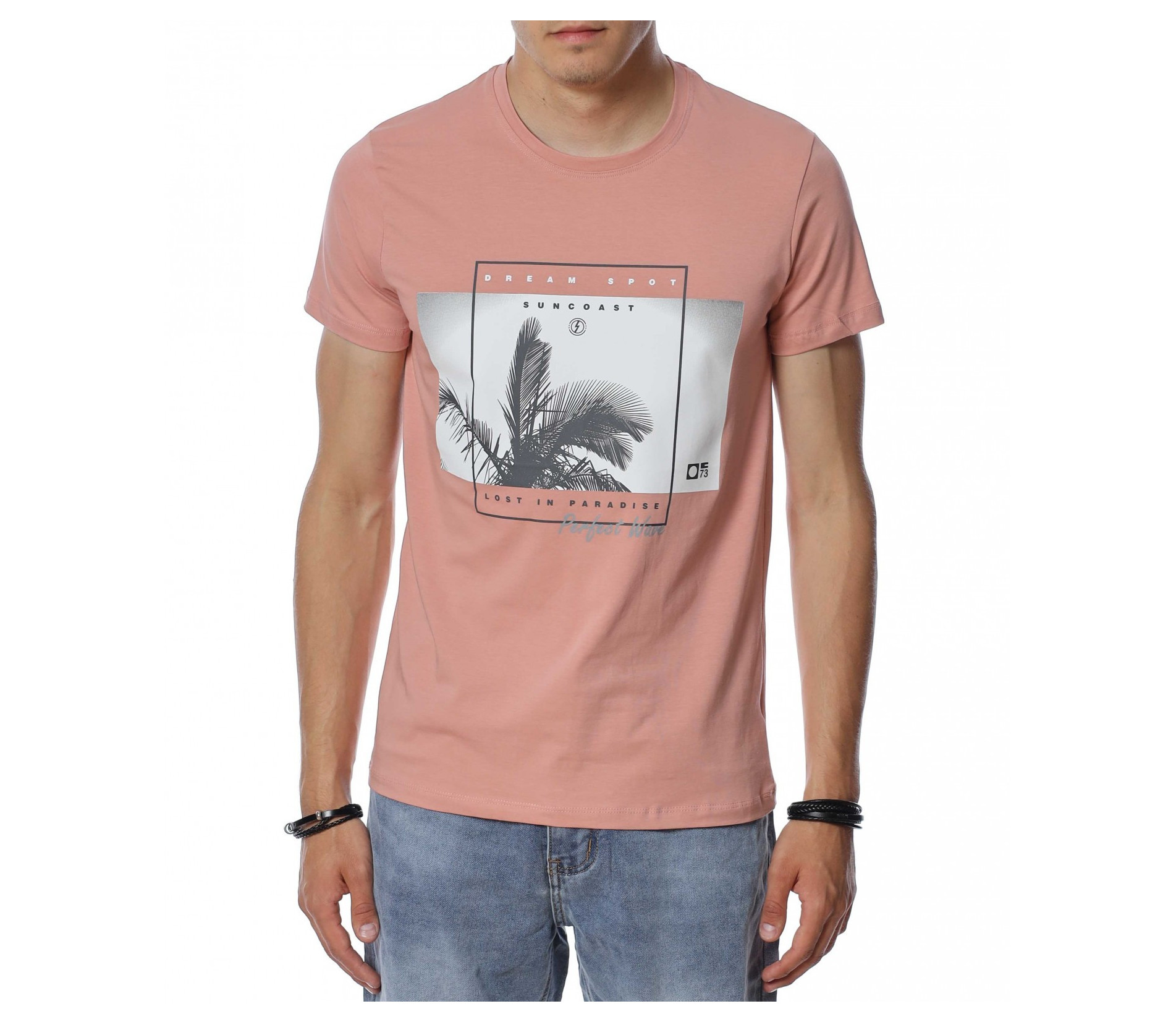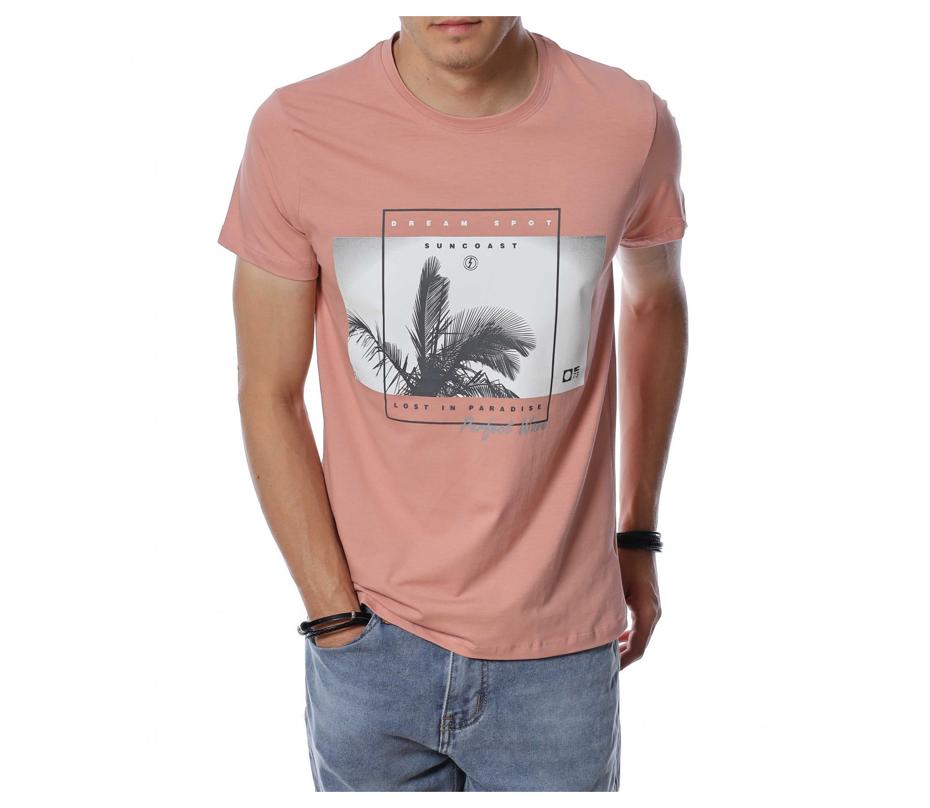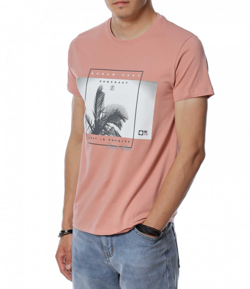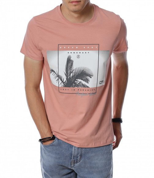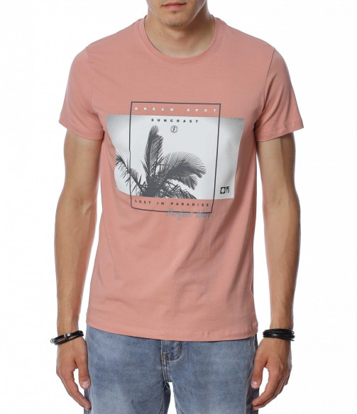 ОПИСАНИЕ НА ПРОДУКТА: Внеси семпъл акцент в твоя летен имидж, доверявайки се на тениски в класическа форма. Точно такава е тази мъжка фланелка, която е изградена от розов нюанс, създаващ усещане за елегантност. Съвсем ненатрапчивия цветови аспект е предпоставка за лесна комбинация с всякакви дънки или памучни панталони както в къс, така и в дълъг вариант. Моделът мъжка тениска е декориран с фотография на палма подчертана със семпла рамка и надписи, като се превръща в любим артикул на любителите на класните модели. Кройката е леко вталена, а материята е памучна с добавен еластан, осигуряваща комфорт и свобода при движение. Деколтето е в любимата на всички овална форма, подчертано от малък кант в същия основен принт. Наслади се на безупречна визия и съчетай с дълги или къси дънки и модерни кецове.