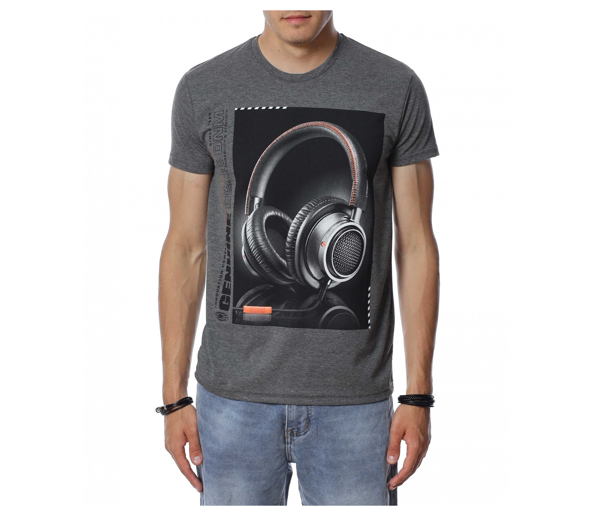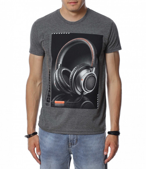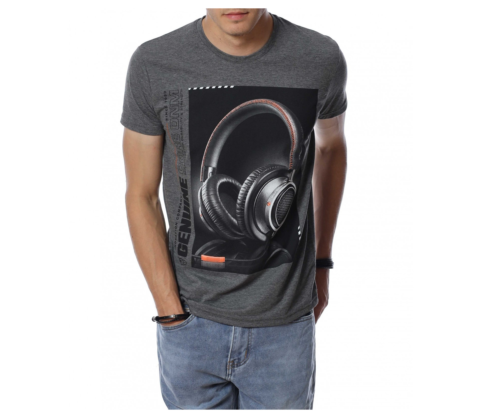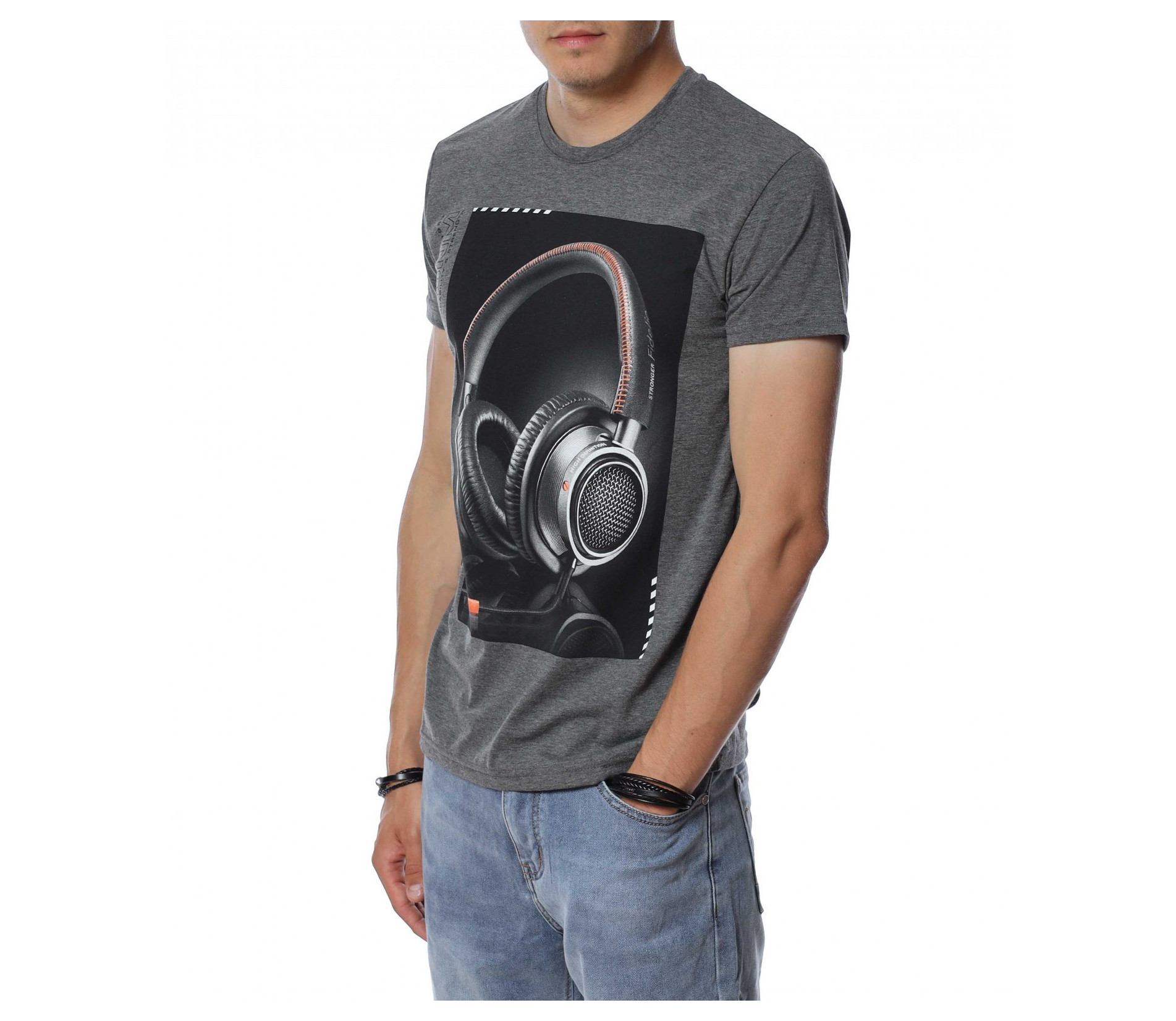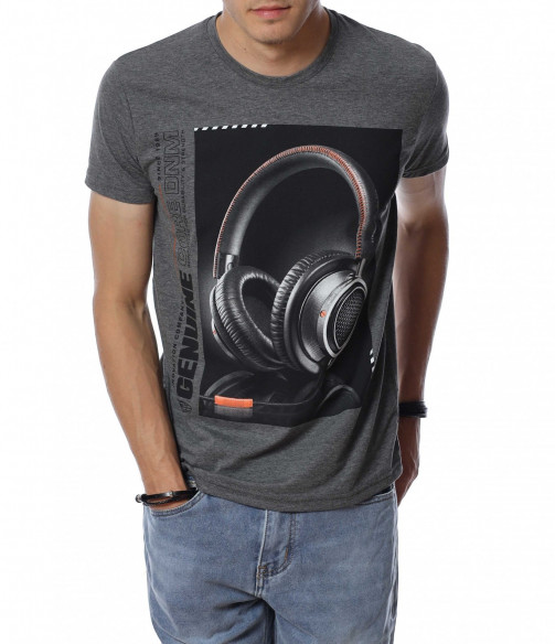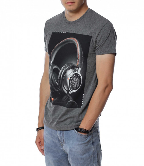 ОПИСАНИЕ НА ПРОДУКТА: Мъжка  тениска с къс ръкав с интересна илюстрация. Цвета е част от изчистената, тъмна гама, която перфектно се вписва при избора на мъжете, предпочитащи класическите и утвърдени модели фланелки. Цялата предна част е обхваната от голяма щампа със слушалки и надписи. Кройката при тази блуза с къс ръкав е леко вталена, а удобството е гарантирано от висококачествен памучен плат. Наслади се на безупречна визия и съчетай с дълги или къси дънки и модерни обувки.
