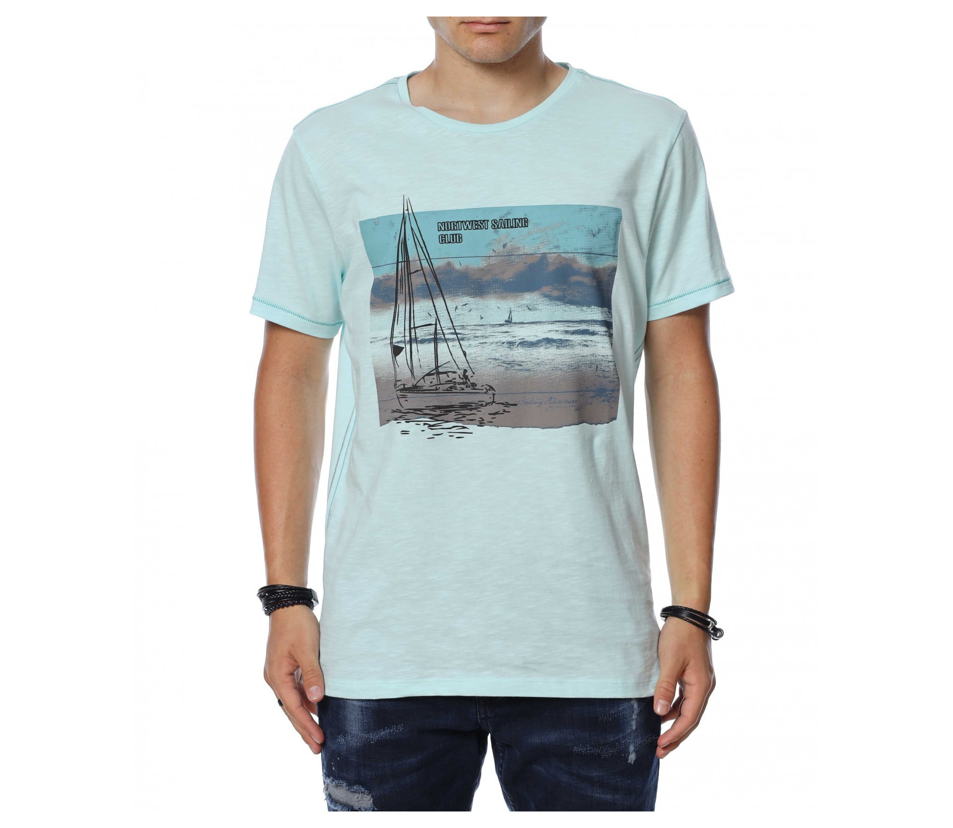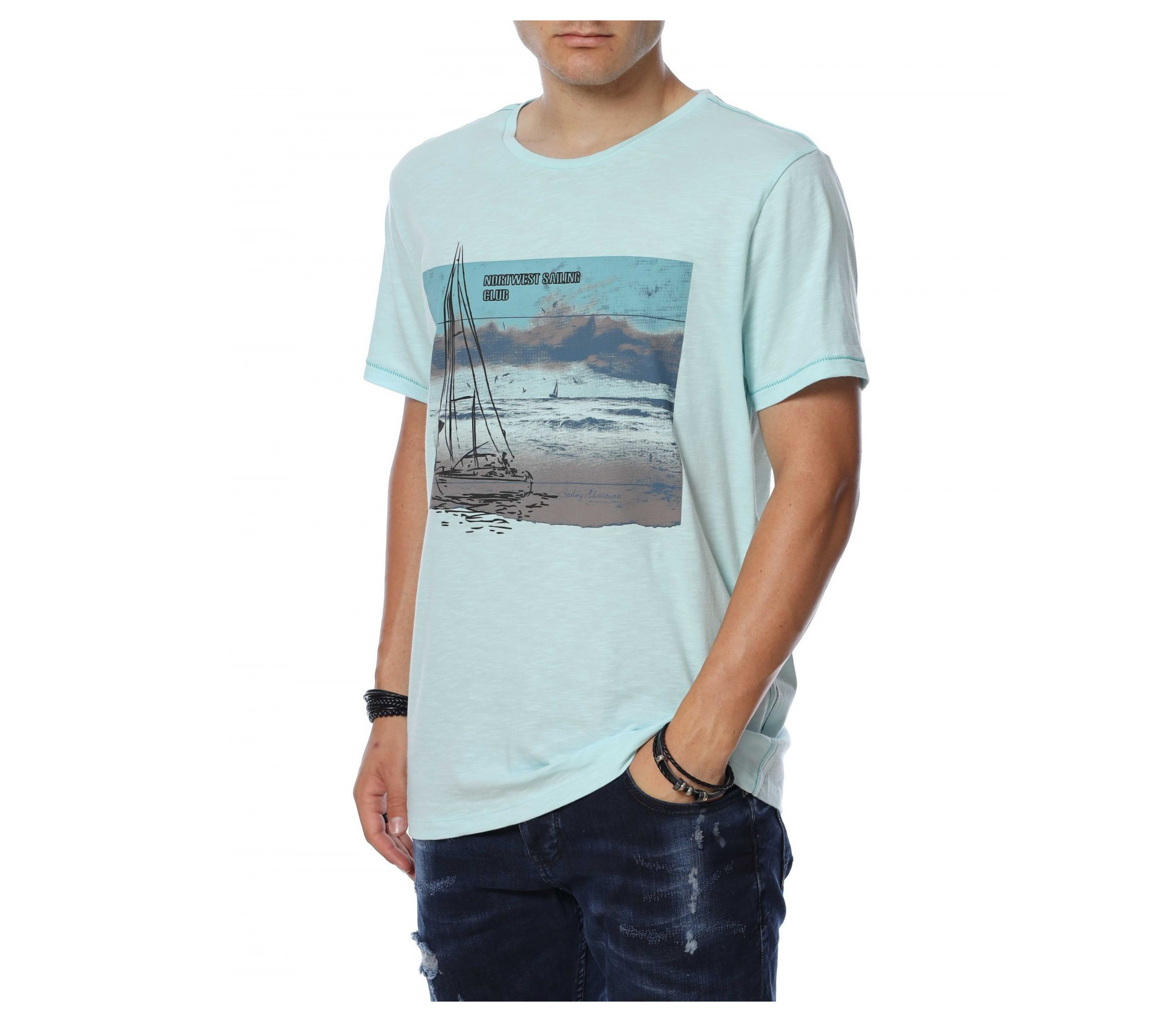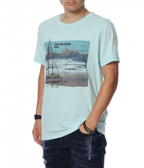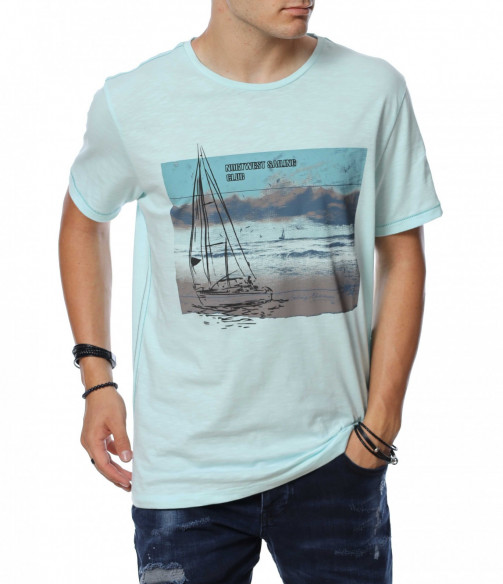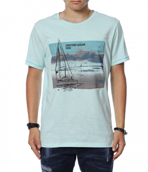 ОПИСАНИЕ НА ПРОДУКТА: Мъжка актуална тениска с интересен принт. В предната част е поставена голяма апликация на яхта и плаж. В областта на гърба моделът е изчистен и се залага на добрата кройка и цвят. Като акцент са поставени декоративни шевове от двете странични страни на тениската . Този модел тишърт е с овално деколте, свободна кройка и прави краища. В съчетание със стилни дънки, спортни кецове и колан като аксесоар, получавате впечатляваща визия подходяща както за всеки ден, така и за завършване на перфектната клубна визия. Освен уникален вид, този модел ви осигурява комфорт и качество заради изработката си от 100% парен памук.