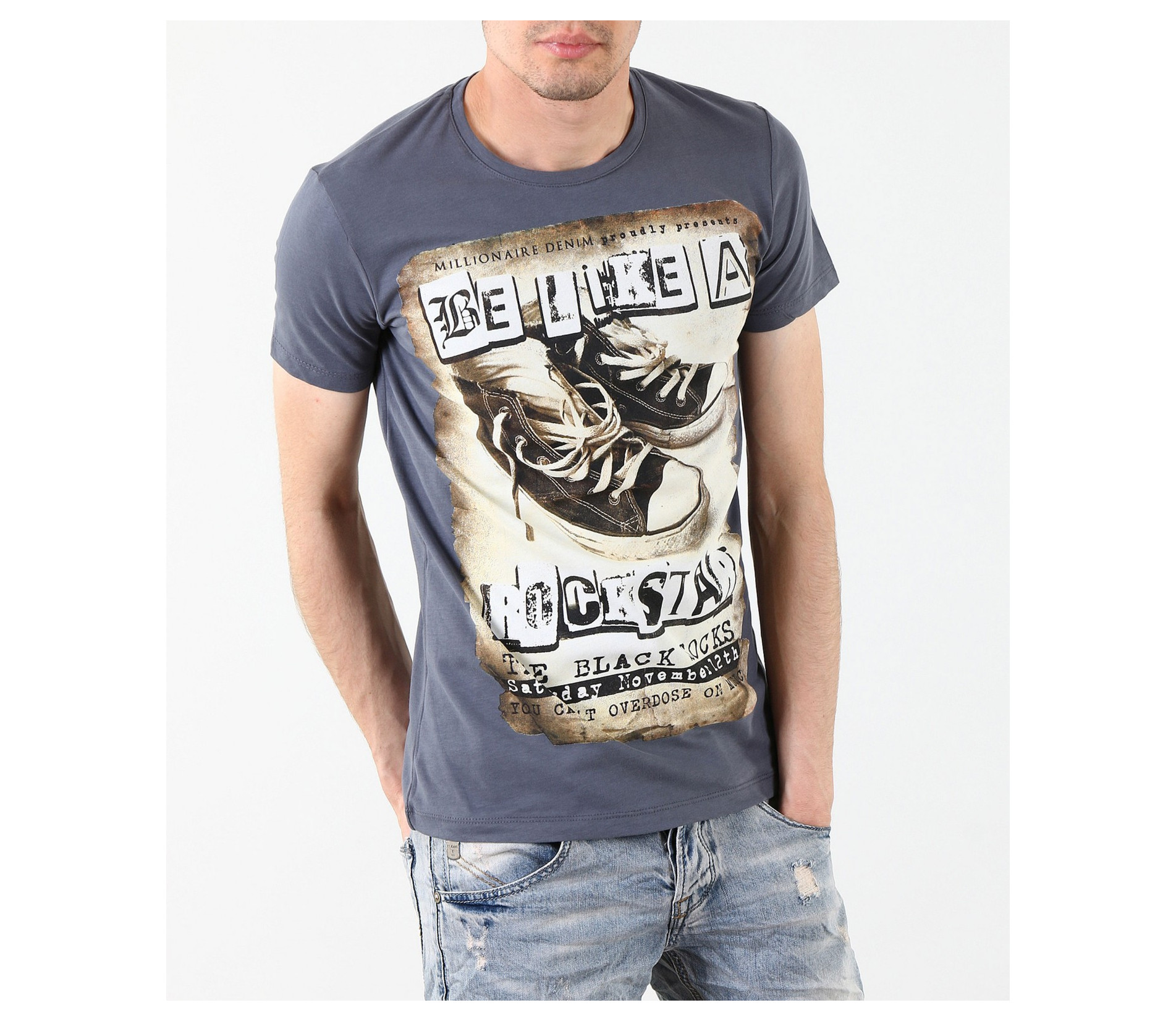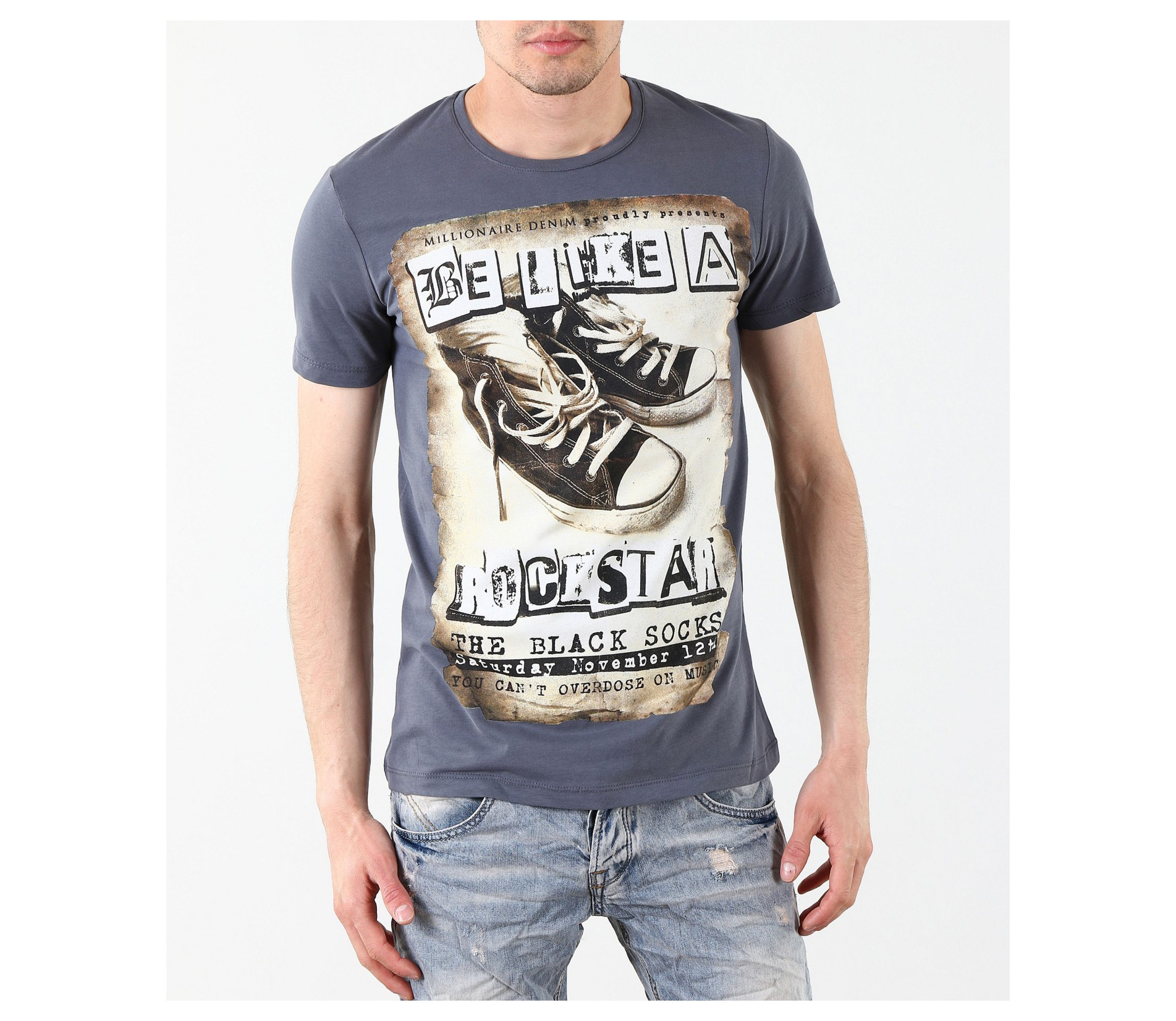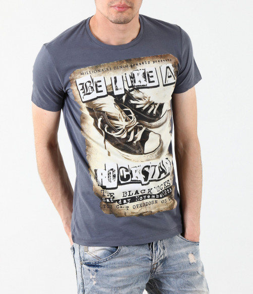 Описание на продукта: Мъжка тъмно сива тениска с cool апликация. Върху цялата лицева страна е разположена голяма щампа в бледо кафяв нюанс, която е комбинирана с надписи и илюстрация. Атрактивния ефект на фланелката е постигнат от надписа - be like a rock star, който интересно е поместен в отделни кубчета, умело създавайки различно излъчване. Изобразените кецове в черно-бяла разцветка внасят допълнителна атрактивност и непретенциозна непринуденост. Кройката на блузата с къс ръкав е леко еластична и вталена, а деколтето е овално. Ненатрапчивите цветове позволяват бърза комбинация с къси или дълги дънки, модерно яке и чифт удобни кецове. Заложи на семлото този сезон,като с това гарантираш своя безупречен стайлинг.