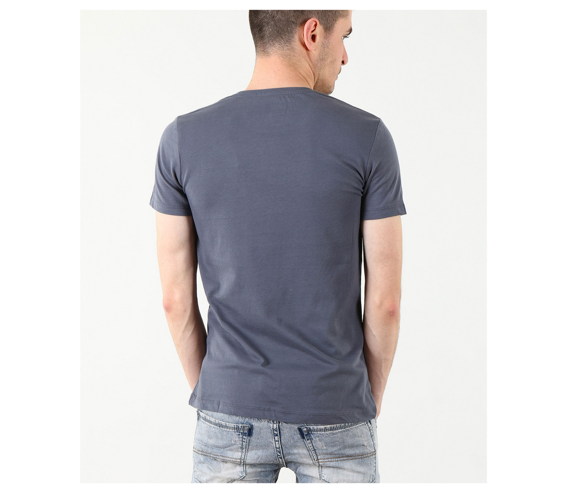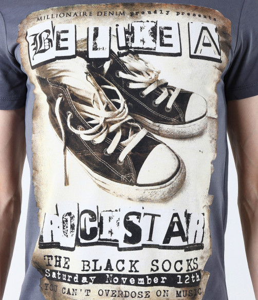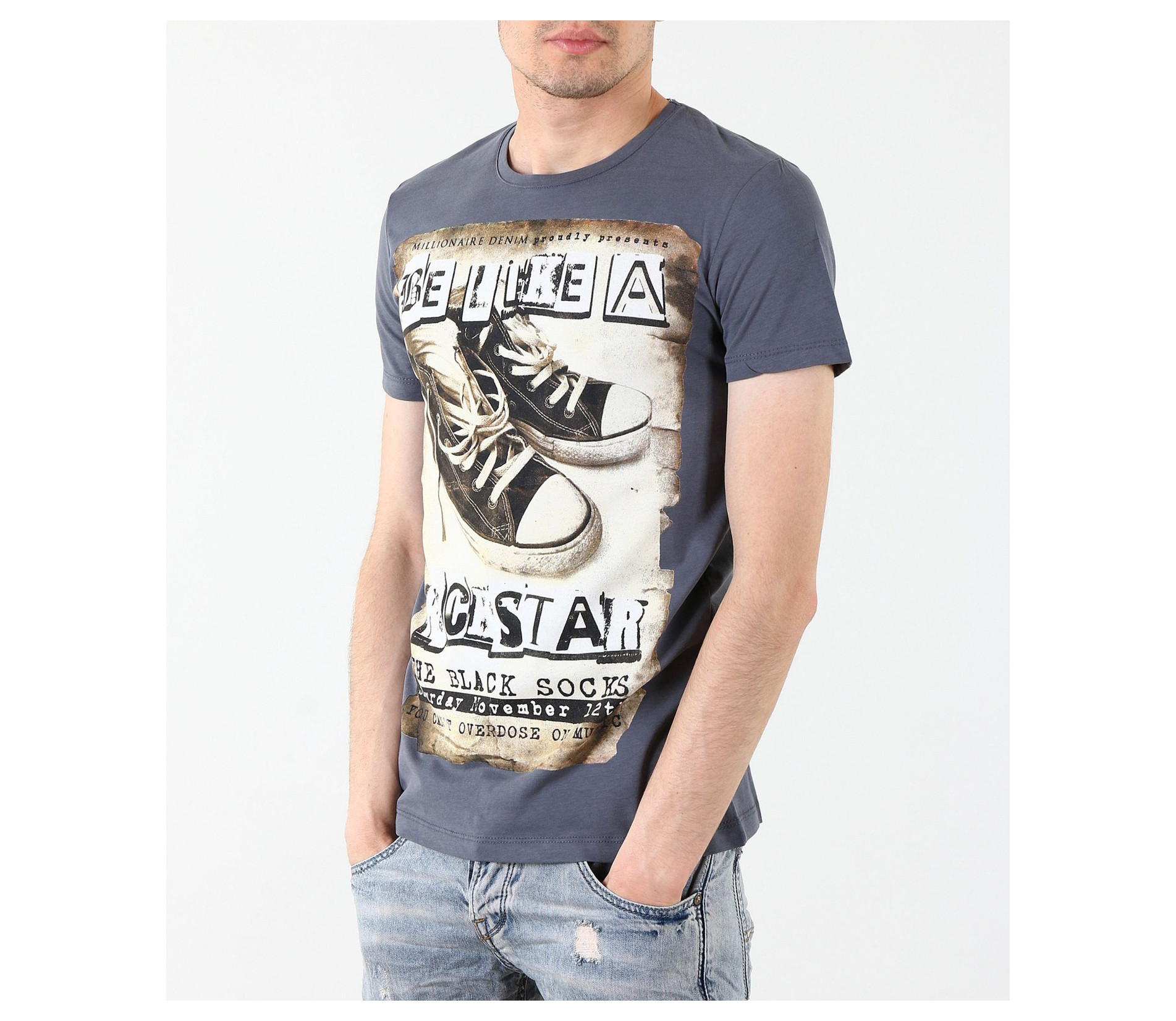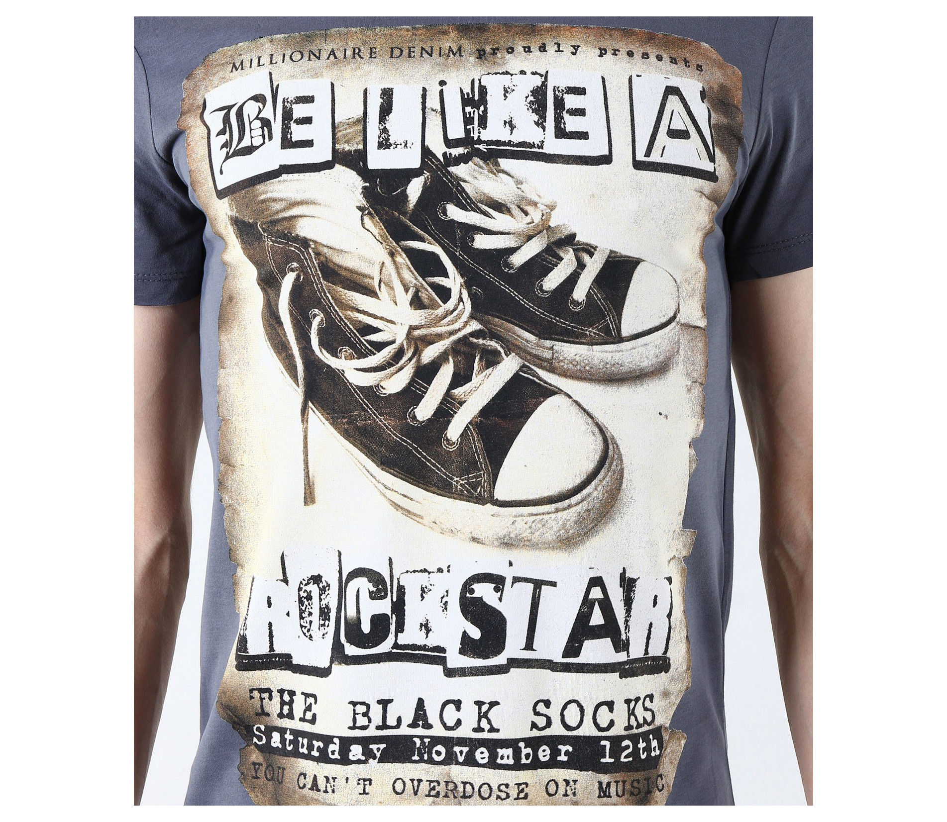 Описание на продукта: Мъжка тъмно сива тениска с cool апликация. Върху цялата лицева страна е разположена голяма щампа в бледо кафяв нюанс, която е комбинирана с надписи и илюстрация. Атрактивния ефект на фланелката е постигнат от надписа - be like a rock star, който интересно е поместен в отделни кубчета, умело създавайки различно излъчване. Изобразените кецове в черно-бяла разцветка внасят допълнителна атрактивност и непретенциозна непринуденост. Кройката на блузата с къс ръкав е леко еластична и вталена, а деколтето е овално. Ненатрапчивите цветове позволяват бърза комбинация с къси или дълги дънки, модерно яке и чифт удобни кецове. Заложи на семлото този сезон,като с това гарантираш своя безупречен стайлинг.