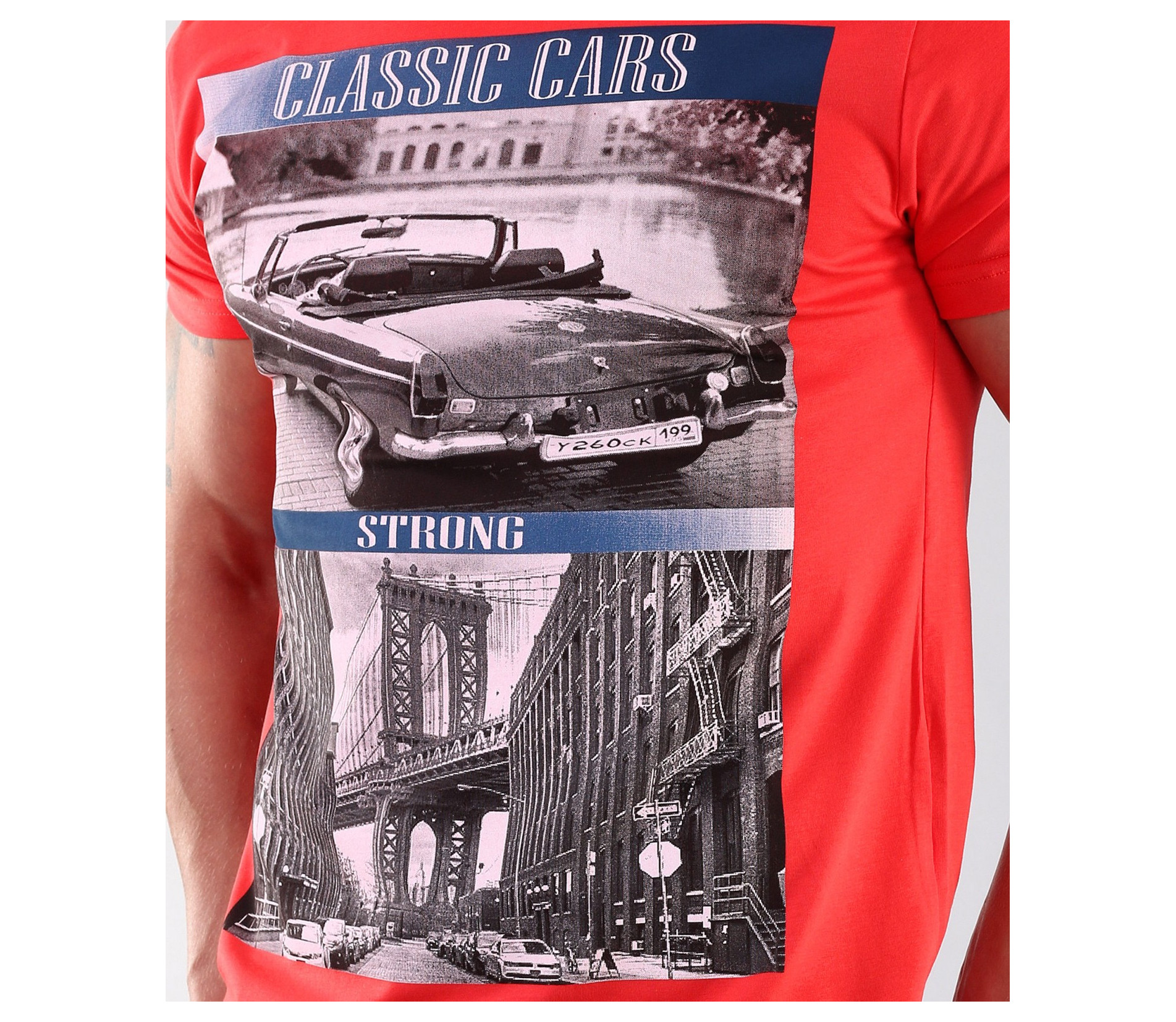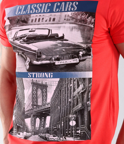 Описание на продукта: Още едио изкушаващо предложение. Свежа лятна тениска с голяма апликация. За засилване на акцента, в областта на гърдите, две картини се сливат в една щампа. Гърба е изчистен, а деколтето овално и прибрано. Тениската е вталена падаща по тялото. Изработена е от 95%памук и 5%еластант за удобство. Подходяща за съчетание със свежи къси дънки и панталони, кецове или мокасини, с което Ви позволява да постигнете перфектен вид в предпочитания от Вас стил.
