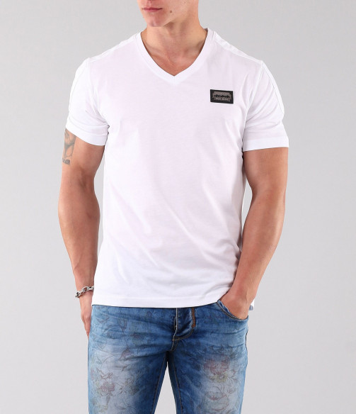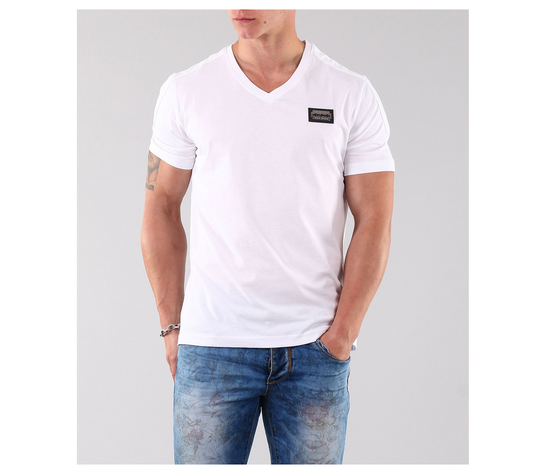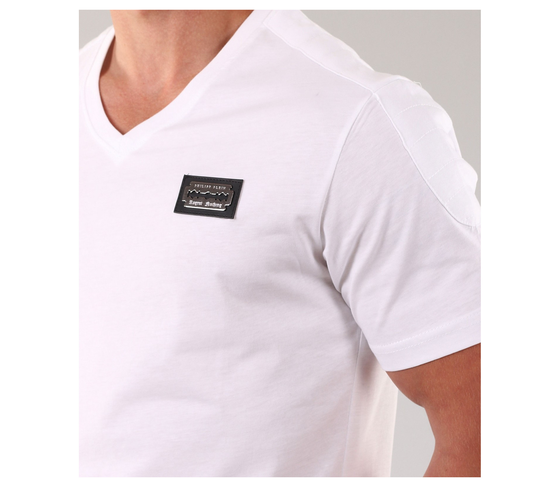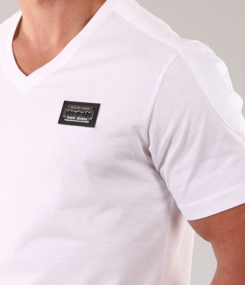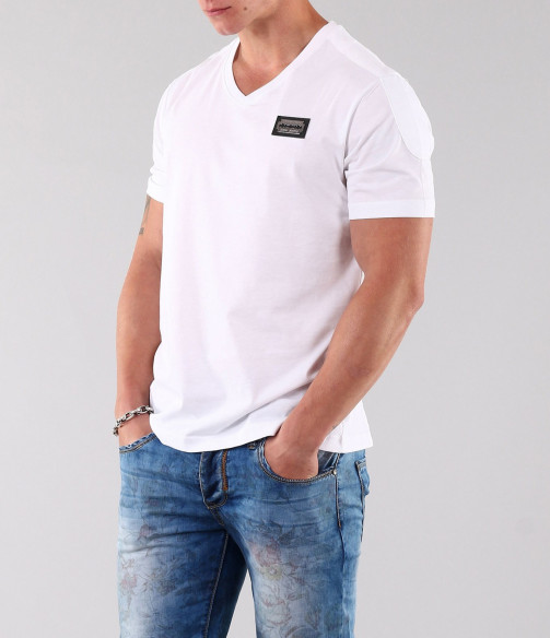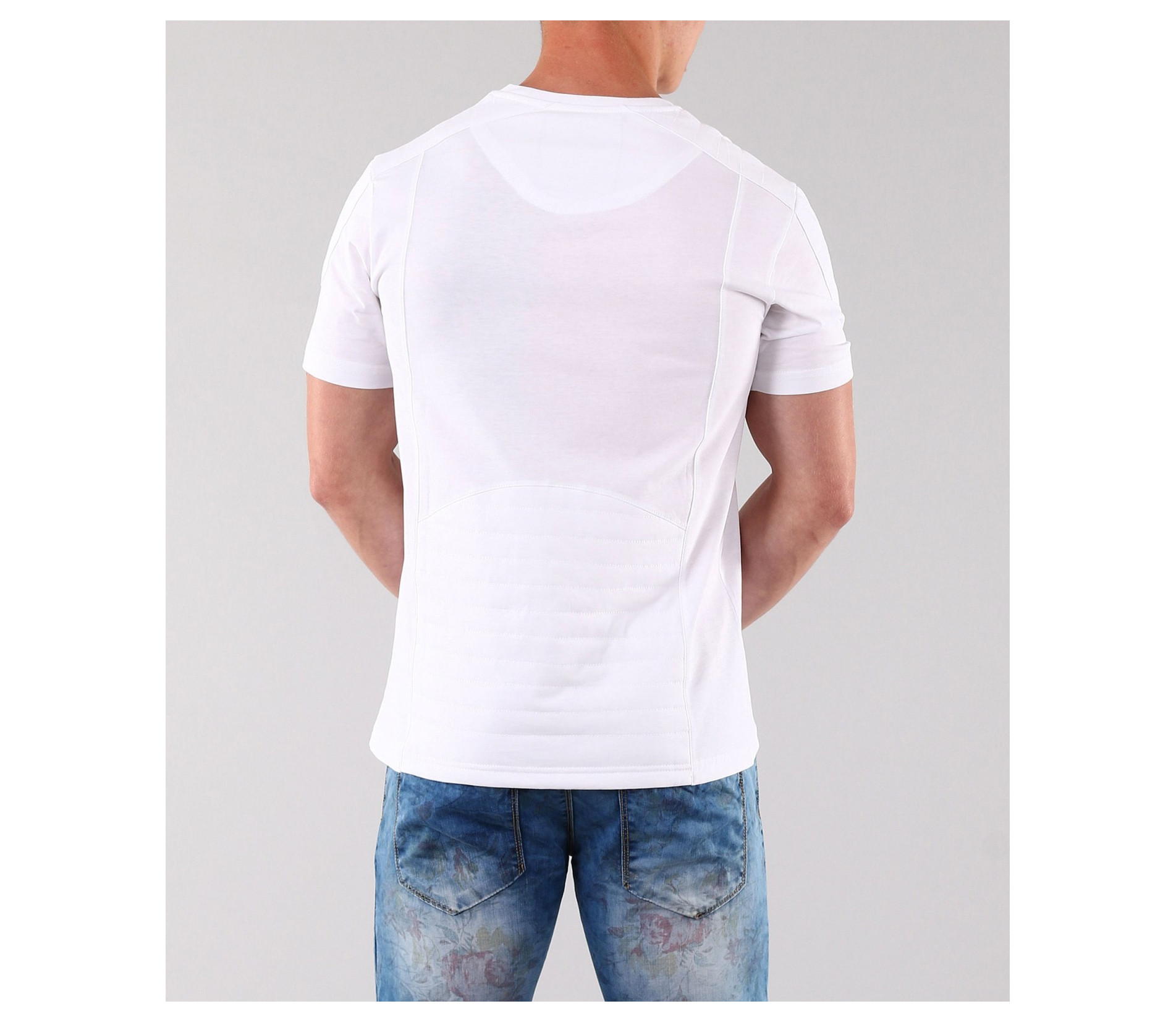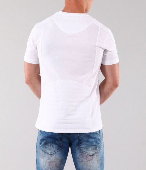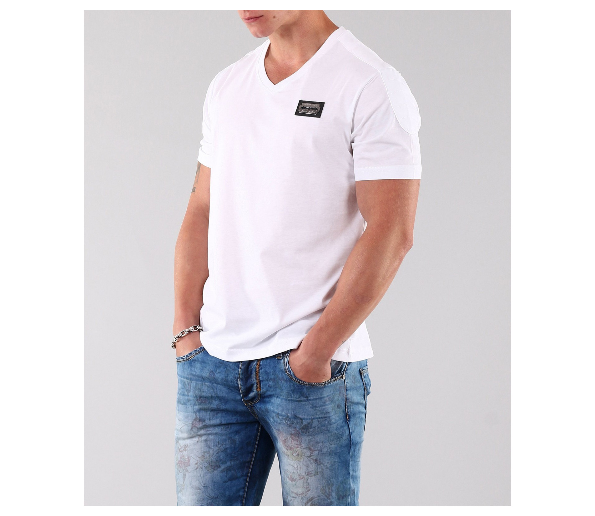 Мъжка изчистен модел бяла тениска. Акцент е поставен върху раменете, имитация на пагони в същия тон-бели.Лек акцент има и в областа на гърдите -модерната плочка тип праснарско ножче.Изработена от високакачествен материал-100%памук.Подходяща за комбинация в различни стилове- спортни и елегантни дънки , къси панталони,панталони, кецове, обувки и различни аксесоари.