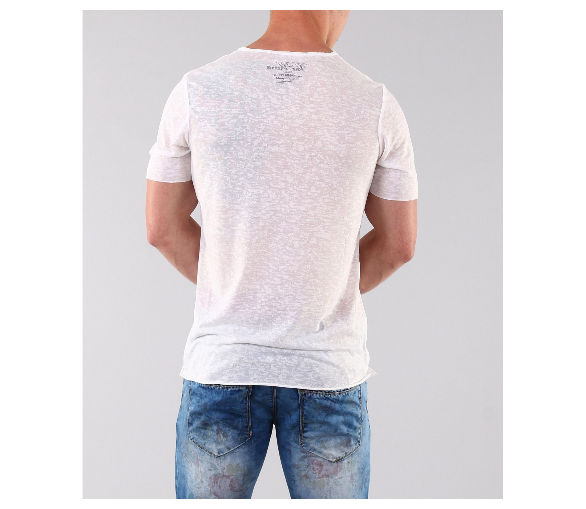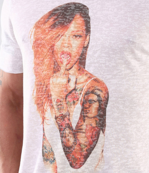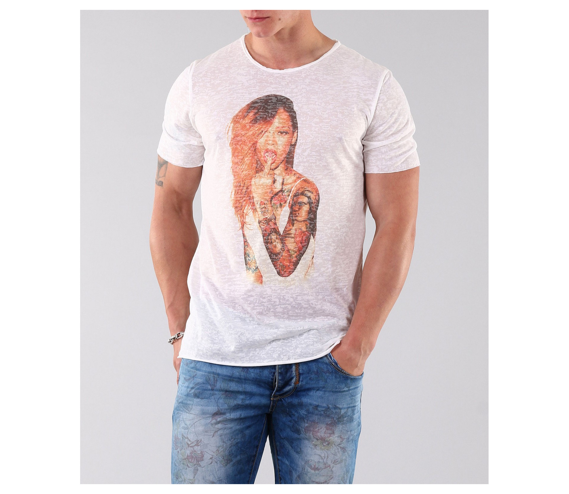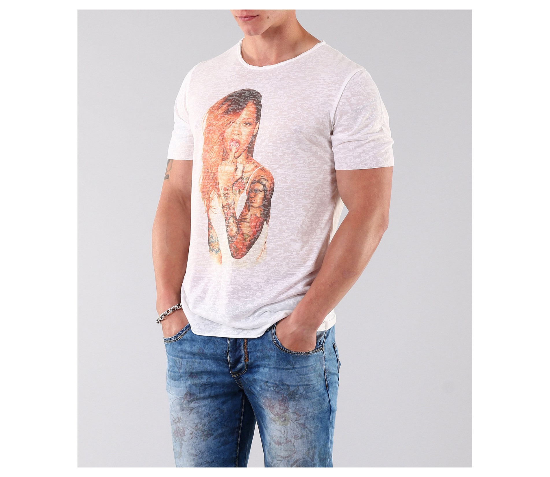 Мъжка тънка тениска с атрактивна щампа.Материята е тънка и прохладна , осигуряваща удобство в горещите летни дни.Щампата атрактивна и провокативна поставя силен акцент върху модела. Деколтето е овално и прибрано, а тениската свободно пада по тялото.Изработена е от 65%вискоза,35%полиамид.Съчетана с къси дънки, панталонки или кецове, завършва желаната модерна визия.