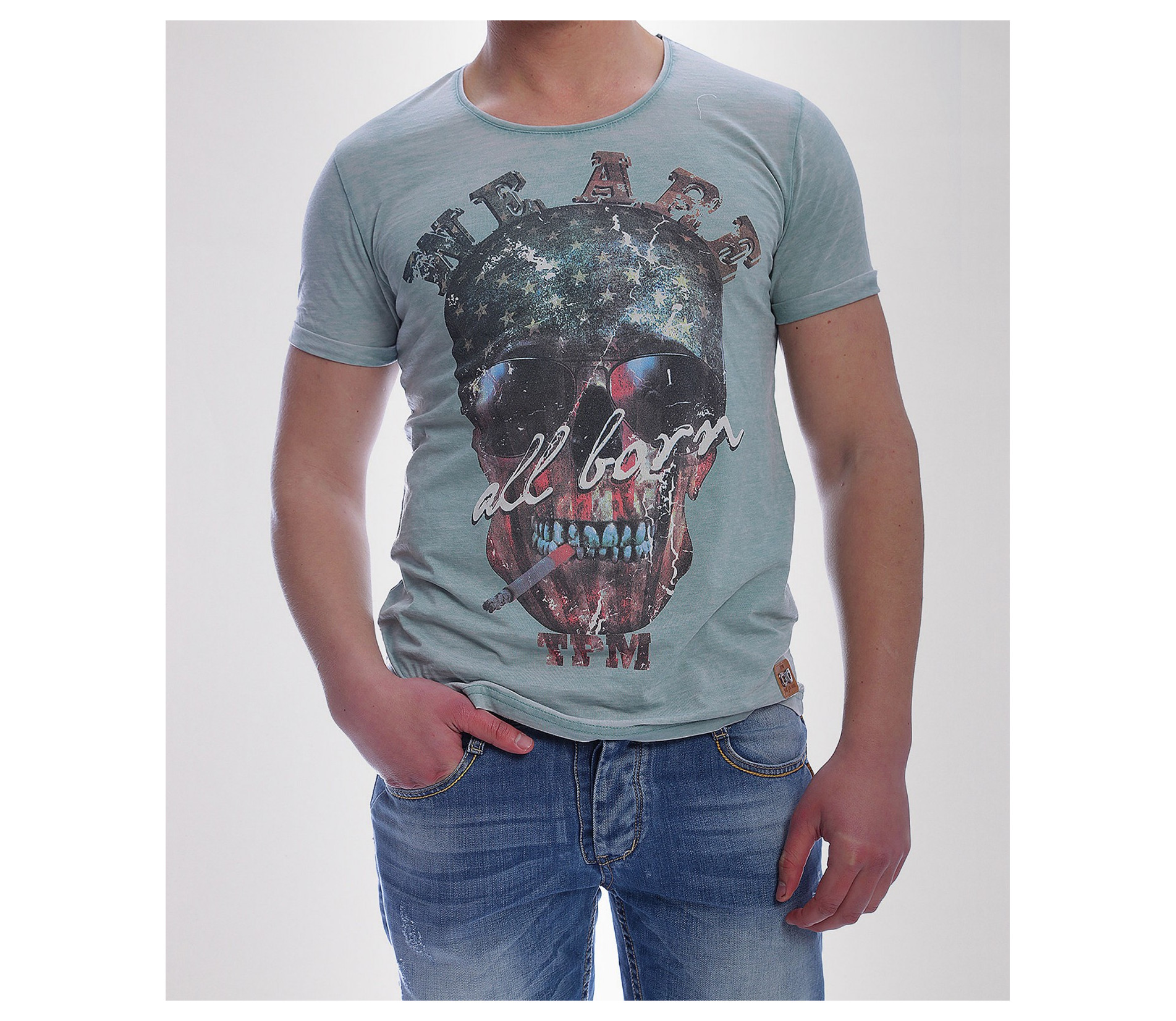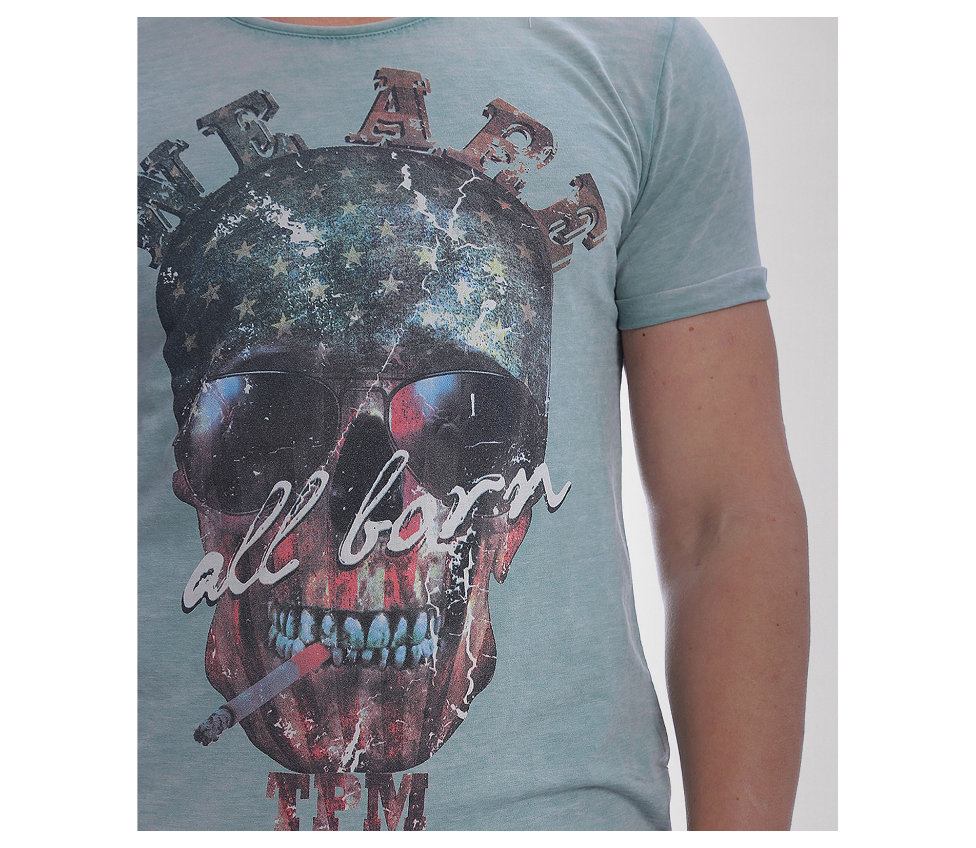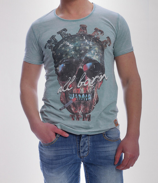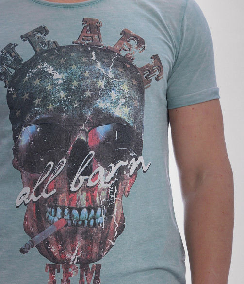 Описание на продукта: Стилна мъжка тениска с модерен принт. Моделът е с лек протрит ефект в крак с тенденциите, и стилна апликация като акцент. Гърба е изчистен, а вниманието е привлечено изцяло в лицето на апликацията-провокативен череп, пушещ цигара и надпис.В долния край на тениската има пришита емблема на марката. Деколтето е овално, моделът втален и прибран. Изработена е от 100%висококачествен памук. Съчетайте с къси дънки и панталонки, свежи кецове и аксесоар по вкус за съвършенна визия.