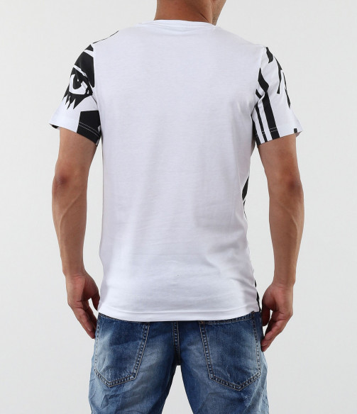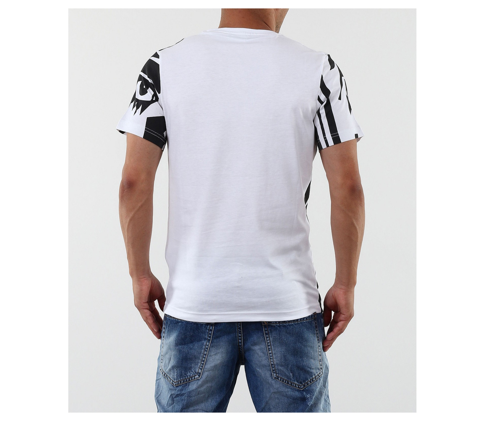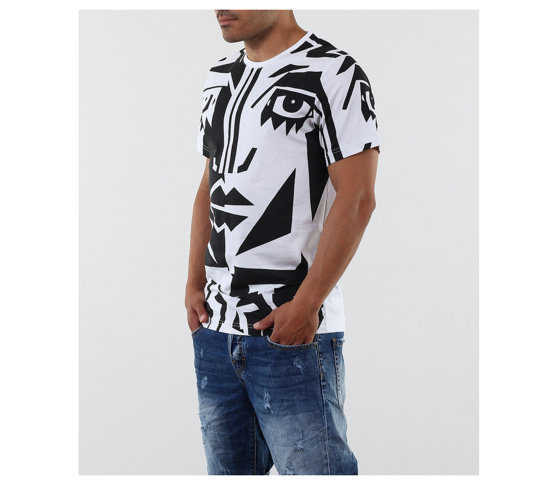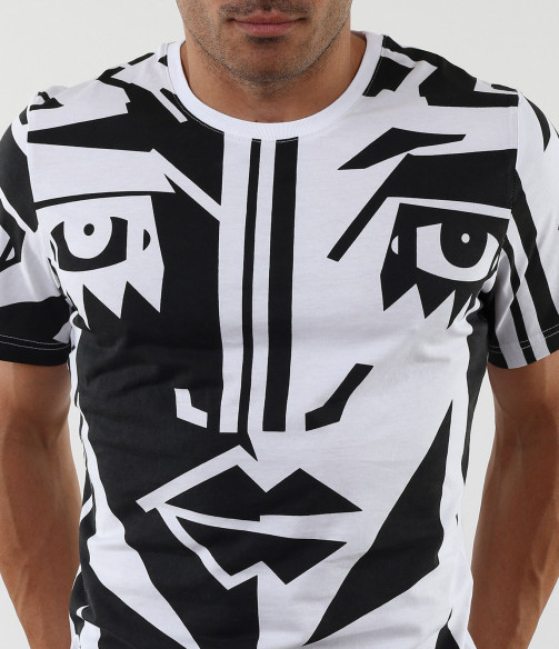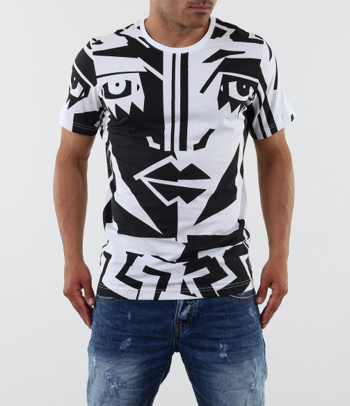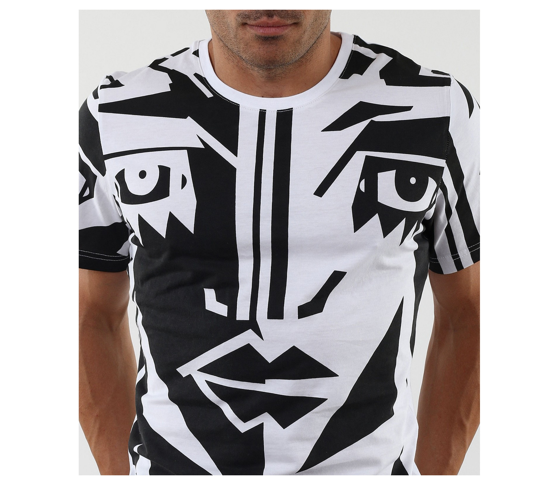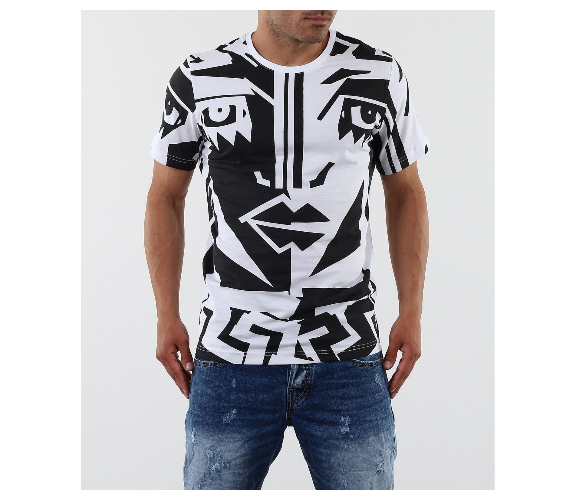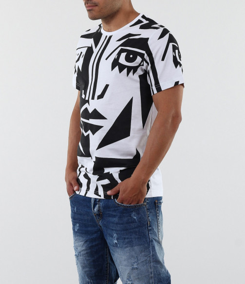 Описание на продукта: Много стилна и модерна мъжка тениска в бяло и черно. Изработена е от 100% висококачествен памук, създавайки изключителен комфорт при носене. Елегантността на тази тениска е подчертана от разположените в предната и част фигури, загатвайки женски образ. Задната част е в напълно изчистен бял цвят. Всичко това прави моделът изключително изискан. Подходящ е за всякакъв повод, тъй като лесно се съчетава с дънки и панталони.