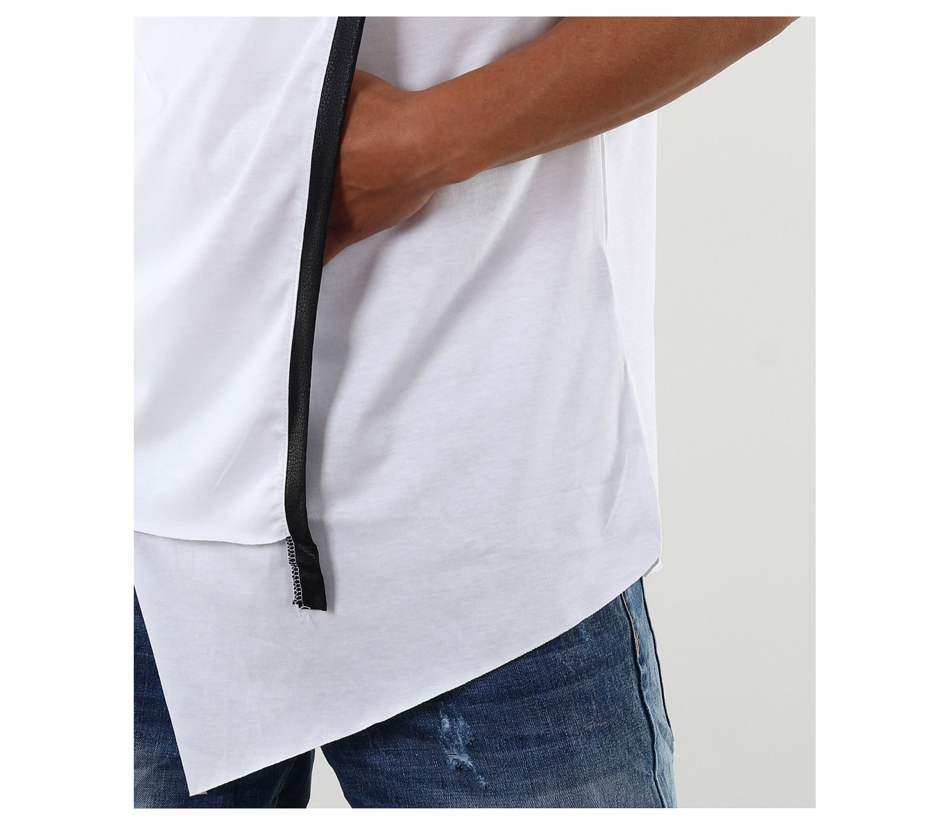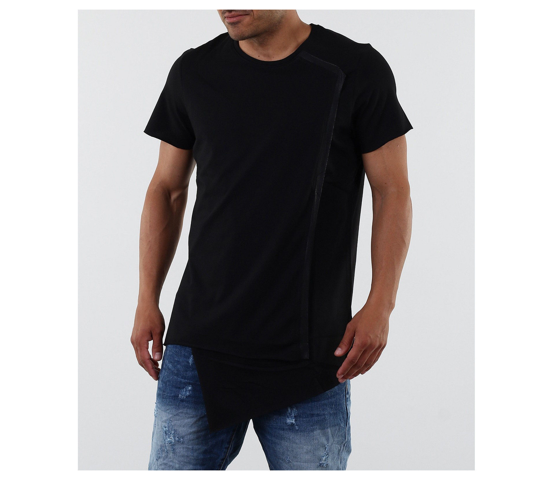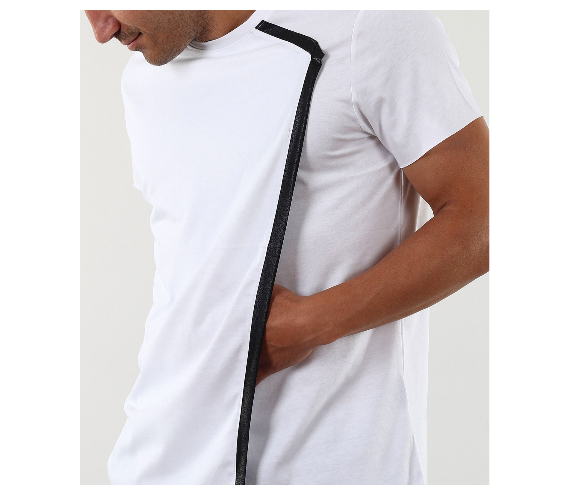 Описание на продукта: Стилна нестандартна мъжка тениска. В предната си част е създаден ефект \"прегърни ме\" .Горния плат е подчертан с кожена лента, като акцент.Вталена по тялото, но същевременно е осигурена свобода на движение чрез застъпването на платовете.В задната си част, в областа на тила има лека апликация- надпис, името на марката.Изработена от 100%висококачествен памук. Съчетайте я с изчистени дънки, спортен панталон и кецове, за успешен завършек на една стилна екстравагантна визия.