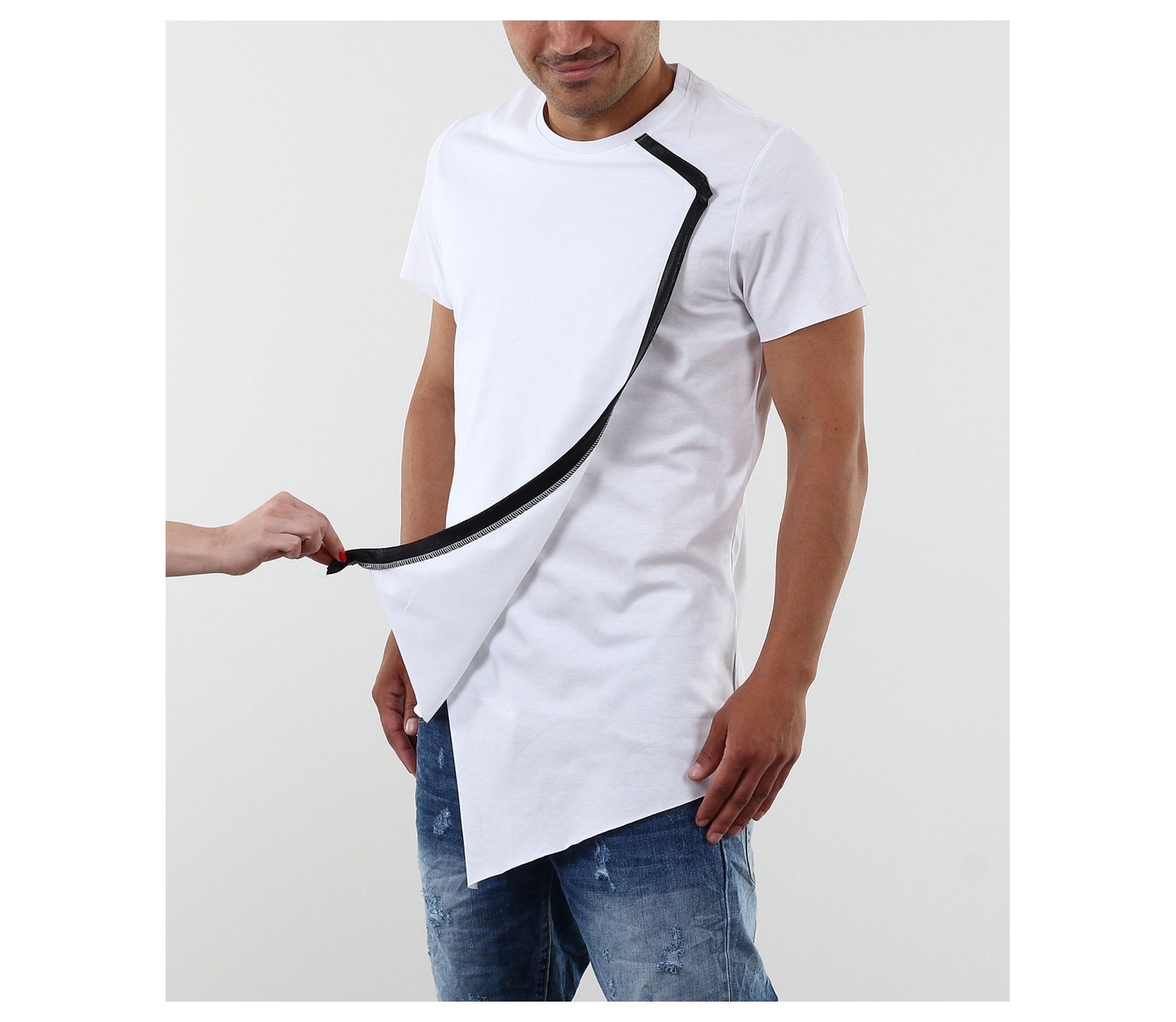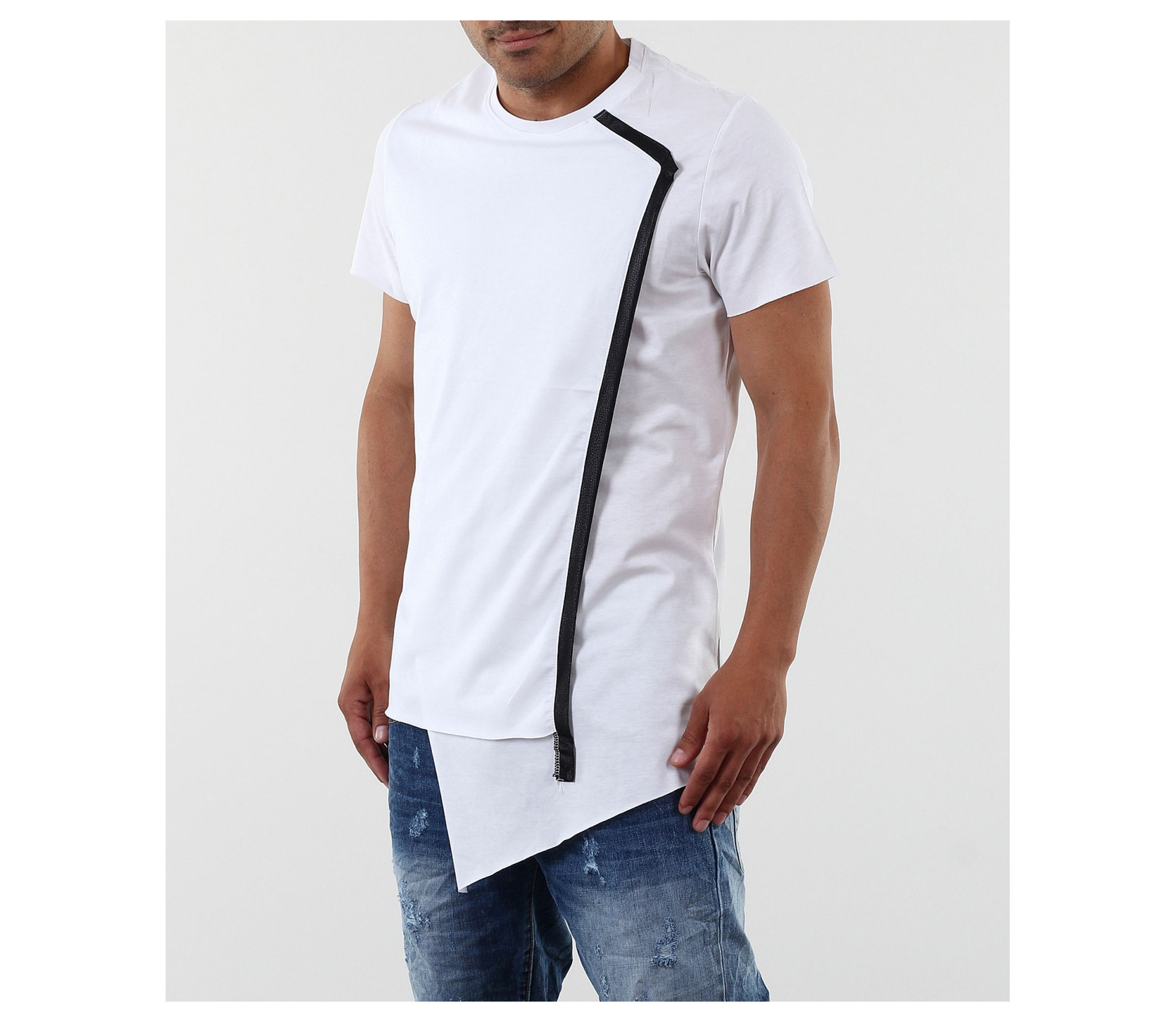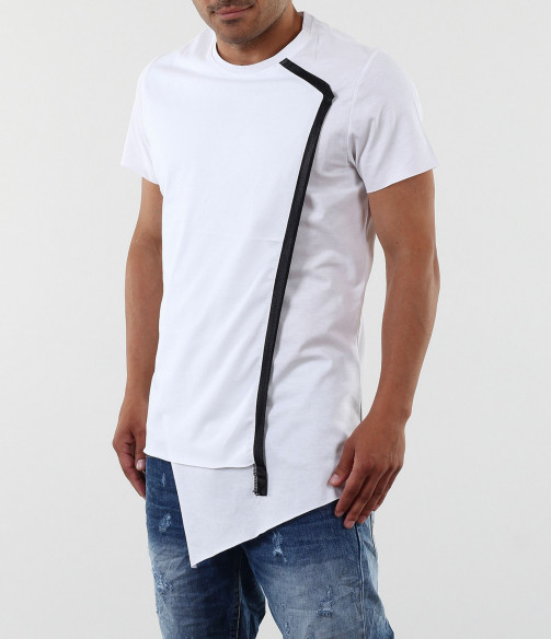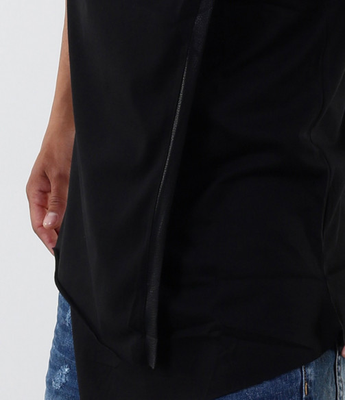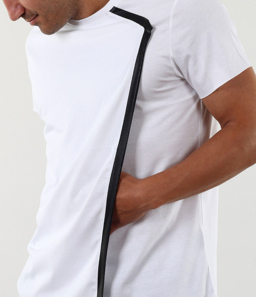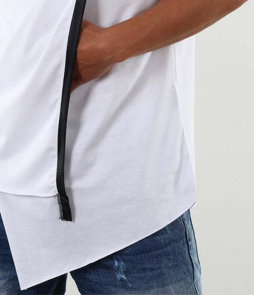 Описание на продукта: Стилна нестандартна мъжка тениска. В предната си част е създаден ефект \"прегърни ме\" .Горния плат е подчертан с кожена лента, като акцент.Вталена по тялото, но същевременно е осигурена свобода на движение чрез застъпването на платовете.В задната си част, в областа на тила има лека апликация- надпис, името на марката.Изработена от 100%висококачествен памук. Съчетайте я с изчистени дънки, спортен панталон и кецове, за успешен завършек на една стилна екстравагантна визия.