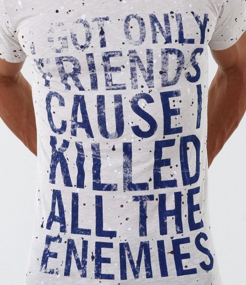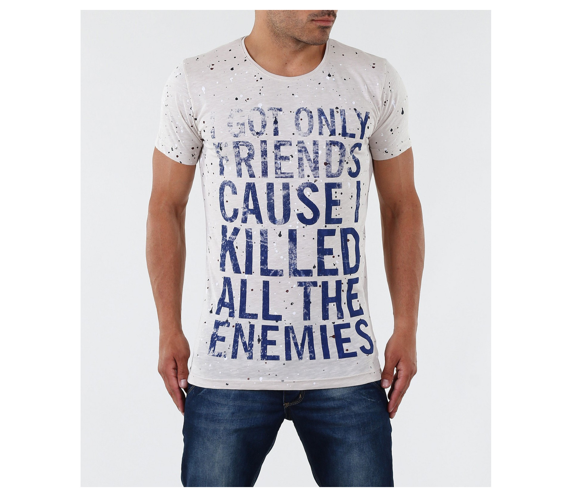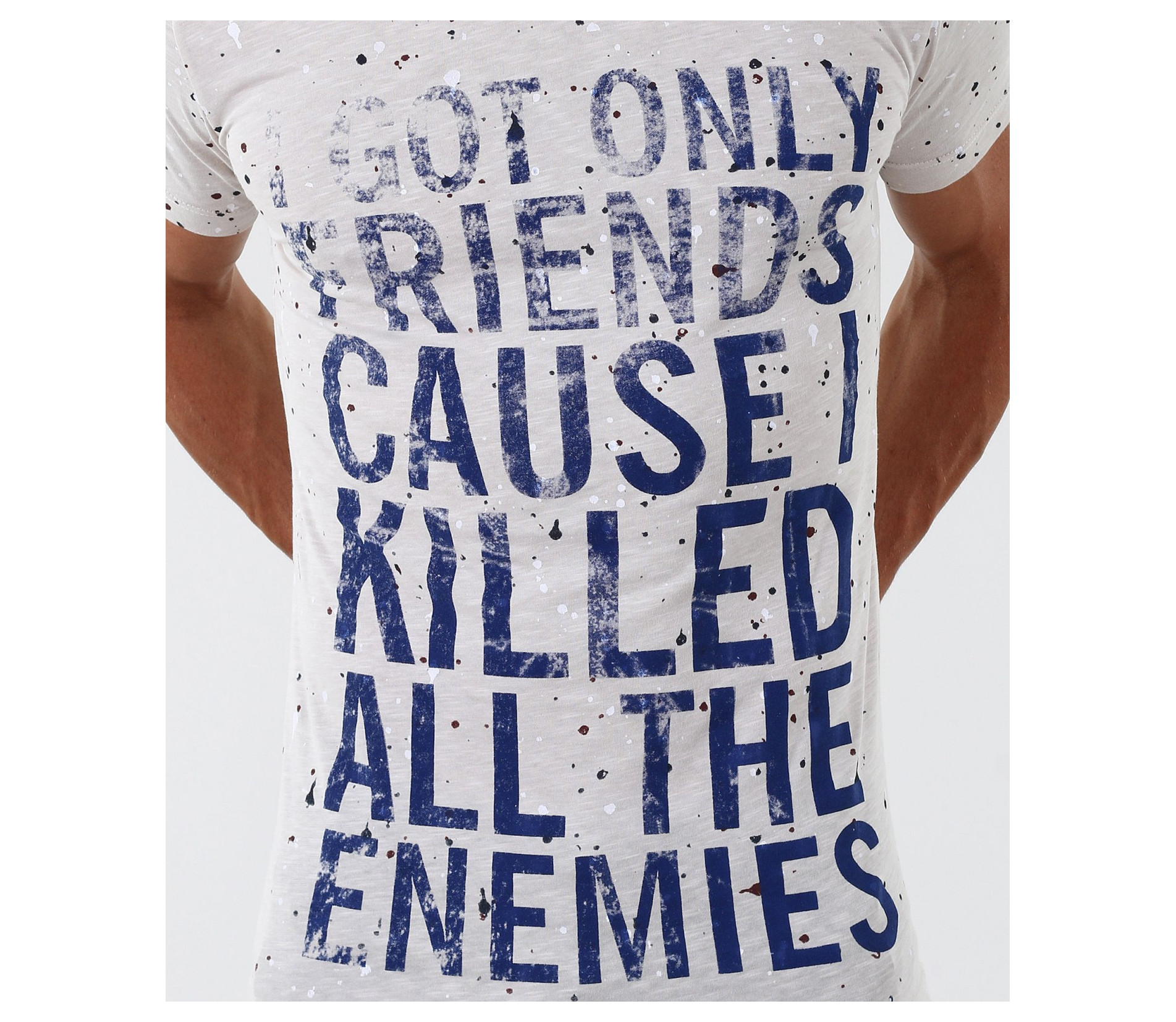 Описание на продукта: Мъжка cool тениска с надписи и пръски в син или бял цвят. Яката на модела е овална , придаваща комфорт при всекидневна употреба.Кройката е нормална с леко втален ефект създавайки елегантна визия . Надписа на тишърта е в син цвят провокирайки със своя девиз, допълнителните пръски имитиращи остатъци от боя е много фешън и актуален. Този артикул от лятната колекция на RED-POINT.bg се съчетава лесно и удобно с къси или дълги дънки, панталони, якета , обувки и аксесоари.