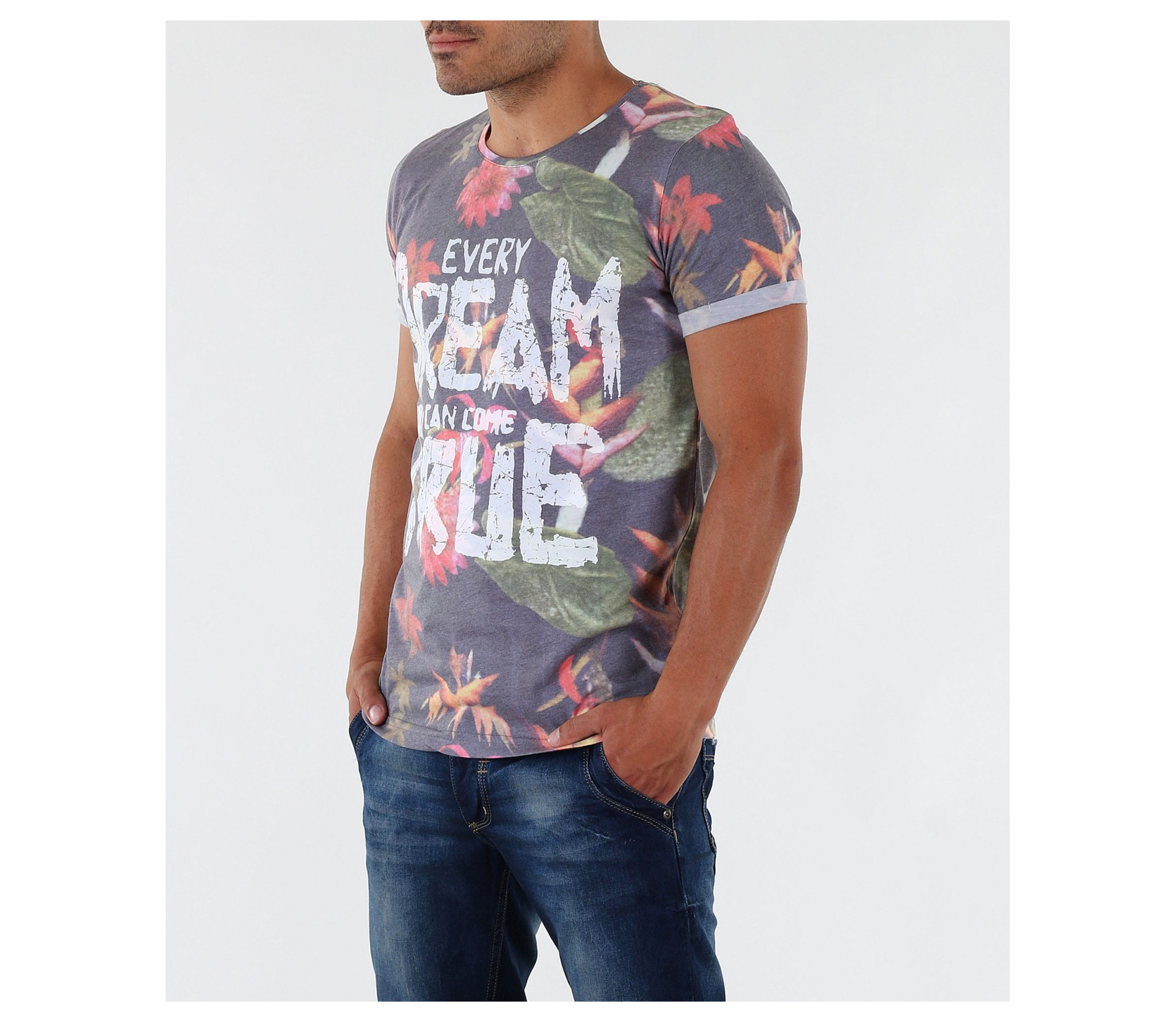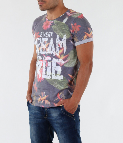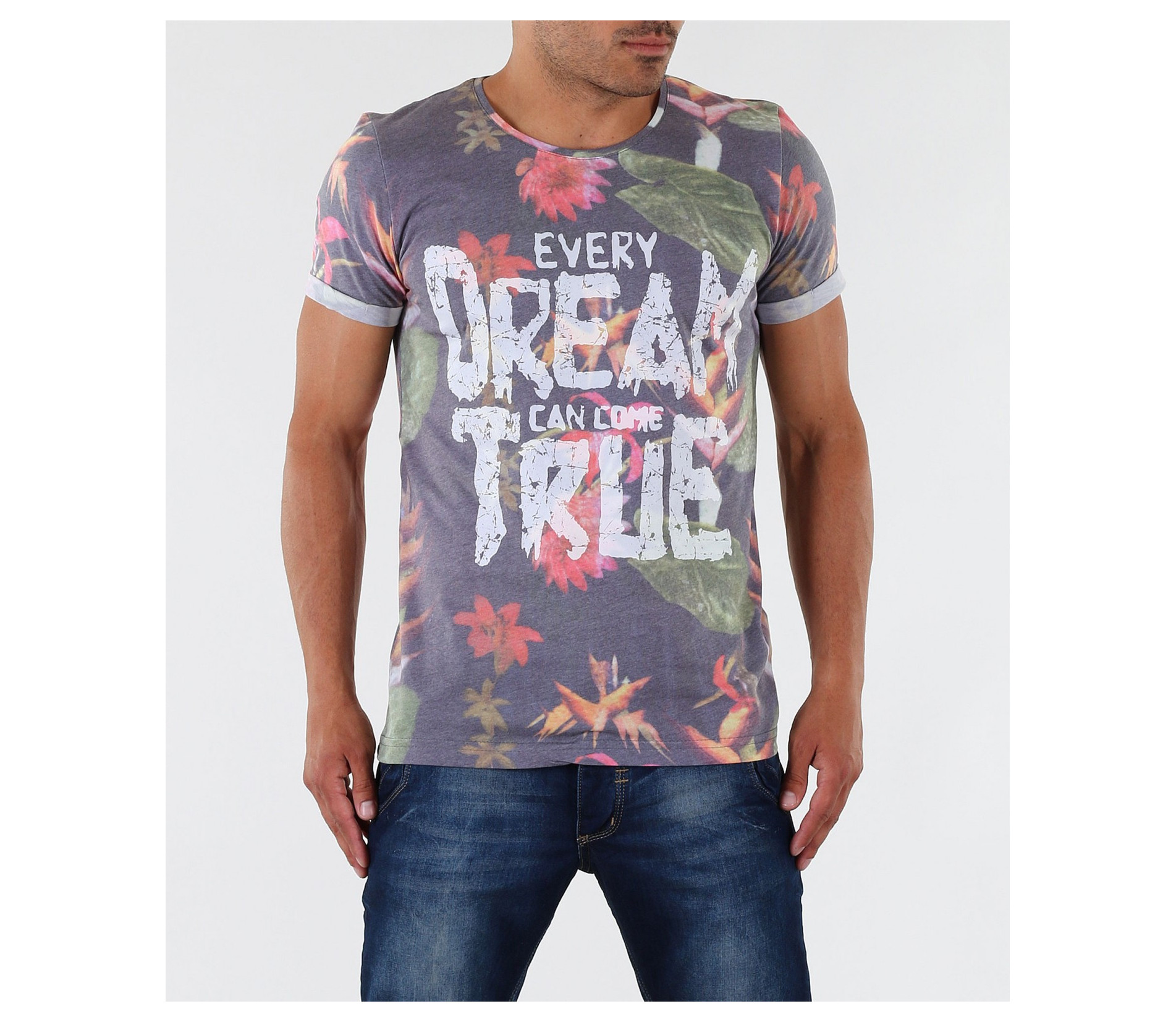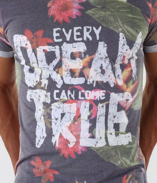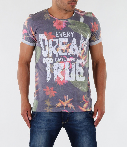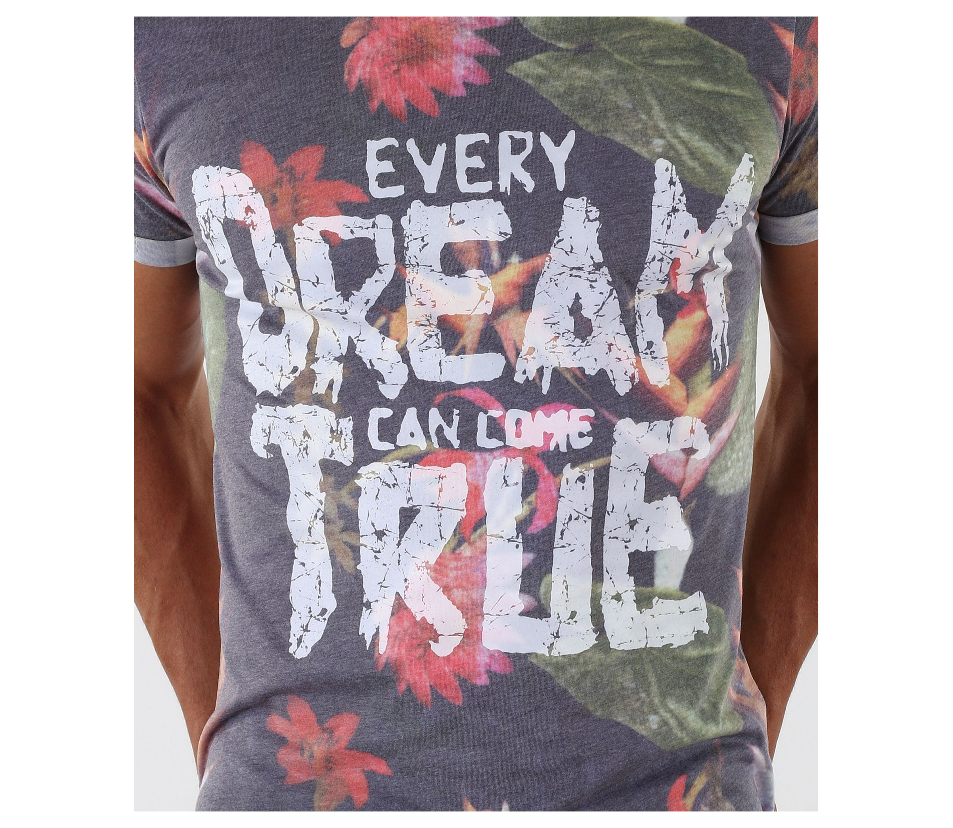 Описание на продукта: Свежа мъжка тениска с цветен принт. Основата на този модел тениска е с флорални мотиви. Предната част на тишърта е декориран с голям бял надпис EVERY DREAM CAN COME TRUE. Друг лек акцент е лек подгъв на двата ръкава. Гърбът на тениската е изчистен от надписи, като акцента пада върху лицето на модела. Изключително цветния десен позволява лесно съчетание с широка гама от цветове. В комбинация със стилни къси панталони, модерни кецове и стилен колан за аксесоар, Вие завършвате впечатляващата си Street визия.