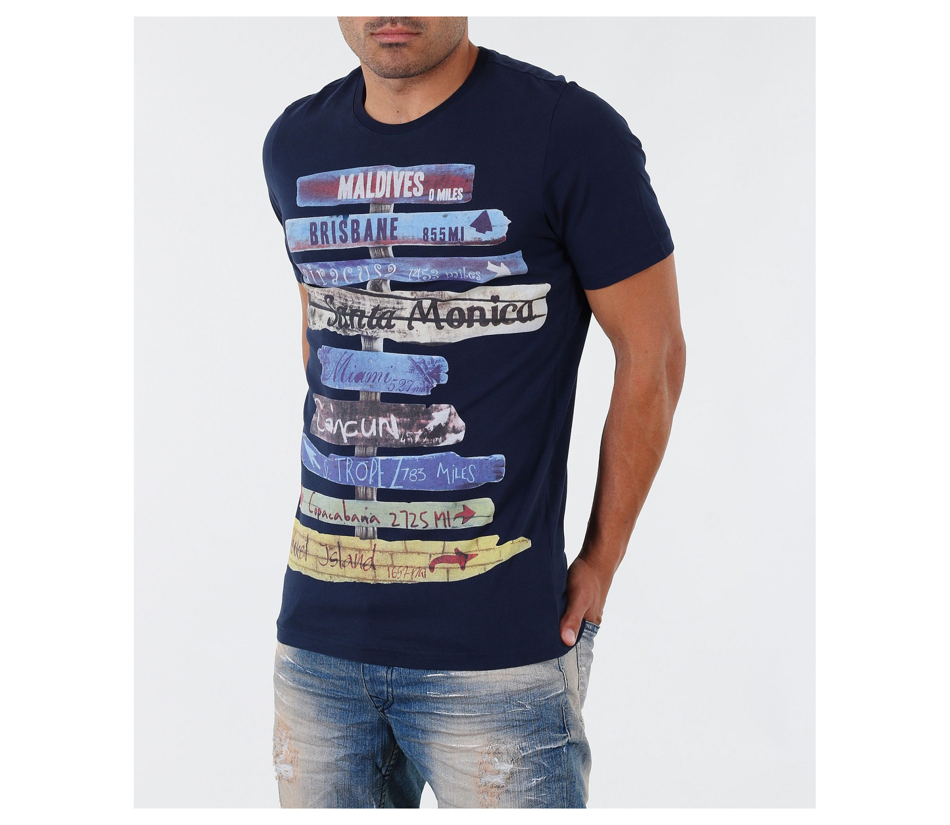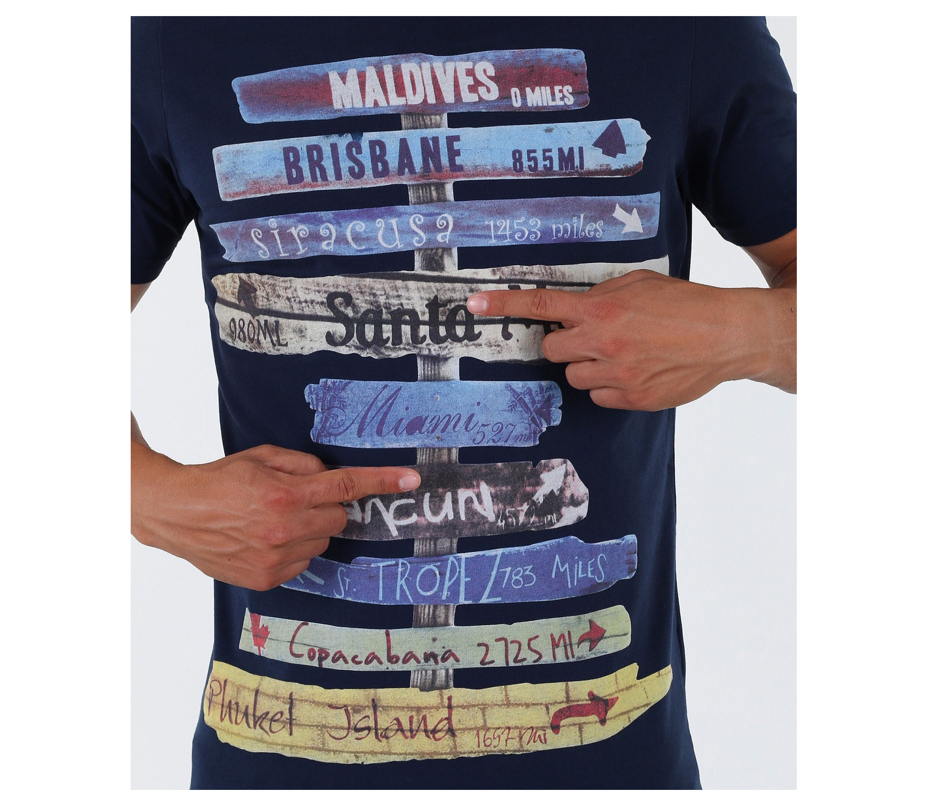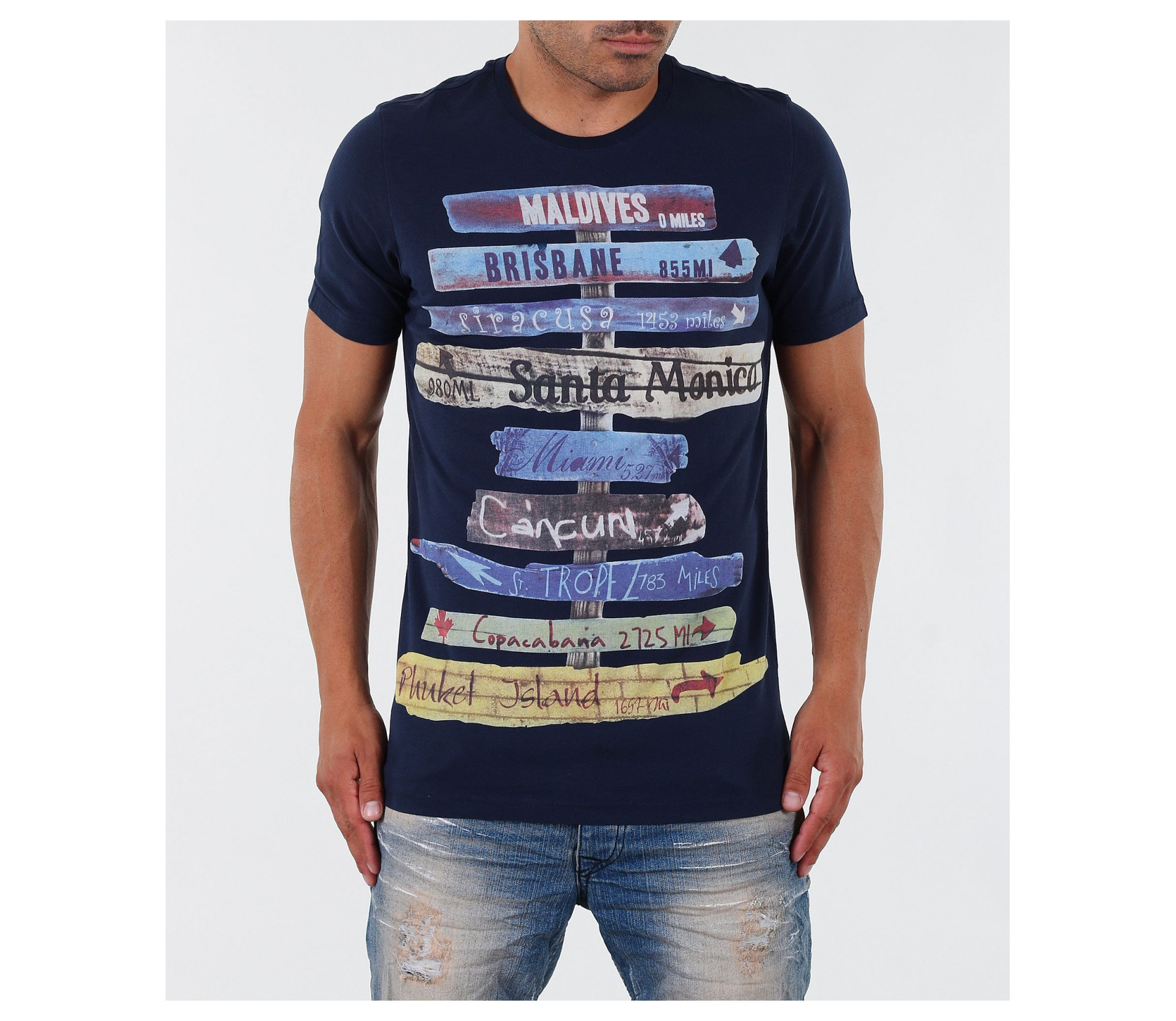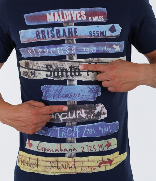 Описание на продукта: Това е едно перфектно предложение за летните дни. Мъжка стилна тениска с интересен принт. В предната част е поставена апликация изобразяваща табели посочващи най-екзотичните летни дестинации. Гърбът на тишърта е напълно изчистен, с което акцента пада върху лицето на модела. Тениската с къс ръкав е с нормална вталена кройка , стандартна дължина и прибрано овално деколте. Цветната щампа Ви позволява да съчетаете фланелката с широка гама от цветове. В комбинация с чифт стилни мъжки дънки, модерни кецове и стилен колан за аксесоар, получавате перфектната визия към която се стремите.