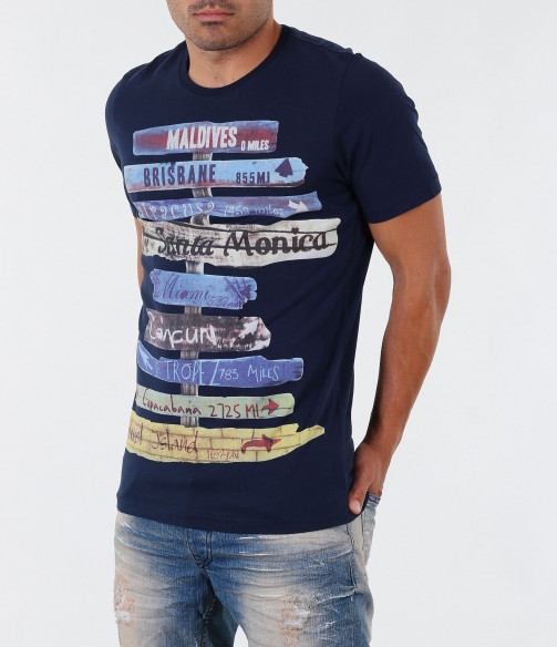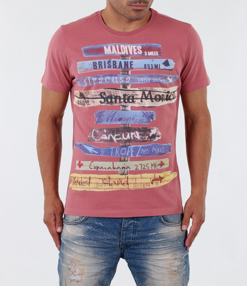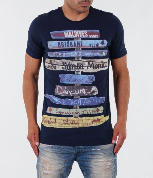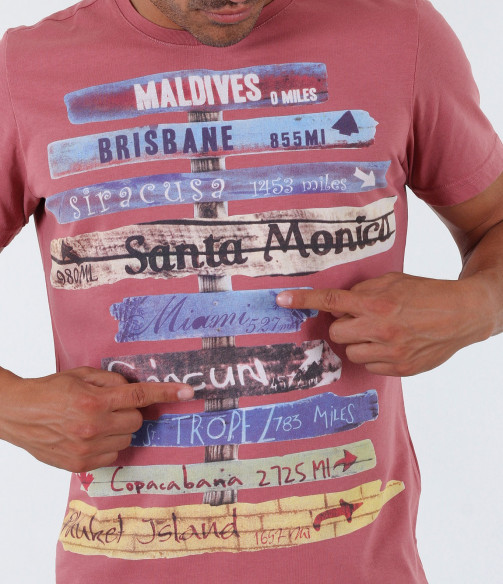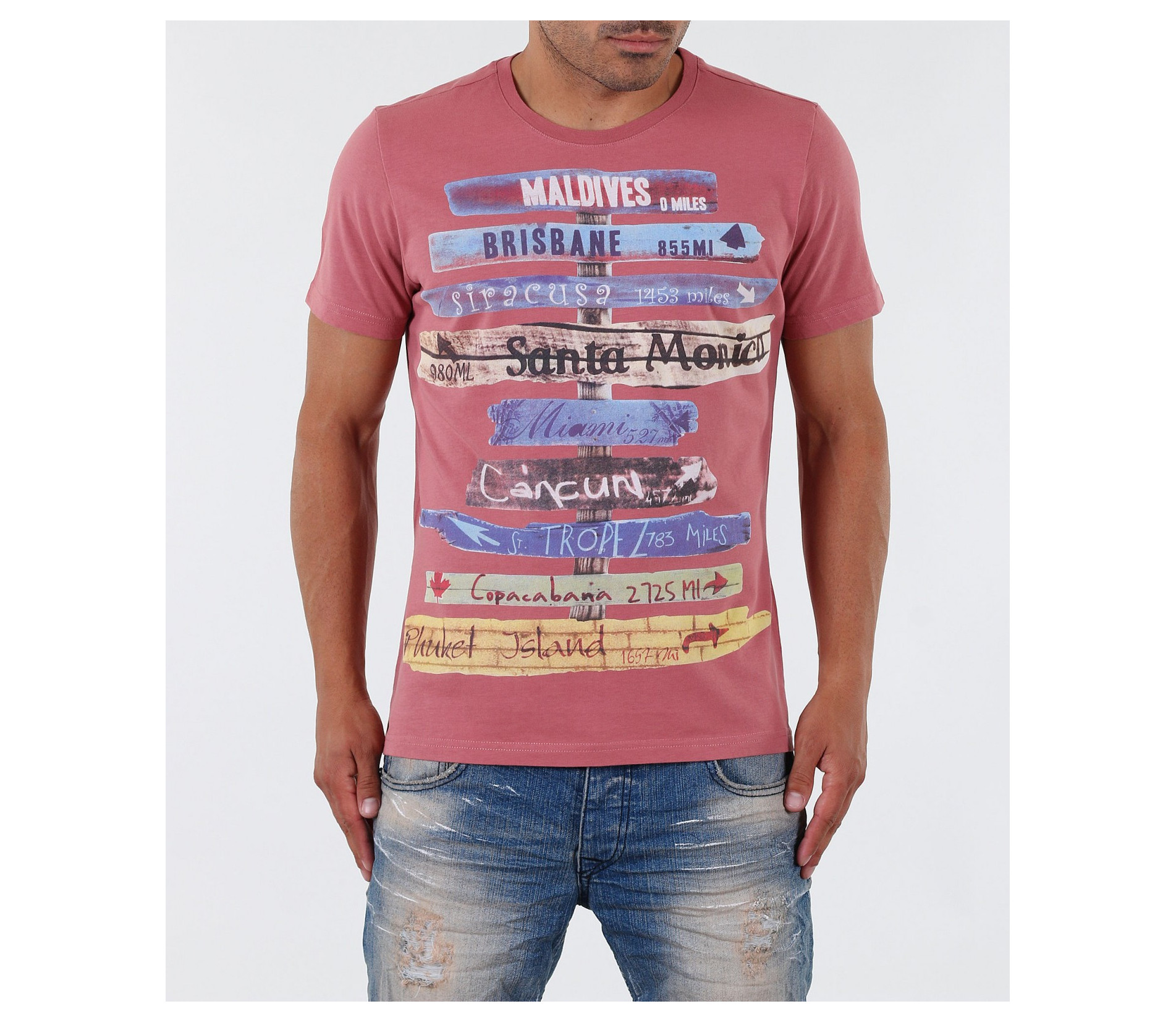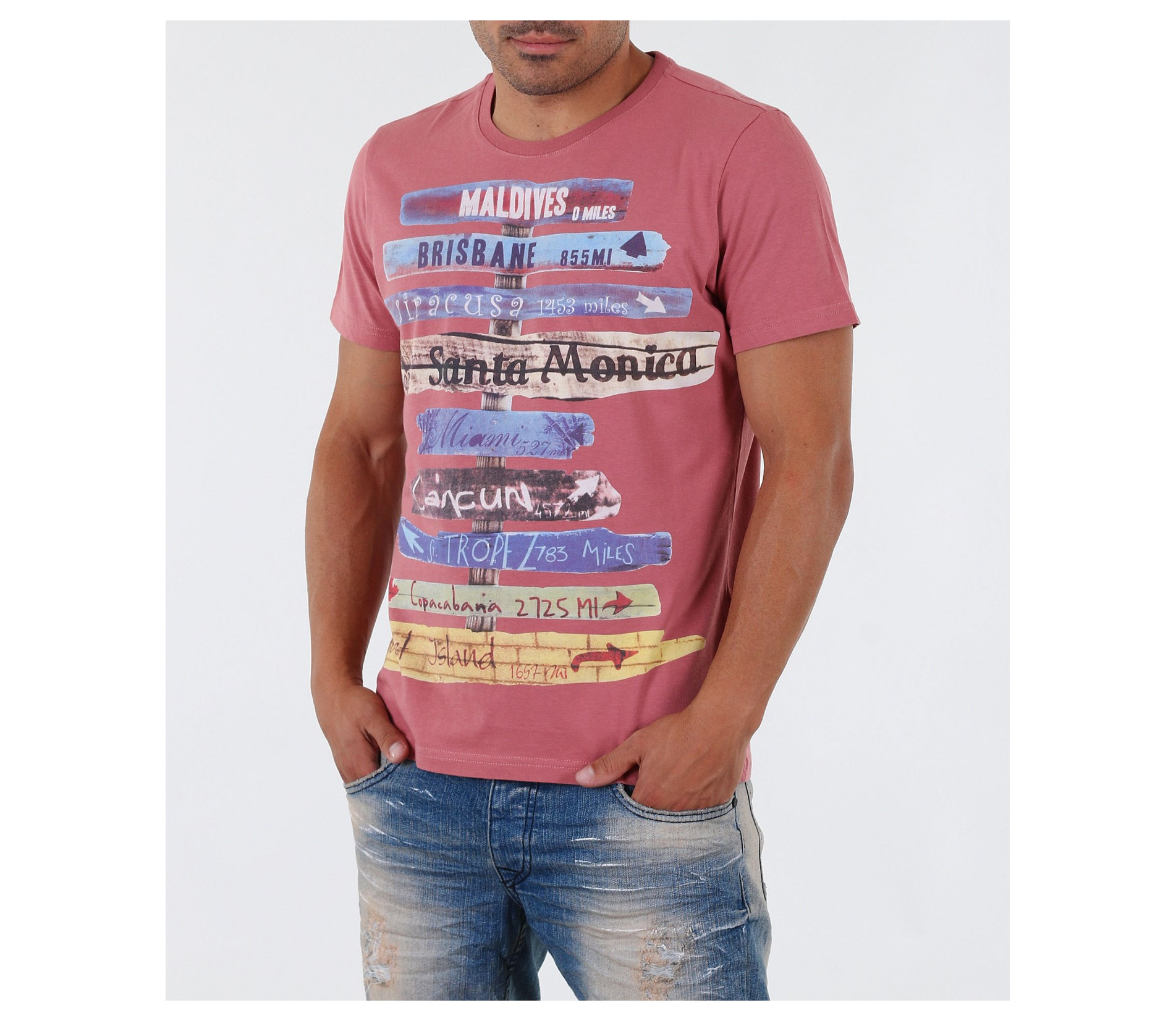 Описание на продукта: Това е едно перфектно предложение за летните дни. Мъжка стилна тениска с интересен принт. В предната част е поставена апликация изобразяваща табели посочващи най-екзотичните летни дестинации. Гърбът на тишърта е напълно изчистен, с което акцента пада върху лицето на модела. Тениската с къс ръкав е с нормална вталена кройка , стандартна дължина и прибрано овално деколте. Цветната щампа Ви позволява да съчетаете фланелката с широка гама от цветове. В комбинация с чифт стилни мъжки дънки, модерни кецове и стилен колан за аксесоар, получавате перфектната визия към която се стремите.