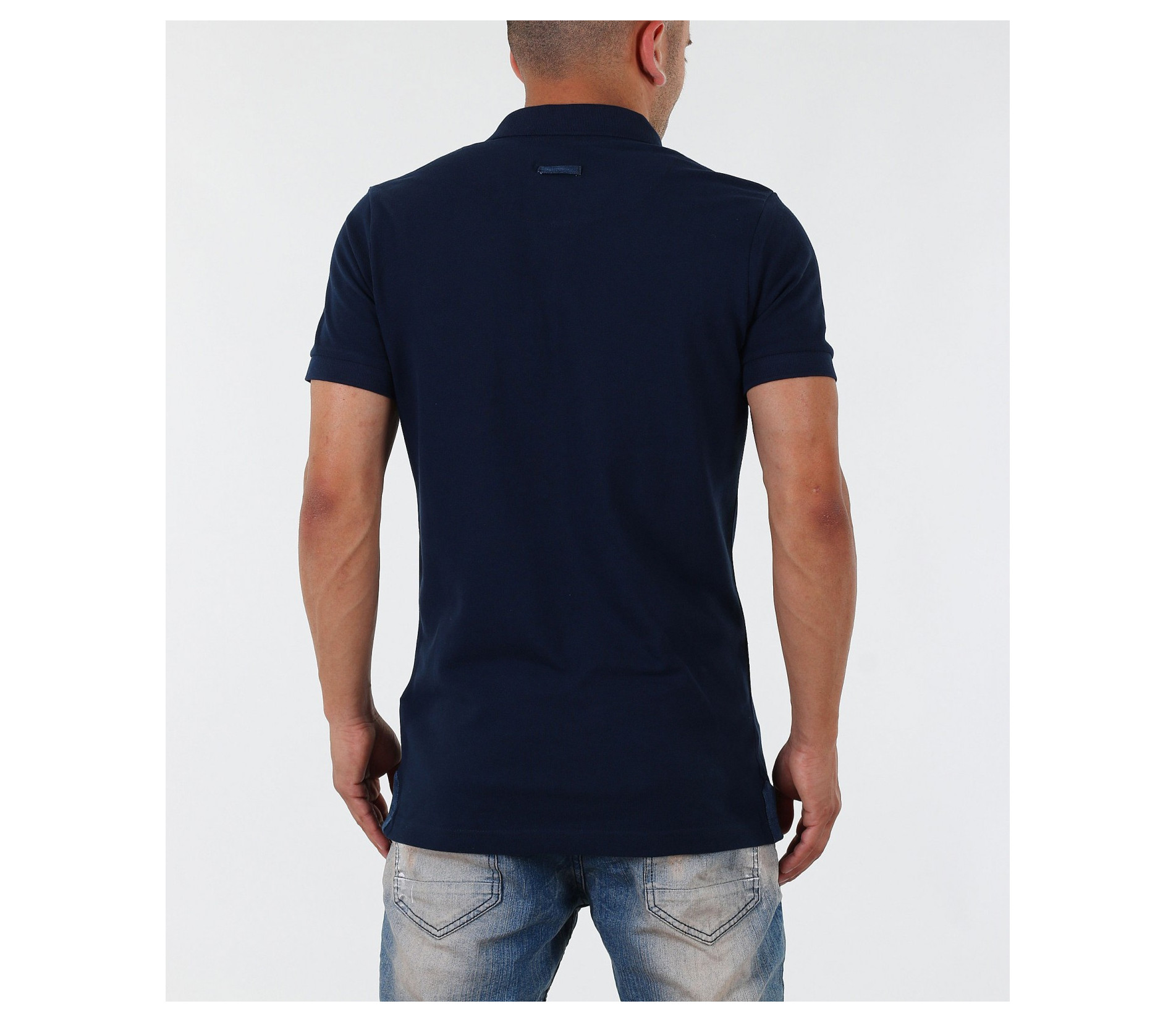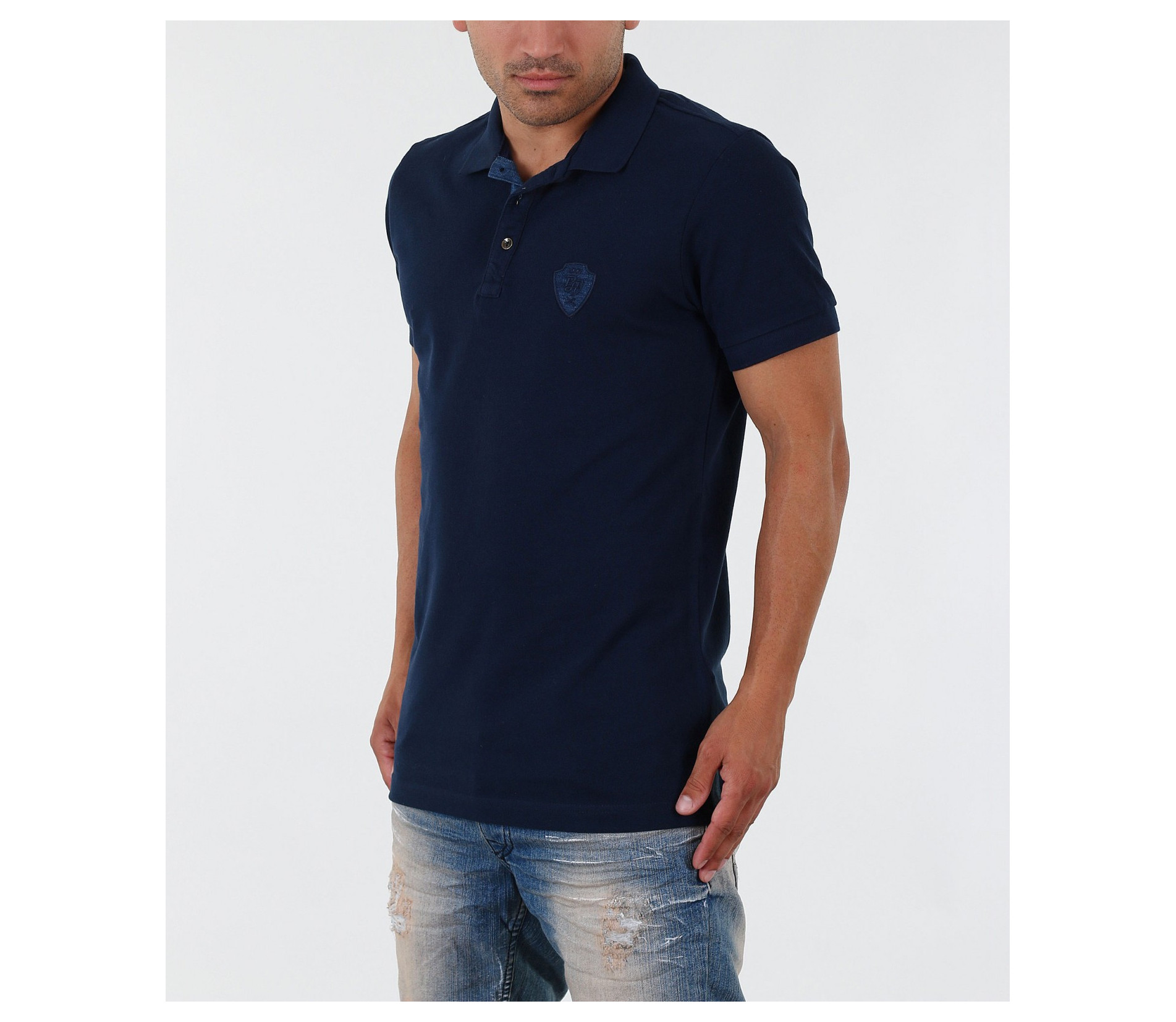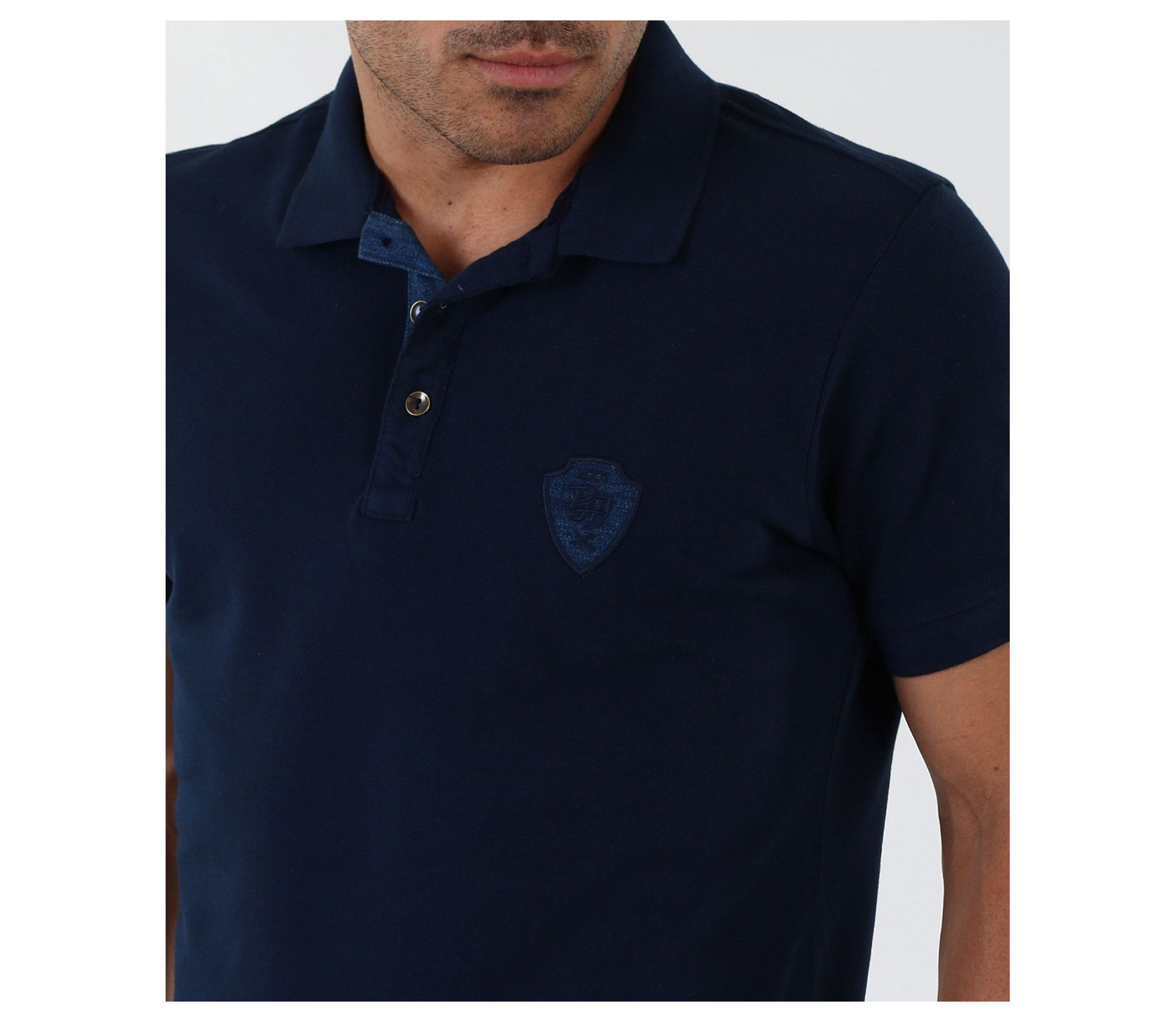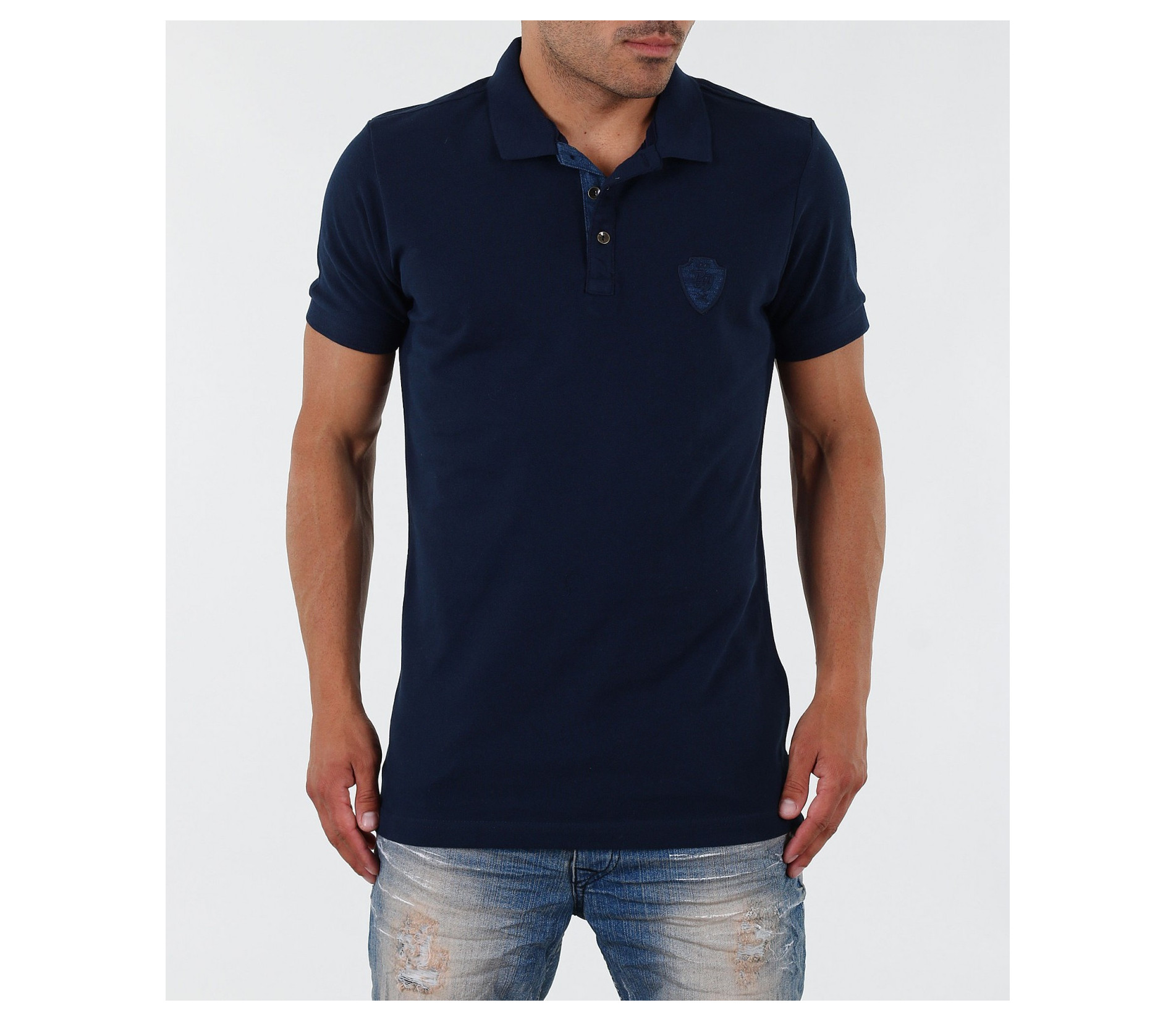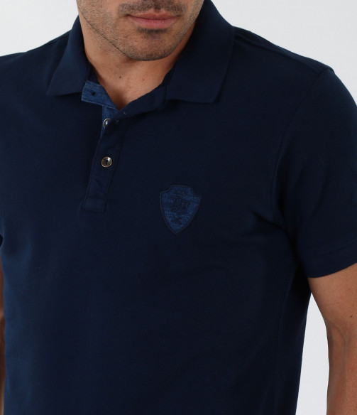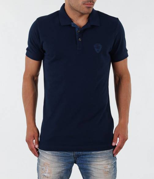 Описание на продукта: Изключително стилна мъжка блуза с къс ръкав. В областта на деколтето са поставени две малки копчета, като акцент. Тениската е с ниска яка, декорирана с дънков кант. В областта на гърдите има малка бродерия изобразяваща логото на марката, което също е декорирано с плат деним. По края на ръкавите са поставени ластици, които ги прибират плътно по ръката. Моделът е напълно изчистен от пликации и щампи, което го прави толкожа стилен. Кройката на тишърта е леко вталена със стандартна дължина. В комбинация със спортно-елегантен панталон или дънки, чифт свежи еспадрили и аксесоар по Ваш вкус получавате идеална визия.