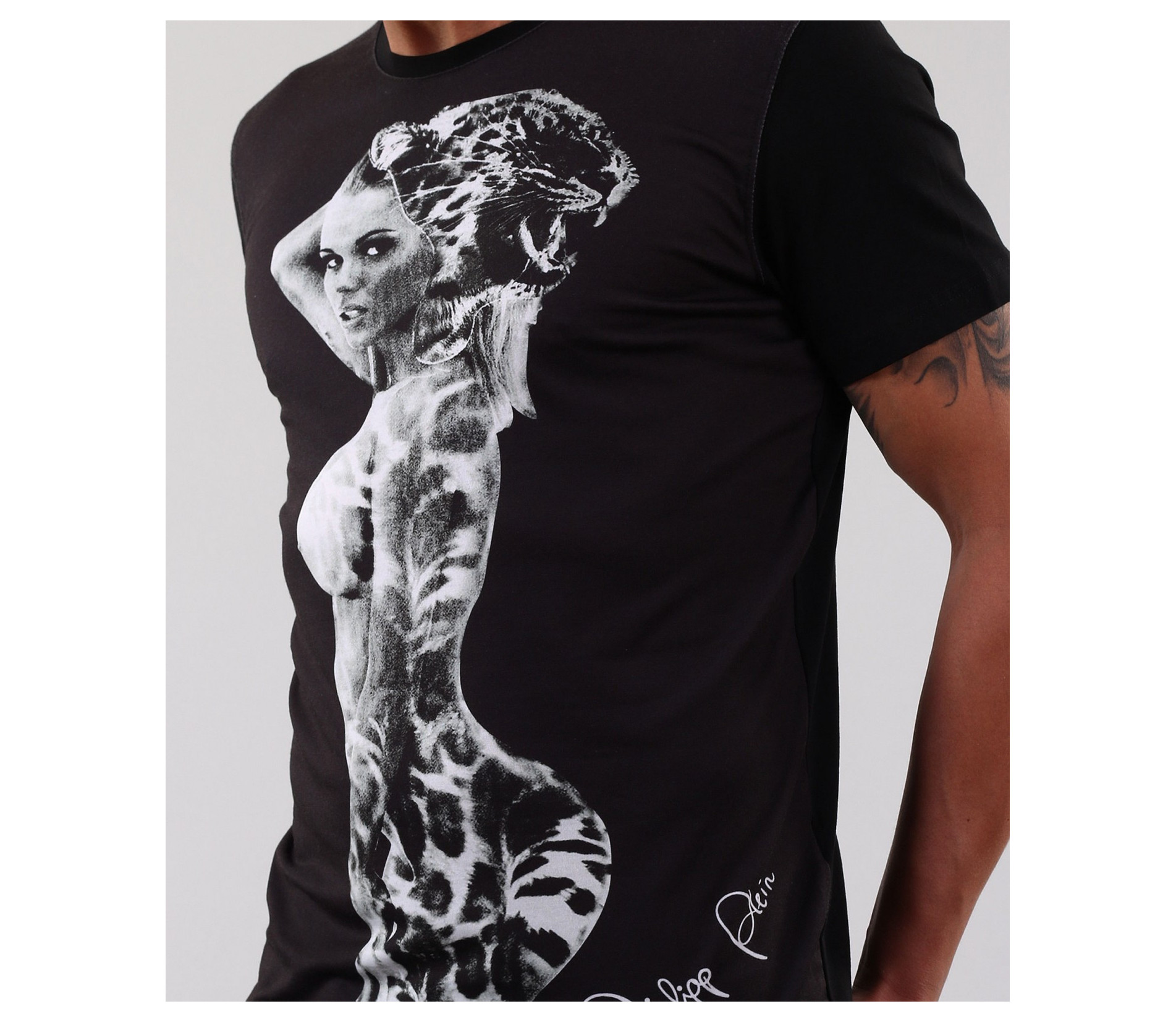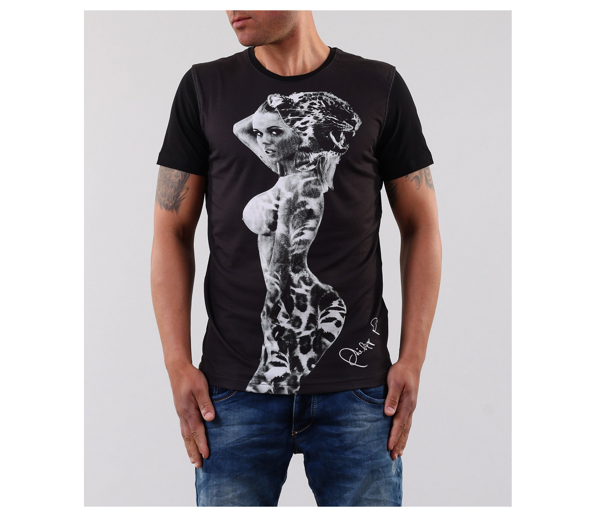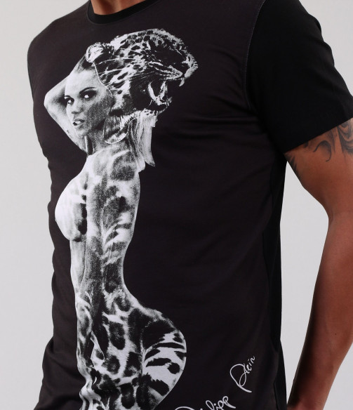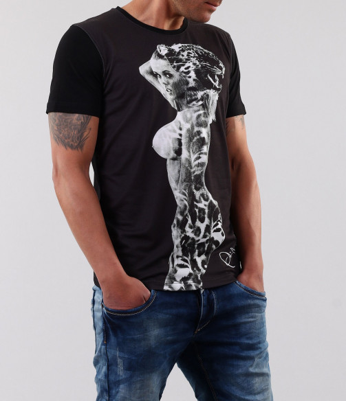 Описание на продукта: Ето едно малко по-различно предложение. Мъжка тениска с интересен принт женски образ, наподобяващ тигър. Под апликацията има деликатен надпис. В задната част моделът е изчистен, като е поставен само акцент в областта на врата, малко декоративно ножче изобразяващо логото на марката. Кройката на моделът е вталена и със стандартна дължина. Заради изчистената си визия, тишърта позволява да има широк избор при съчетаването и с други дрехи и аксесоари. Изработена е от висококачествени материали: 50% памук и 50% полиестер.