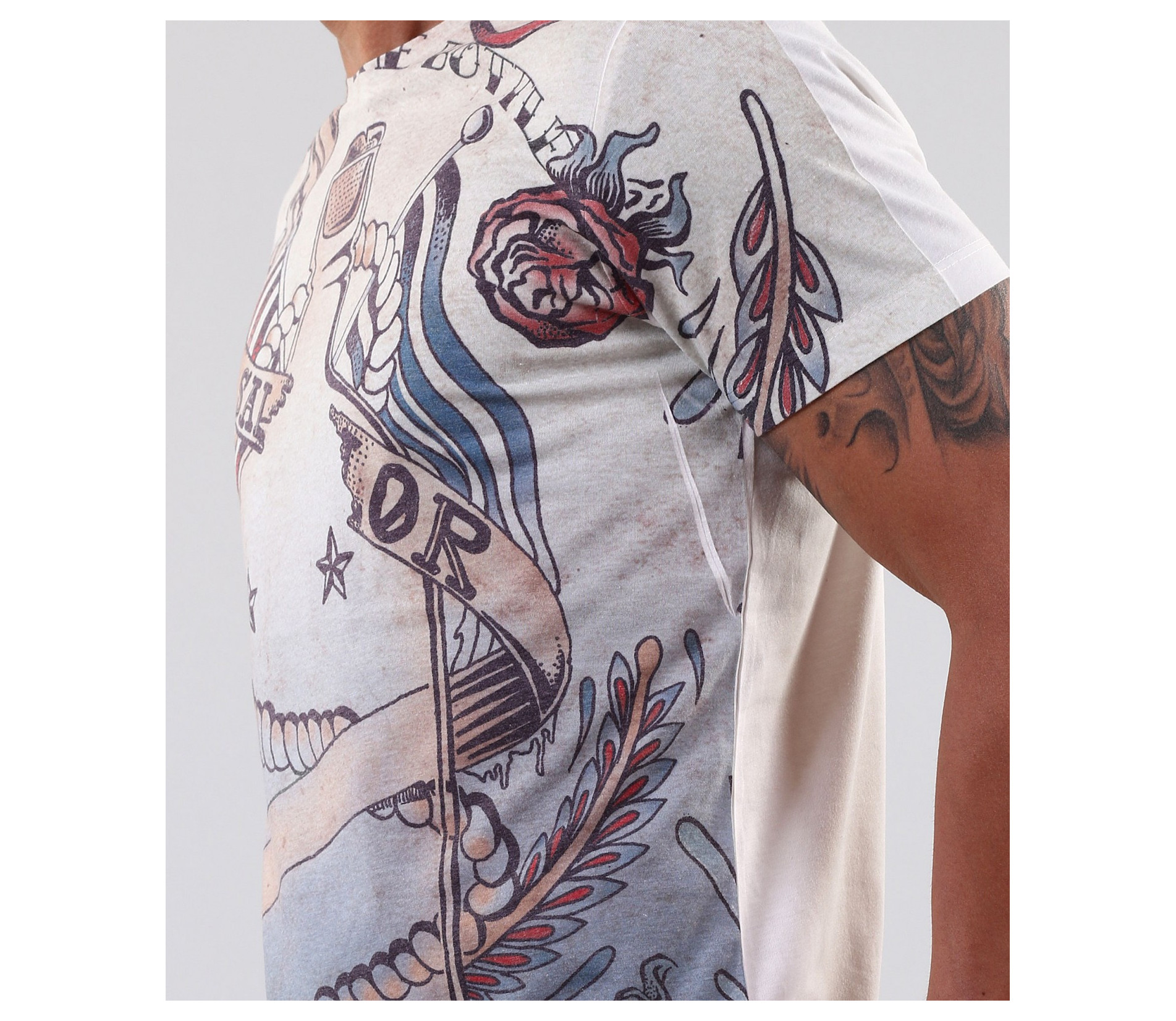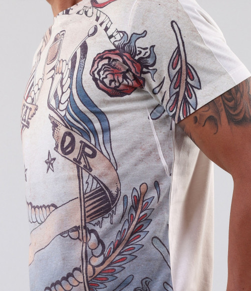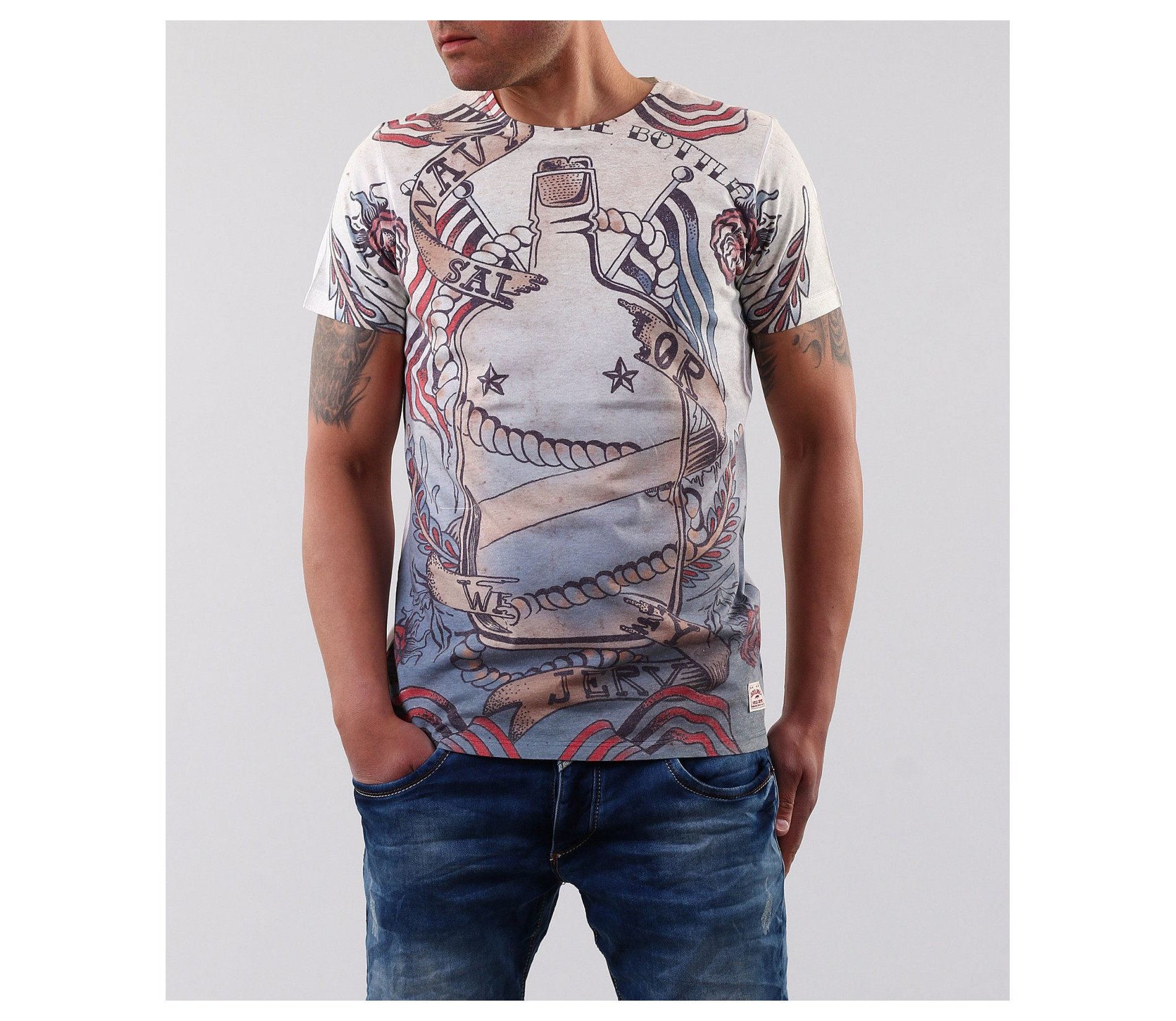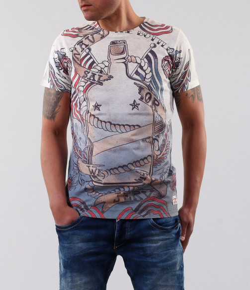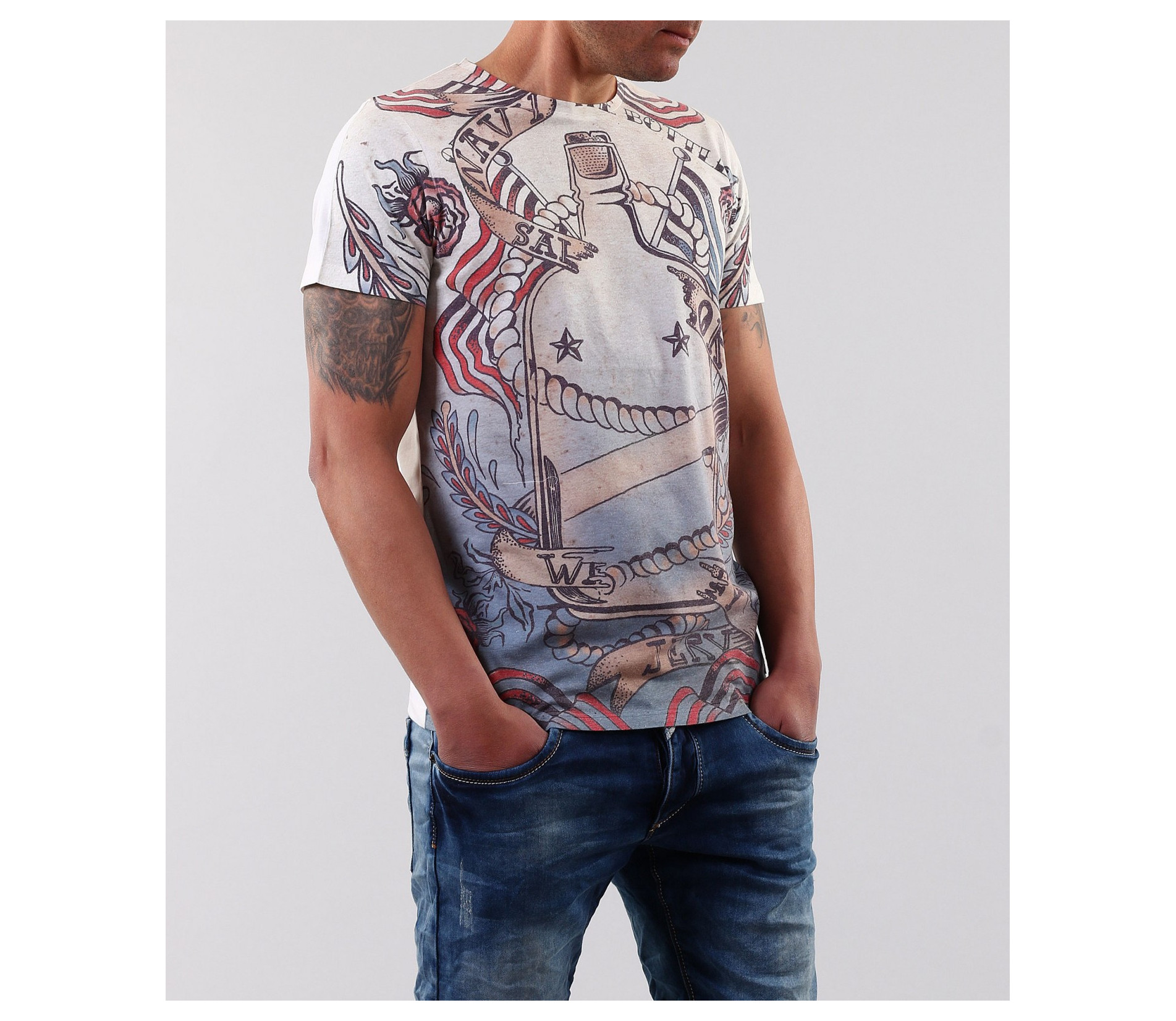 Описание на продукта: Супер свеж модел мъжка цветна тениска. Тя е с напълно изчистен гръб, като контраст на предната част на модела. Там са поставени различни моряшки мотиви, в тон с летните дни. Десена в предната част съчетава в себе си доста цветове, и така това Ви позволява да импорвизирате при съчетаването на тениската с панталони, обувки и аксесоари. Този модел тишърт е с вталена кройка и овално деколте. Освен стил, тениската Ви осигурява комфорт, заради висококачествените материали, от които е изработена: 70% полиестер и 30% памук.