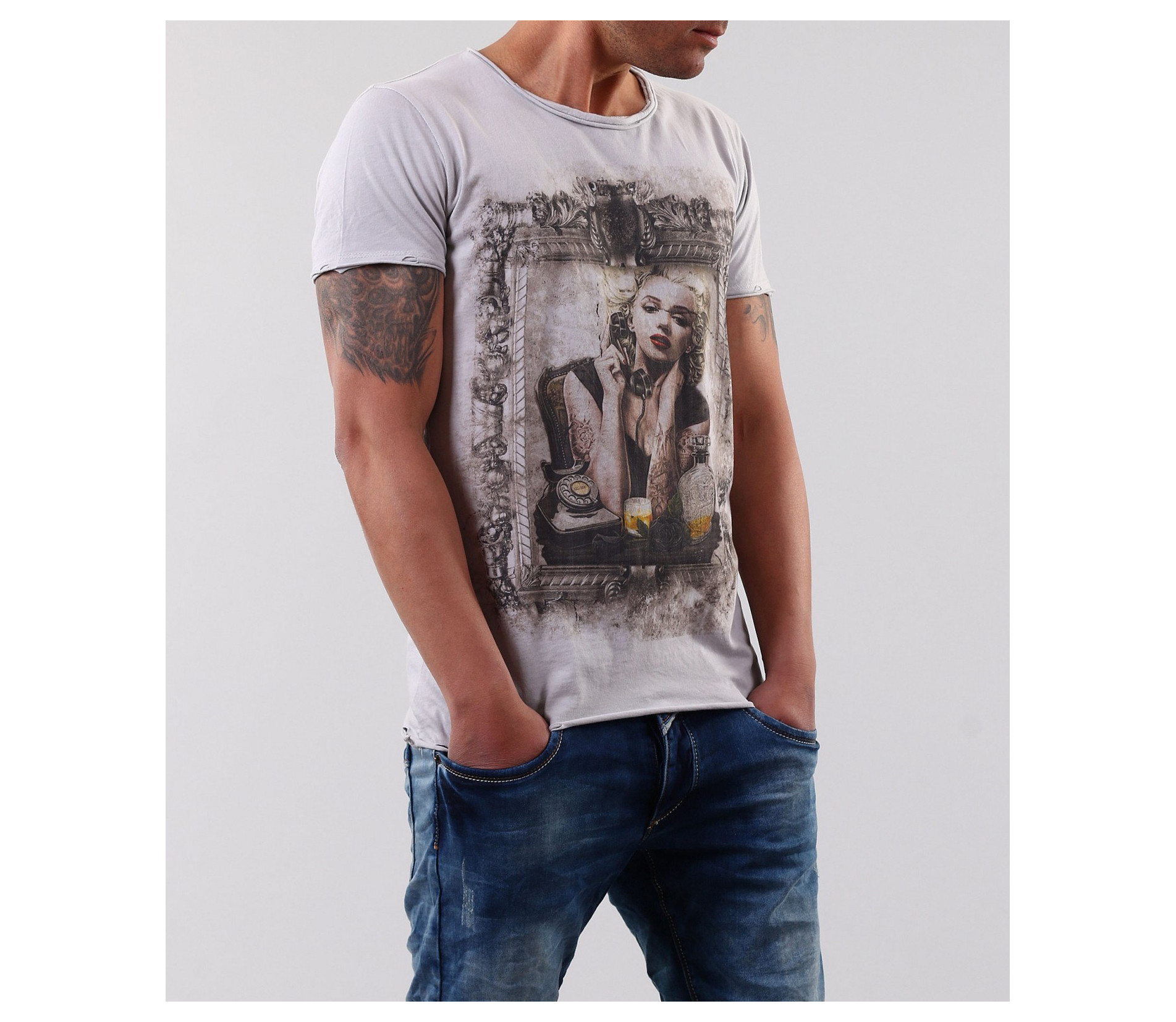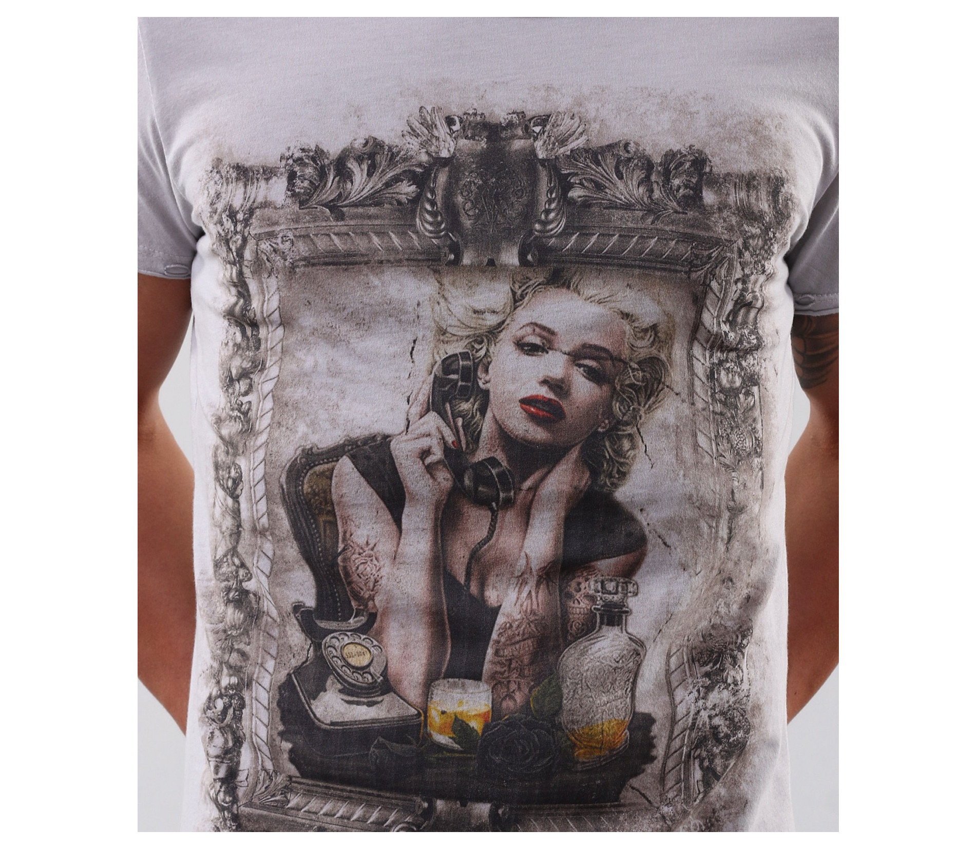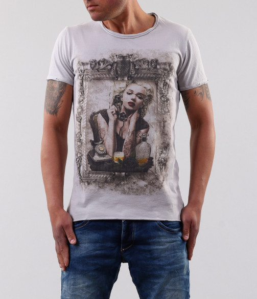 Описание на продукта: Супер актуален модел мъжка тениска с модерен принт. Гърбът на тениската е напълно изчистен, като акцента пада в предната част. В областта на гърдите е поставен образ на М.Монро, който е декориран с рамка от орнаменти. Непретенциозен модел, който би паснал на всякакъв стил. Страхотно съчетание е както със спортно-елегантни панталони и сако, така със дънки и спортни кецове. Леки акценти са също и шевовете в долната част на модела, ръкавите и деколтето. Семплите цветове по тениската Ви позволяват да я съчетаете с широка палитра от цветове, както и с различни аксесоари по Ваш вкус. Тениската е изработена от 100% висококачествен памук, с което гарантира високото качество.
