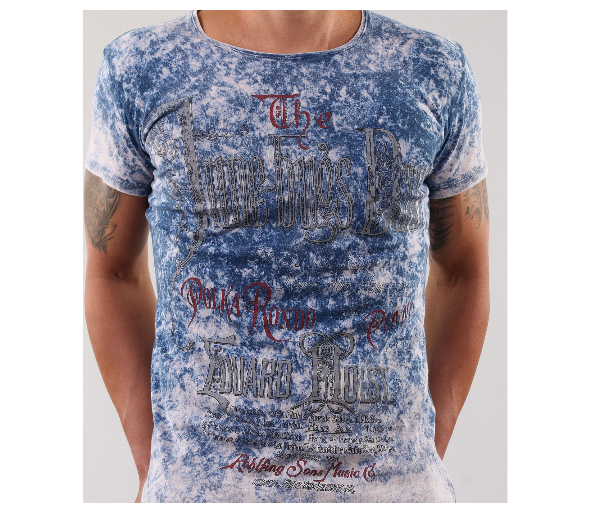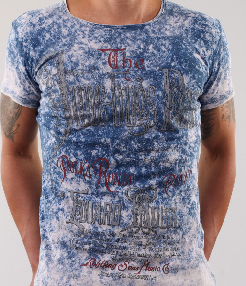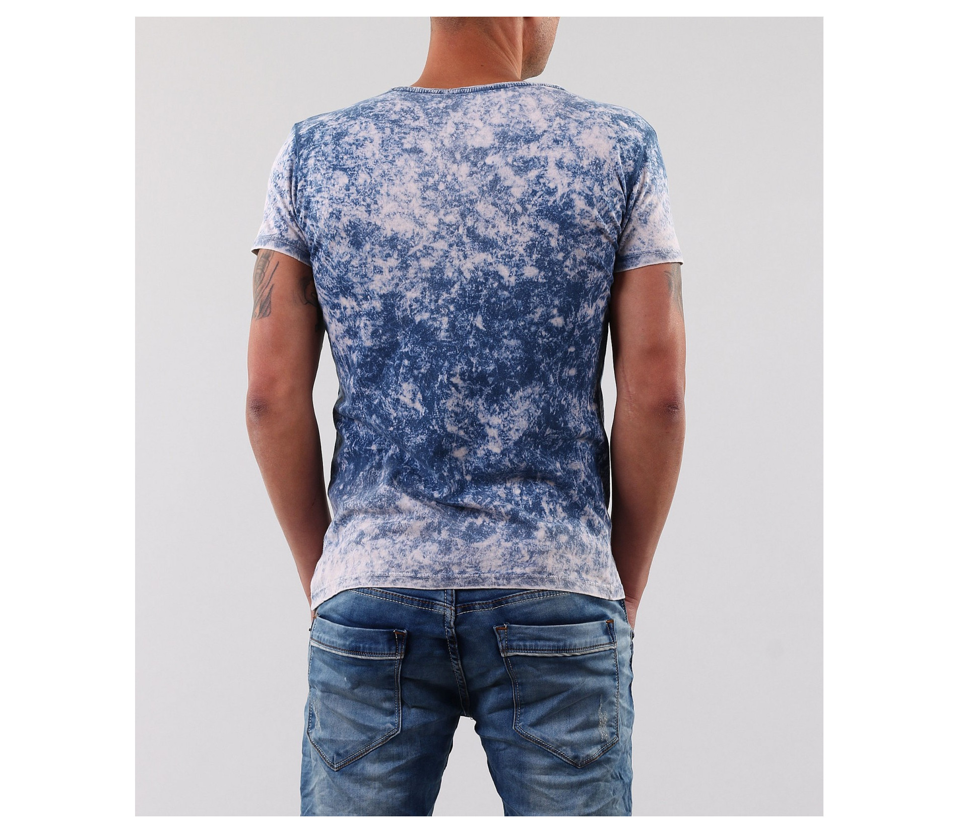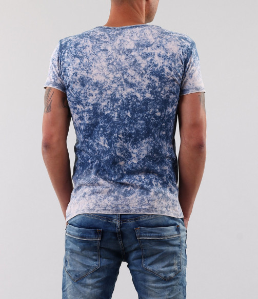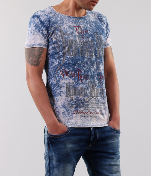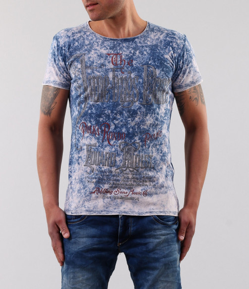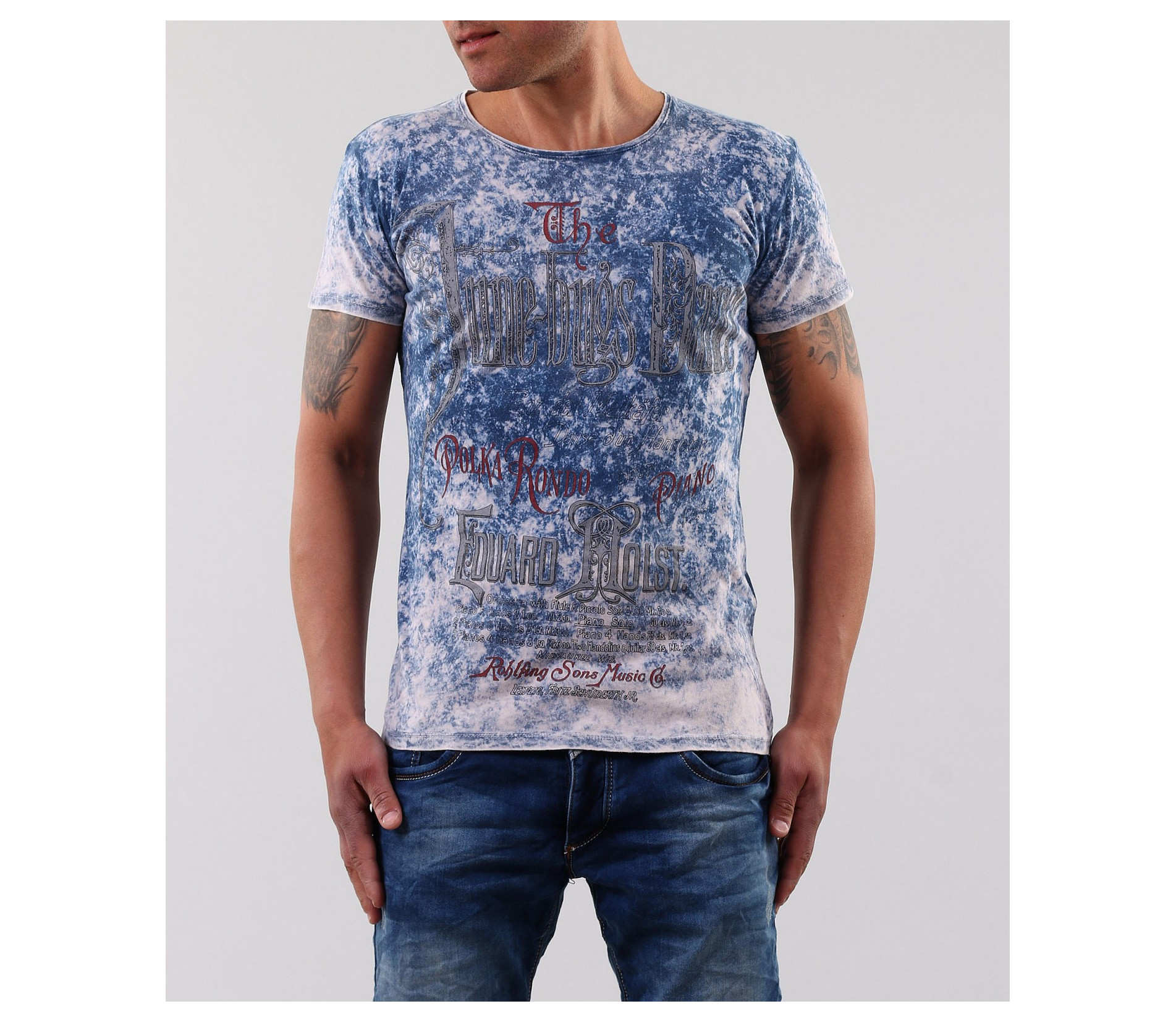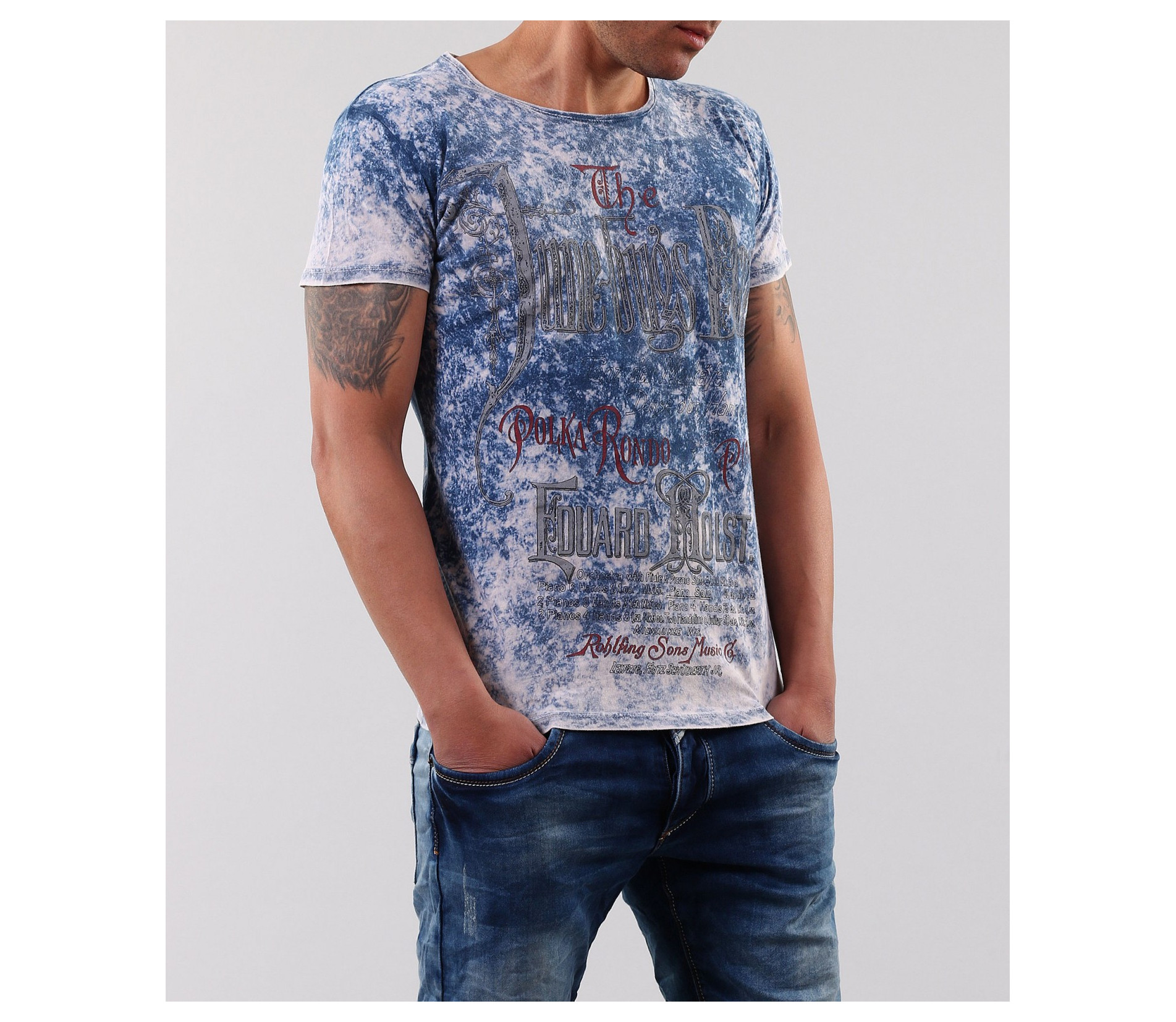 Описание на продукта: Предлагаме Ви нещо по-различно, специално за тези от Вас, които предпочитат по-раздвижената визия. Мъжка тениска с избелял ефект на места и акцент в предната част. В областта на гърдите е поставена щампа надписи. В задната част моделът е по-изчистен. Този модел тениска е с вталена кройка, стандартна дължина и овално деколте. Изключително лека и приятна материя, изработена от 100% висококачествен памук, която Ви осигурява комфорта, който търсите. Перфектно се съчетава със къси и дълги дънки, както и със спортно-елеганти кецове в смели и актуални цветове.