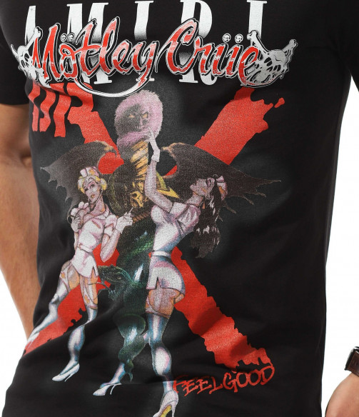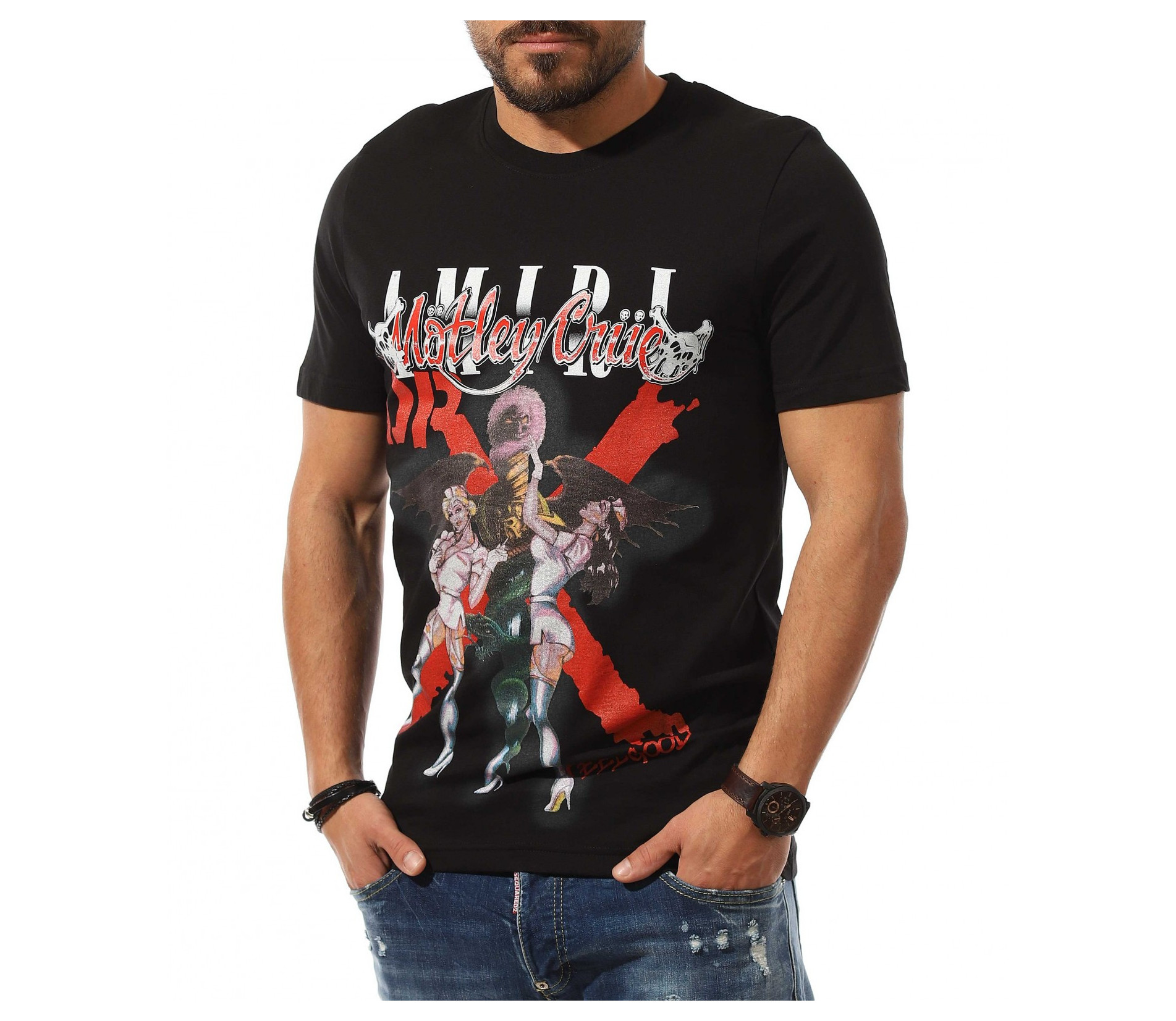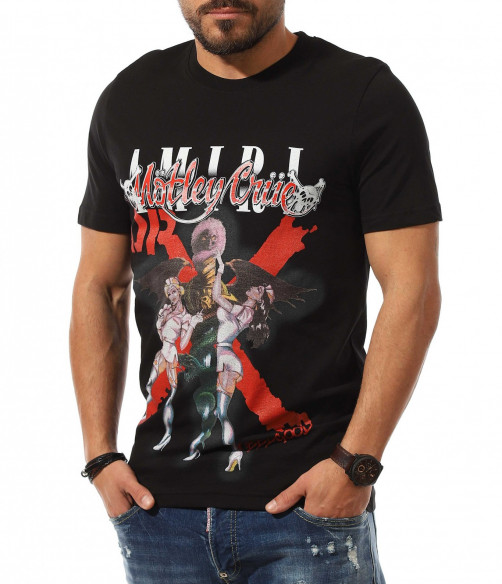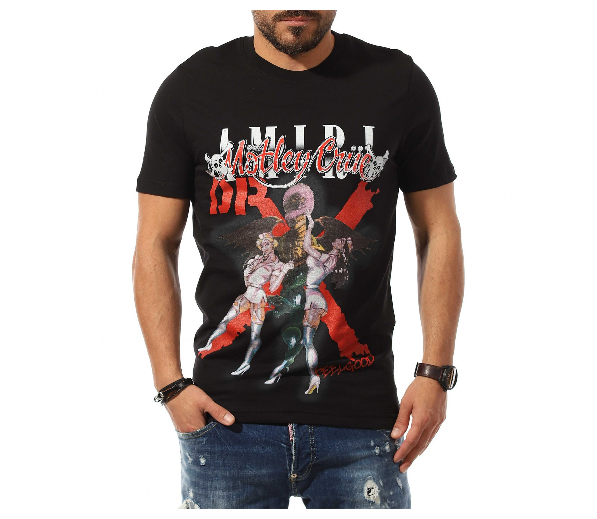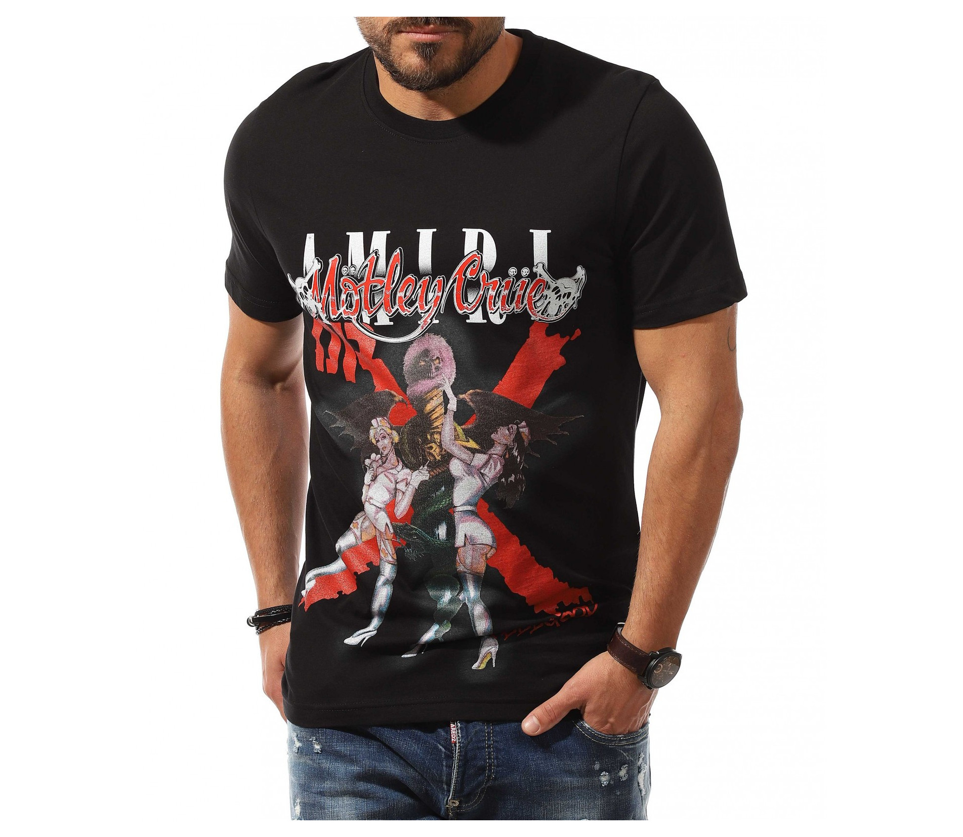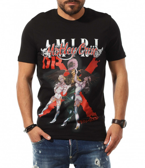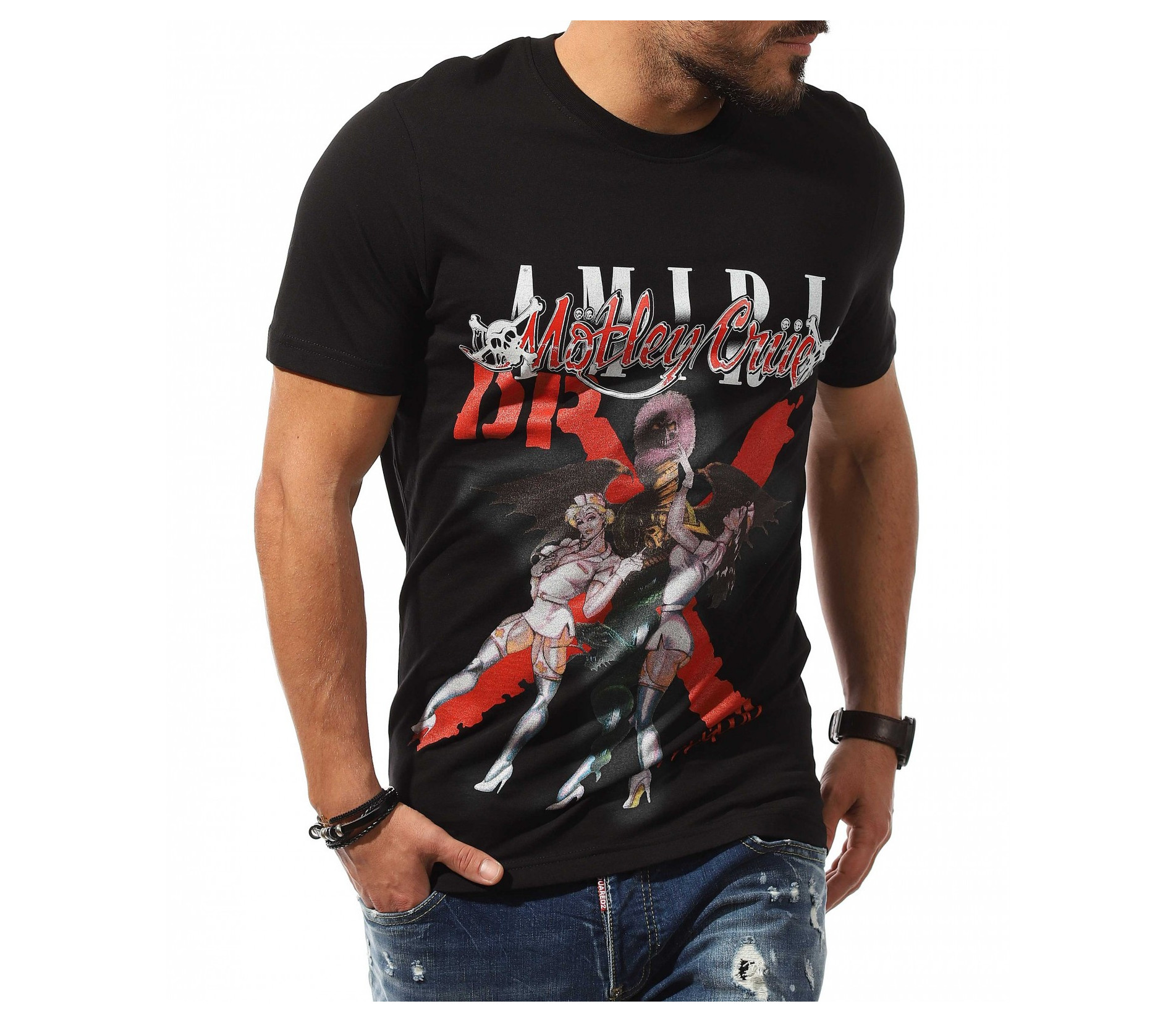 Описание на продукта: Класически модел мъжка черна тениска, подчертана от силно вталена линия и стандартна дължина. В лицето на елементите, изработени в детайлност, откриваме и прилежно овално деколте, деликатно обикалящо врата. Акцентът тук се разпростира по цялата предната част на фланелката, като изобразява голяма щампа с женски силуети, преплетени един в друг. Начерната основа ярко се откроват малките червени мотиви, които успяват да внесат различен облик на t-shirta. За финален щрих е използвам голям бял надпис, изобразяващ логото на бранда AMIRI. Без колебание включвайте тениската както в ежедневния, така и в клубния си стайлинг, като подибрате различни панталони и дънки за целта.