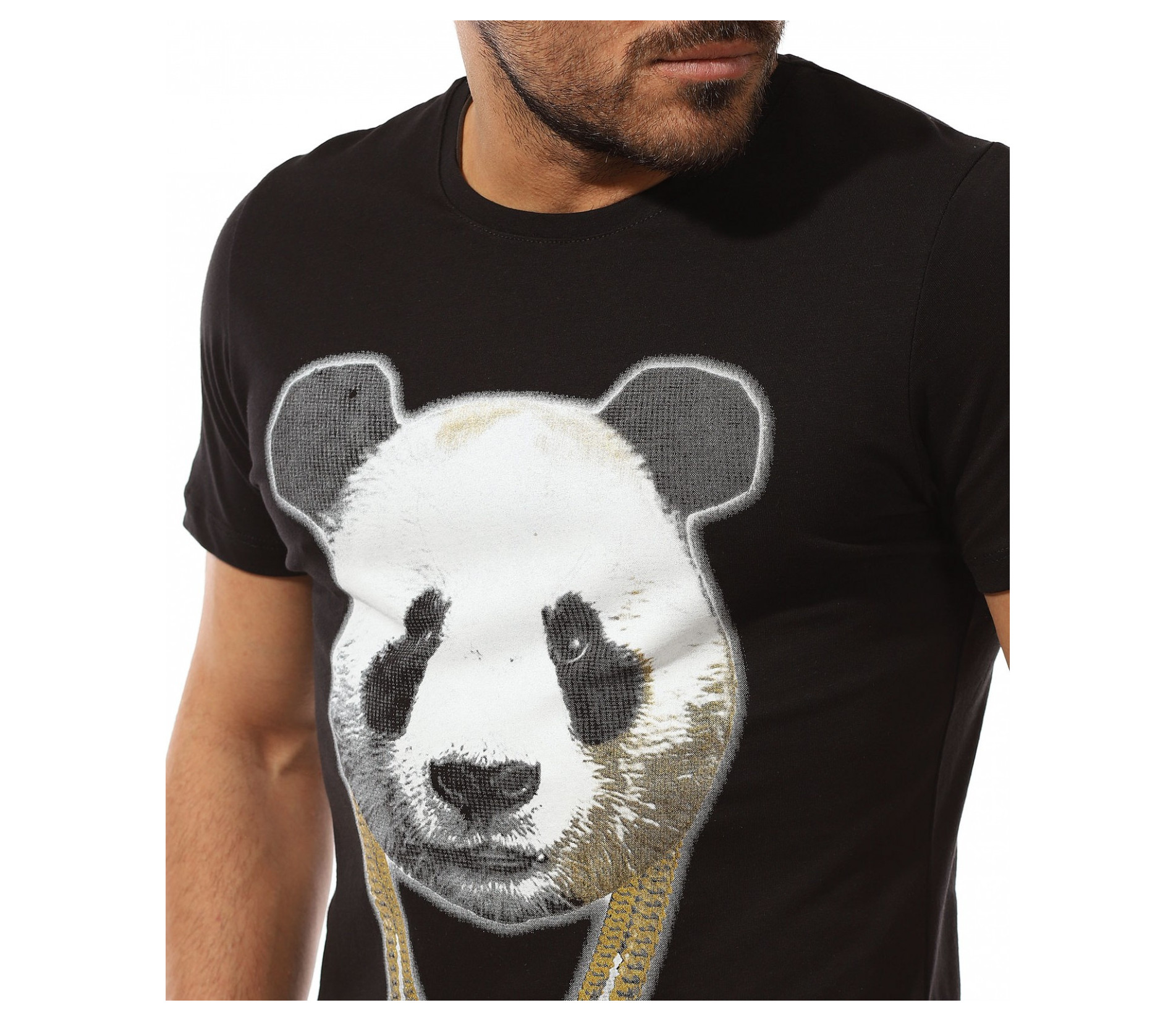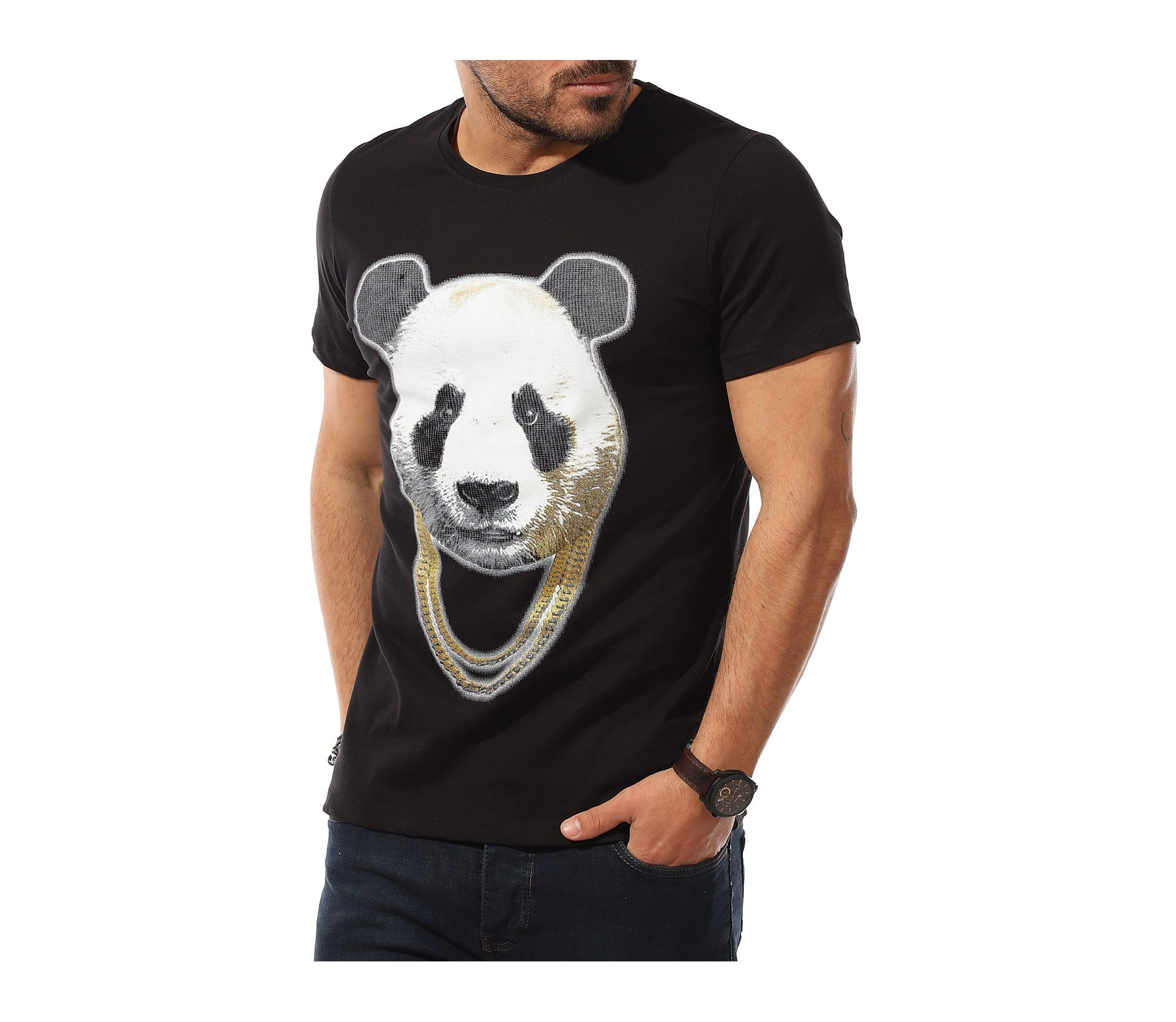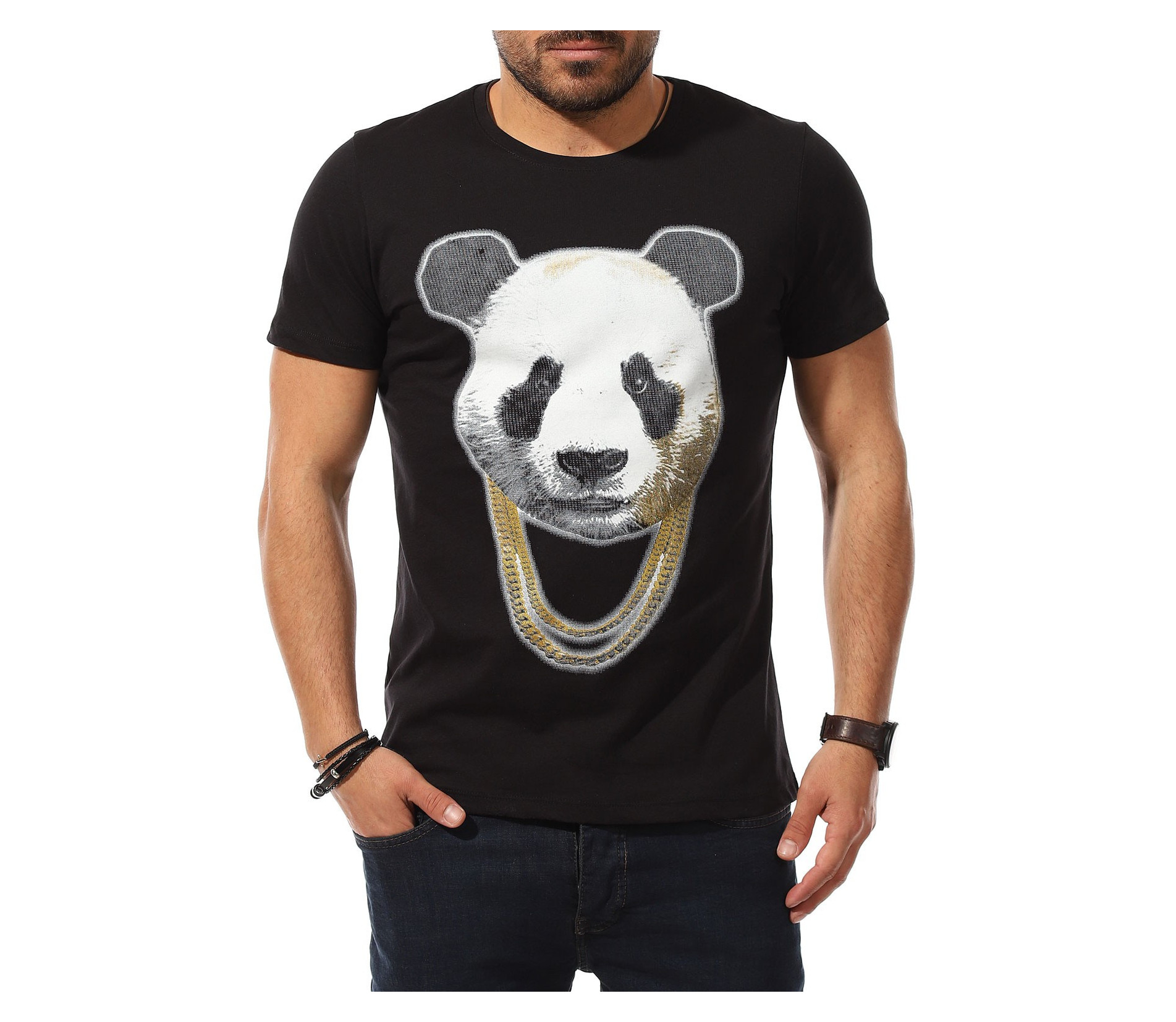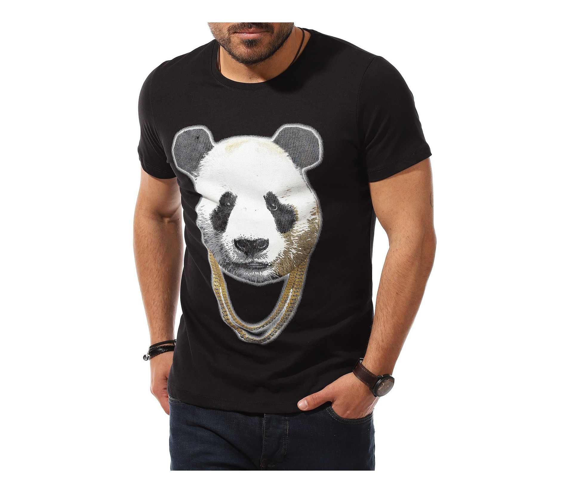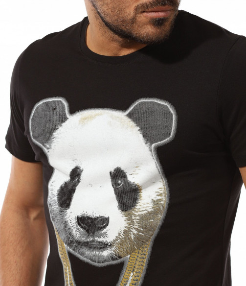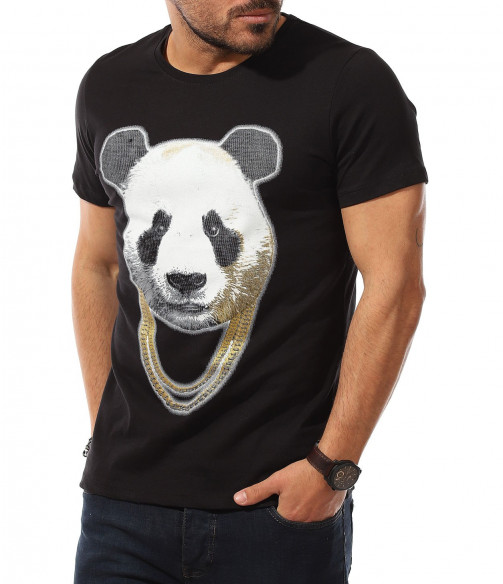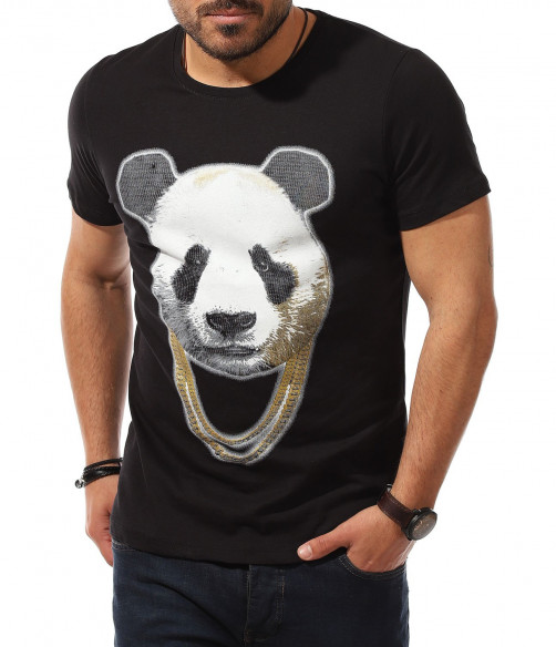 Описание на продукта: Мъжката тениска е като реликва във всеки гардероб, особено през летния сезон. Ние се опитваме да разнообразяваме ежегодно набора Ви от такива, за да може освен удобно, да се чувствате и максимално приятно и актуално. Таз годишните модни трендове се спряха на семпла основа, декорирана от ярка, масивна апликация в предната част. Тук моделът е поверен на силует от панда, изпъстрен в традиционни нюанси, под формата на силно реалистичен вид. За да се запази закачката, в долната част на щампата е разположен и декораитвен ланец, имитращ аксесоар на пандата. Уникалното въображение, свободно мислене и настроение, което създава този модел фланелка е подходяща за всеки от Вас. За допълнение е подбрано овално деколте и вталена линия. Подберете по-вечерната черна основа или свежата бяла такаква.