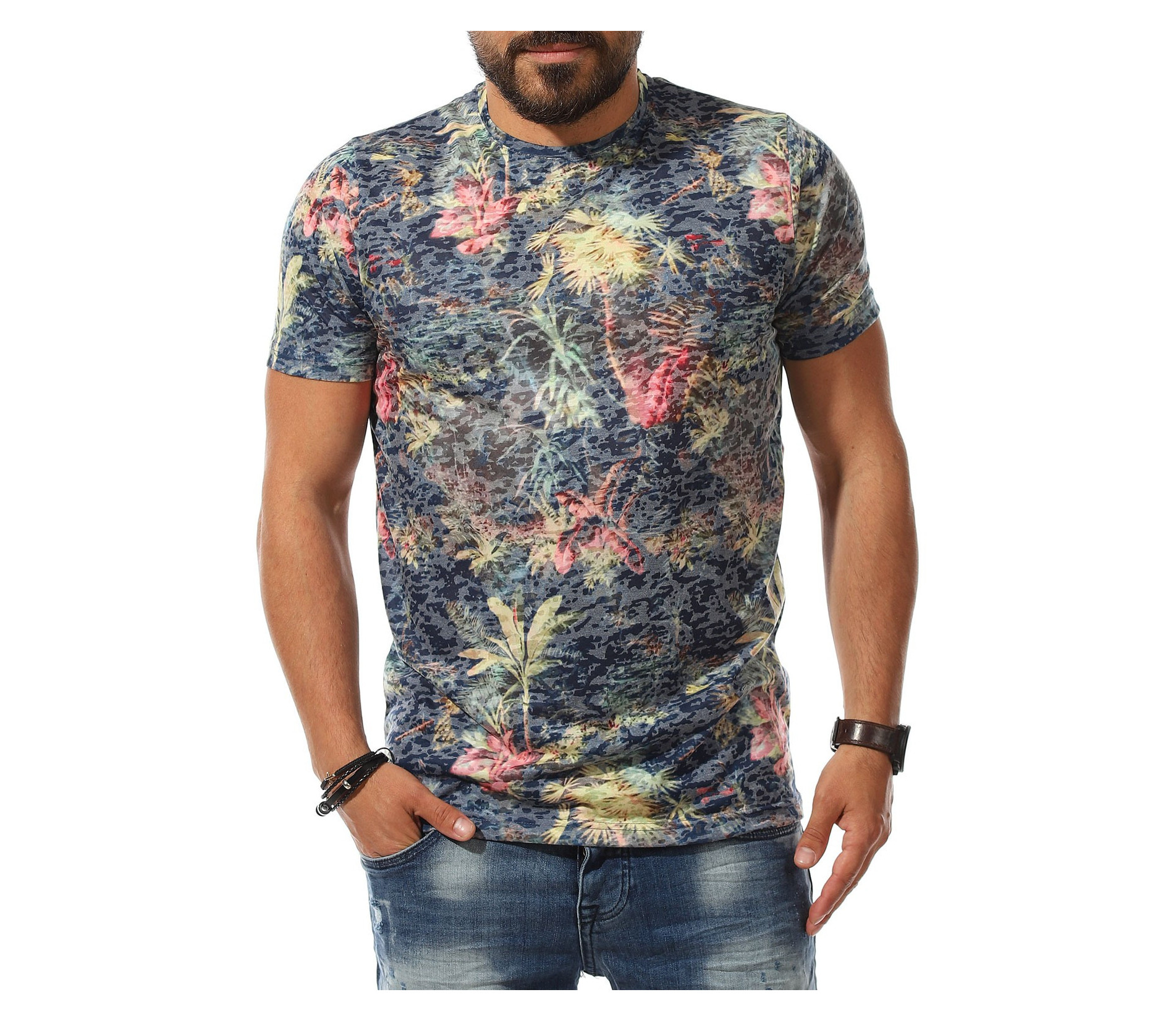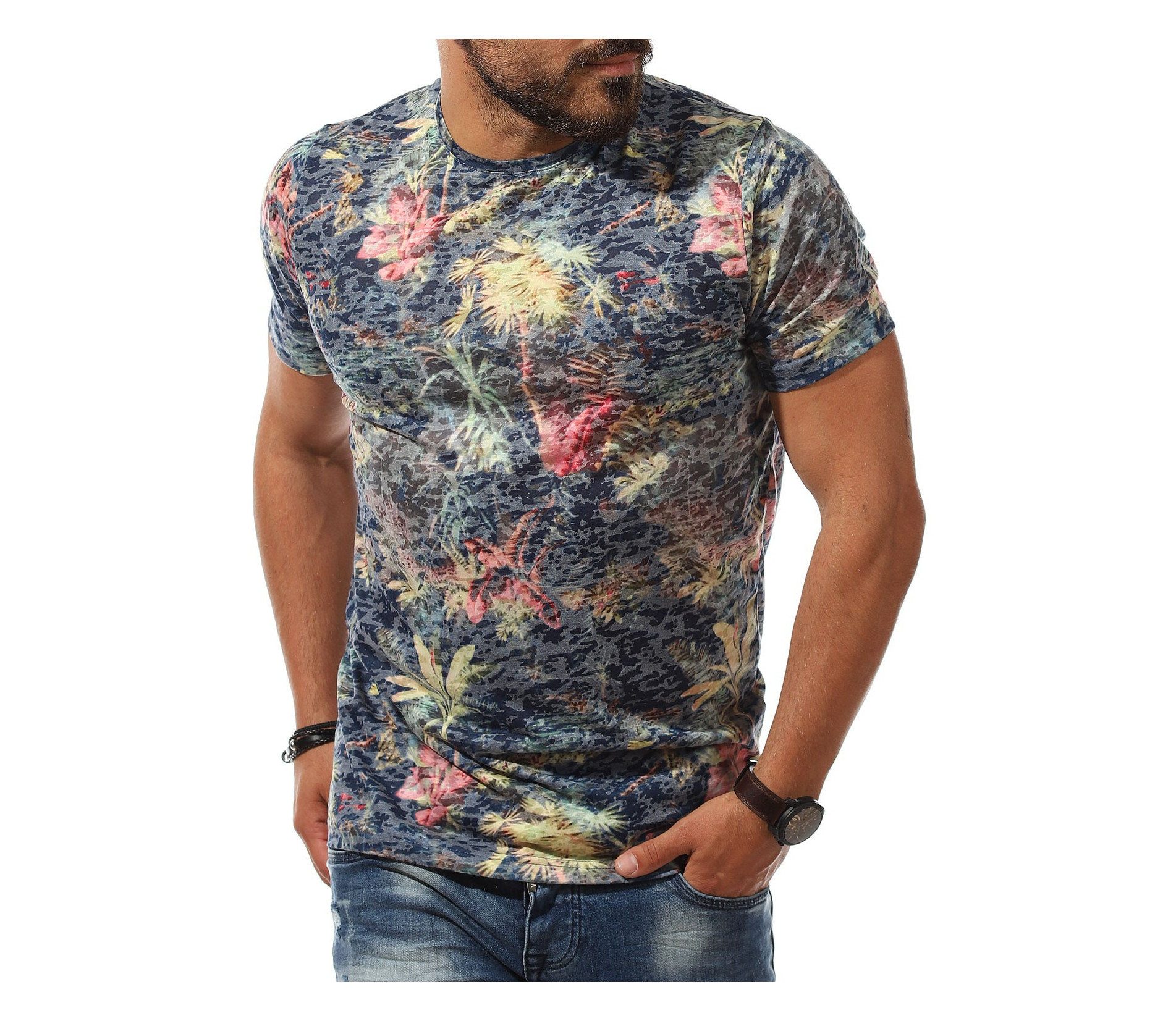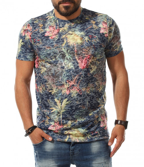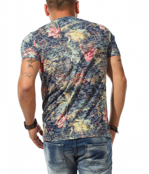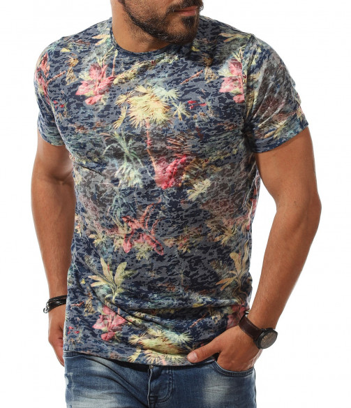 Описание на продукта: Класна мъжка лятна тениска, излъчваща свежест и непринуденост. Основата на фланелката е поверена на тъмен цвят в актуална за лятото гама, върху която са разпръснати малки, но атрактивни флорални орнаменти, под формата на палми. Този вид основа предполага свободен, удобен и изпълнен с добро настроение стайлинг, който смело може да ползвате както в ежедневието, така и при подготвка за плаж. Небрежния имидж е идеален за лято 2021г, тъй като модните брандове диктуват освободеното мислене и леките цветове да са на почит. Разбира се, не подминаваме и линията, която така деликатно пада по тялото, давайки му нужното удобство. Не му мислете а смело съчетайте този t-shirt с любимите памучи или дънкови ¾ панталонки и сте готови за летни приключения