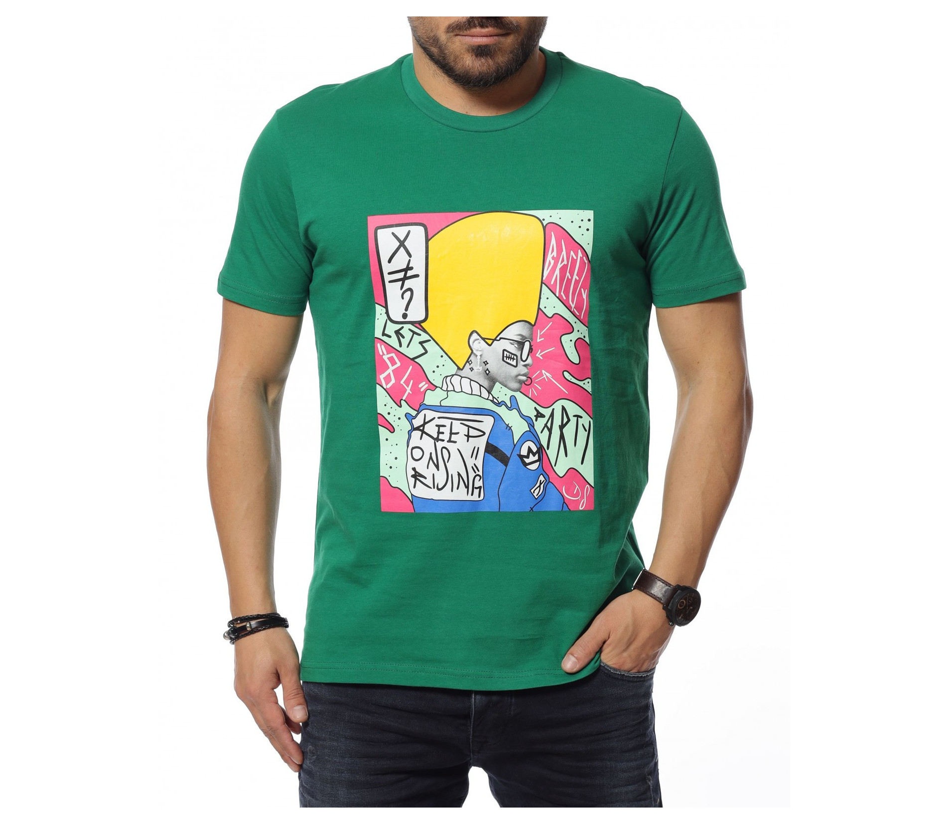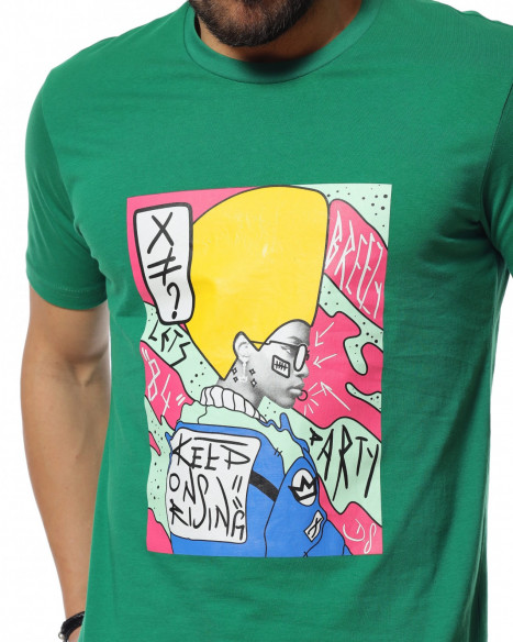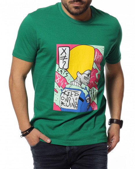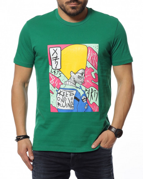 Описание на продукта: Подготвили сме ви отличен избор цветна и свежа тениска с декорация - щампа. Тя е изработена от 100% памук, което ви създава удобство и комфорт. Акцентът тук е щампата, която е поставена в средата на тениската и е нещо различно и разчупено, с което може да разнообразите гардеробът си. Контрастът между двата елемента, основа и щампа придава този нетипичен, но и много актуален моден похват, за съчетание на разнообразни и взаимноизключващи се детайли, които изненадващо създават перфектения тандем. От своя страна линия е типичният вариант, а именно прилежен втален силует, който придава на тялото така желаната фигура. Може да я комбинирате с удобни дънки по ваш избор и кецове.
