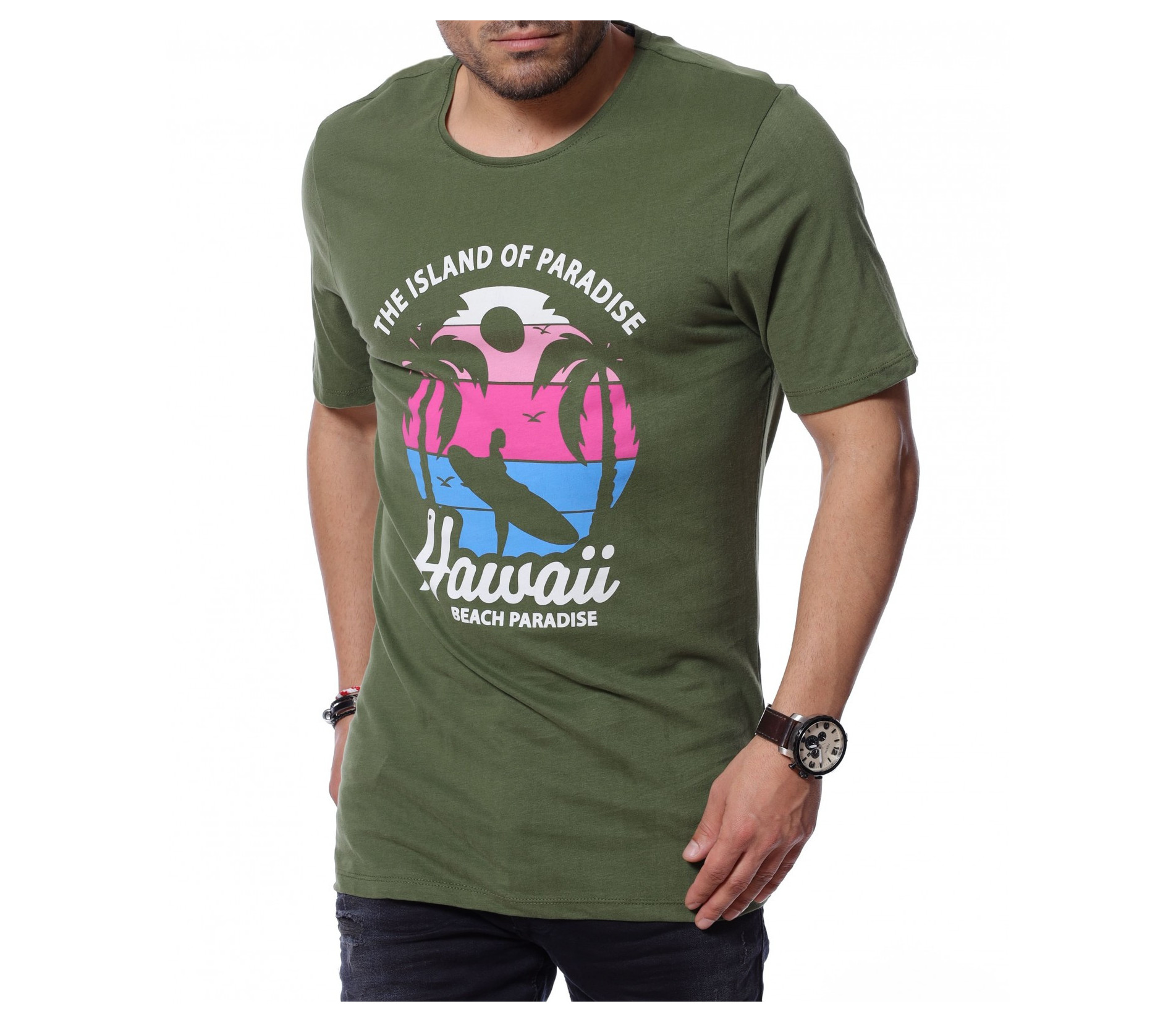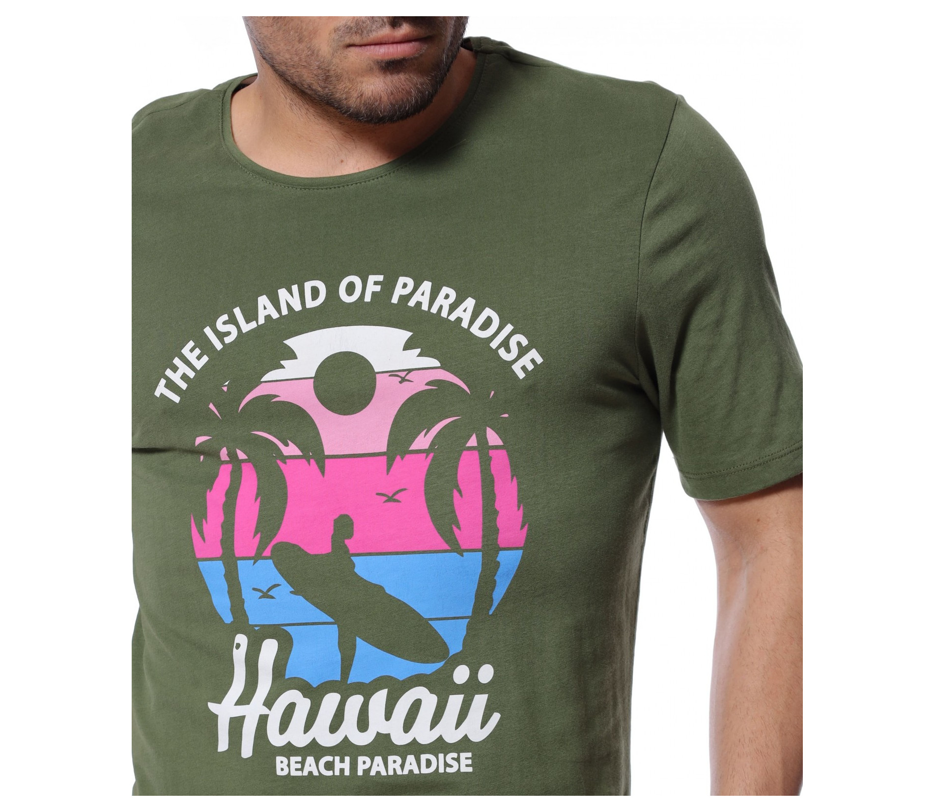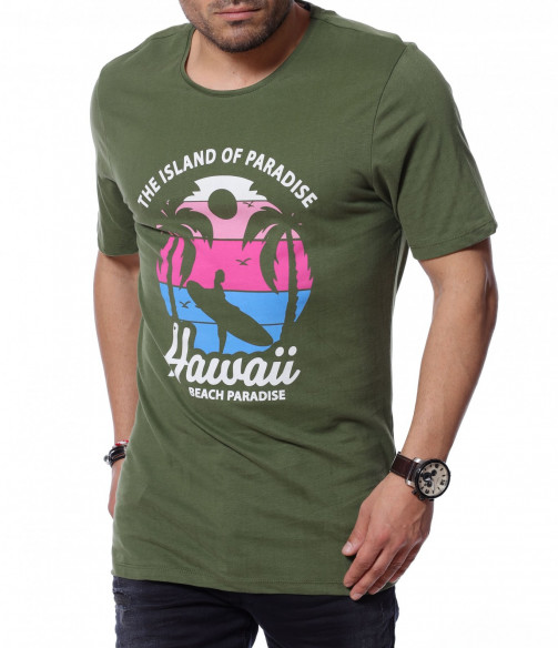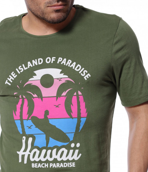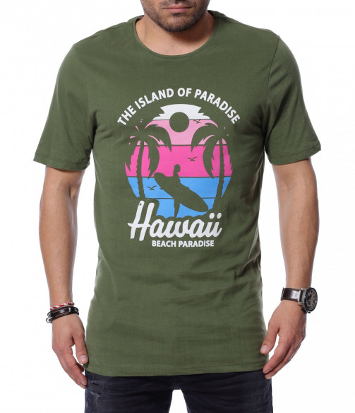Избрали сме ви едноцветна, щампирана тениска с надпис Hawaii. В този случай декорацията се разполага по предната част на моделът и е разположена по средата на блузката. Кройката е вталена и издължена. Основата е еднотонна в пастелен цвят. Деколтето е стандартно и овално, а дизайнът на щампата е приложен в няколко ярки и забележими цветове. Съчетайте с дреи по избор и добавете едно ново попълнение към гардероба си.