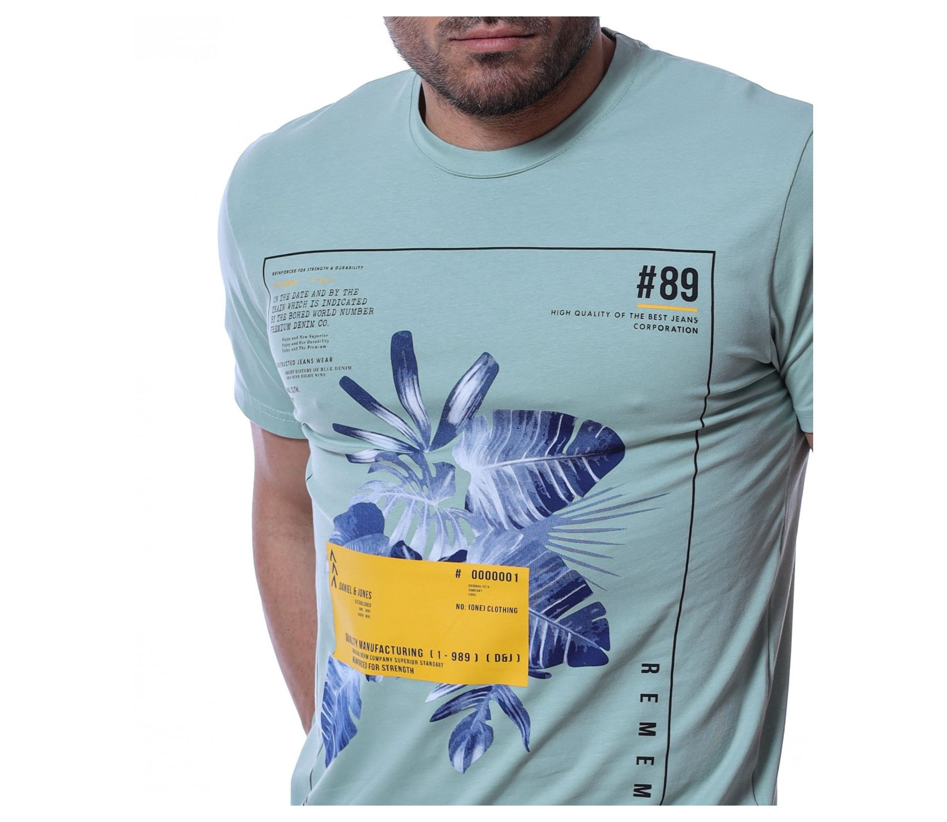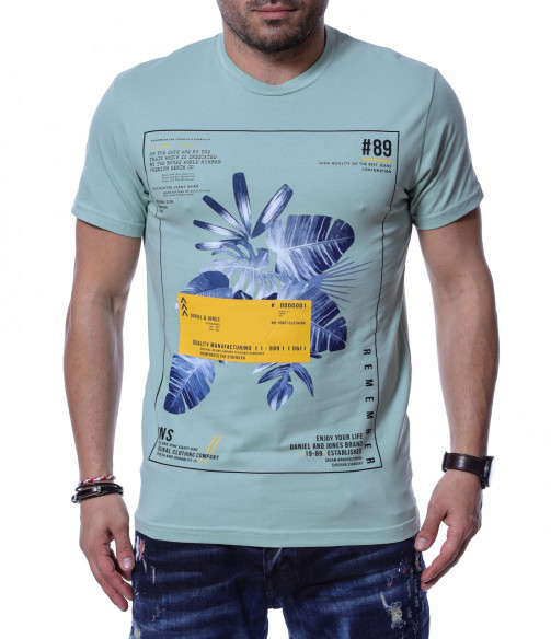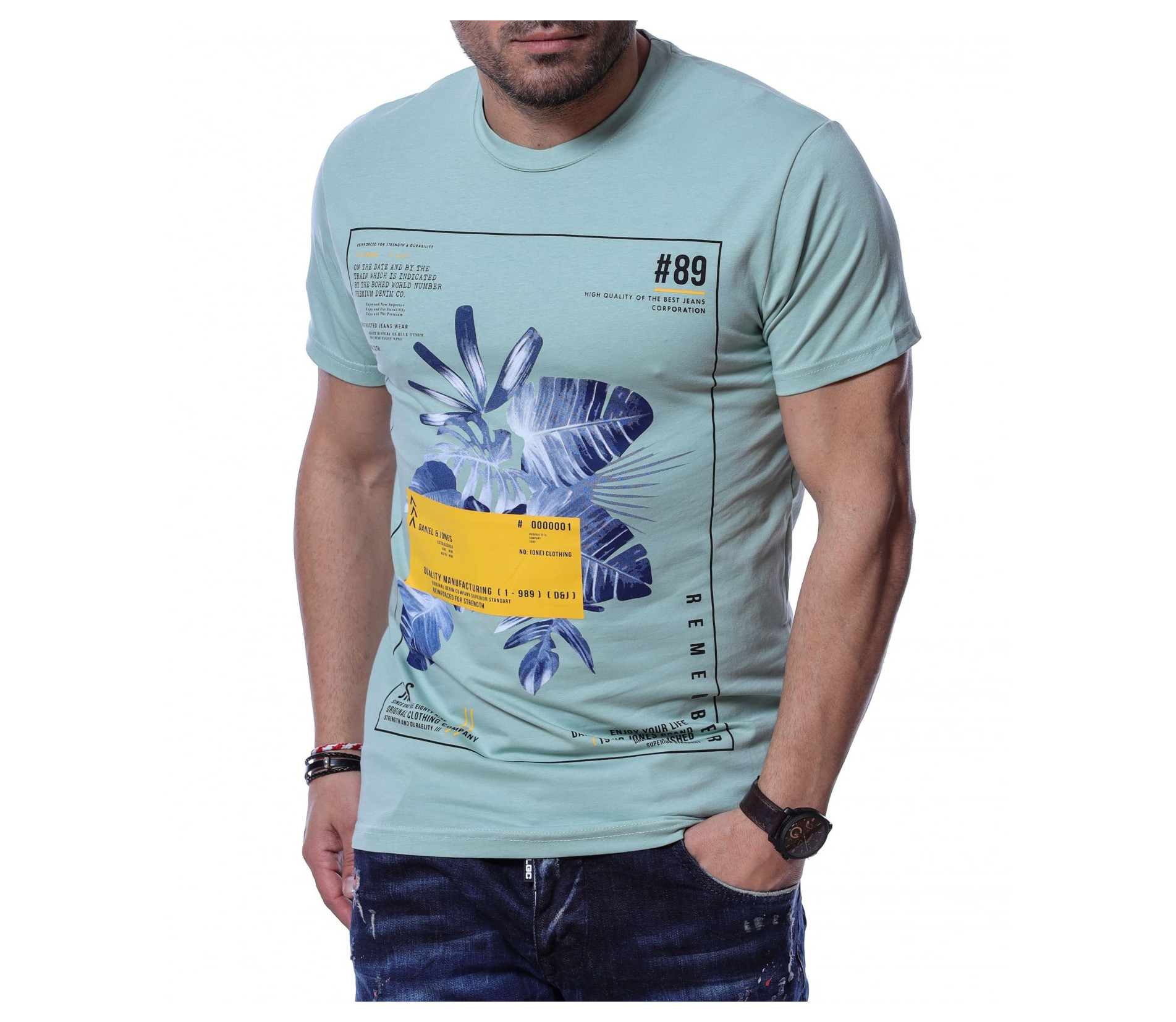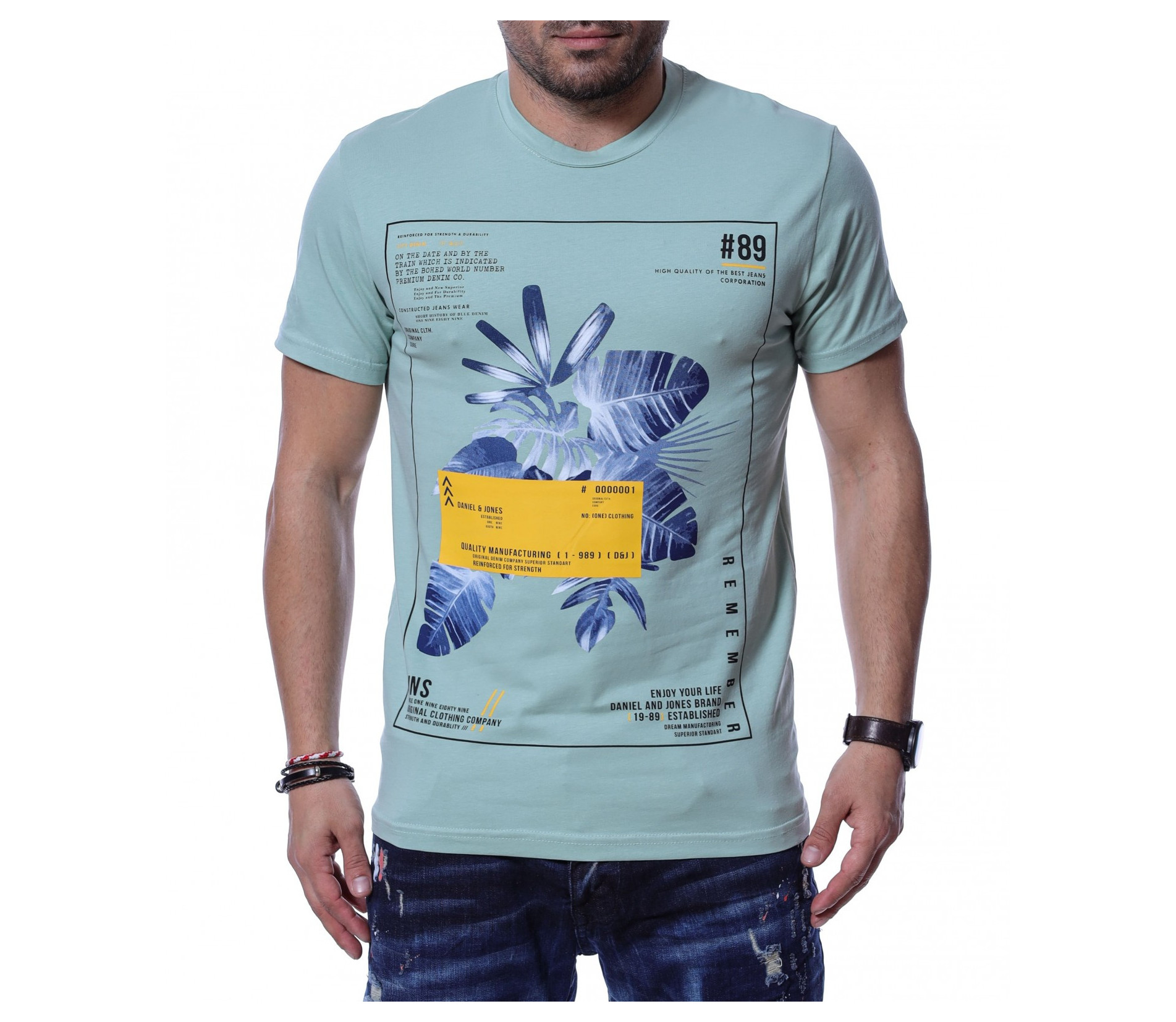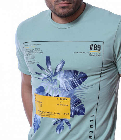 Свежа и модерна мъжка тениска в пастелени и ненатрапчиви цветове. Предната част впечатлява с голяма щампа, придружена от рамка и флорален принт с малки небрежни надписи. Стандартната кройка и хипоалергенната памучна материя правят моделът удобен за носене и съчетаване с различни дрехи от гардеробът на всеки мъж. Бъдете актуални и през този сезон с най-новото ни предложение.