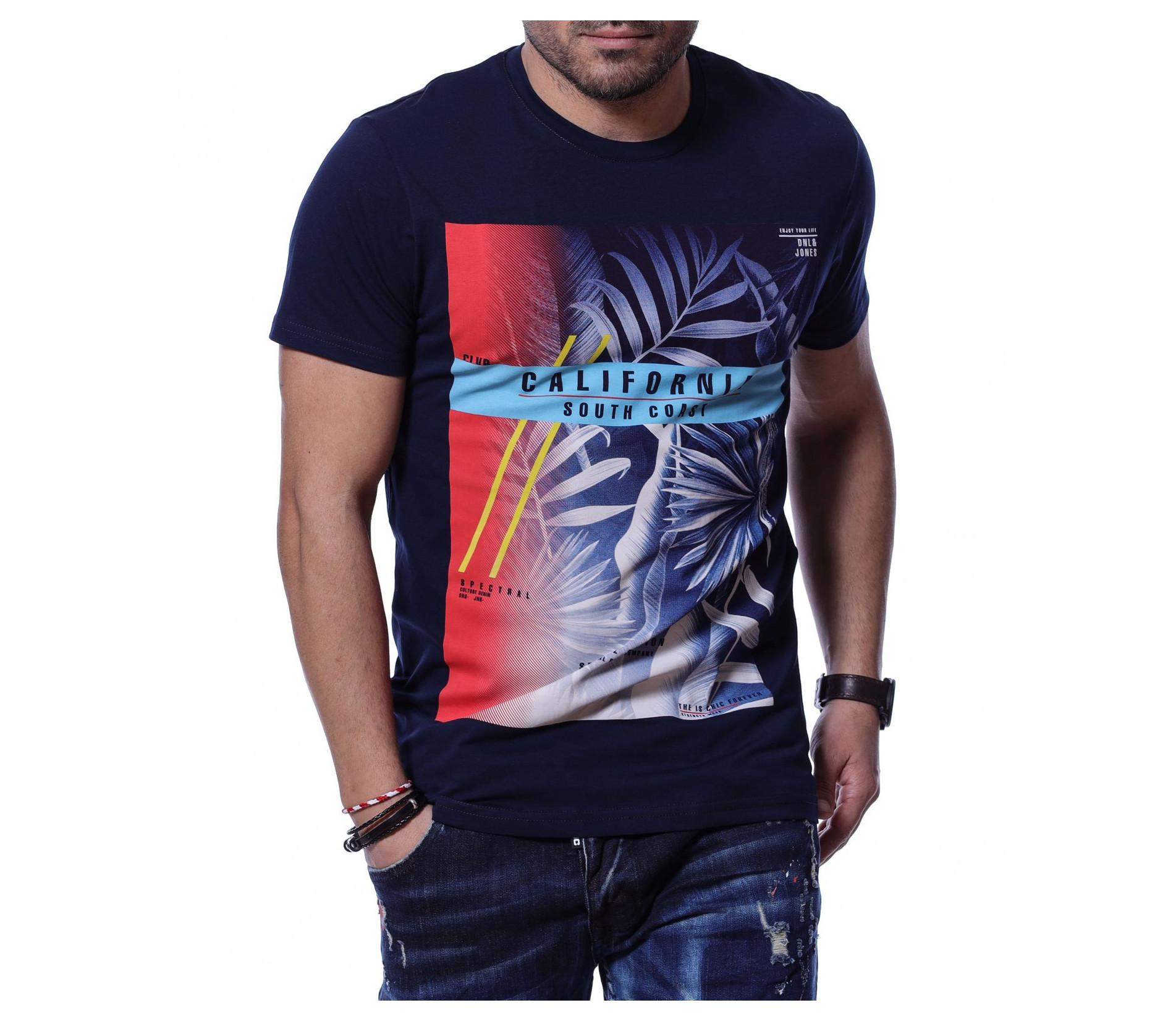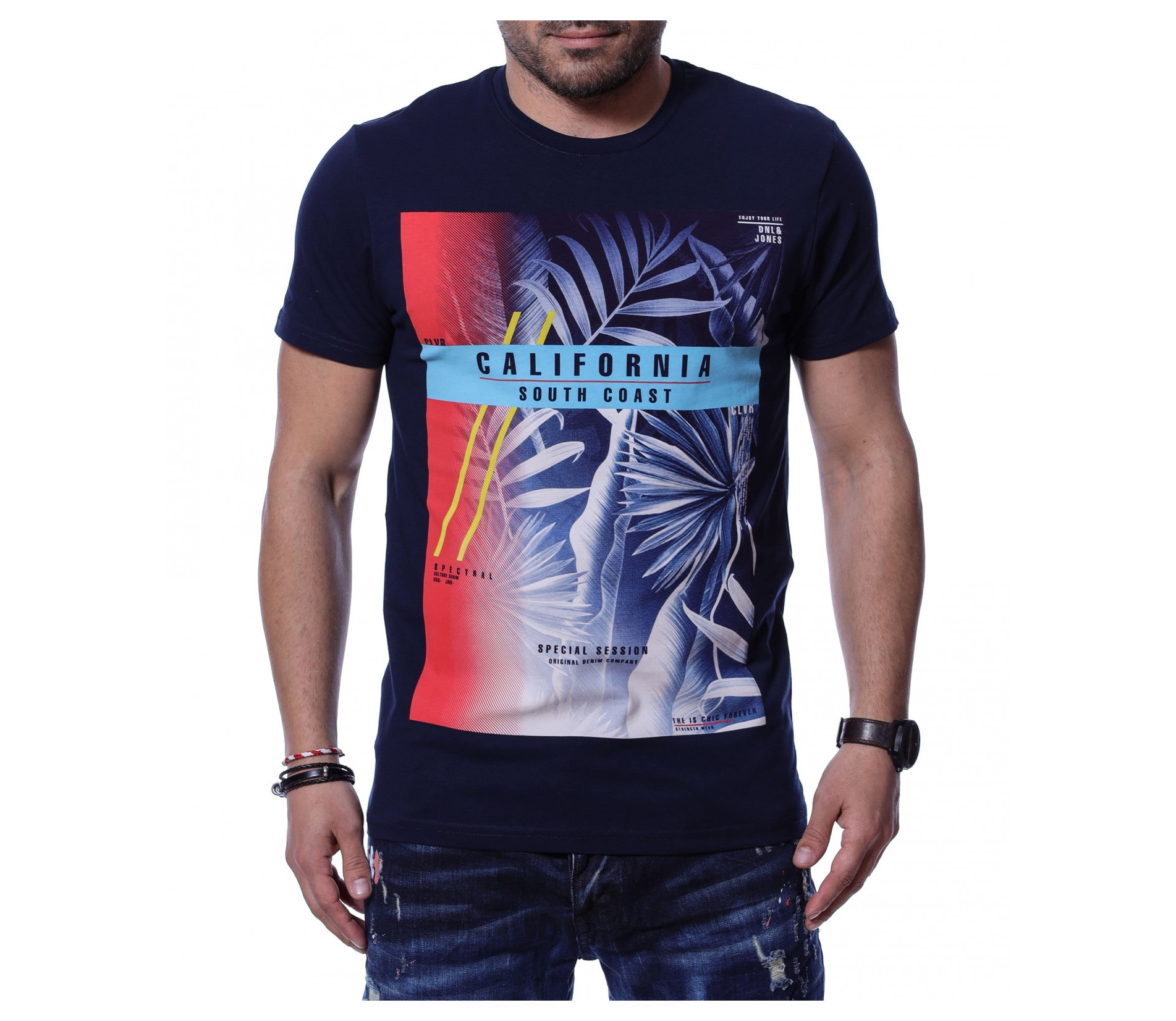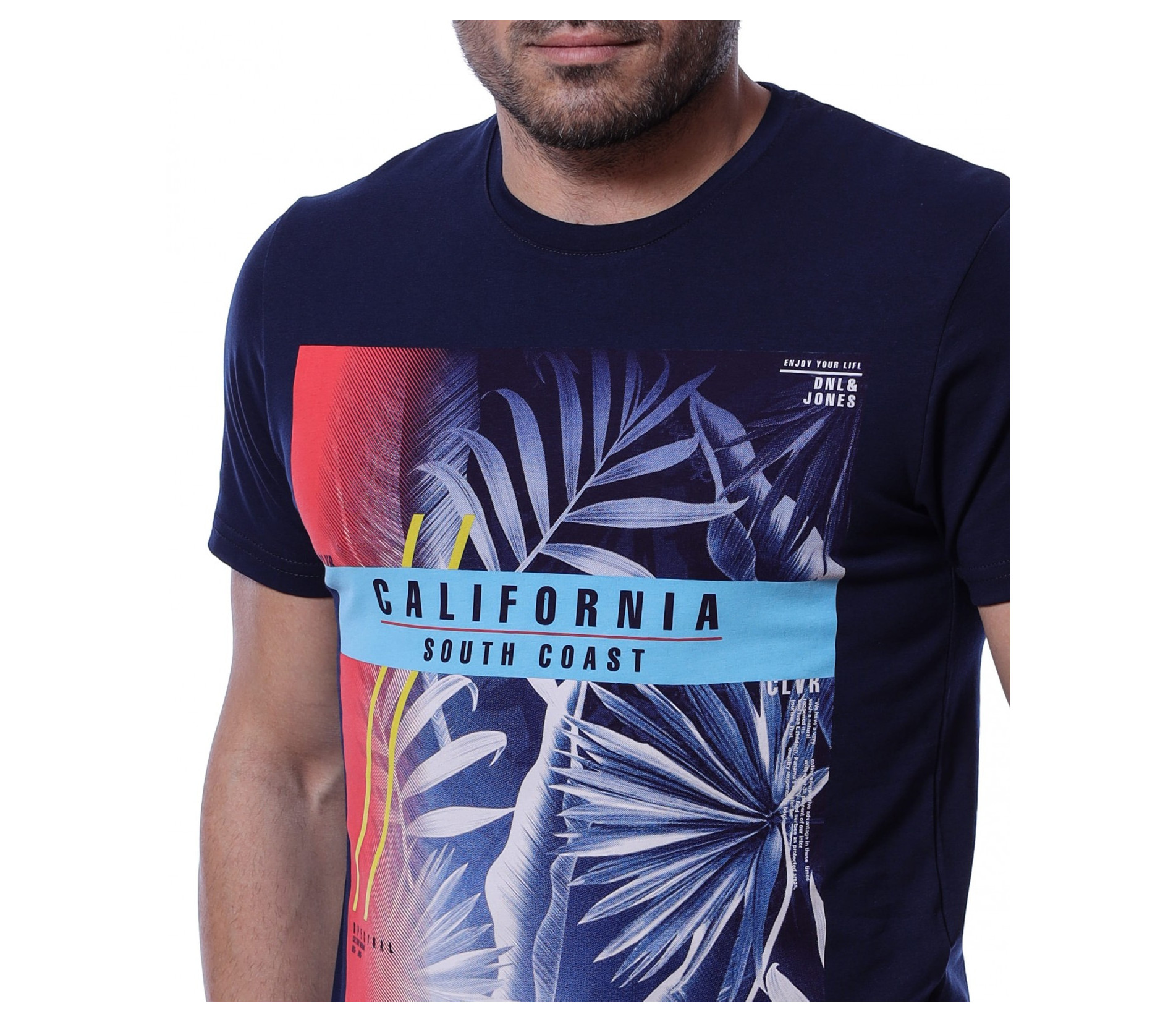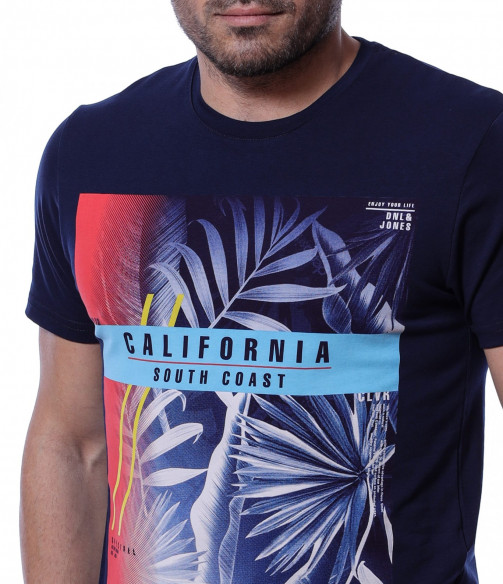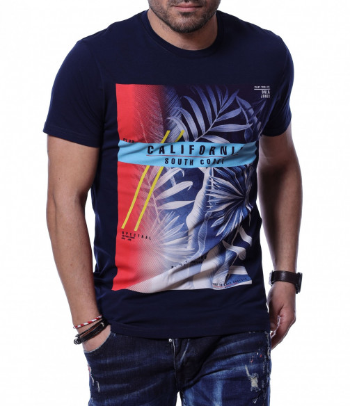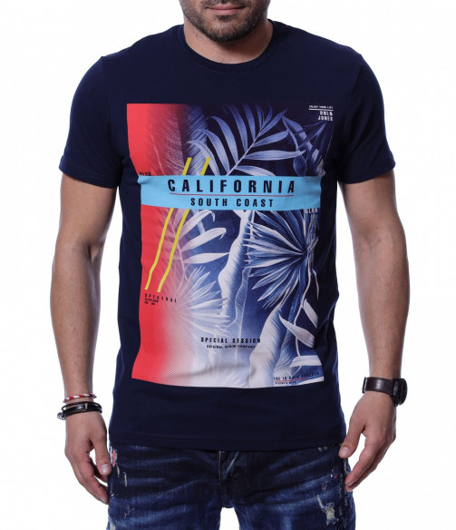 Представяме ви перфектният избор - тениска в едноцветна основа и голяма щампа, разположена в предната част. Като допълнителна декорация върху принтът е поставен надпис \"California\". Кройката е вталена, прилягаща идеално на тялото. Изработена е от 100% памук, което я прави комфортна и мека, същевременно и удобна за носене. Лесно се съчетава с мъжки спортни дънки или къси панталони, а в комбинацията със спортни кецове придава завършен и стилен вид.