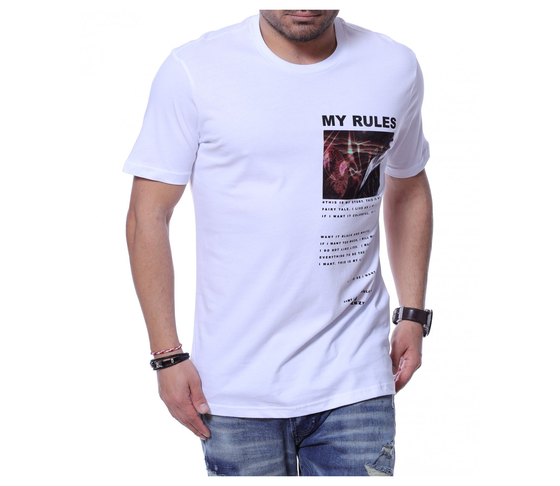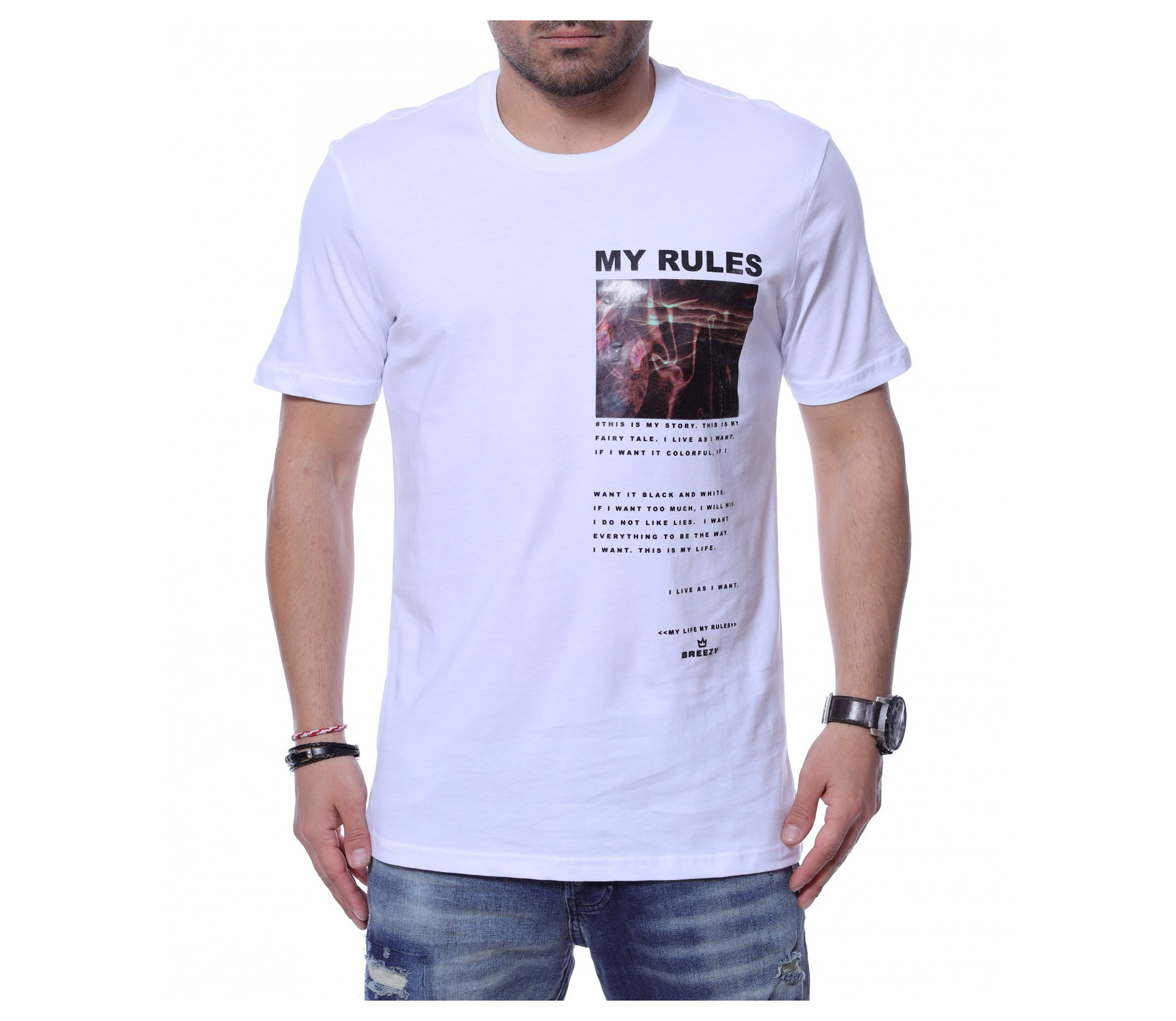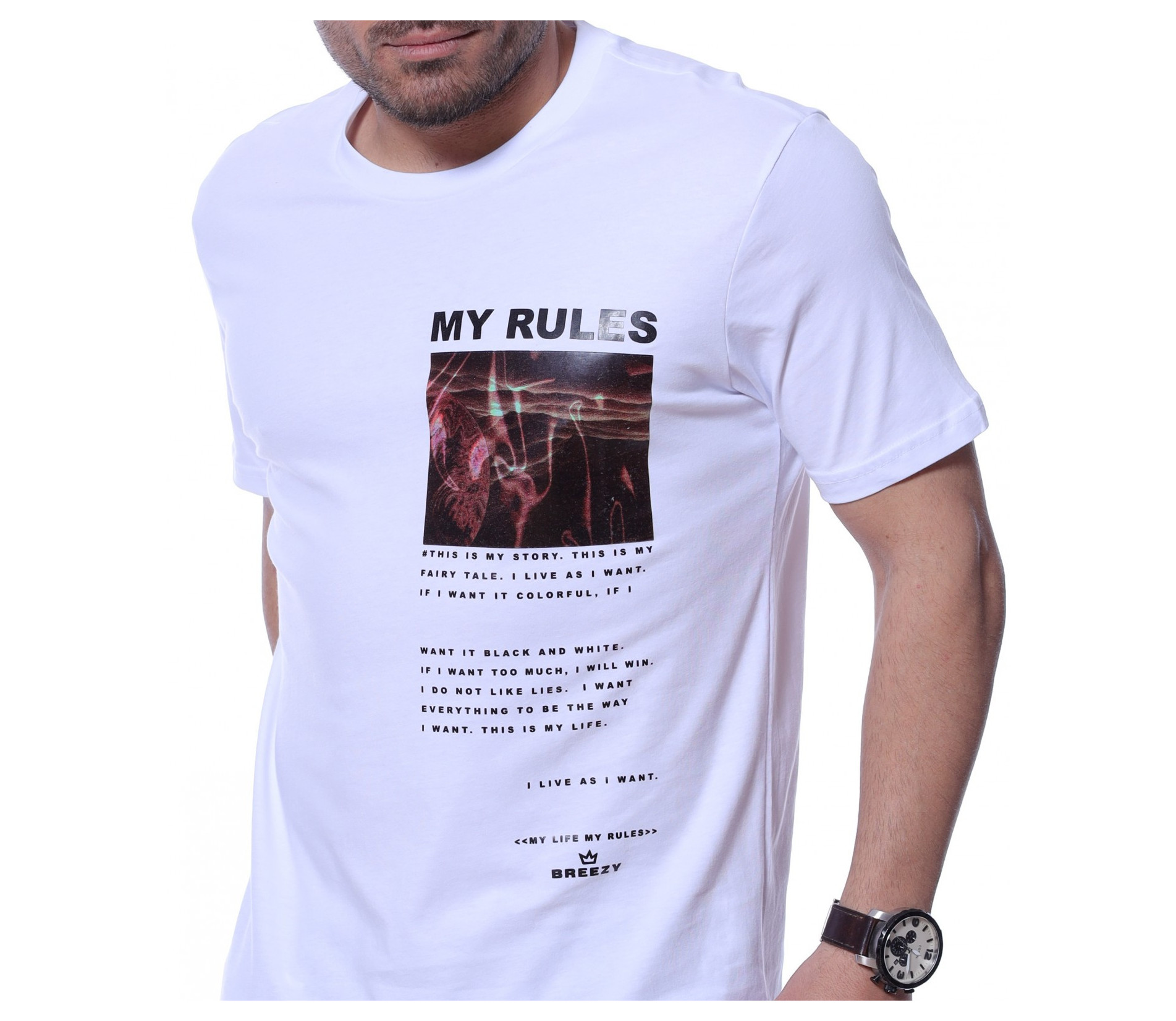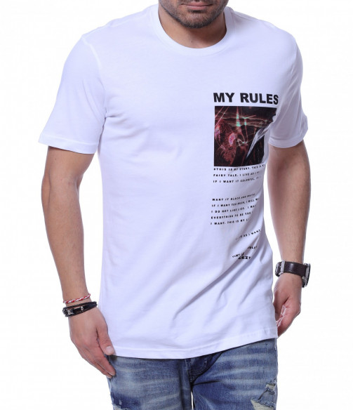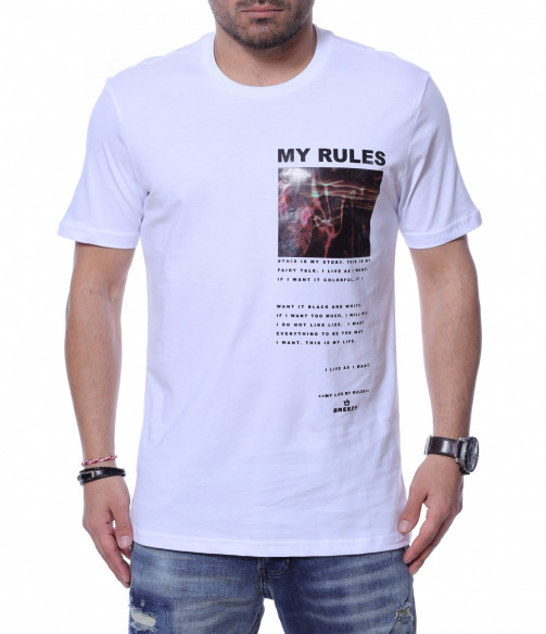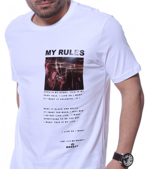Представяме ви чисто нов модел в тазгодишната колекция - тениска с необичайна щампа. Декорацията тук е не само в цветният принт, но и в лявата  предна част е добавен средноголям надпис MY RULES, а под него е позициониран интересен шрифт. Кройката приляга идеално на тялото, a гърбът е напълно изчистен от елементи. Овалното деколте и памучната материя правят моделът удобен за носене. Комбинацията от спортни обувки и подходящи дънки е идеална за ежедневието.