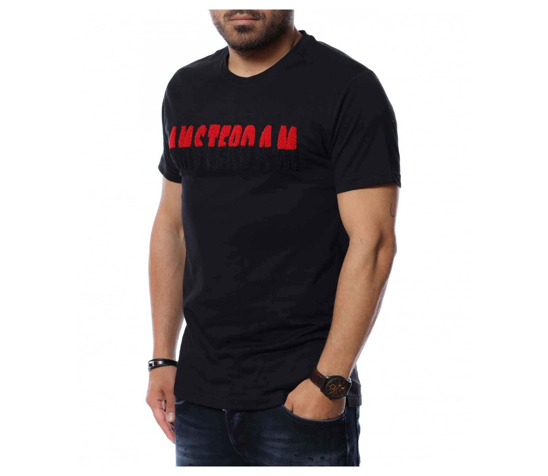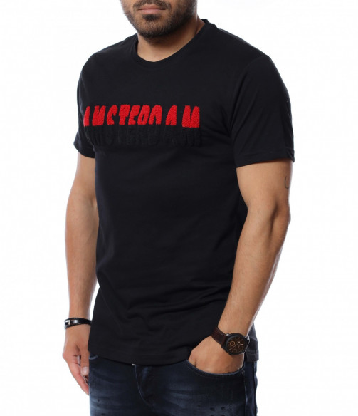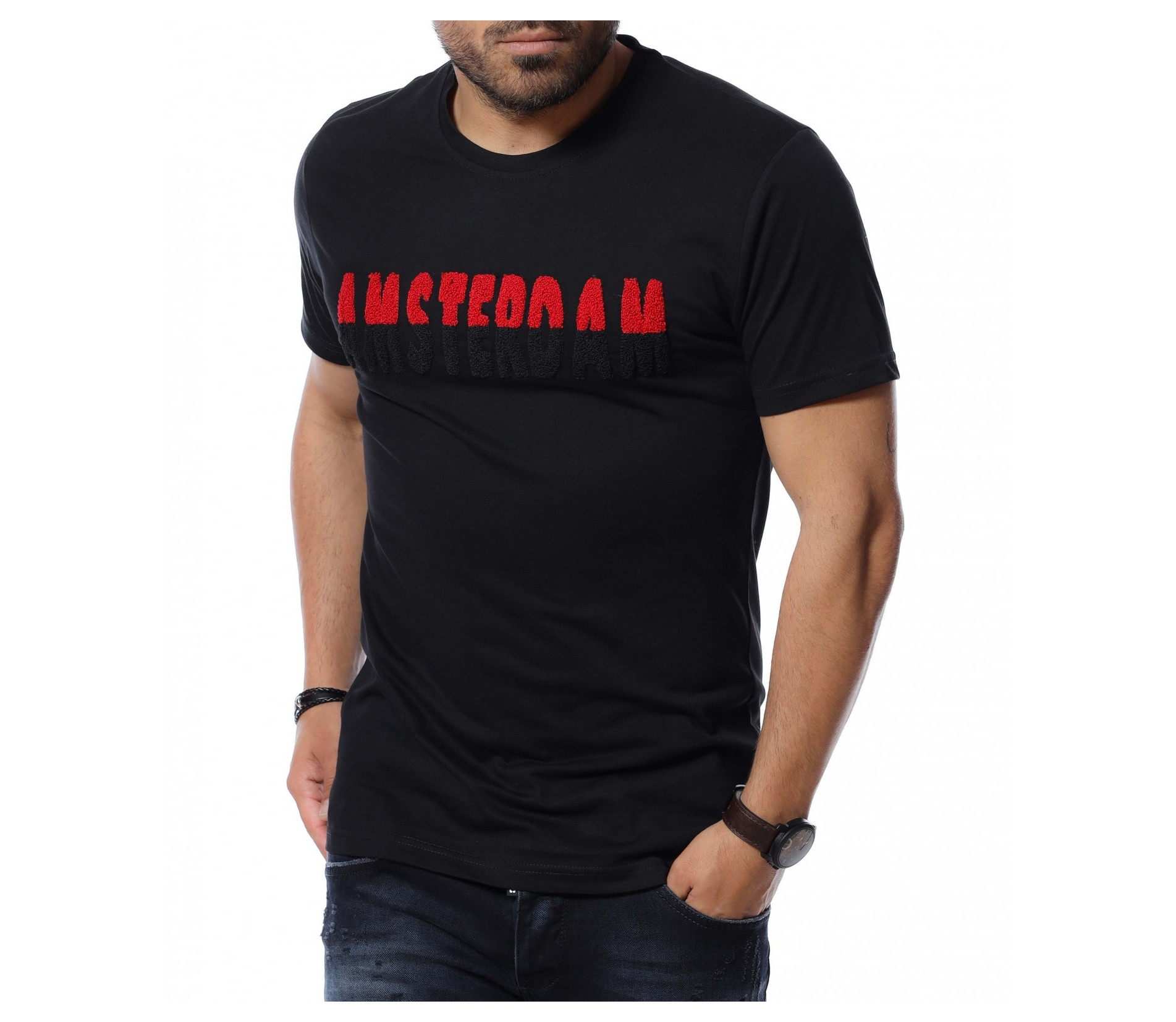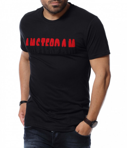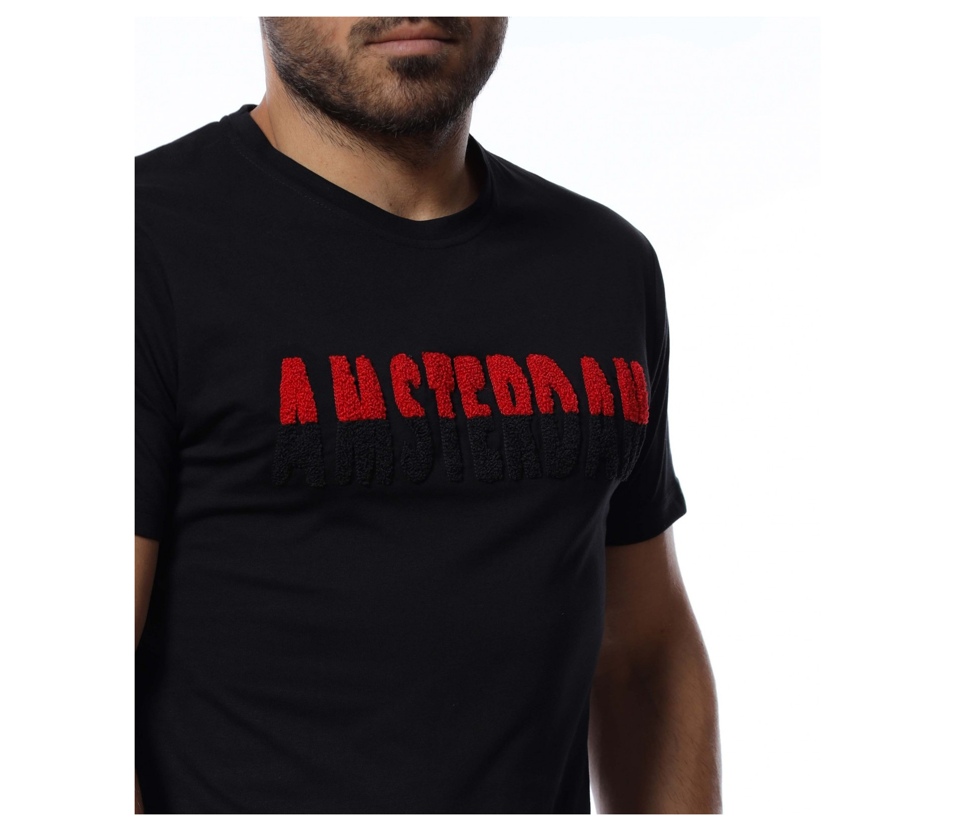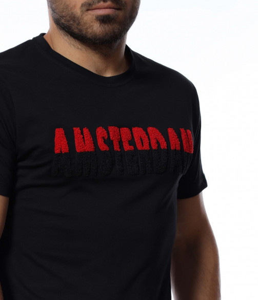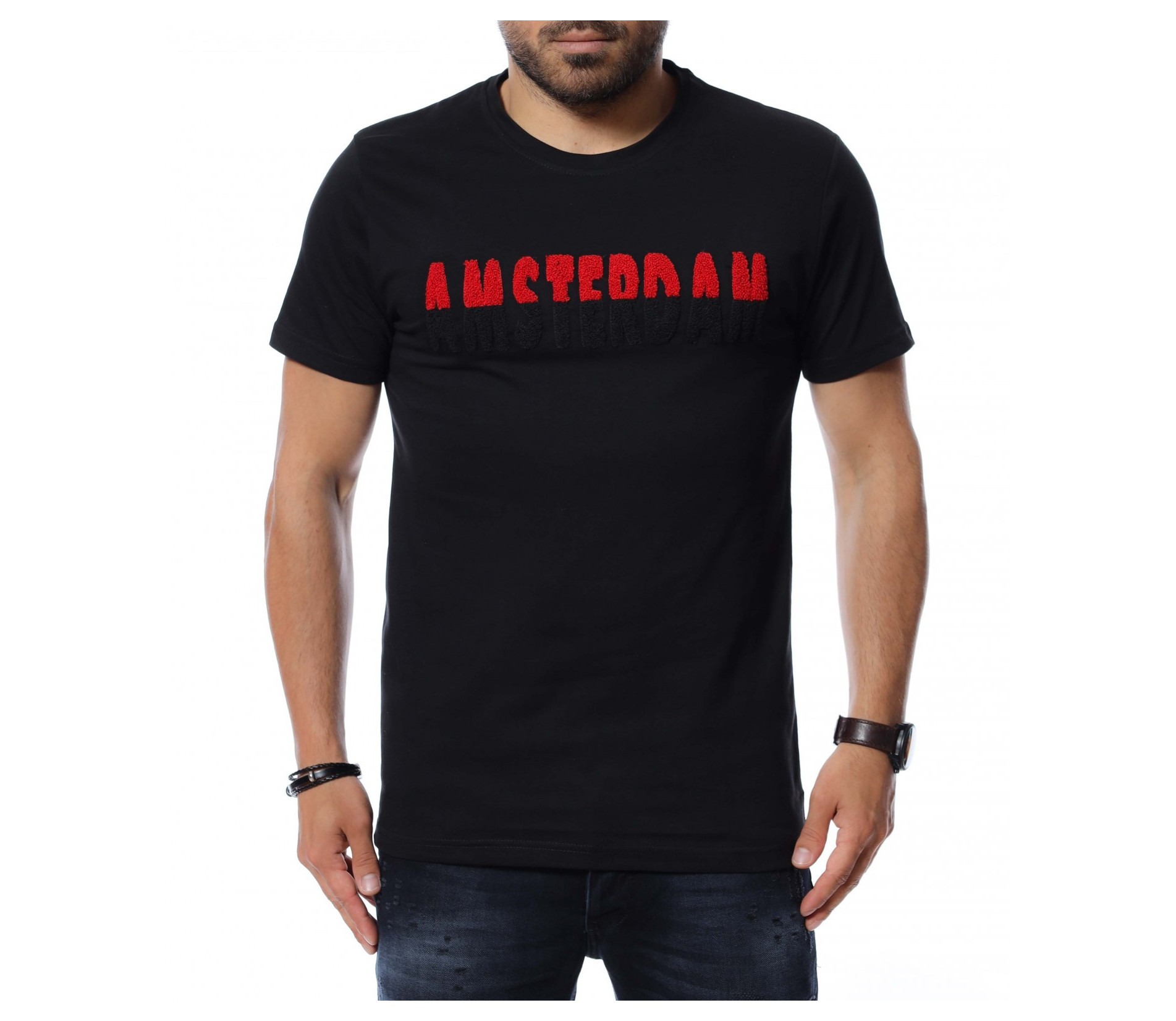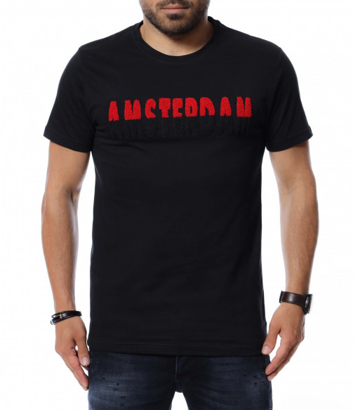 Подбрали сме за вас тениска в класически цвят и двуцветен надпис \"Amsterdam\", позициониран в предната част, под деколтето.