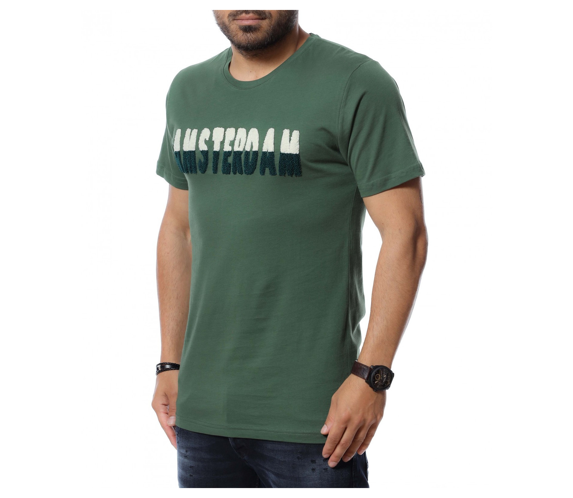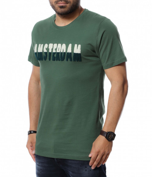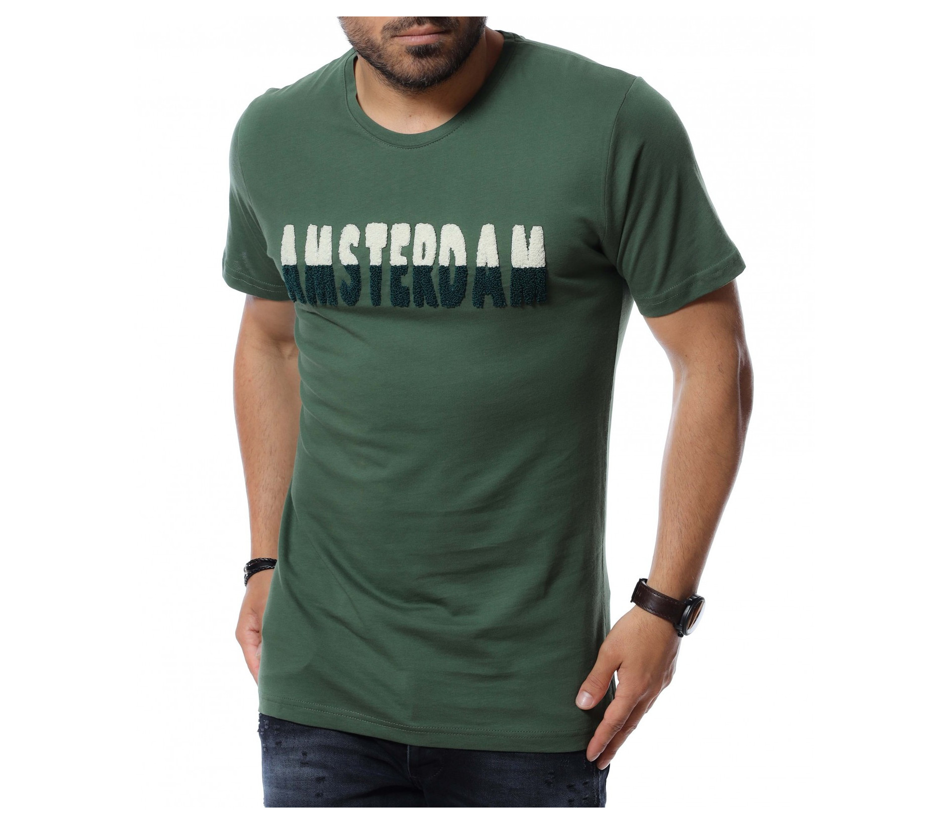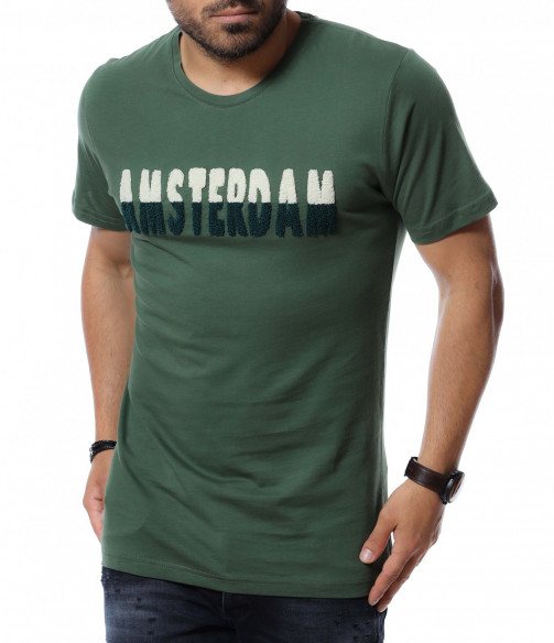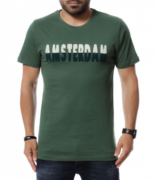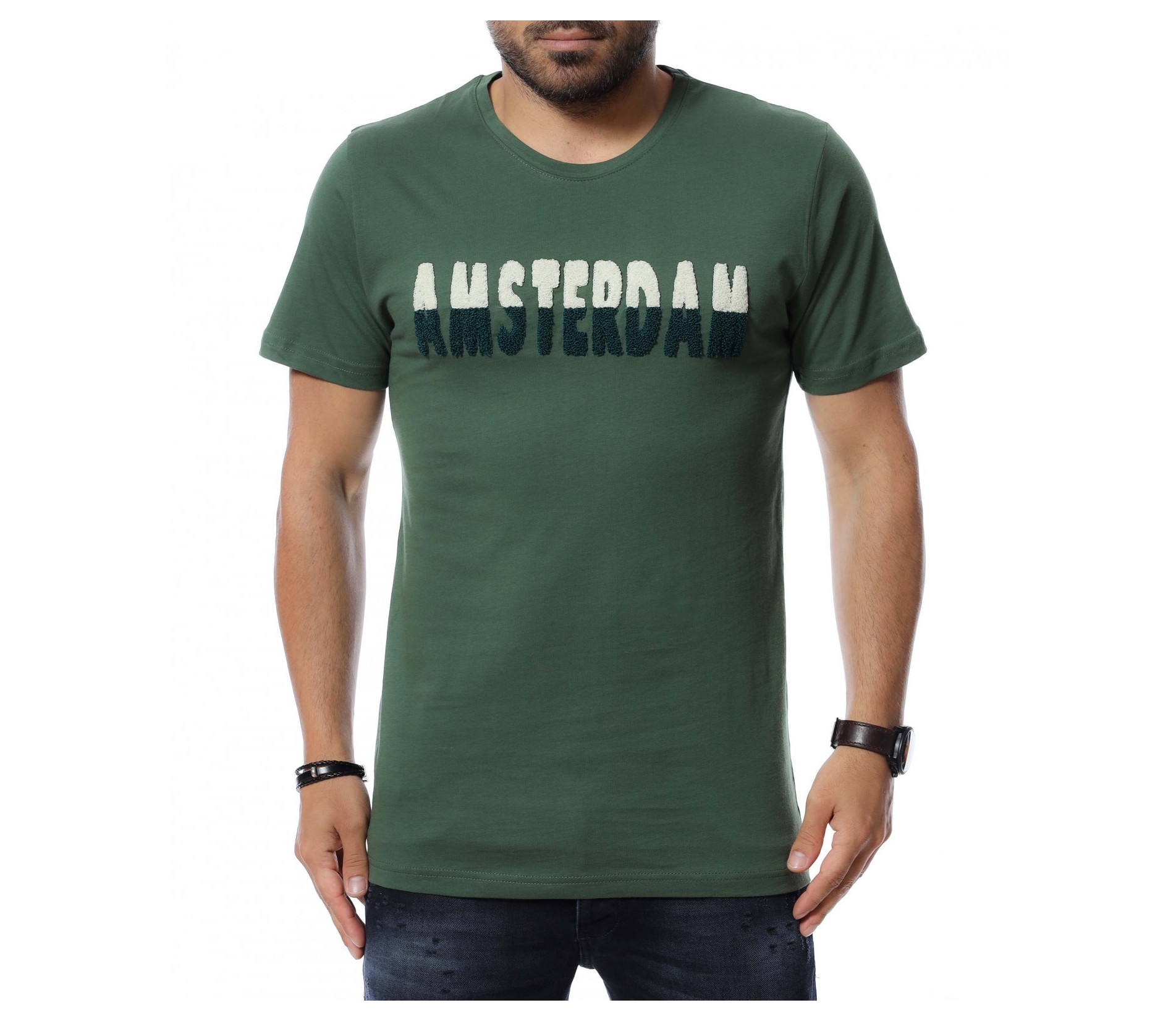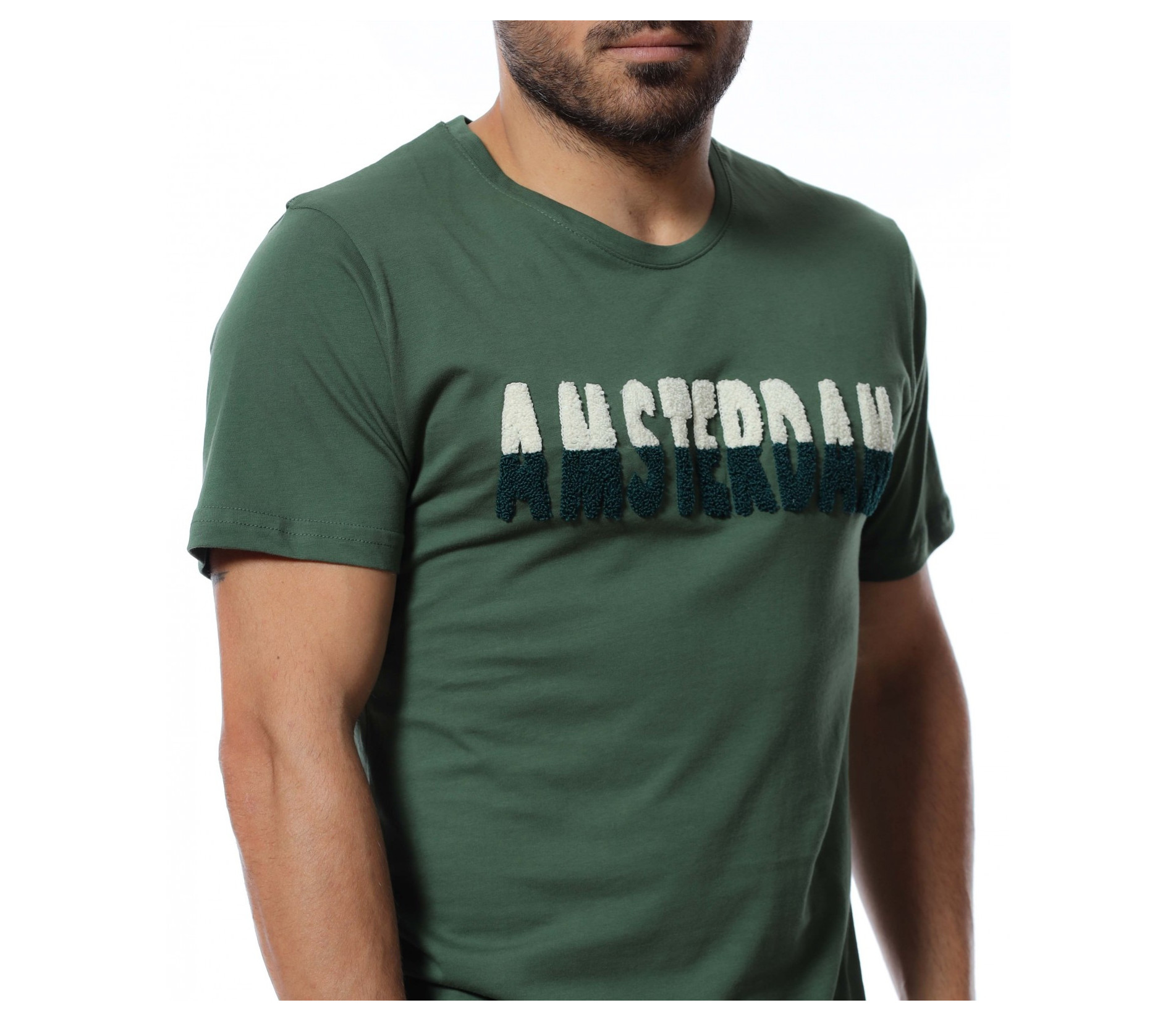 Подбрали сме за вас тениска в класически цвят и двуцветен надпис \"Amsterdam\", позициониран в предната част, под деколтето.