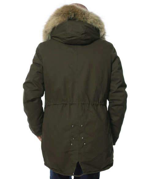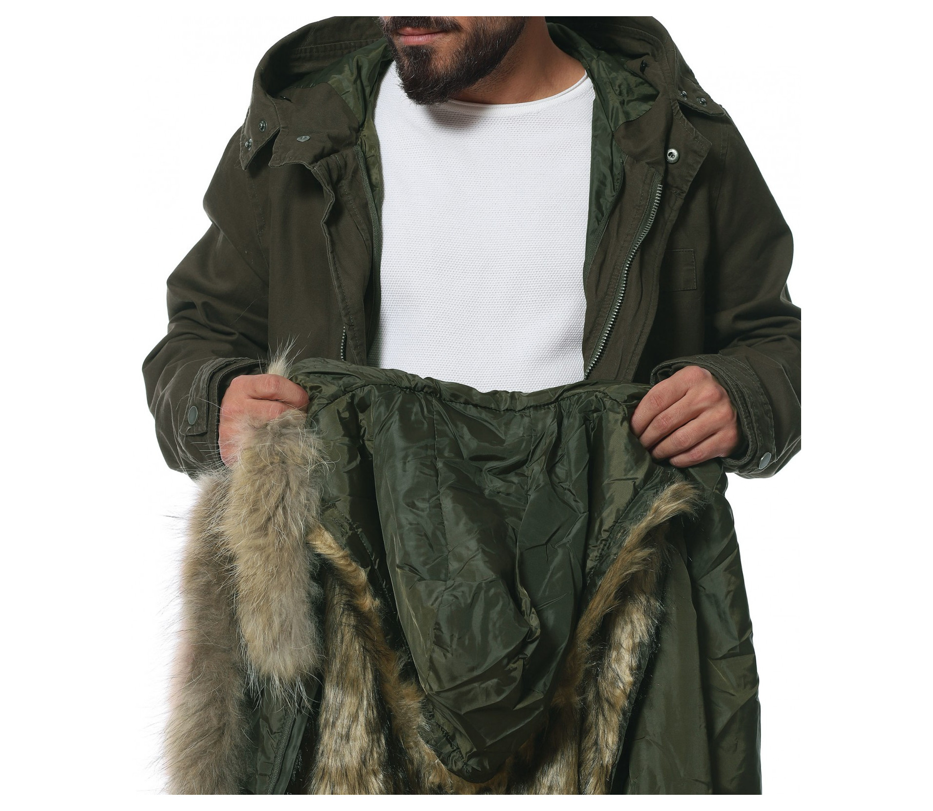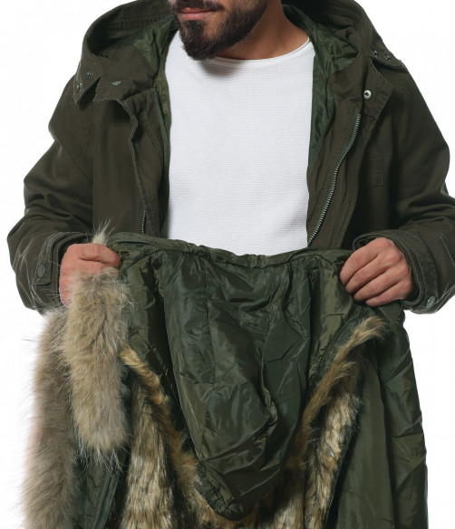 Описание на продукта: Представяме Ви един модел мъжко яке, чиито дизайн покрива всички изискавания и желания, които сте изградили през годините. Типът яке е с издължена кройка, тип парка, което разчупва типичния Ви ежедневен имидж, поставяйки деликатен vintage подтон. В областта при талията е разположена и връзка, с помощта на която може да стесните тази област и да получите по-релефна кройка. На гърба в долната част е поставена и малка цепка, която на пръв поглед изглежда като незначителна, но всъщност изграждат допълнителен комфорт при движение. В предната част са поставени два дълбоки джоба, допълнени с капачета, за максимална сигурност. Вглеждайки се детайлно в изработката, отбелязваме няколко мотива, а именно мека външна част, топла качулка, декорирана с пухена лента. Вътрешната страна на якето е покрита изцяло от мъхеста външна подплата, която Ви гарантира удобство, мекота и топлина през целият зимен сезон. .