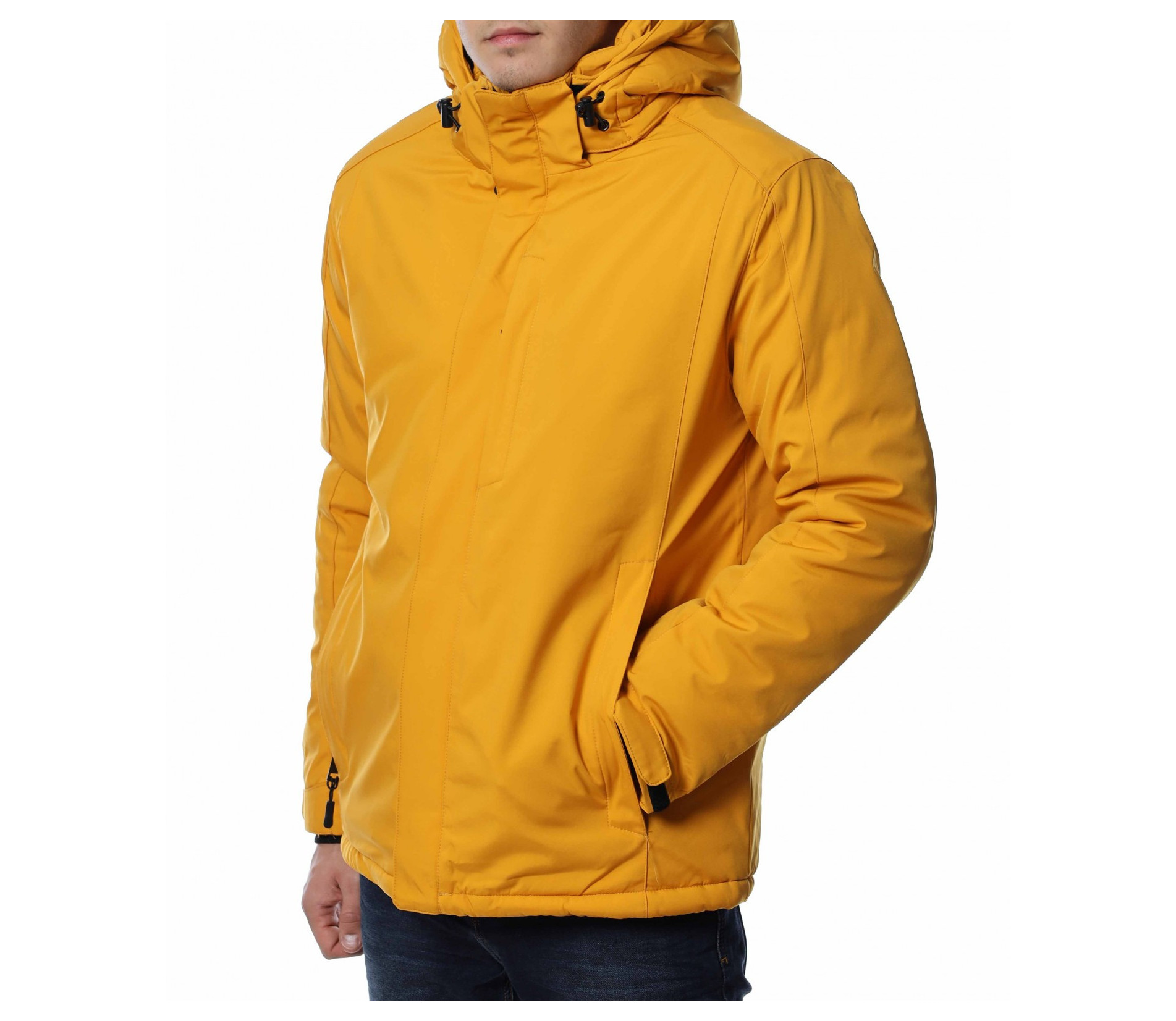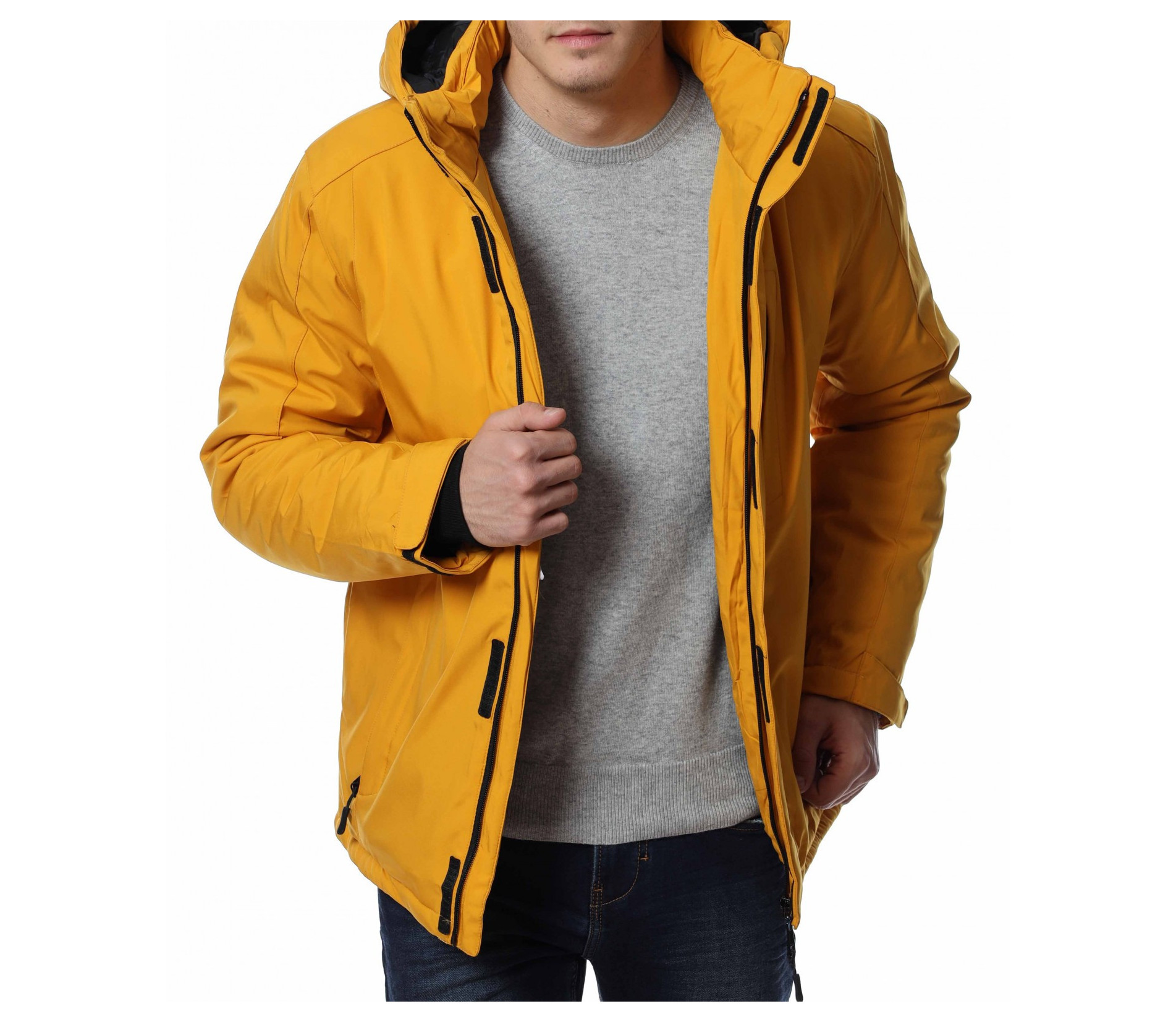Мъжко, зимно яке с качулка от плътна и топла материя. Якето е изключително подходящо за студените месеци, моделът е в изчистен вариант, както отпред, така и отзад. На качулката има връзки за регулиране на ширината, а закопчаването е с цип и маншет, който може да го скрие. В края на ръкавите е поставено велкро и забелязваме като допълнение джоб в предната част. Комбинирайте с дънки и блуза.