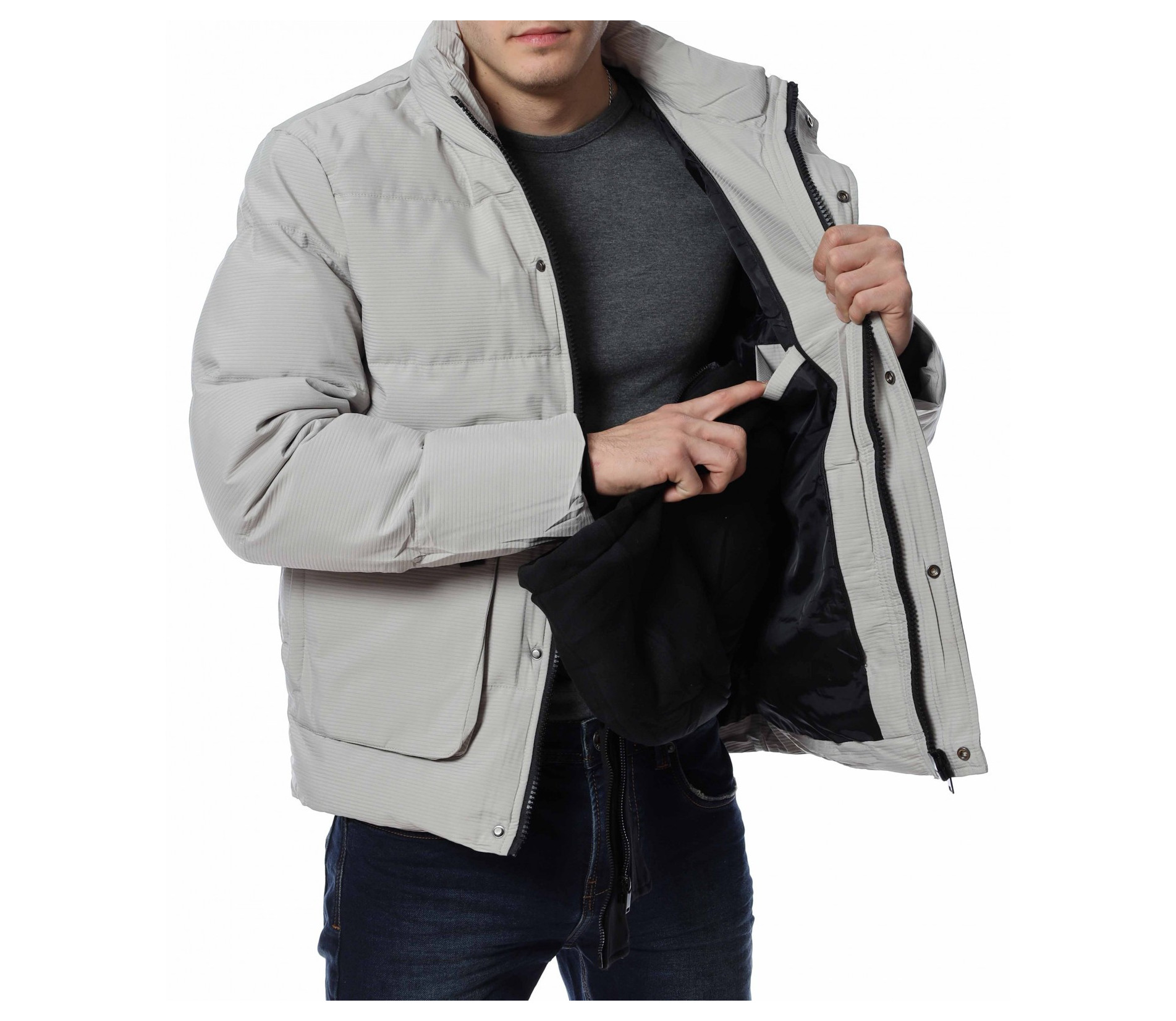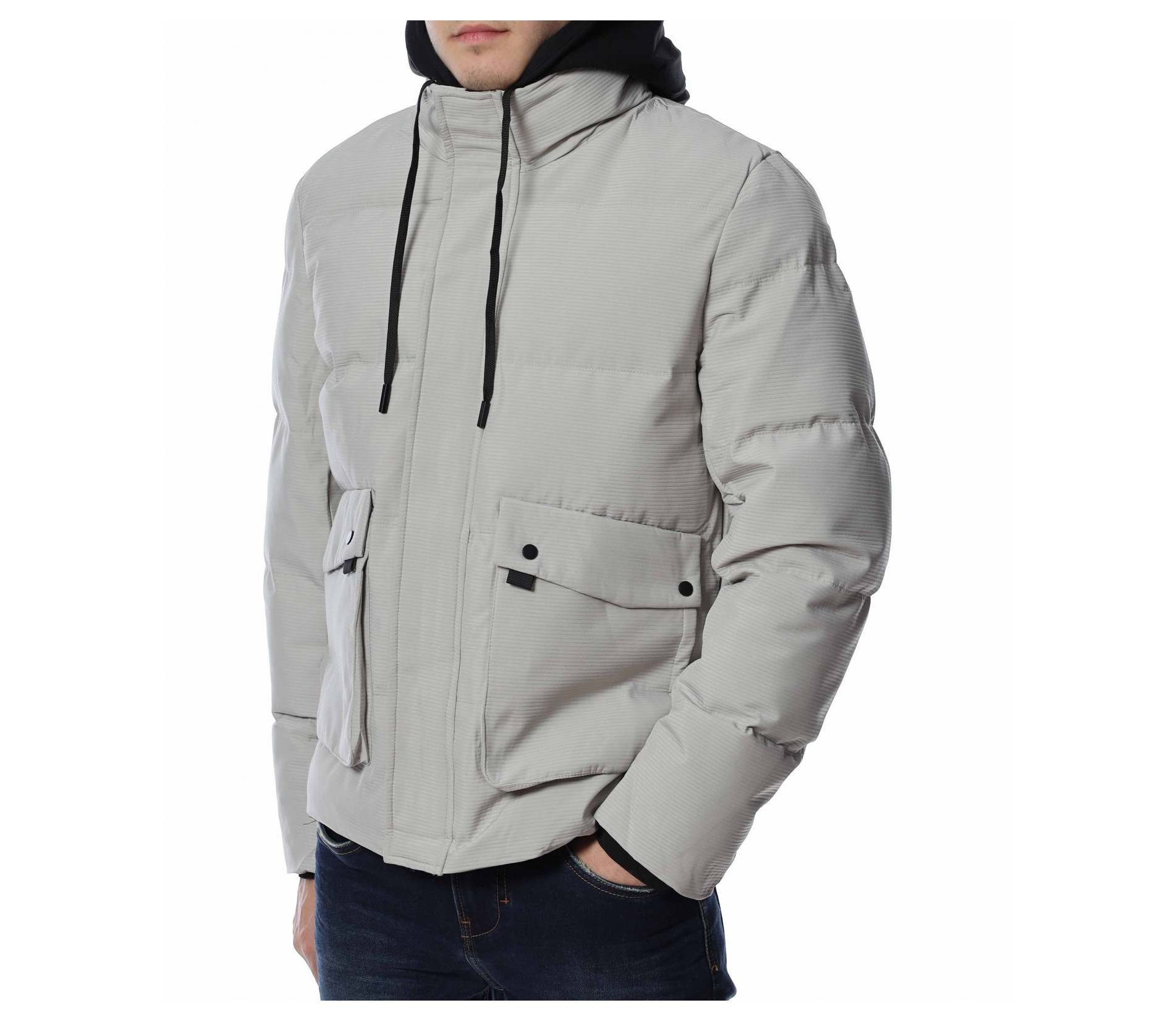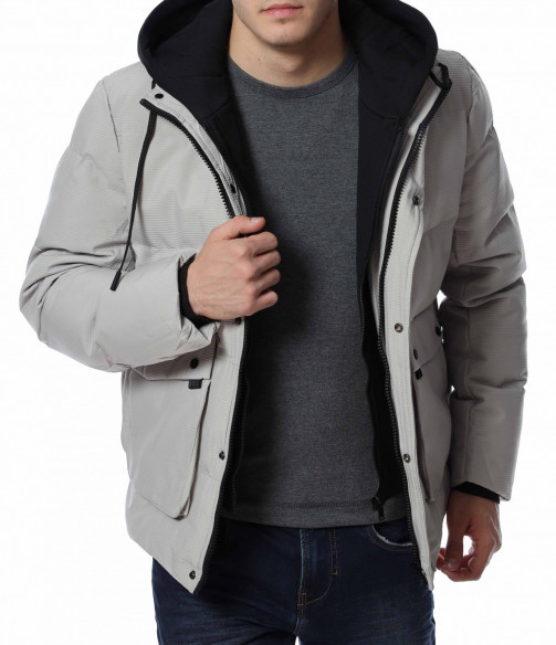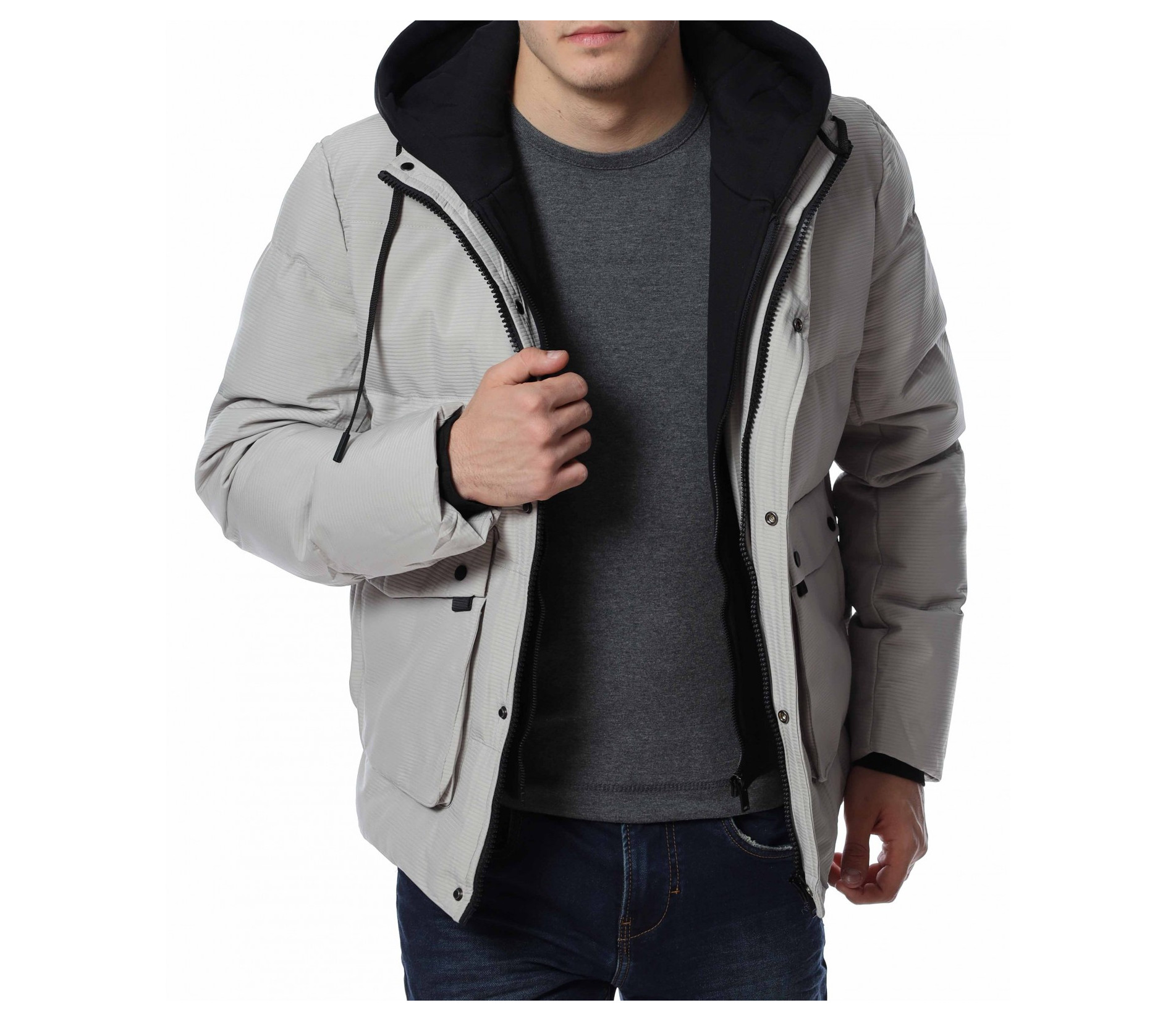 Мъжко яке от непромокаема материя, подходящо за студените месеци. Основата е едноцветна, а дизайнът е заложен на хоризонтални оребрени шевове. Качулката е от мека, памучна материя и подплатено от силиконова вата. Закопчаването се състои в цип и капси. Дължината на модела е до средата на седалището, което улеснява движенията ви.В предната част са разположени джобове с капачета за акцент. Комбинирайте с блуза и дънки.